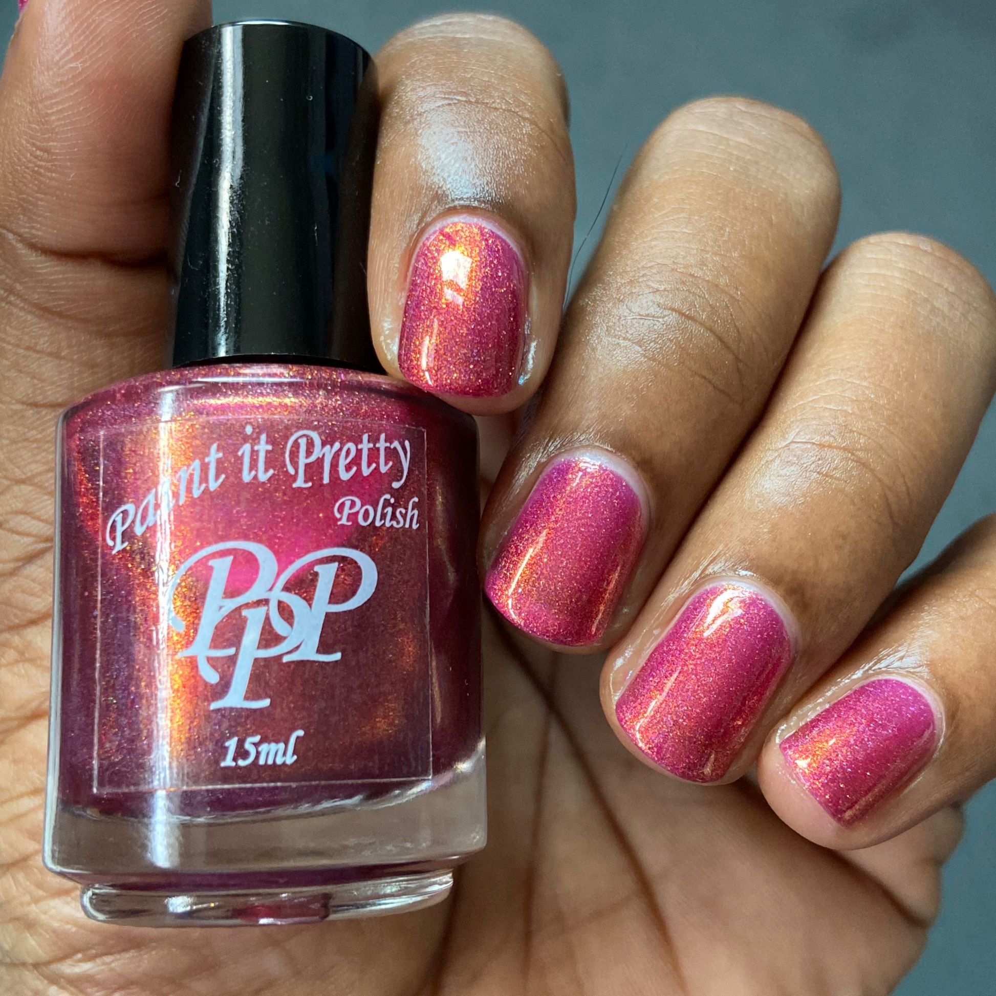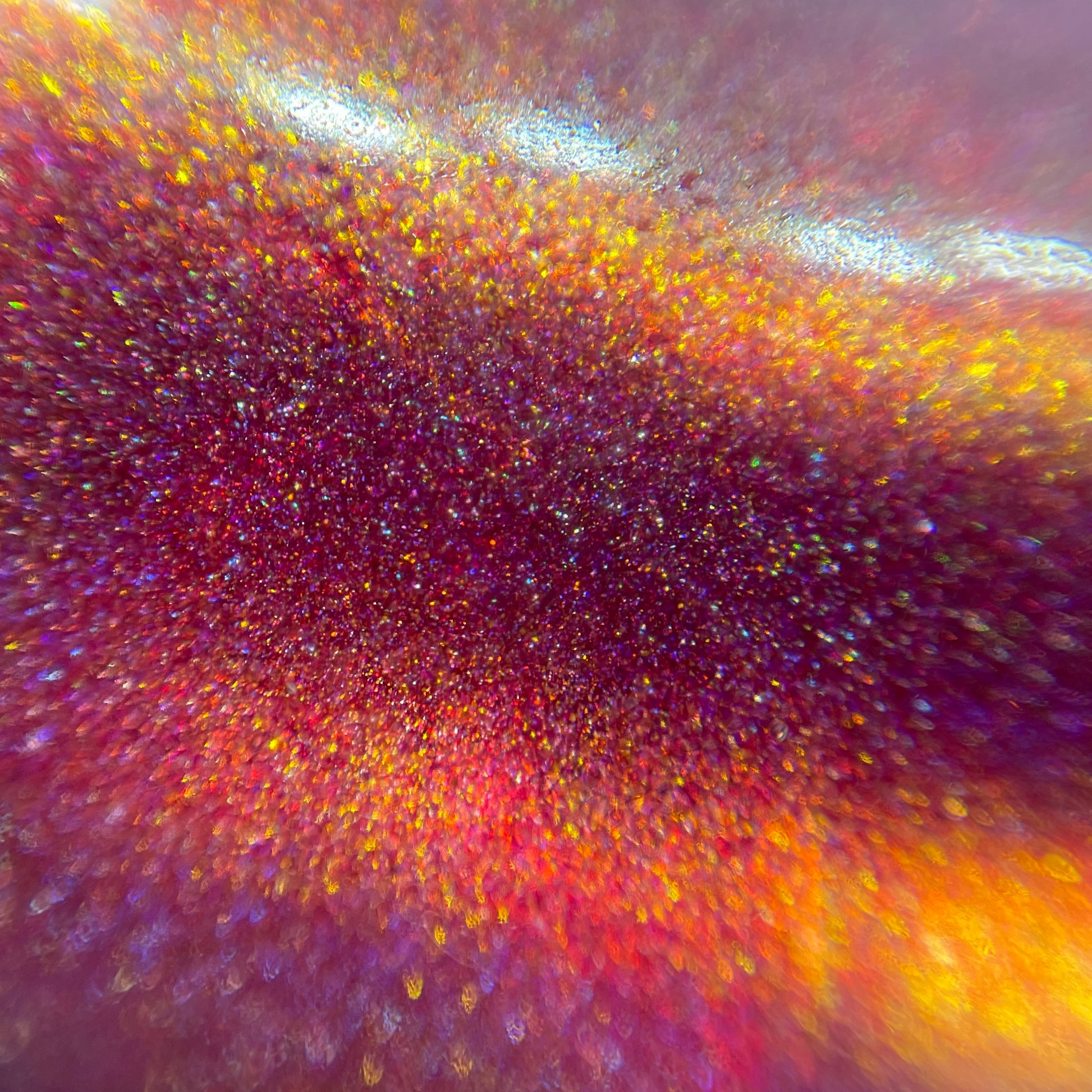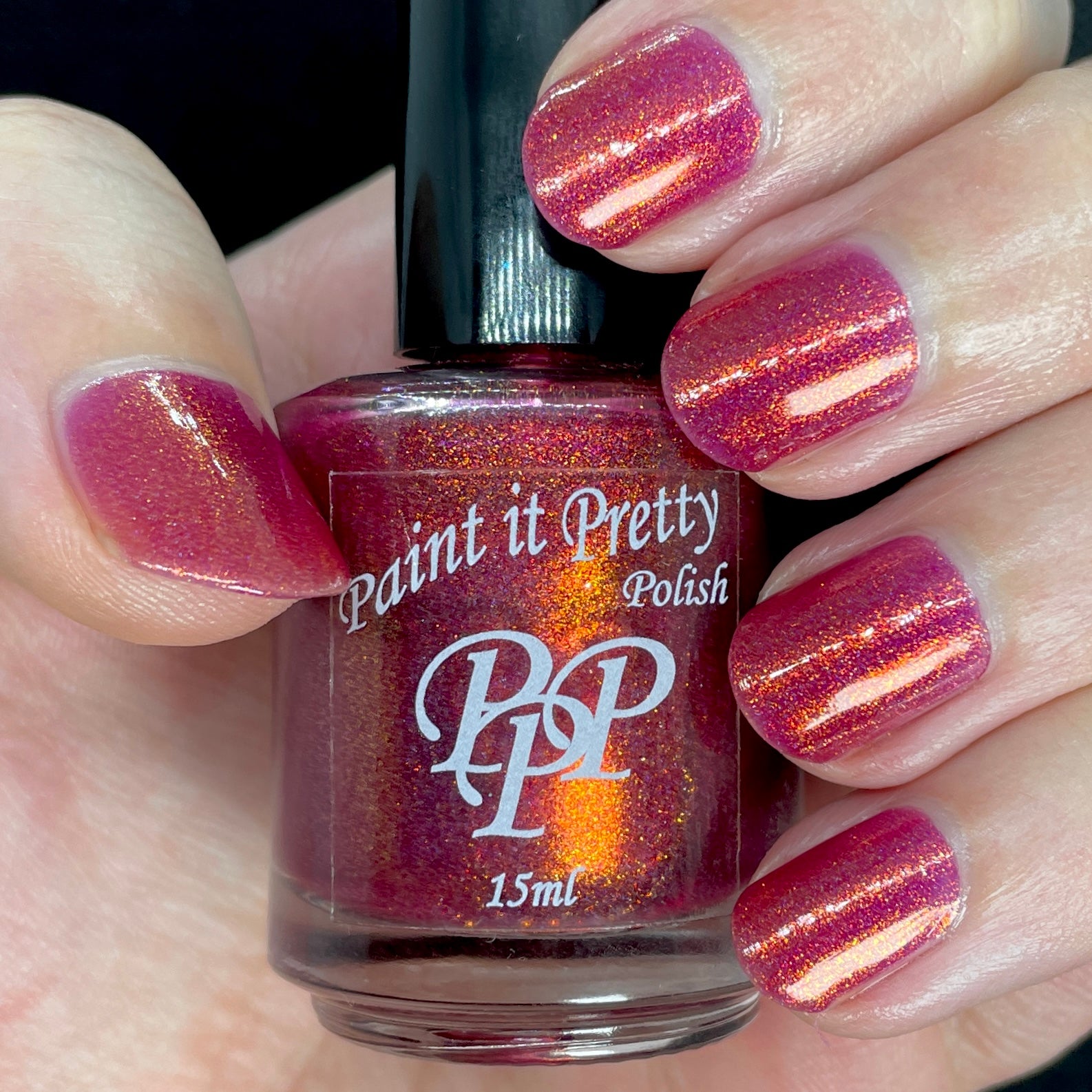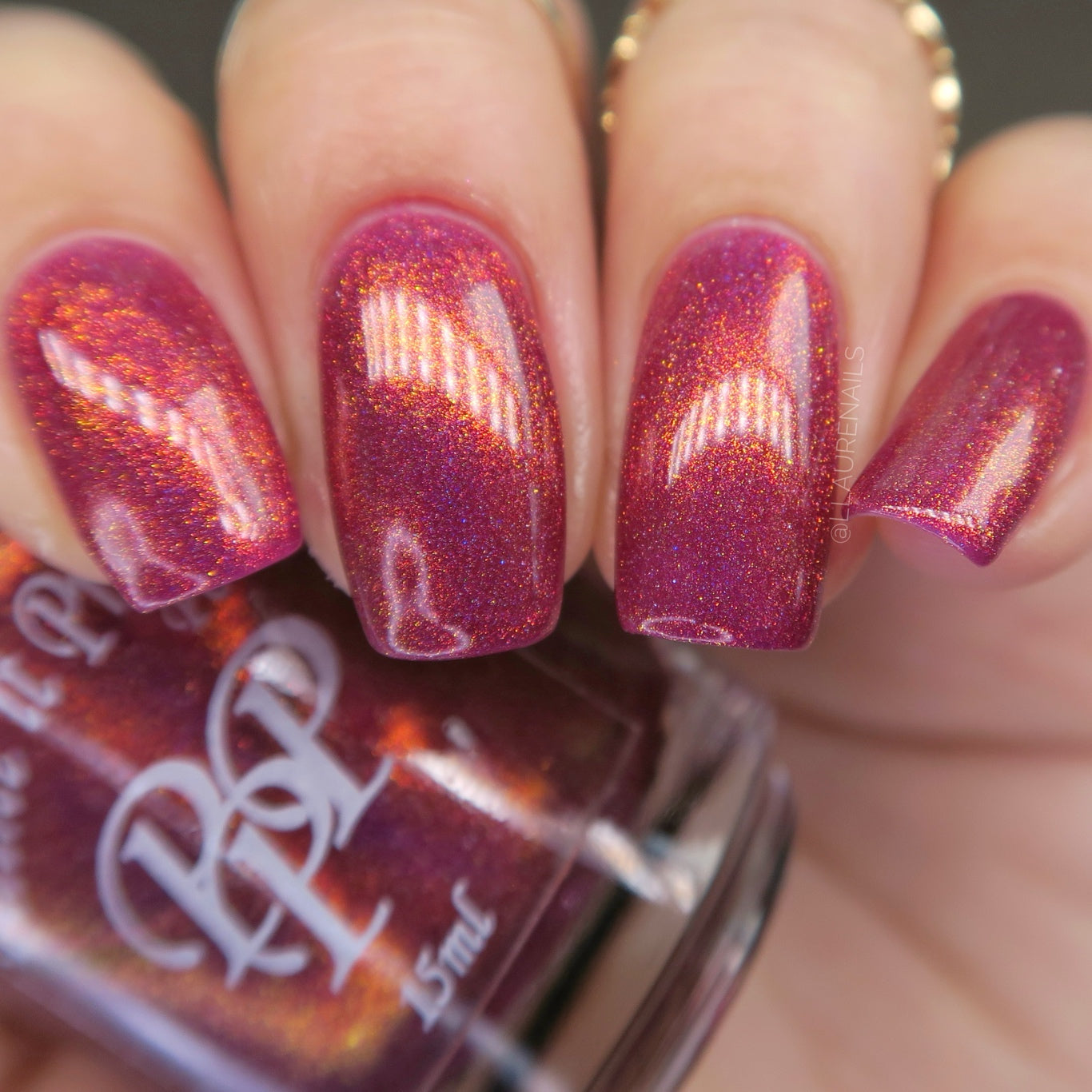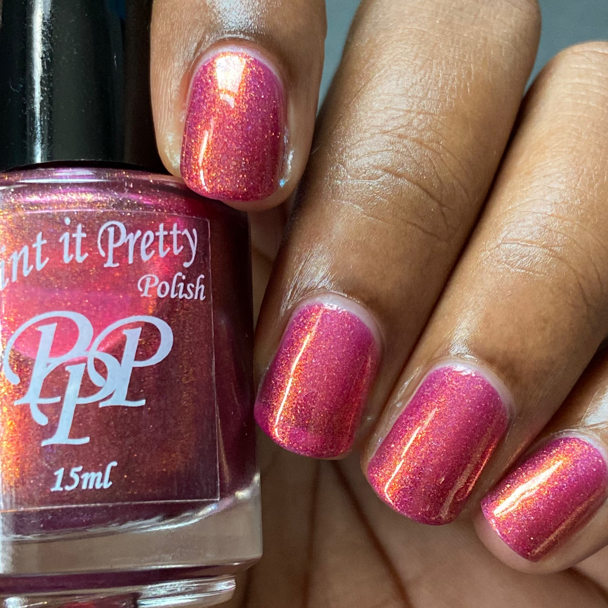 Oh, the Who-manity is a red holographic polish with an orange/golden shimmer