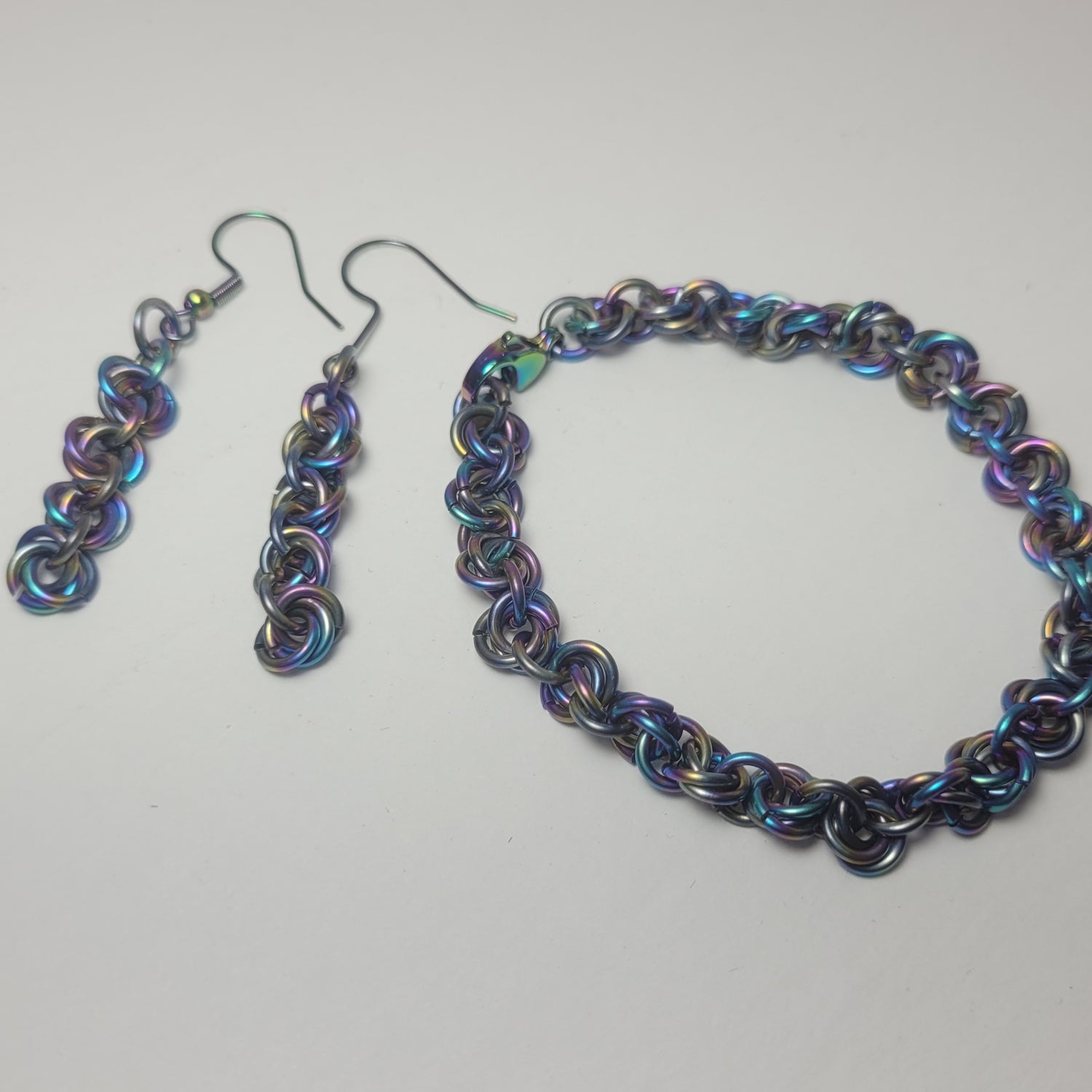 This set is made of rainbow Titanium and stainless steel lobster clasps and hooks. Chainmail is a rosette weave in rainbow titanium. Set includes a necklace, bracelet and earrings. Earrings are approximately 2" in length. You can choose your bracelet and necklace length.