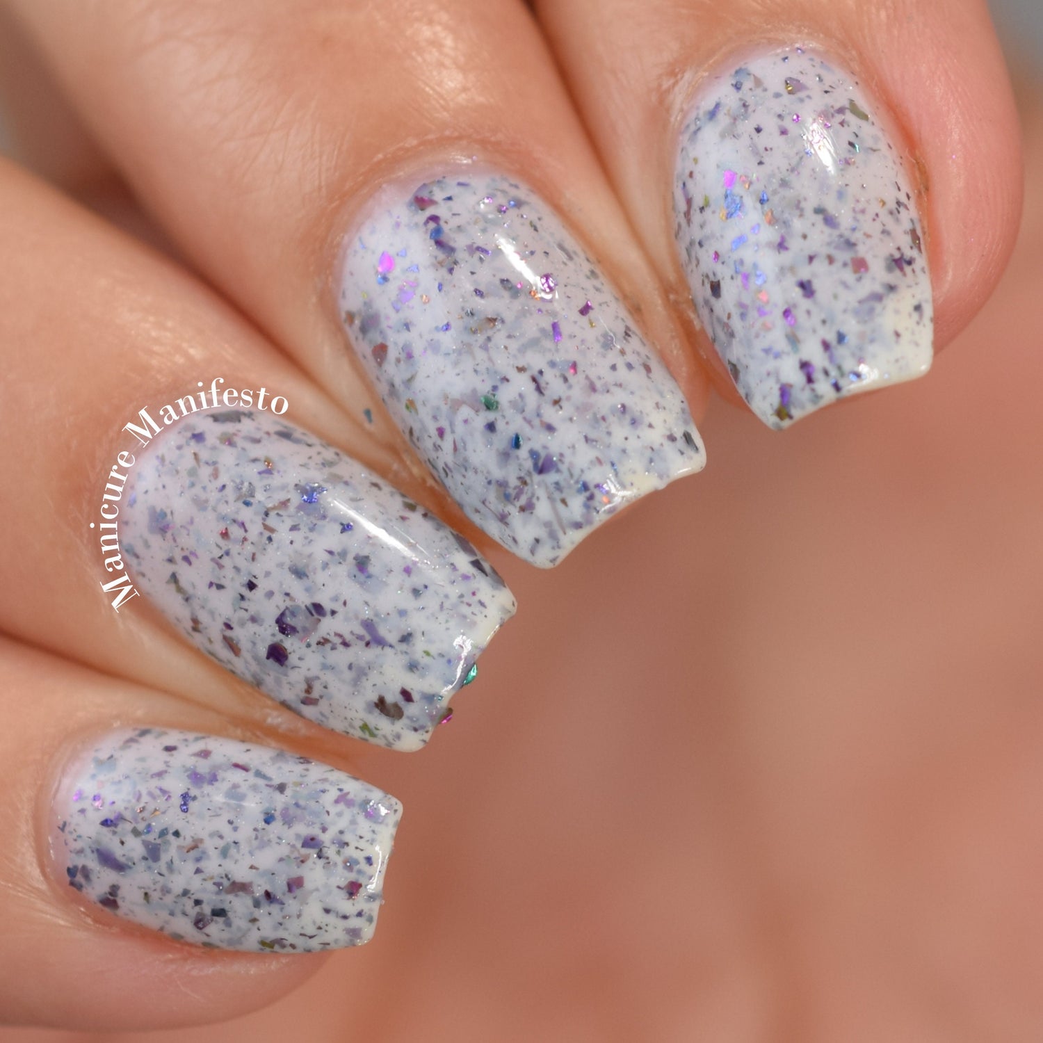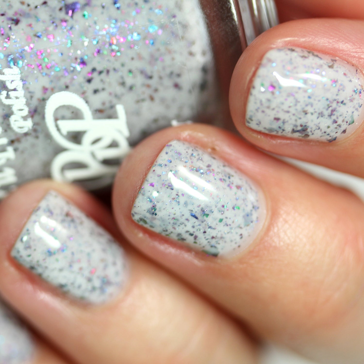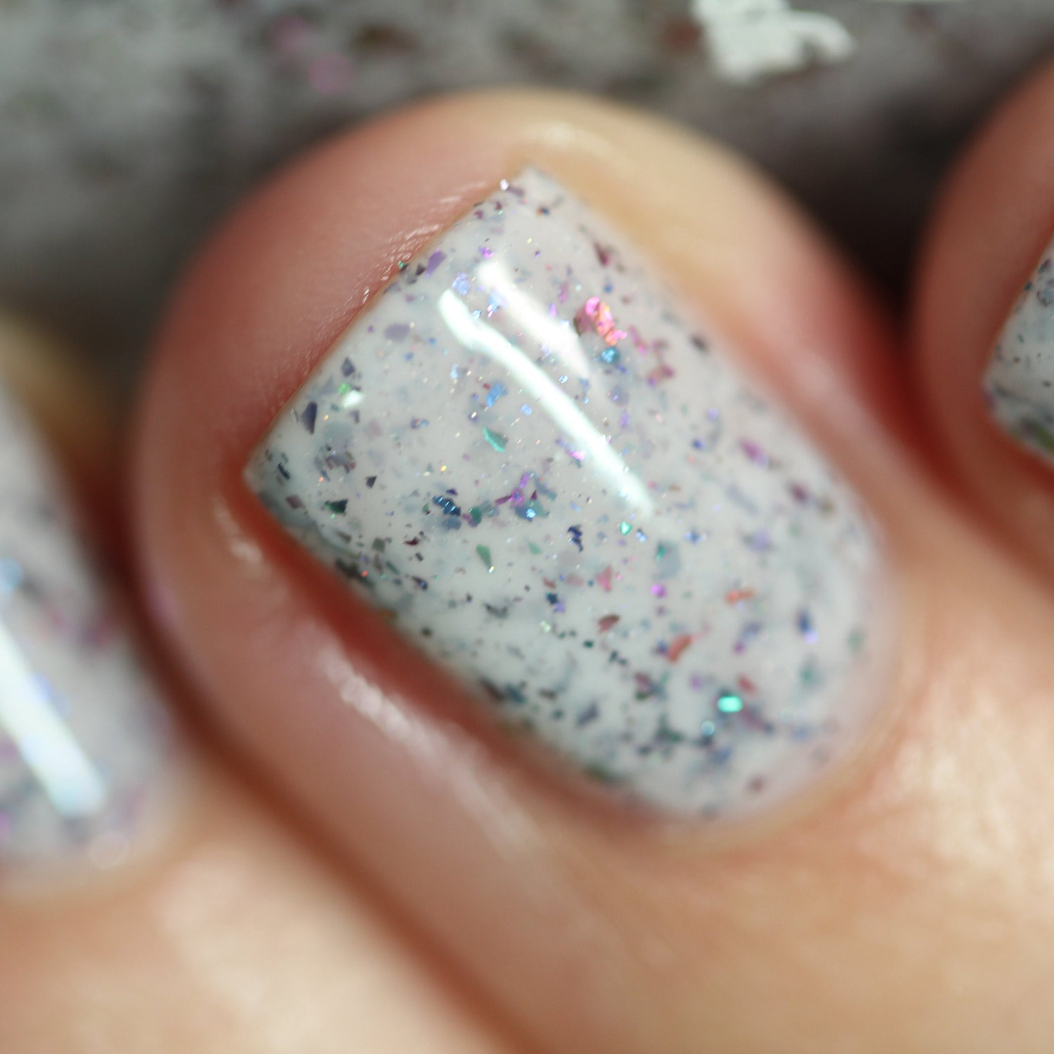 Rainbow Clouds is a white crelly base with colour shifting flakes in blue, violet, green, purple, red and orange