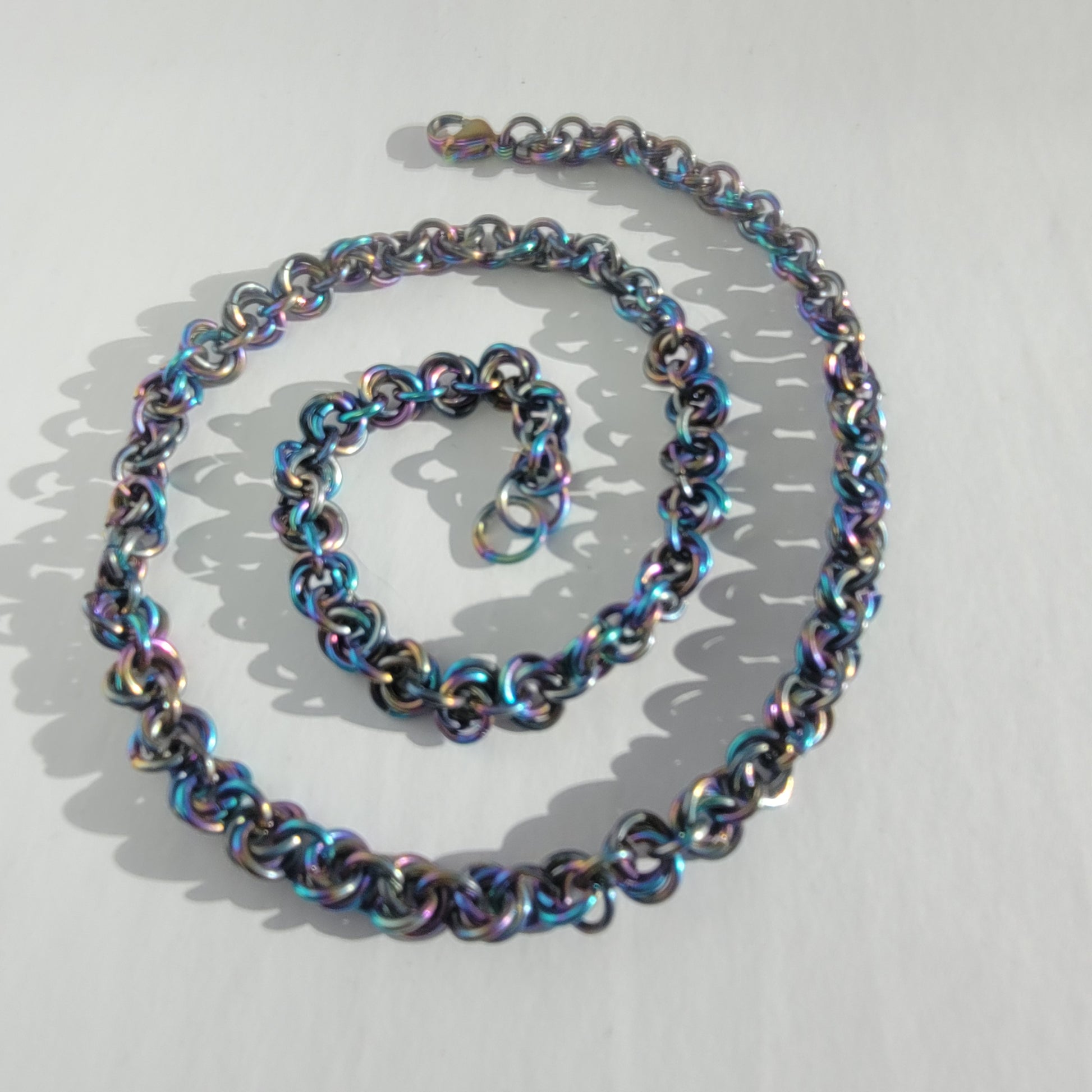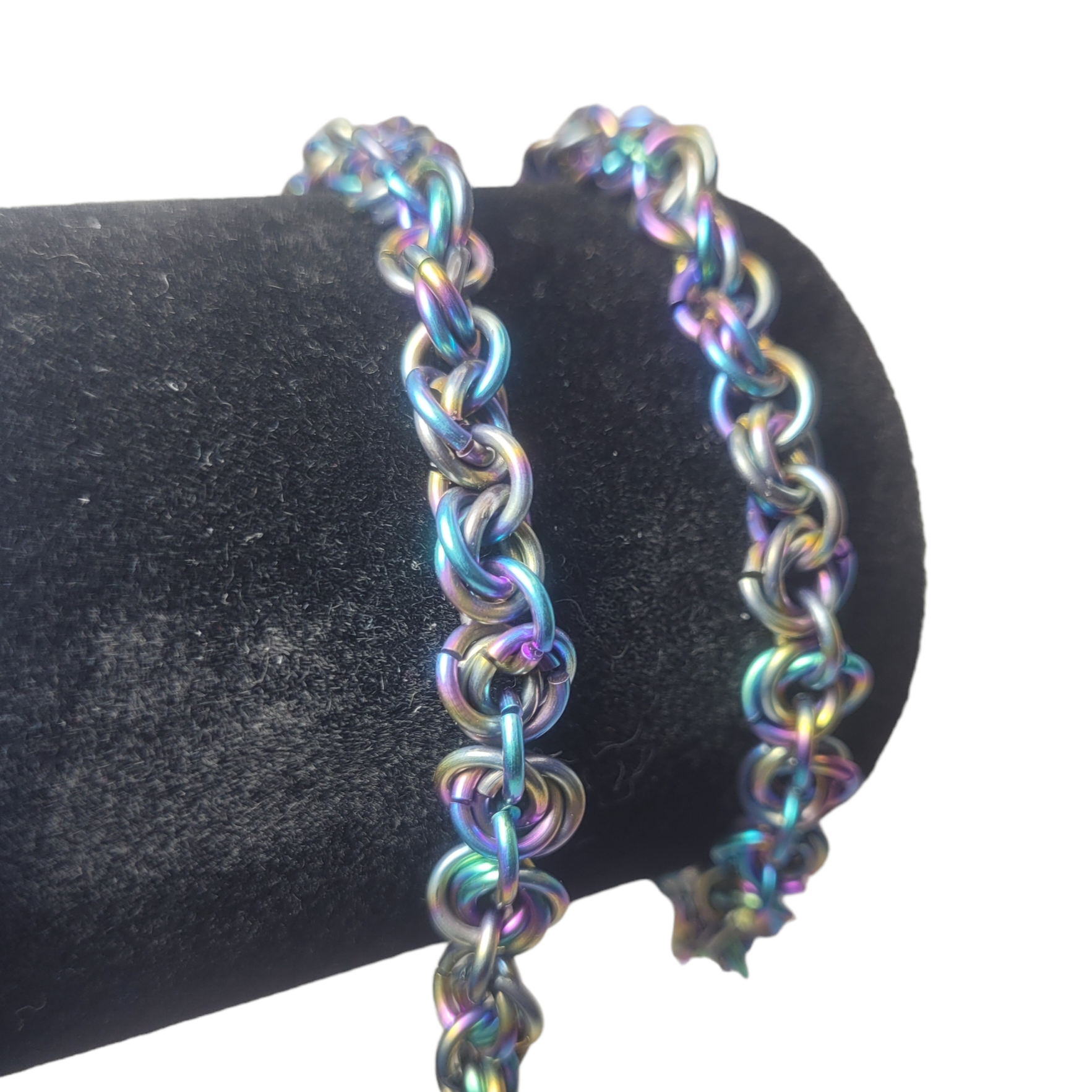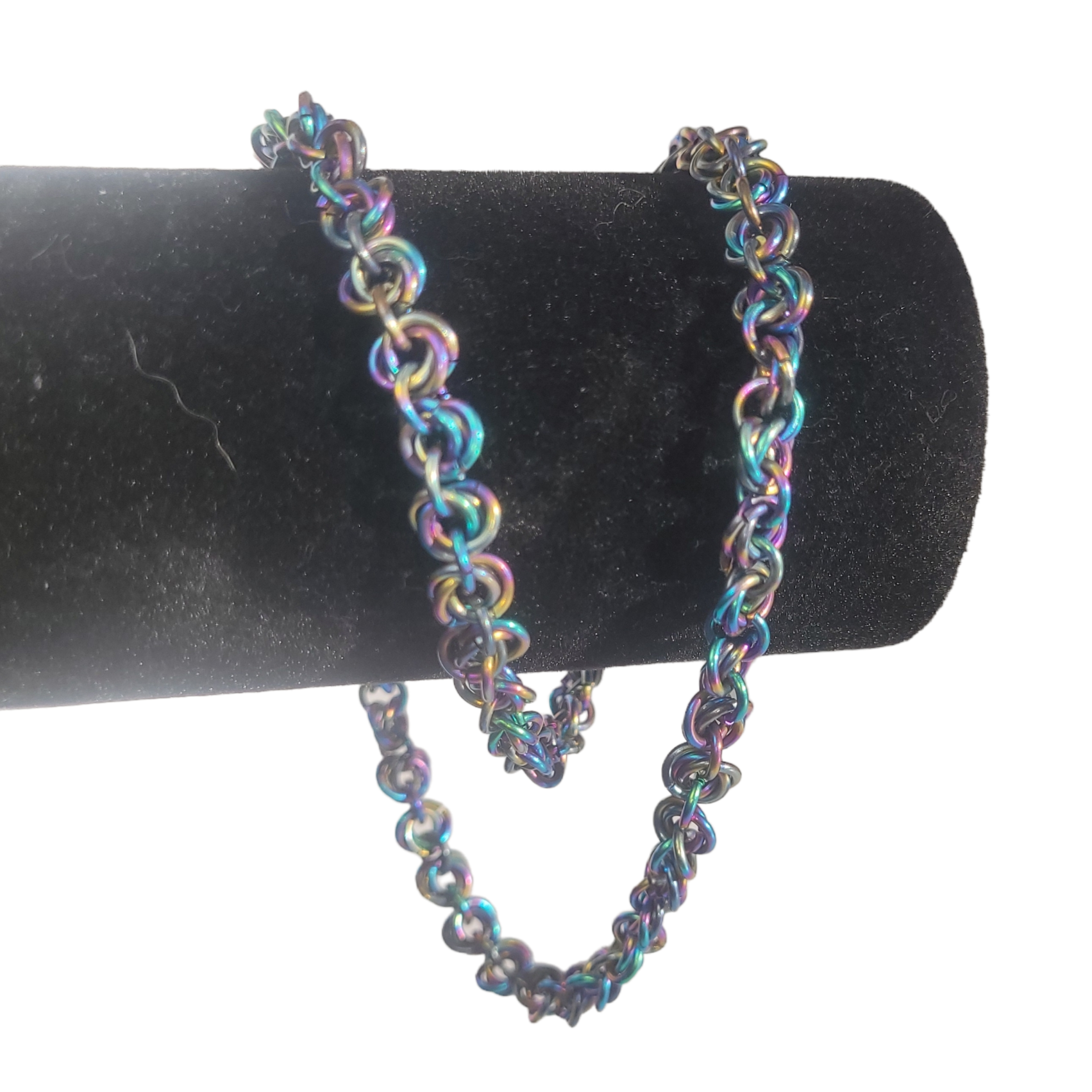 This necklace is made of rainbow Titanium rings and a stainless steel lobster clasp. This is a rosette weave.