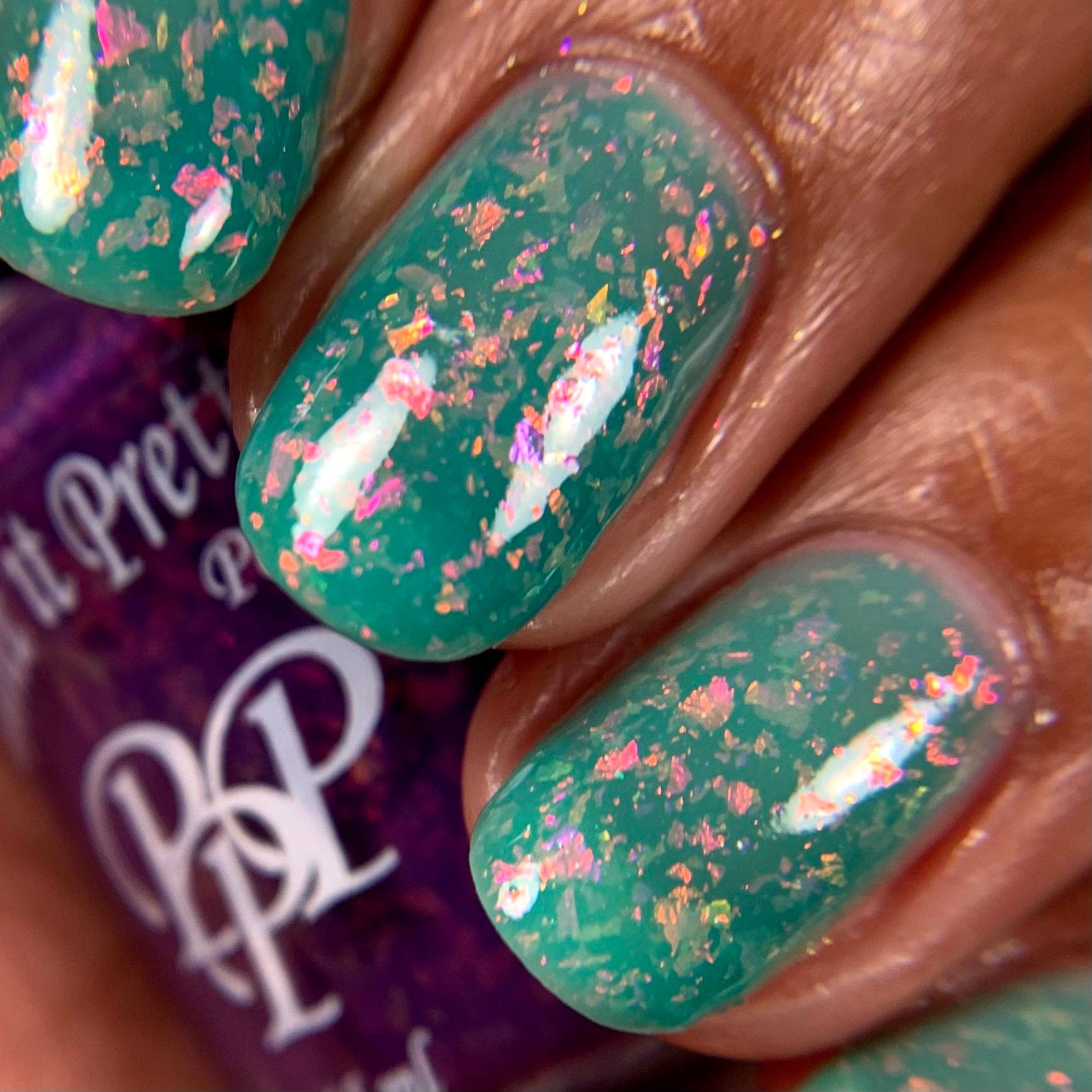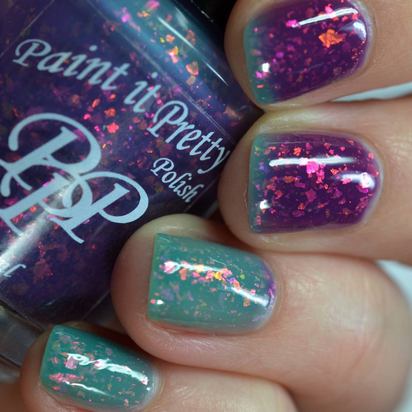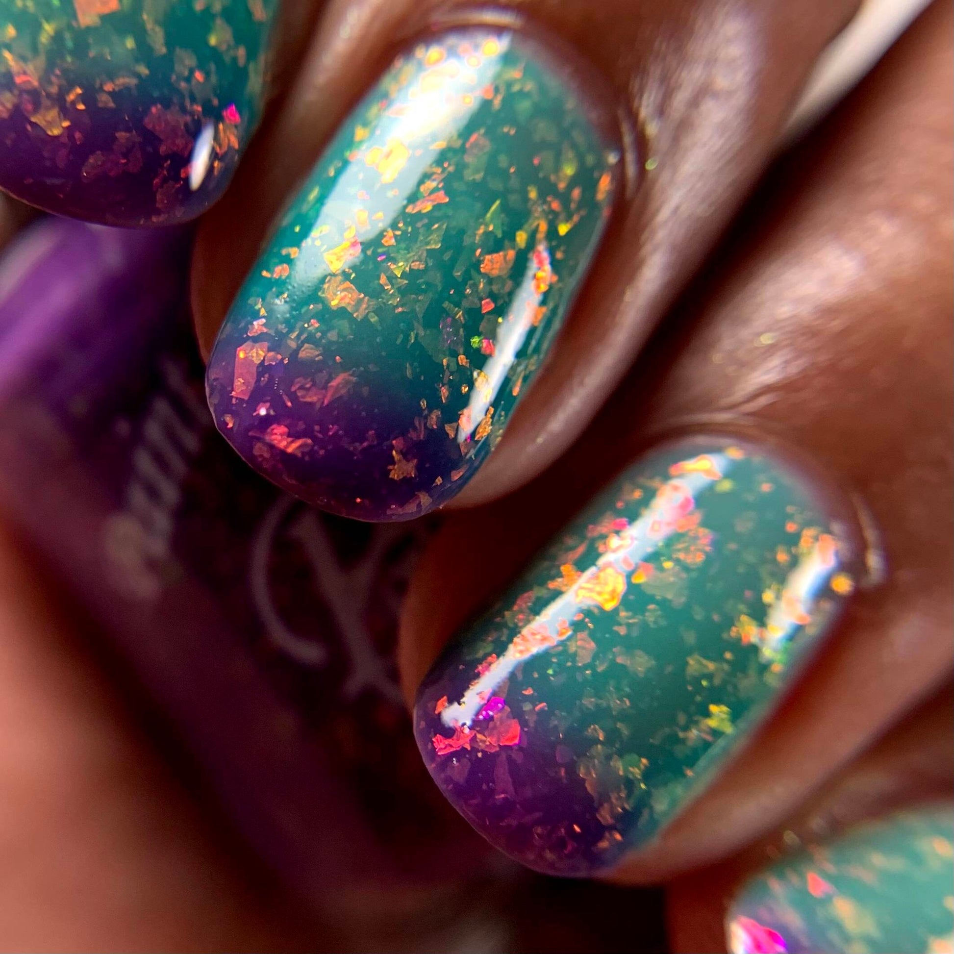 Robin's Egg it's quite an unique thermal nail polish due to it's contrasting colors. It has a jelly like formula that shift it's shade from a deep violet (cold) to vibrant turquoise shade (warm). It's also packed with iridescent flackes in various sizes that shift the color from gold to orange, pink, purple, green and aqua in certain angles.