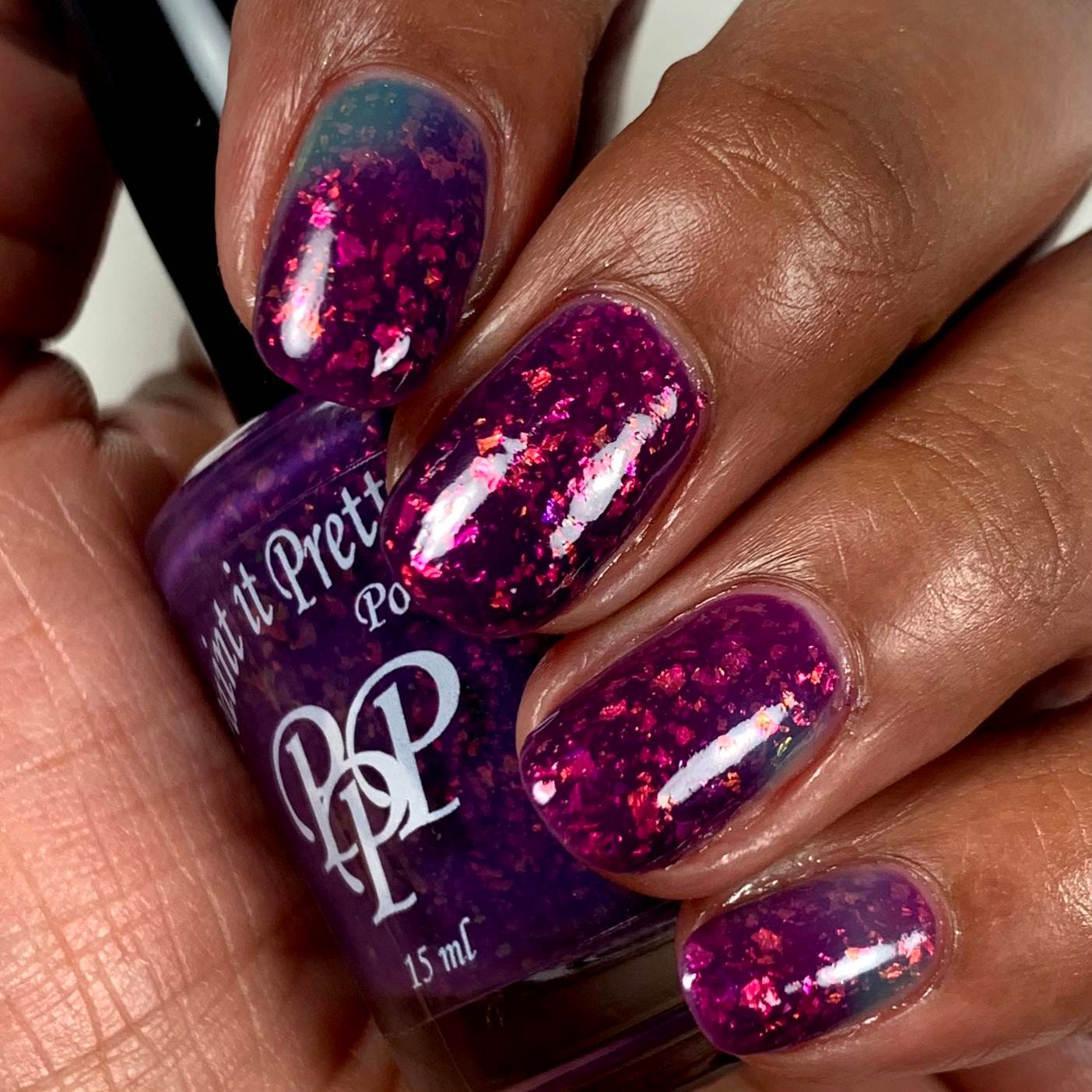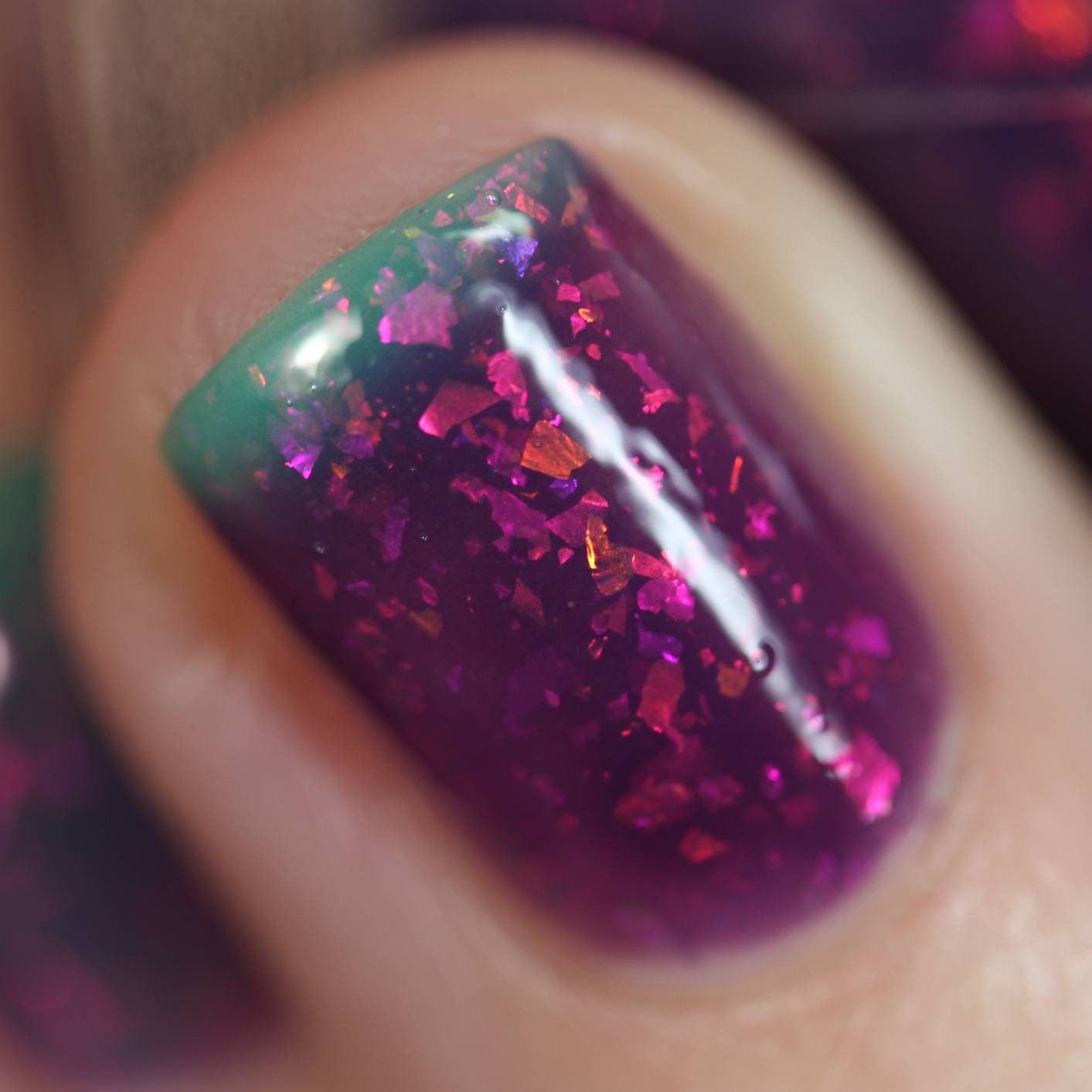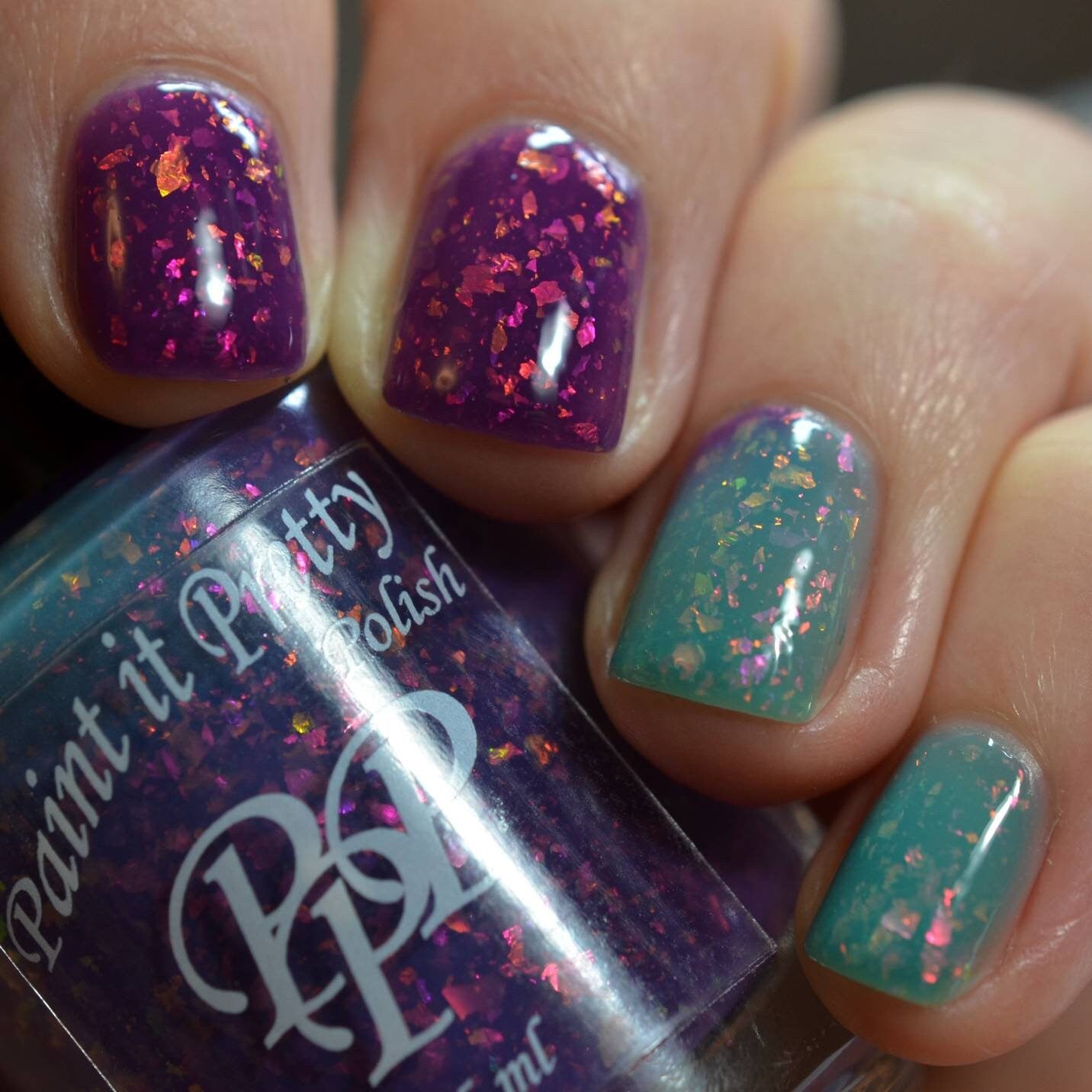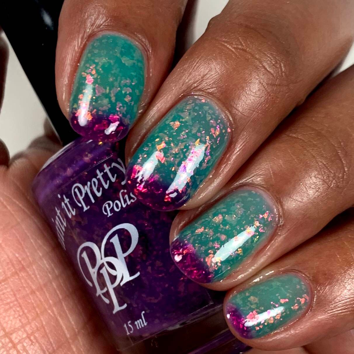 Robin's Egg it's quite an unique thermal nail polish due to it's contrasting colors. It has a jelly like formula that shift it's shade from a deep violet (cold) to vibrant turquoise shade (warm). It's also packed with iridescent flackes in various sizes that shift the color from gold to orange, pink, purple, green and aqua in certain angles.