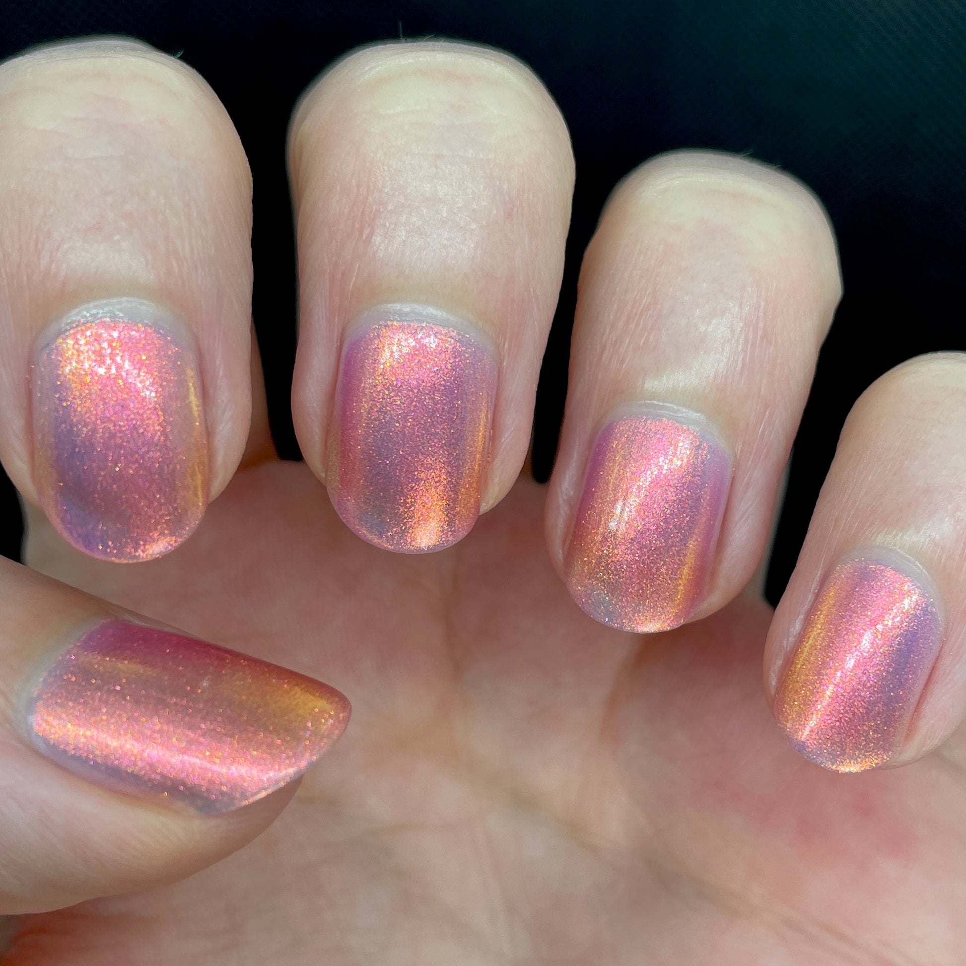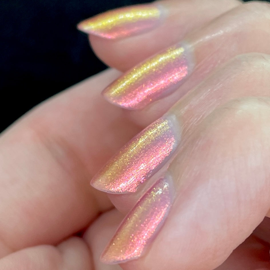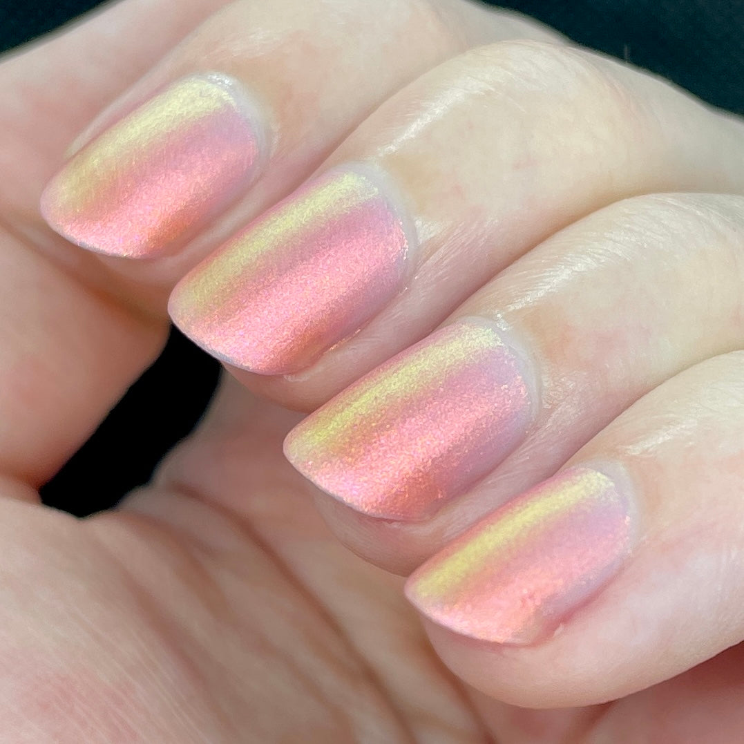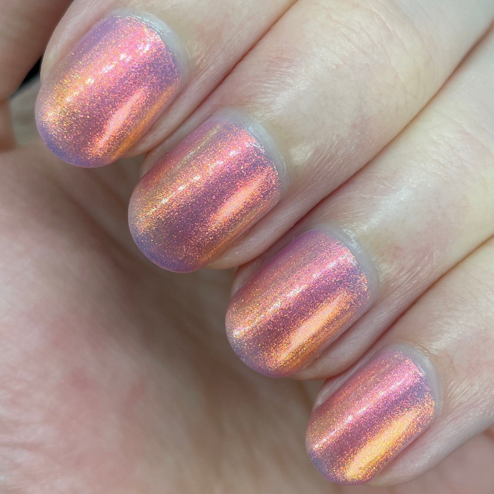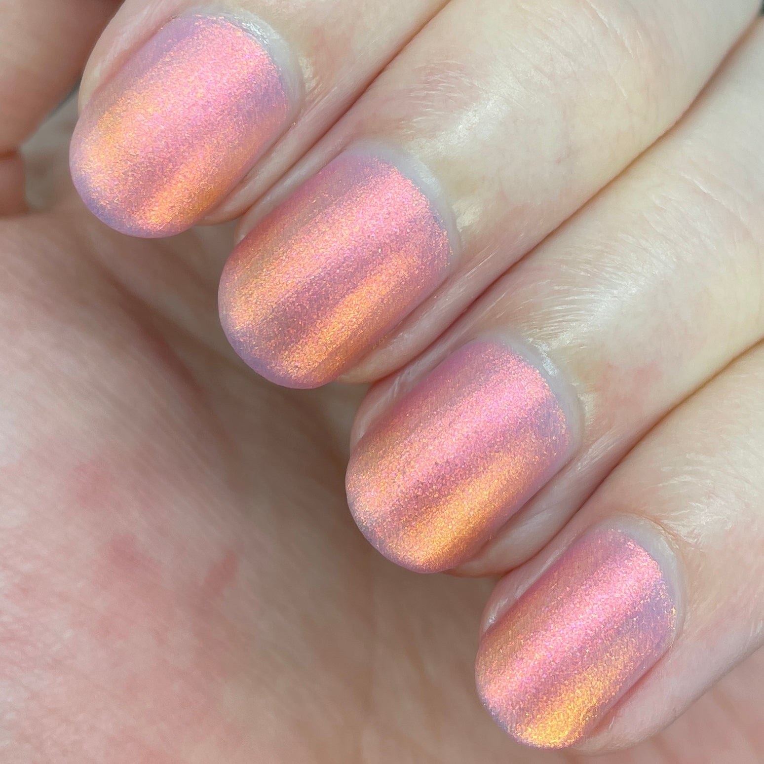 Skyline Views is a sheer light pink with a pink to orange to yellow shimmer