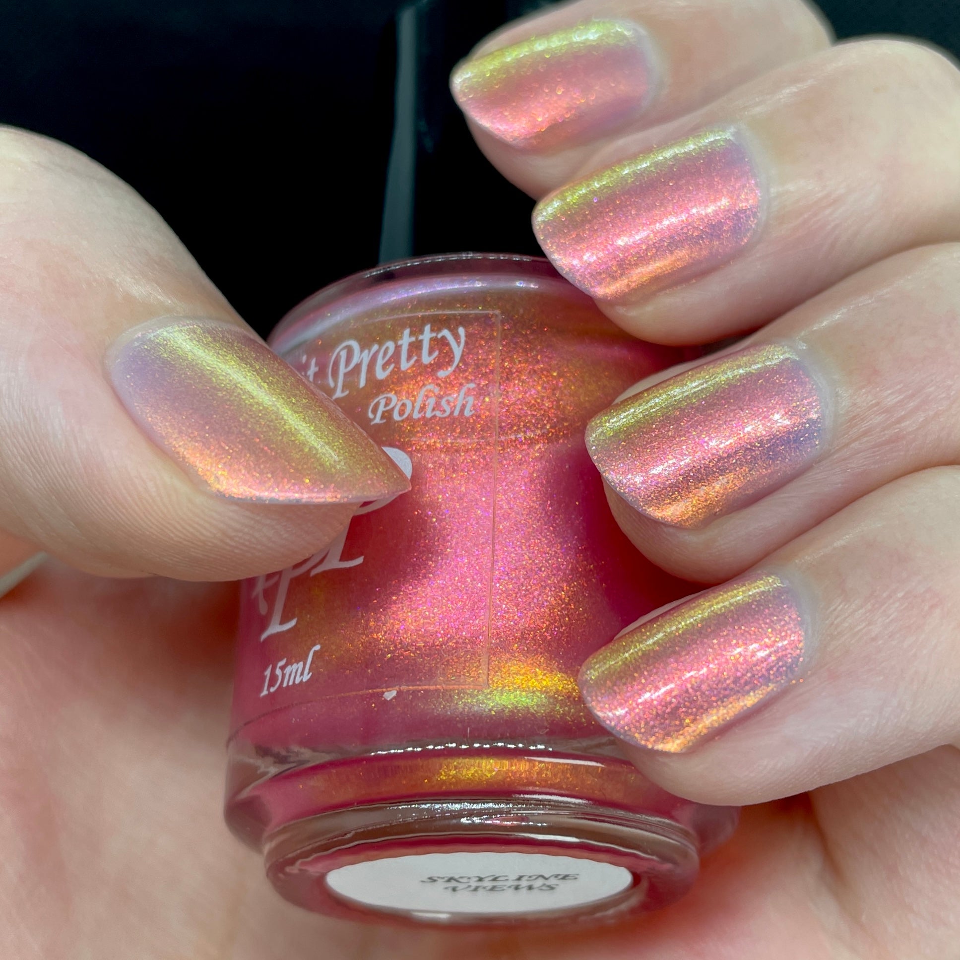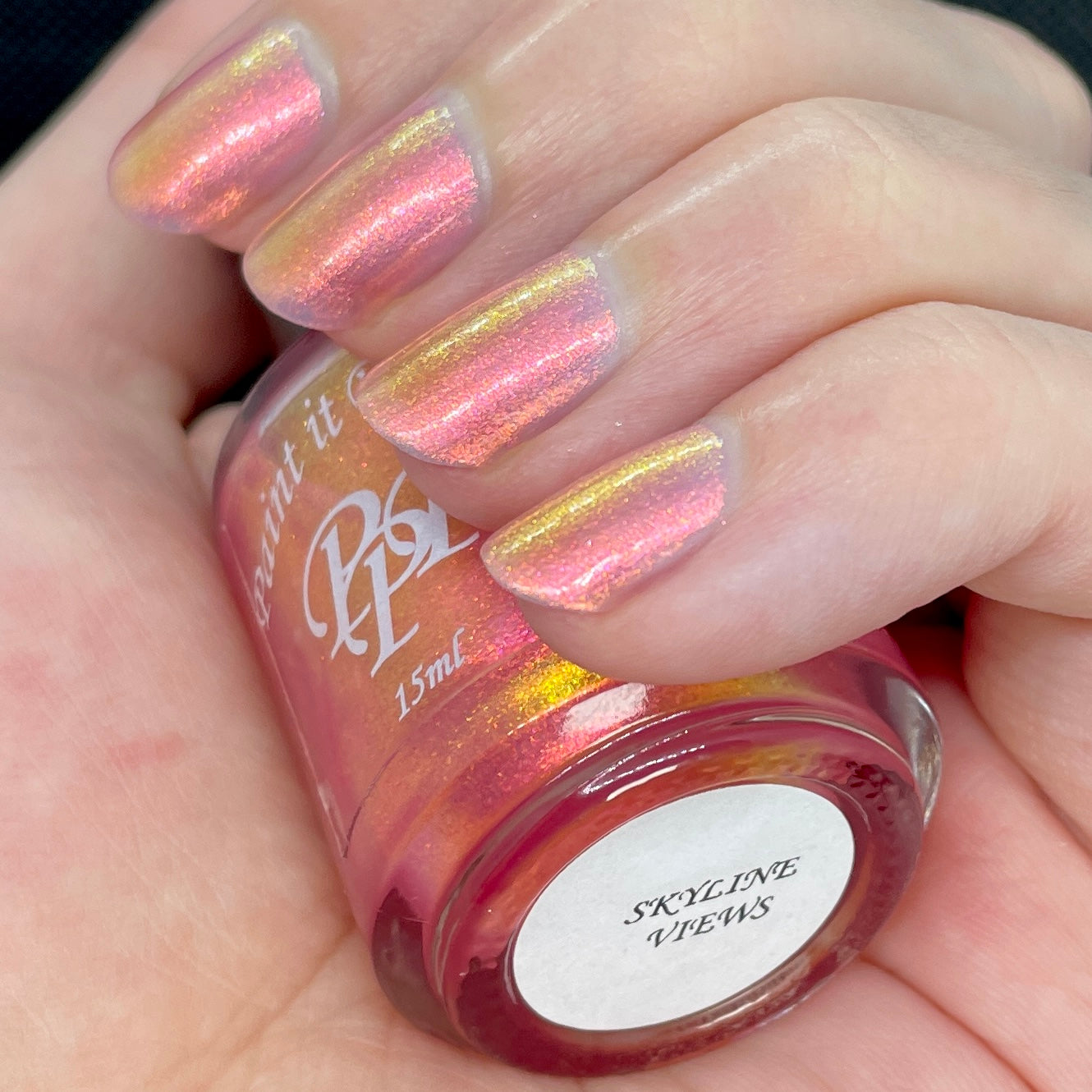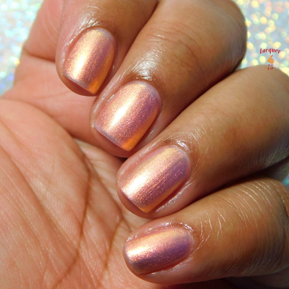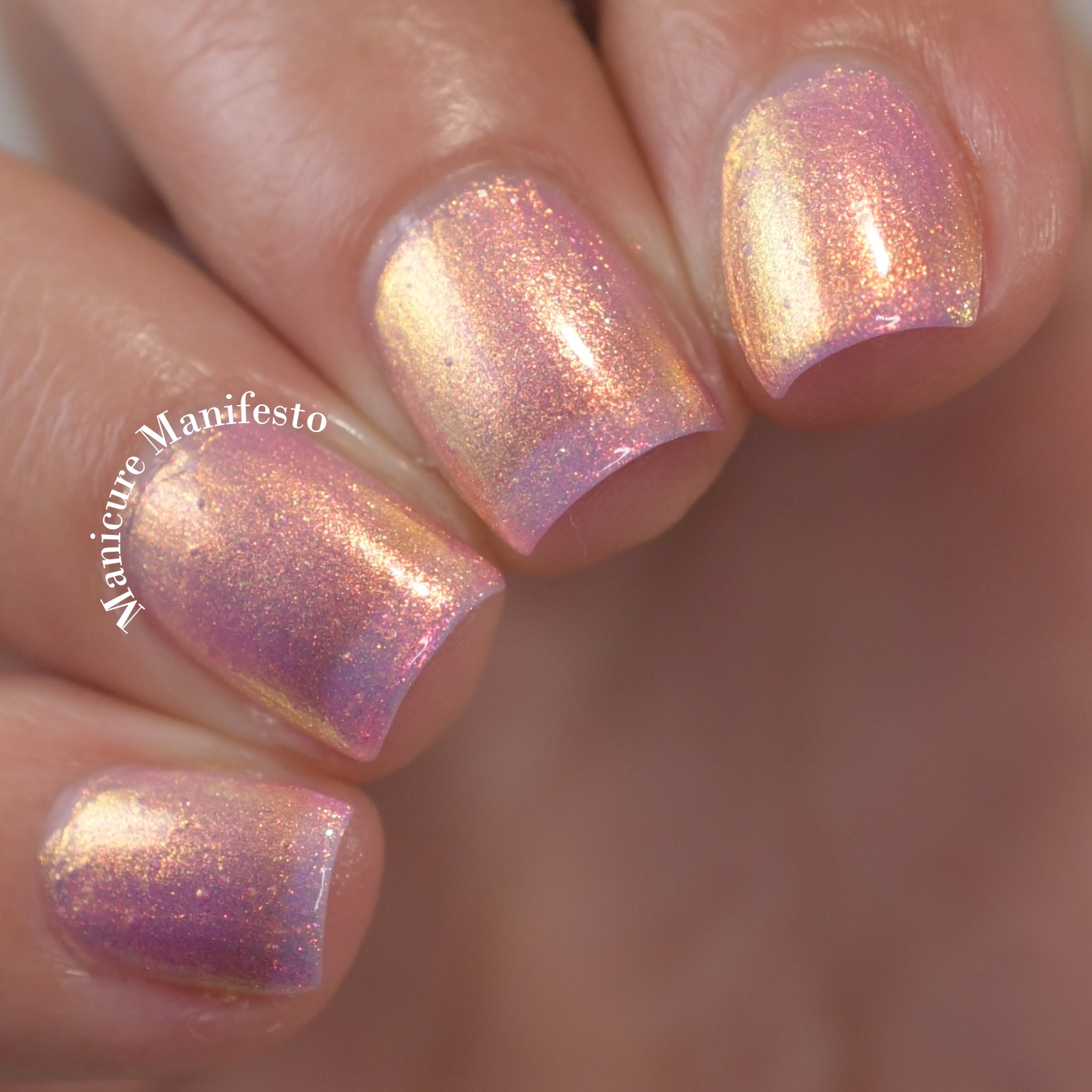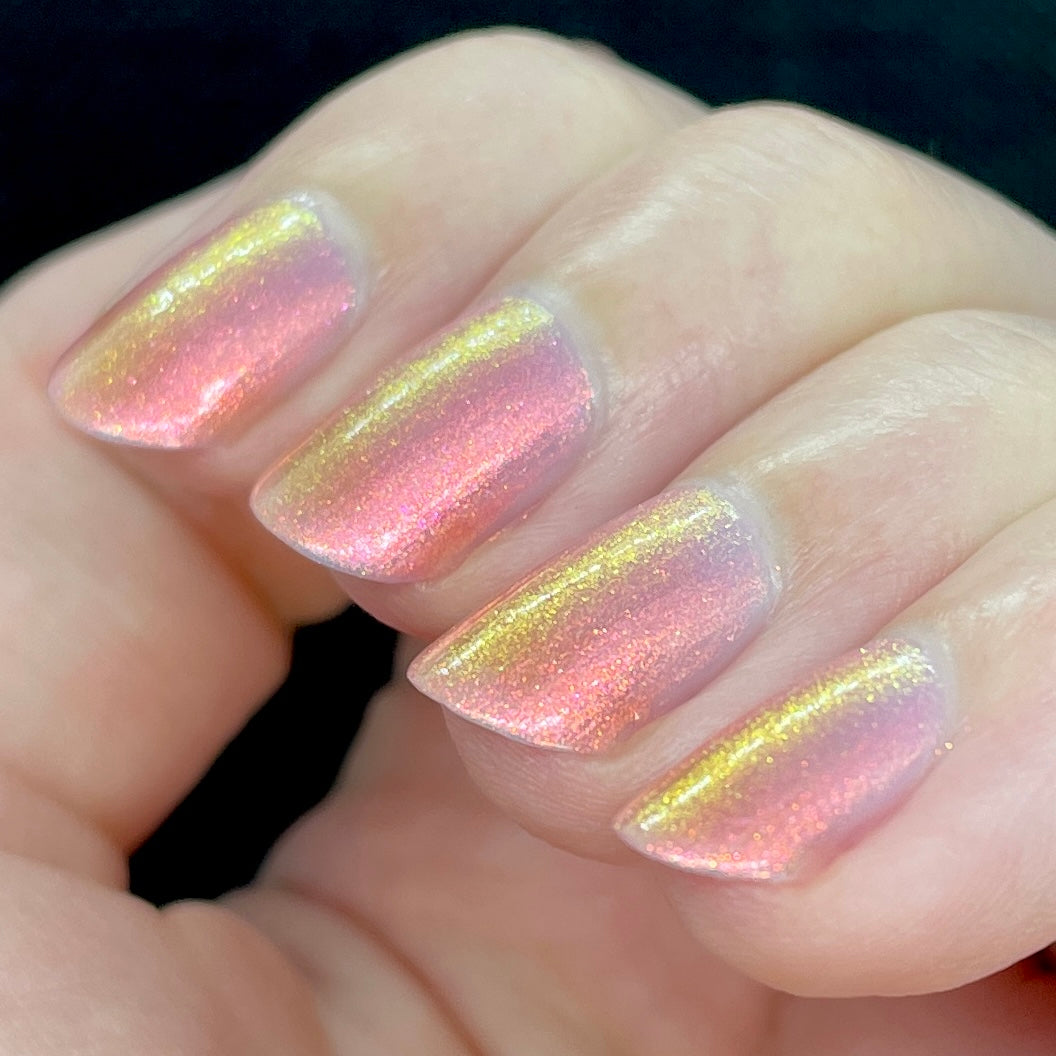 Skyline Views is a sheer light pink with a pink to orange to yellow shimmer