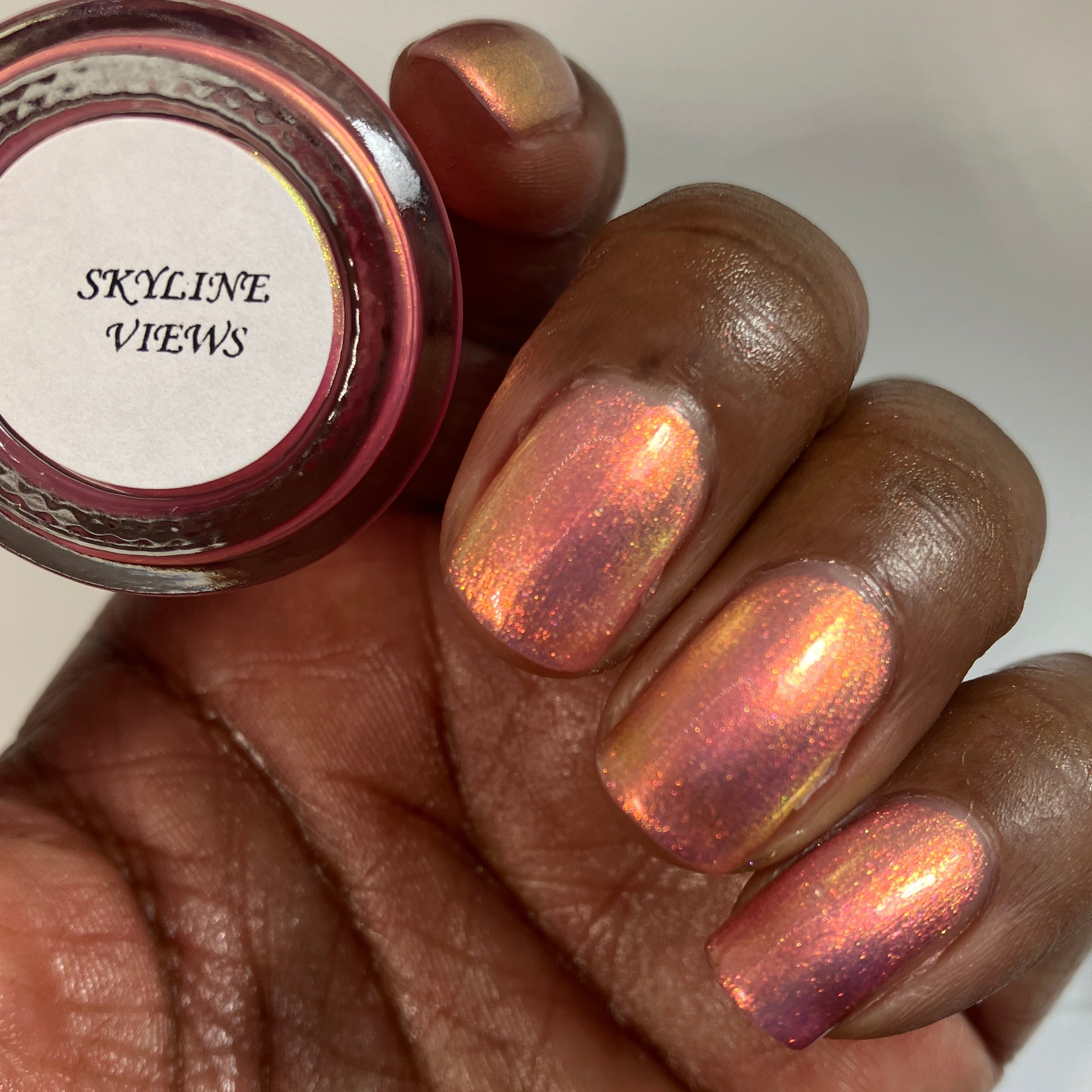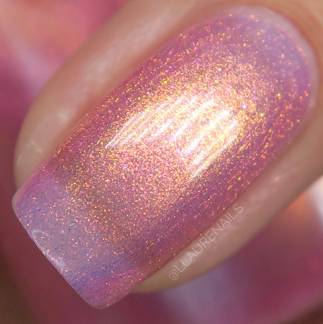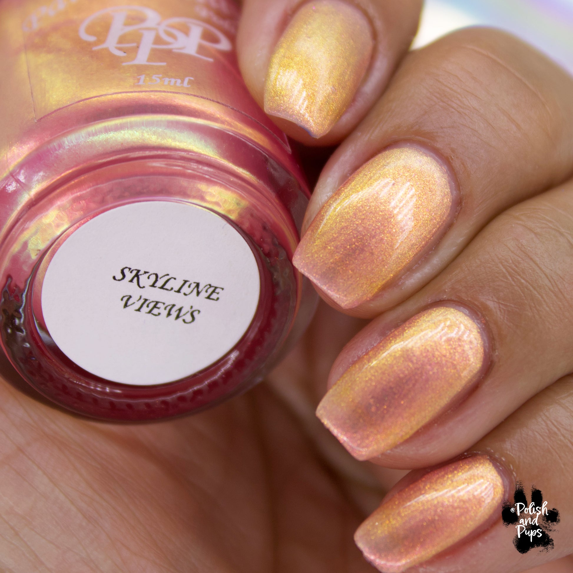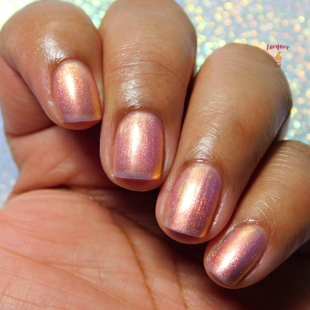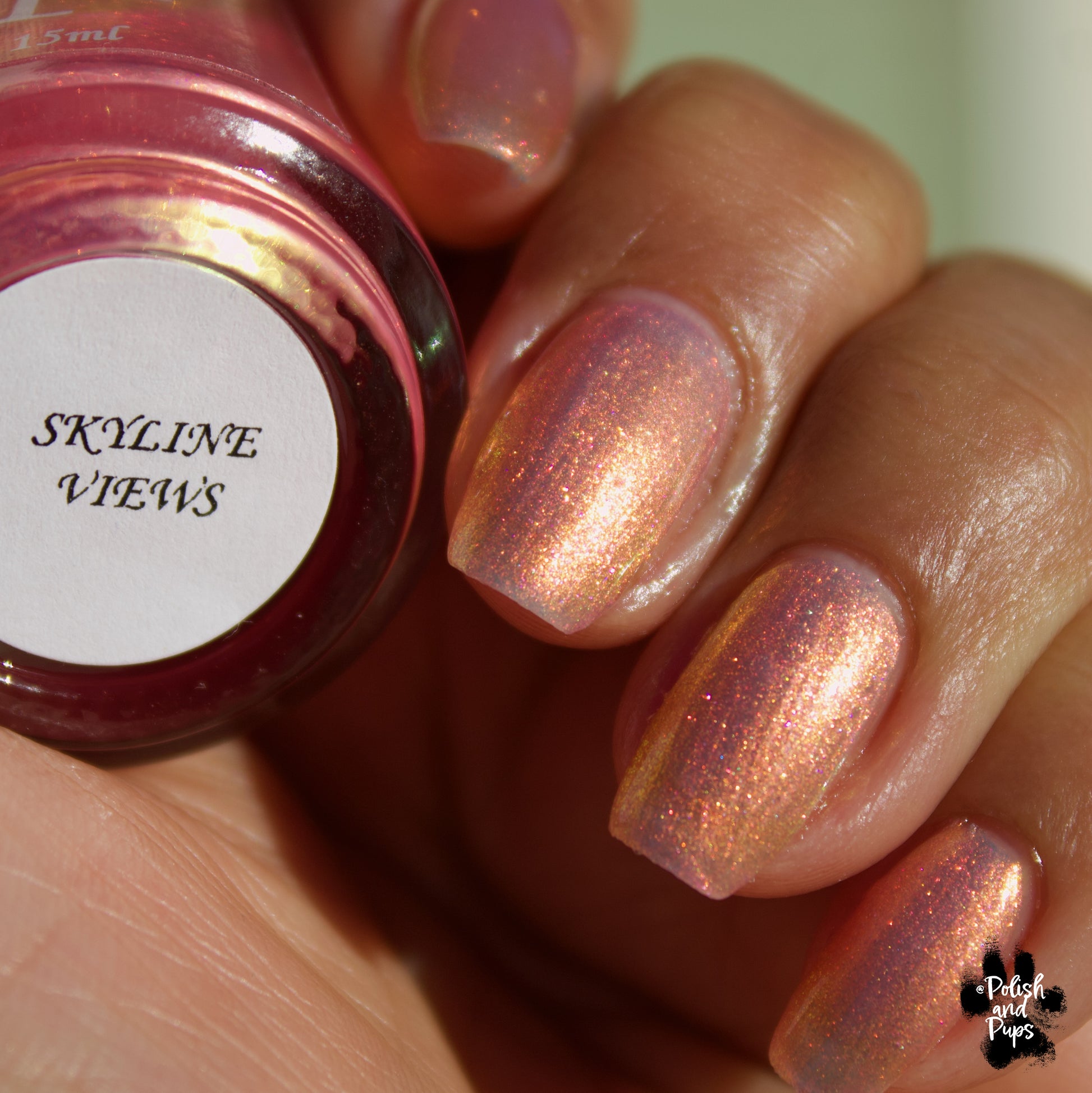 Skyline Views is a sheer light pink with a pink to orange to yellow shimmer