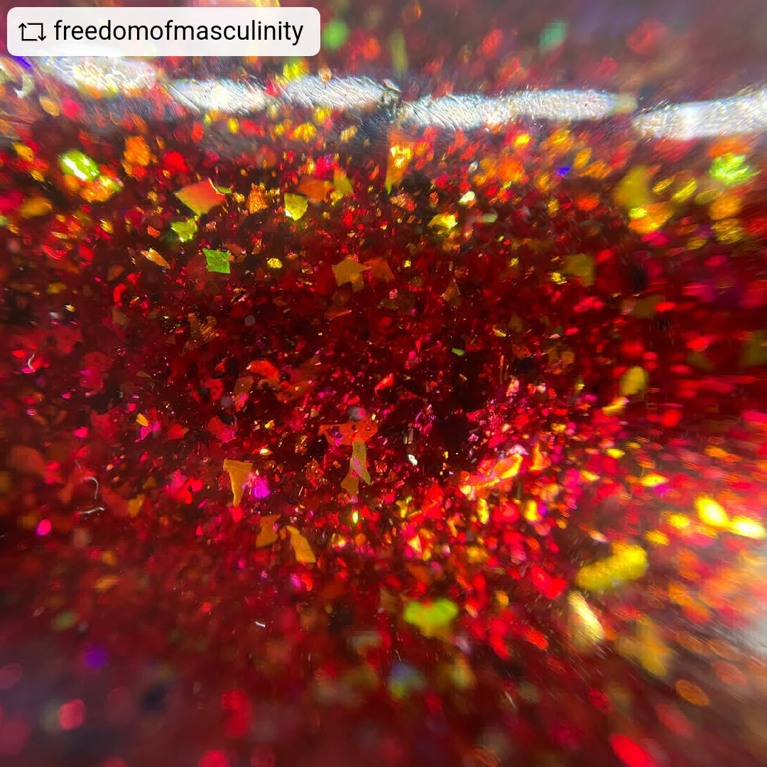 Sparkly and glittery a red base with red, orange, yellow irridescent flakes, red, gold chameleon flakes and a touch of black flakes
