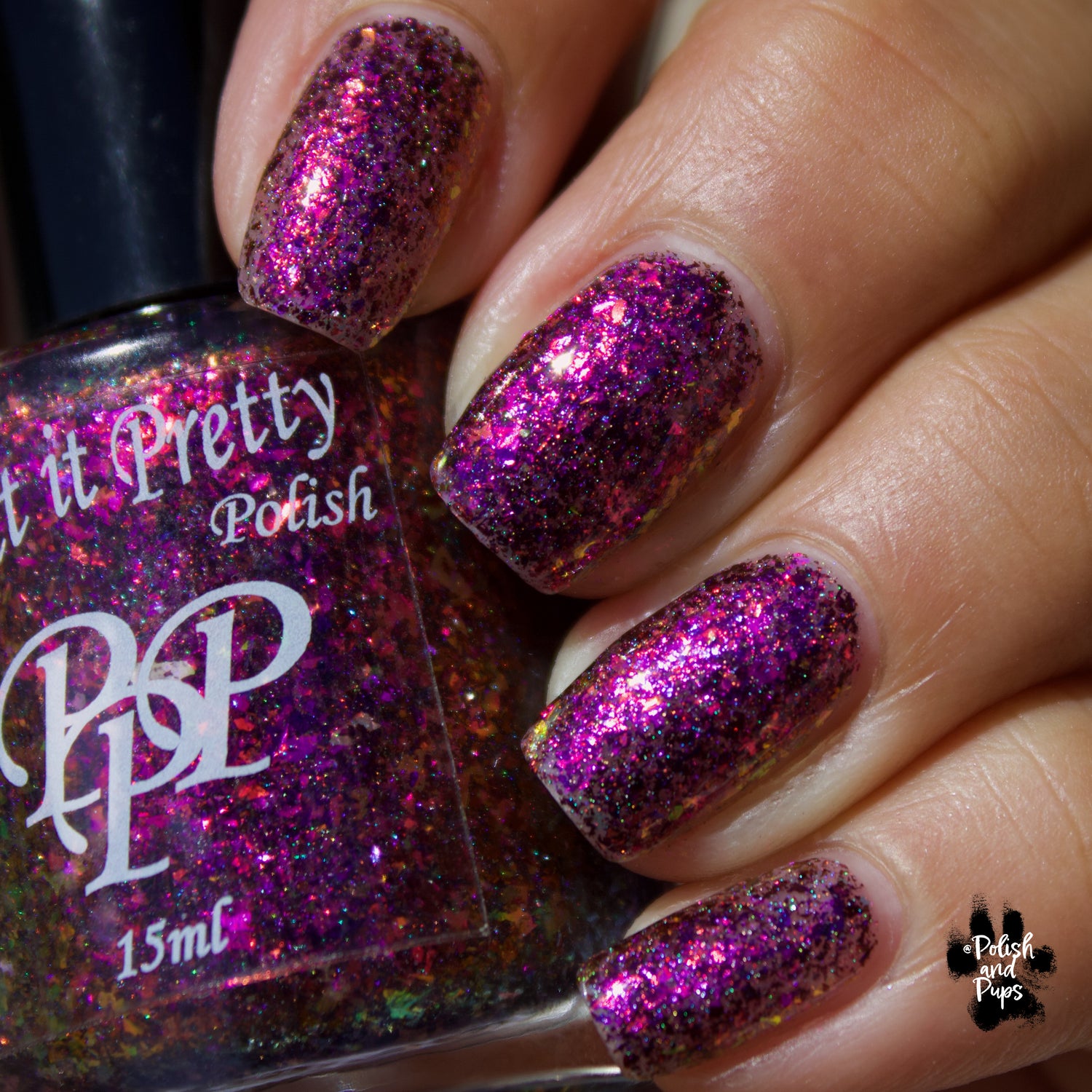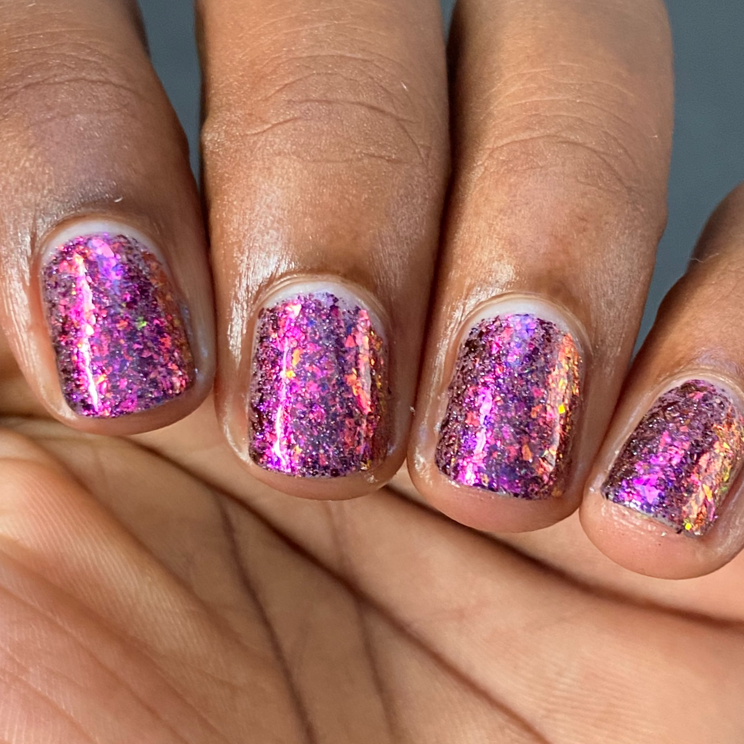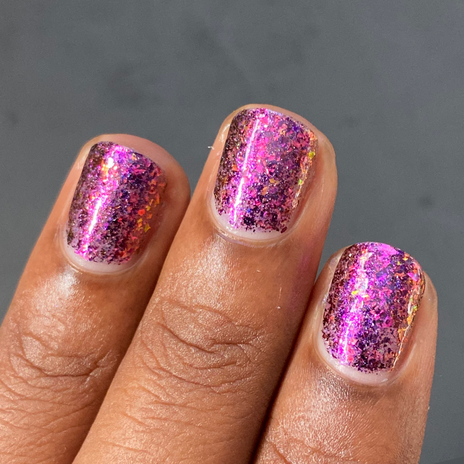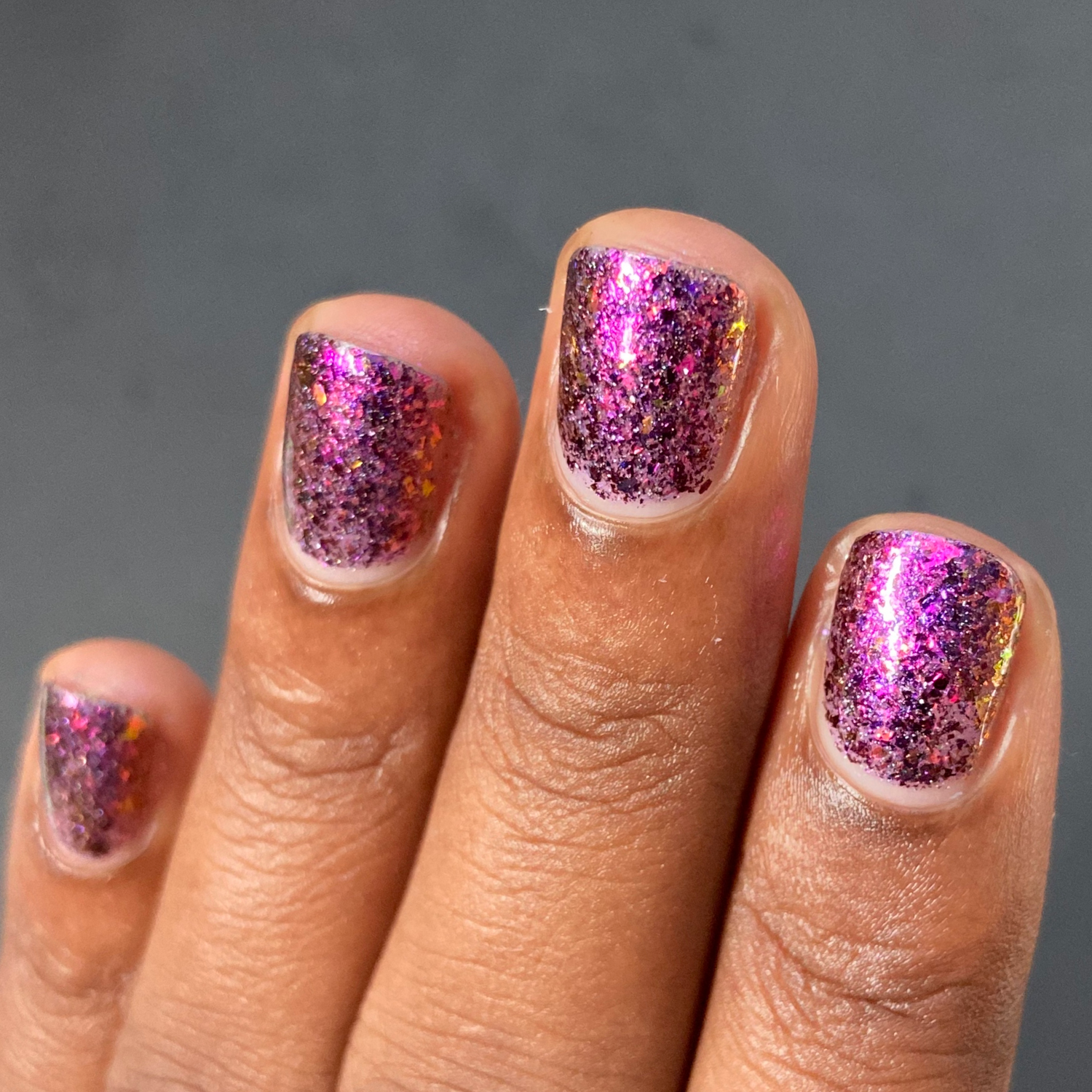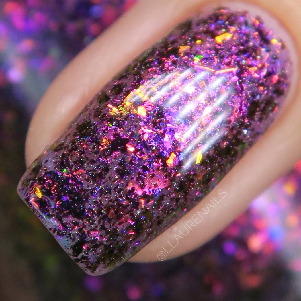 Sweater Weather is a purple based polish with pink/orange/green irridescent flakes, pink/purple/yellow chameleon flakes, and a touch of tiny holographic flakes