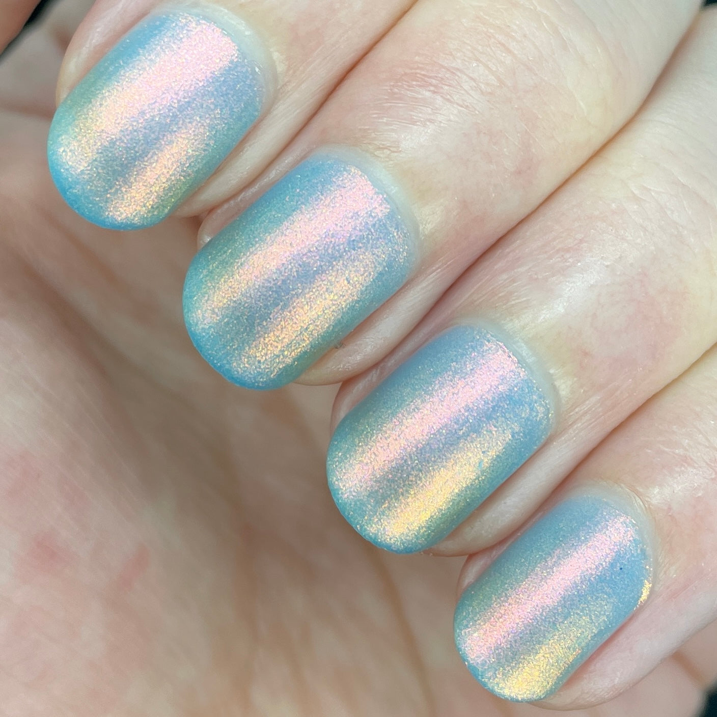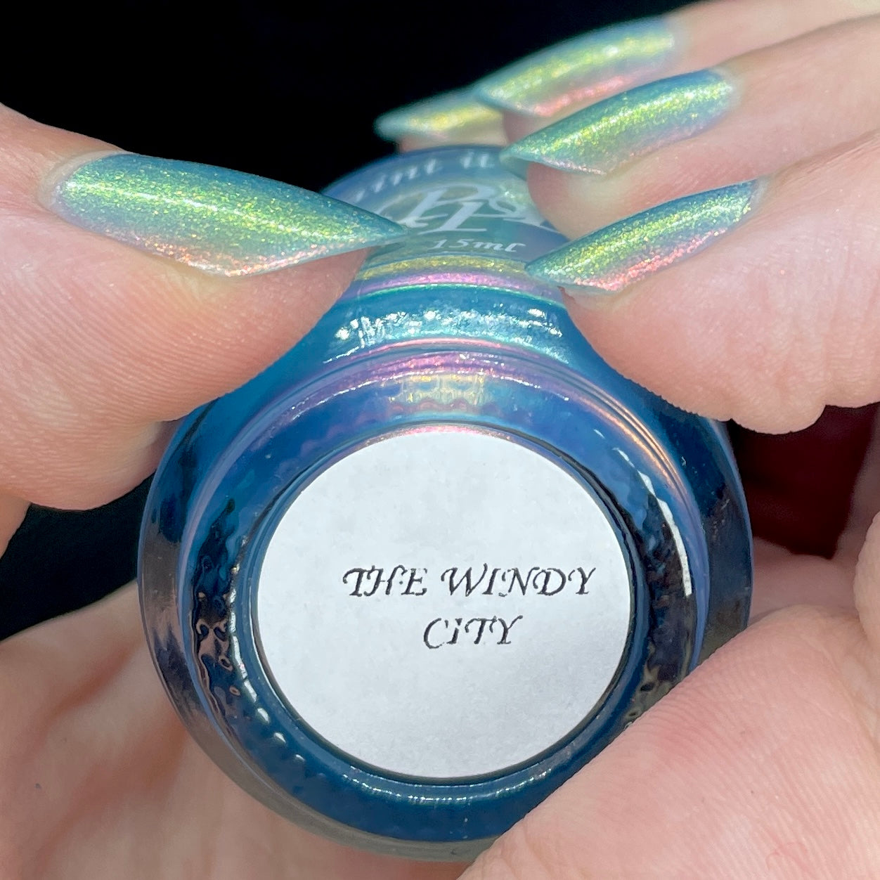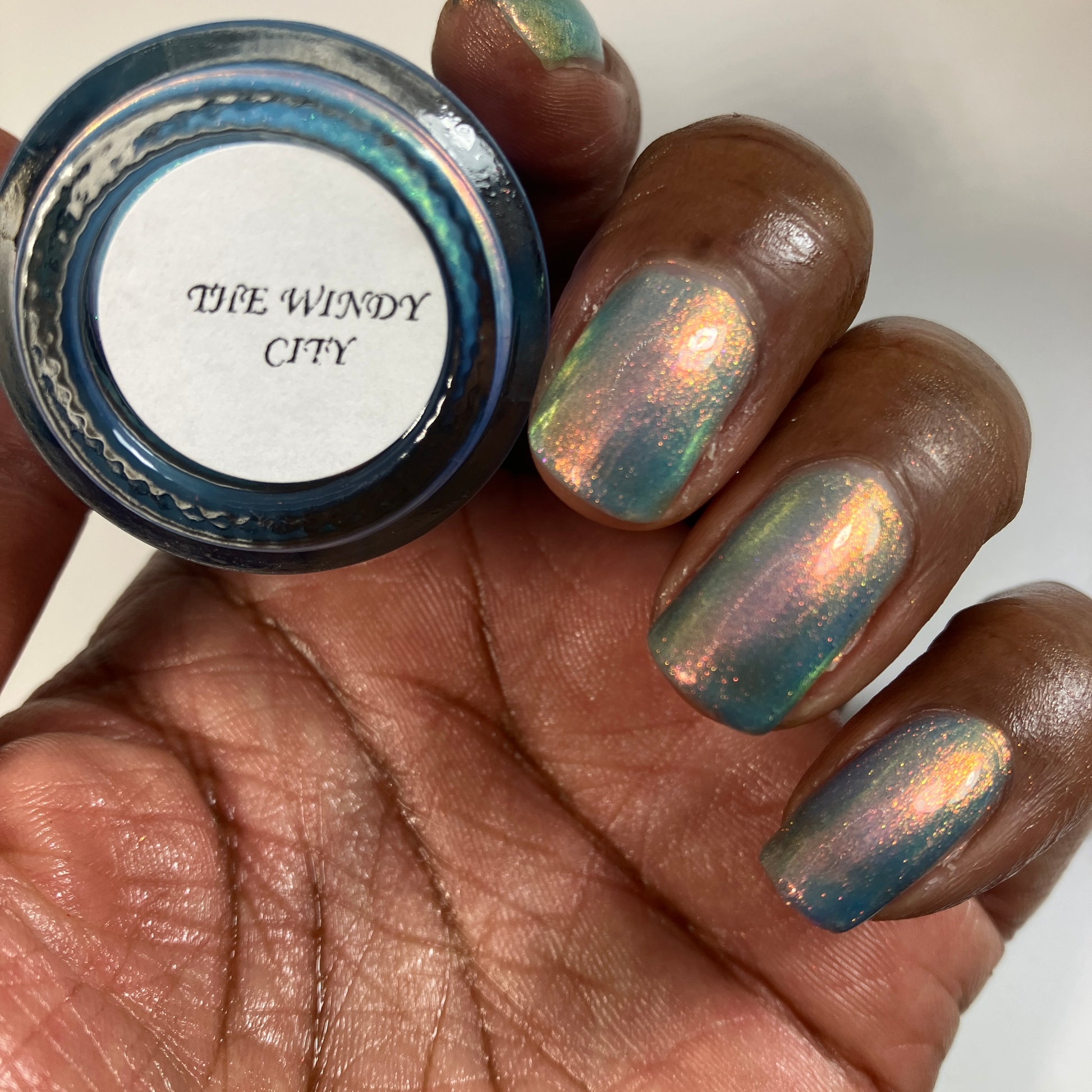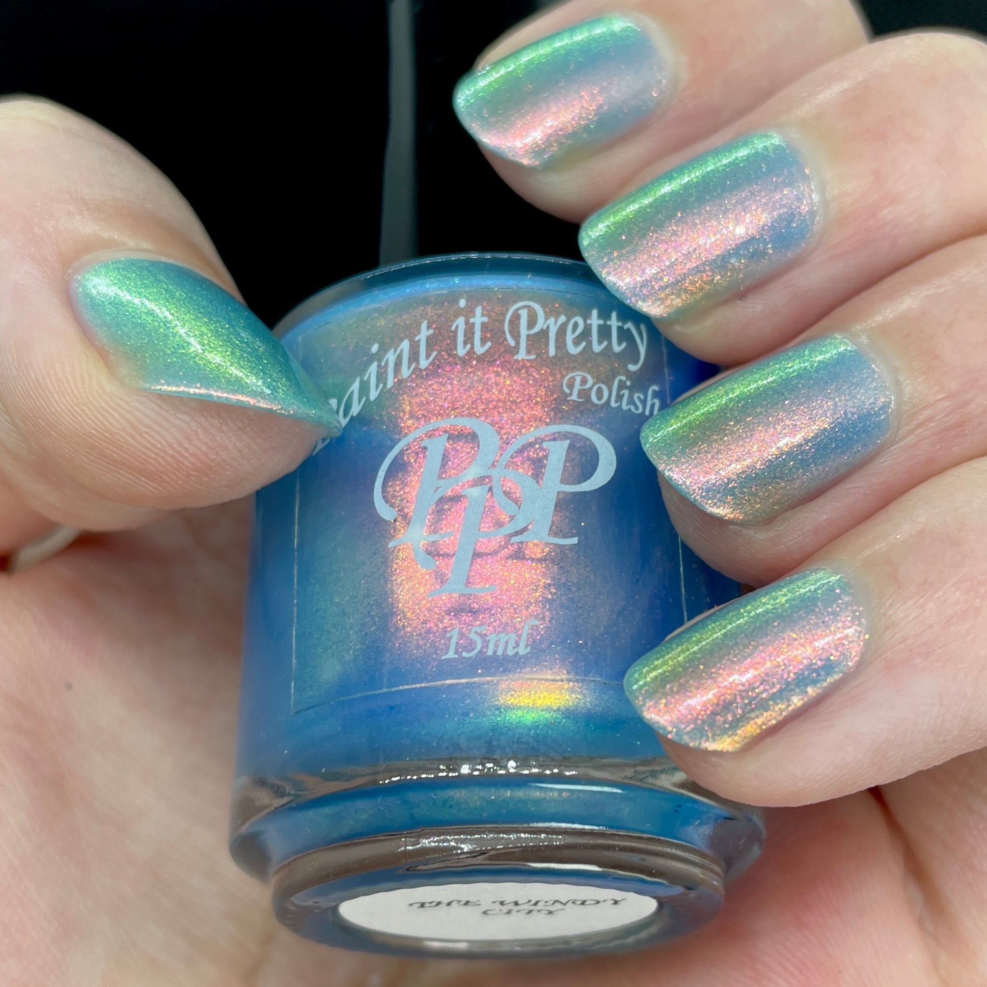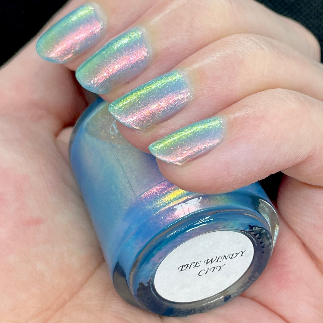 The Windy City is a light blue with pink to orange to yellow to green shimmer