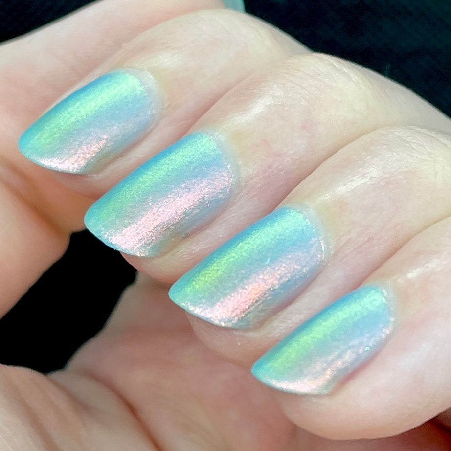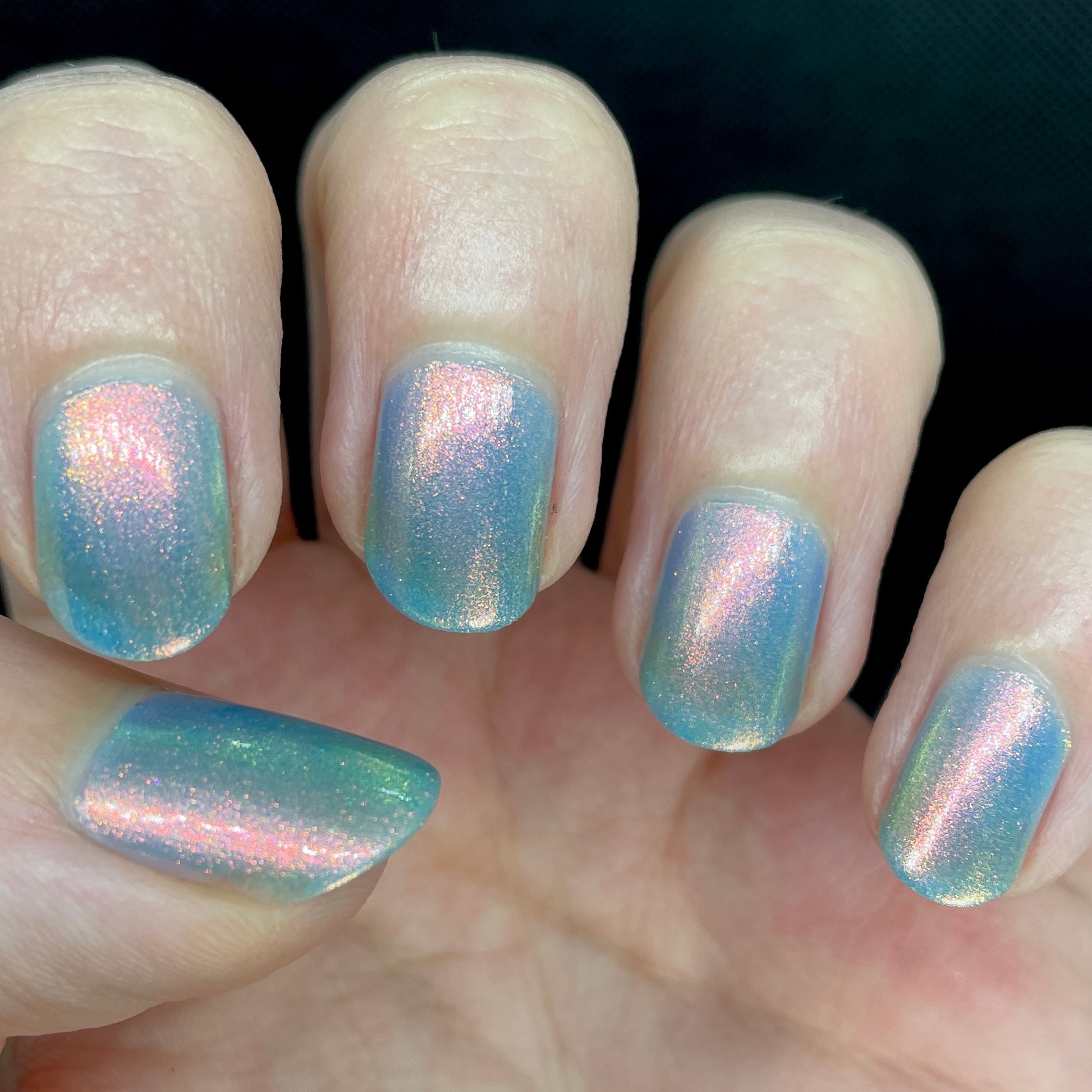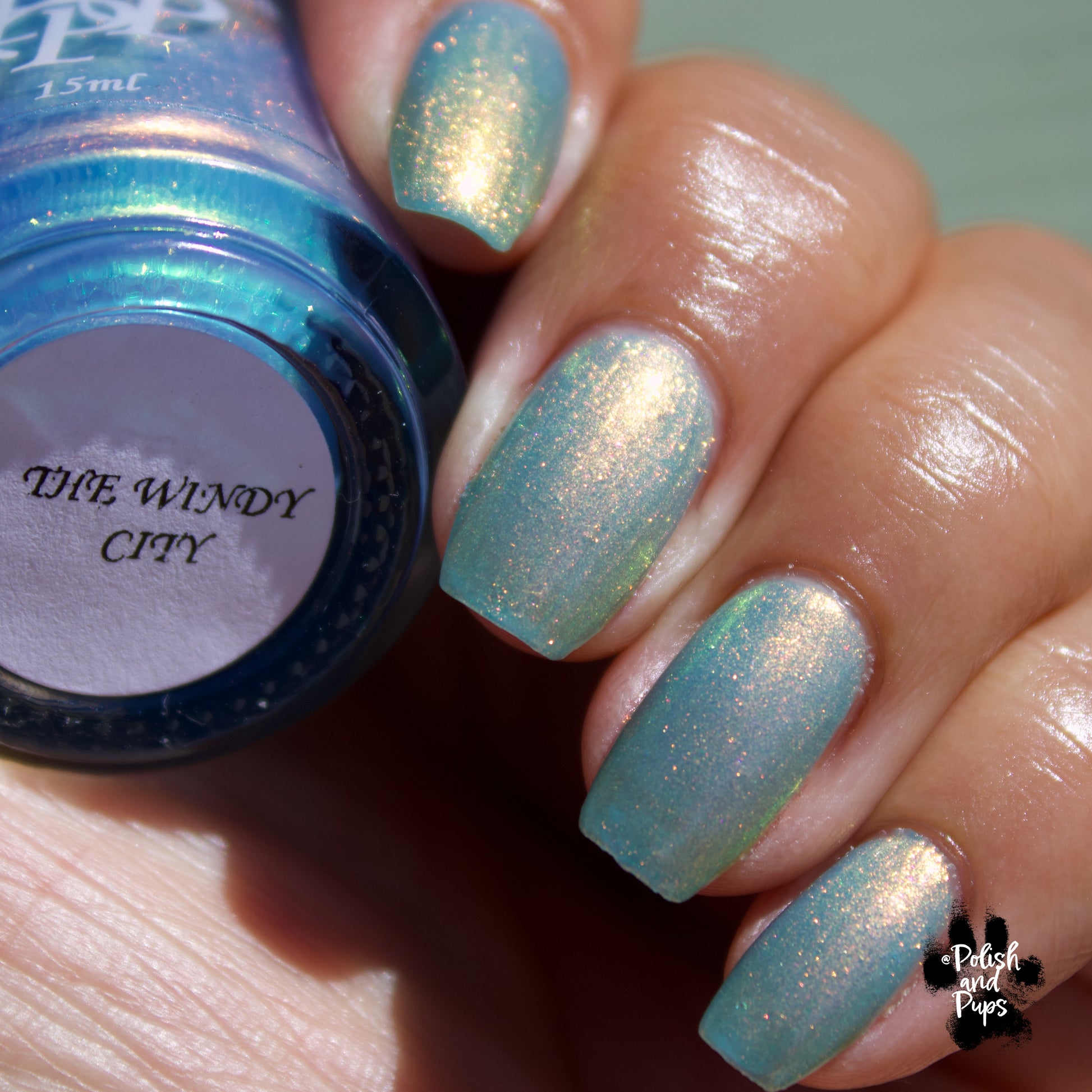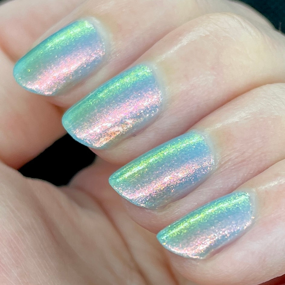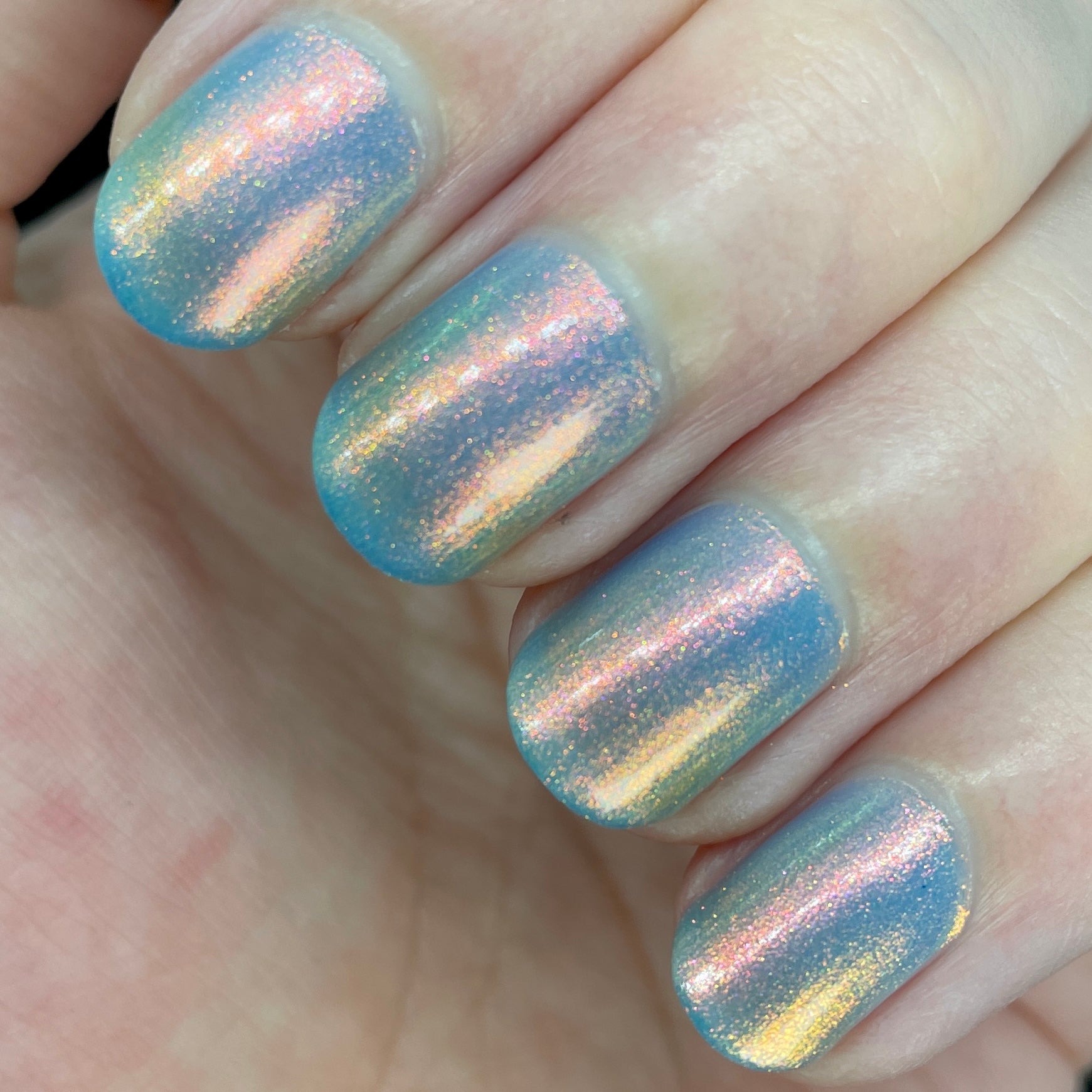 The Windy City is a light blue with pink to orange to yellow to green shimmer