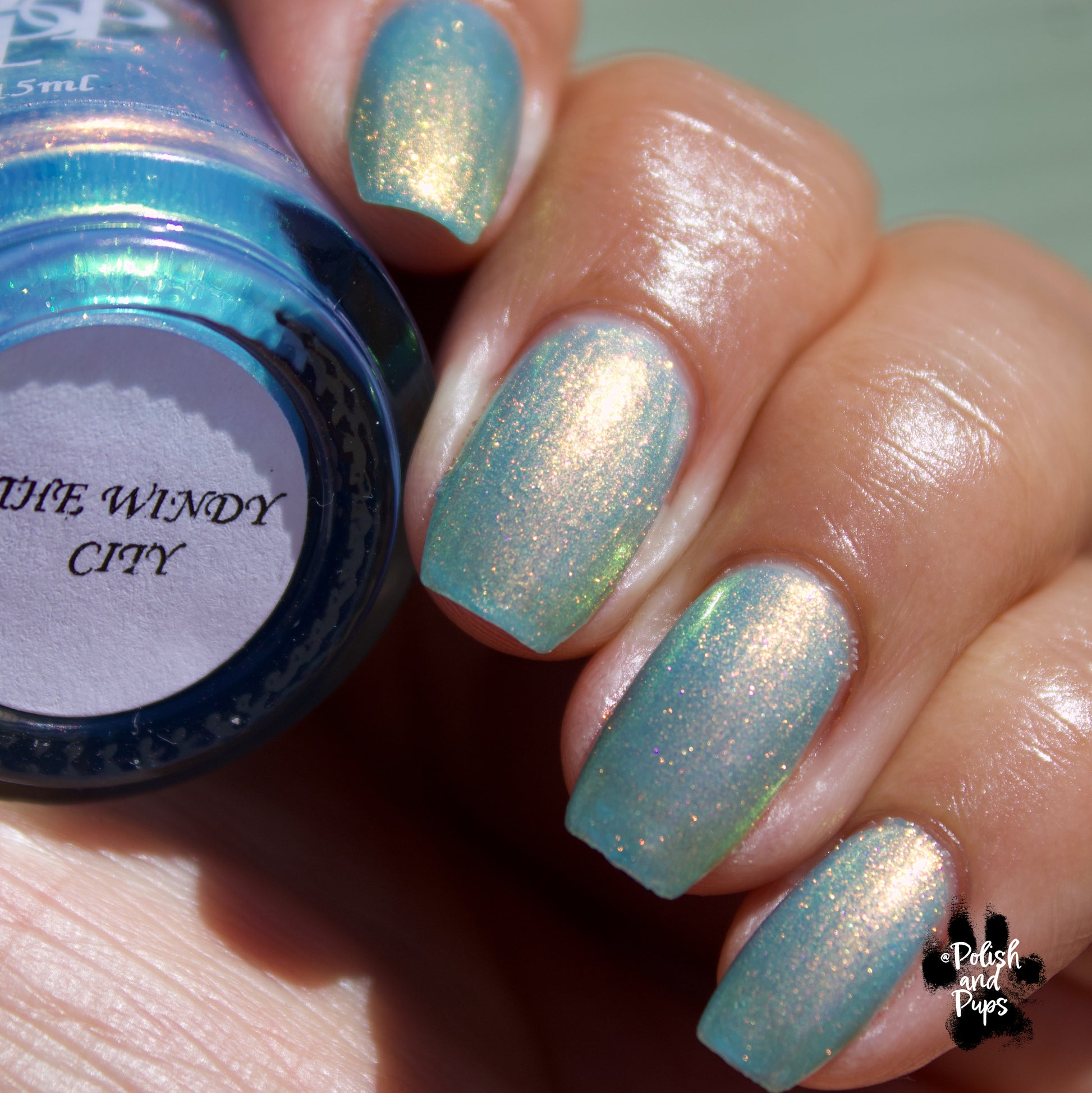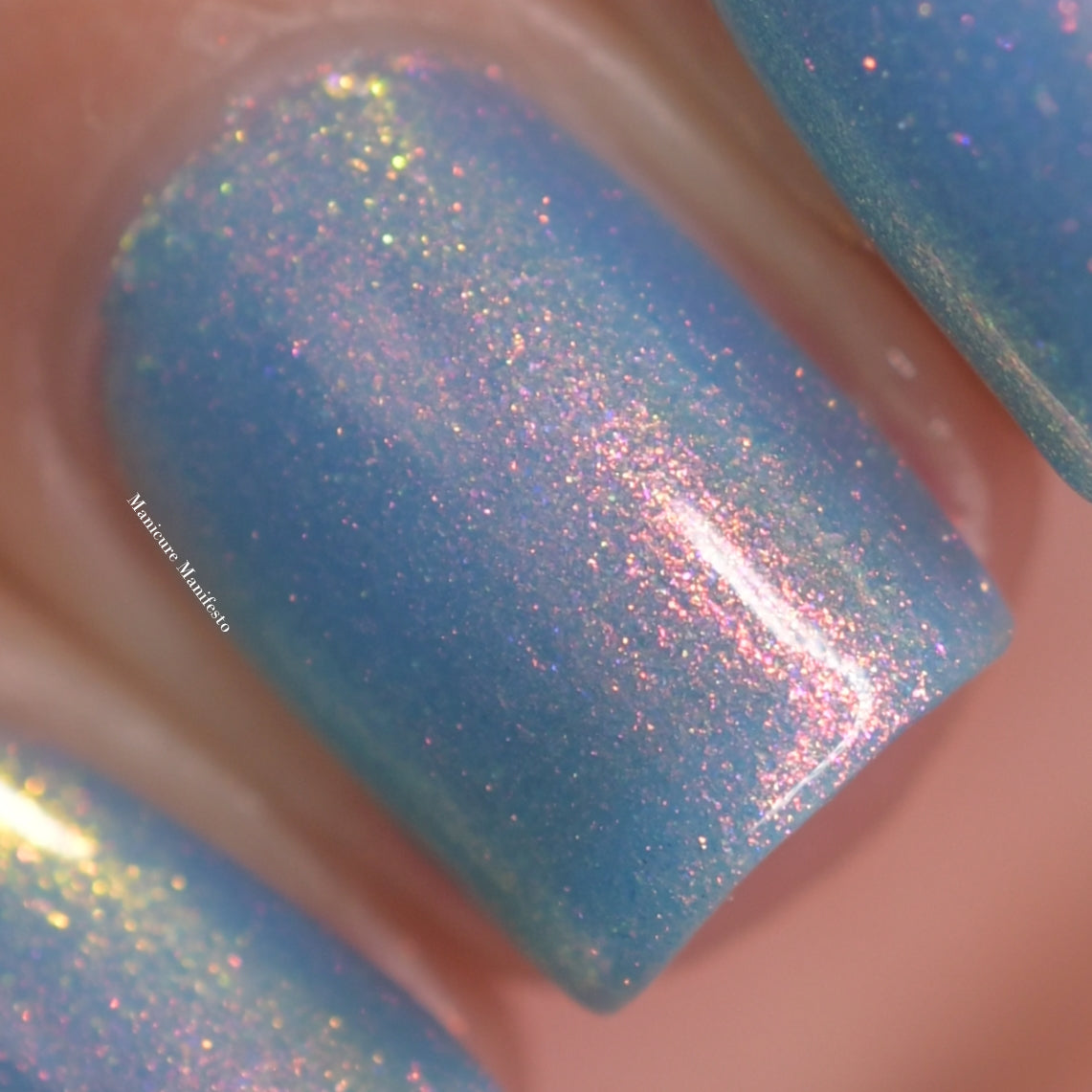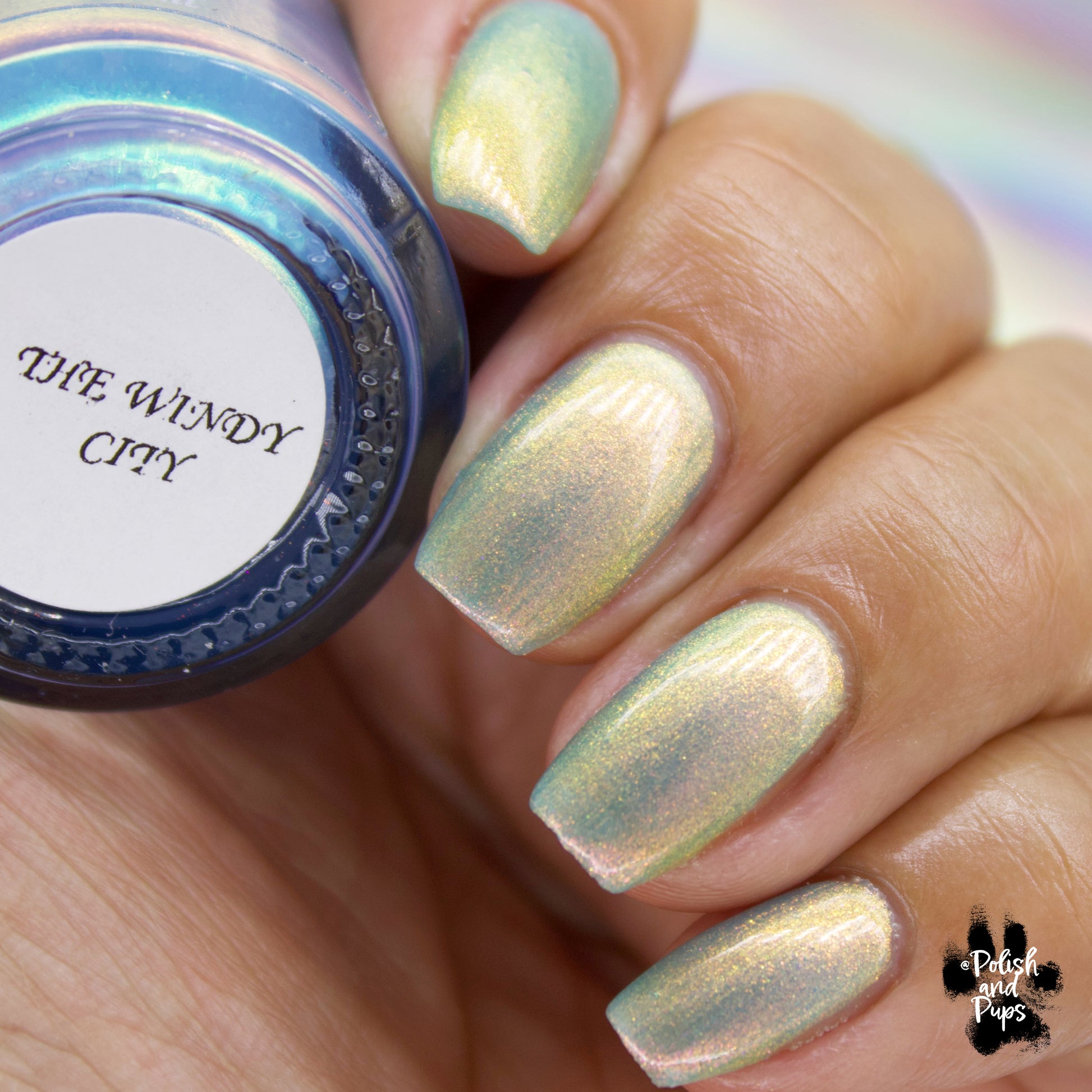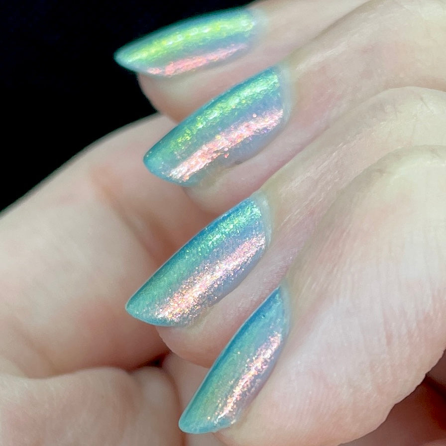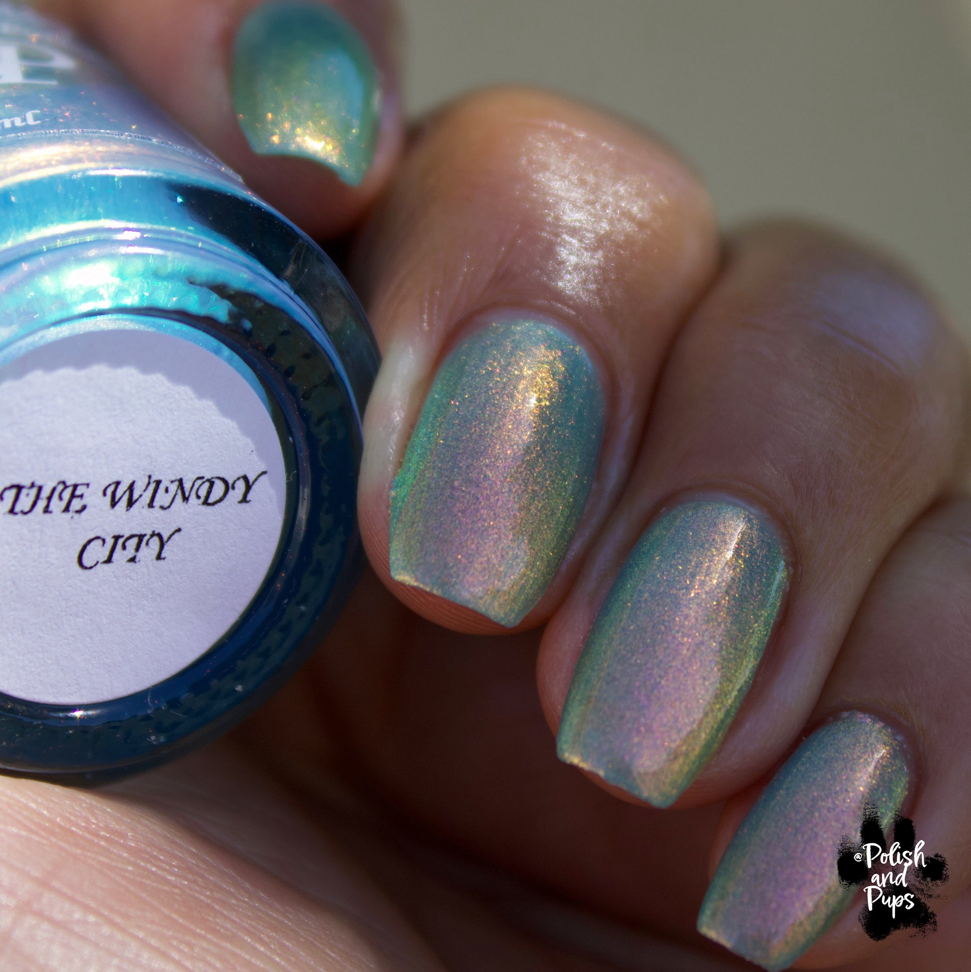 The Windy City is a light blue with pink to orange to yellow to green shimmer