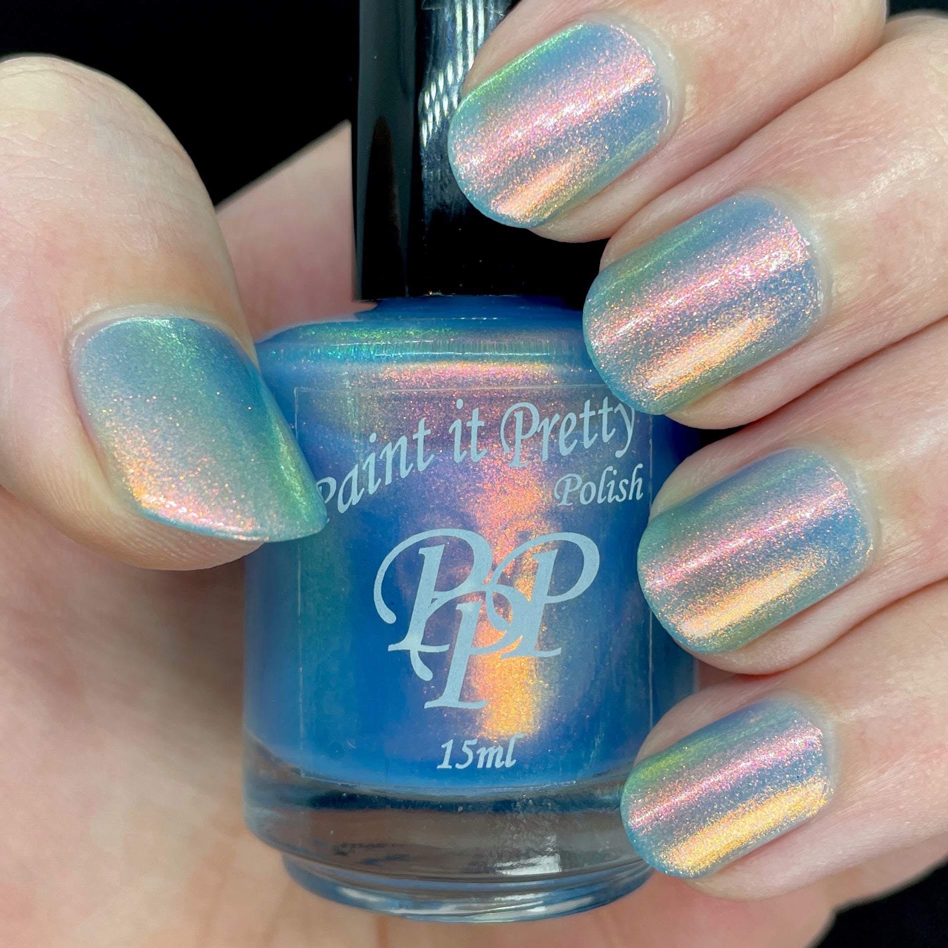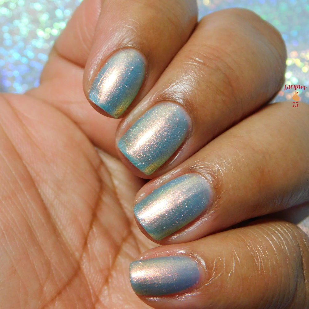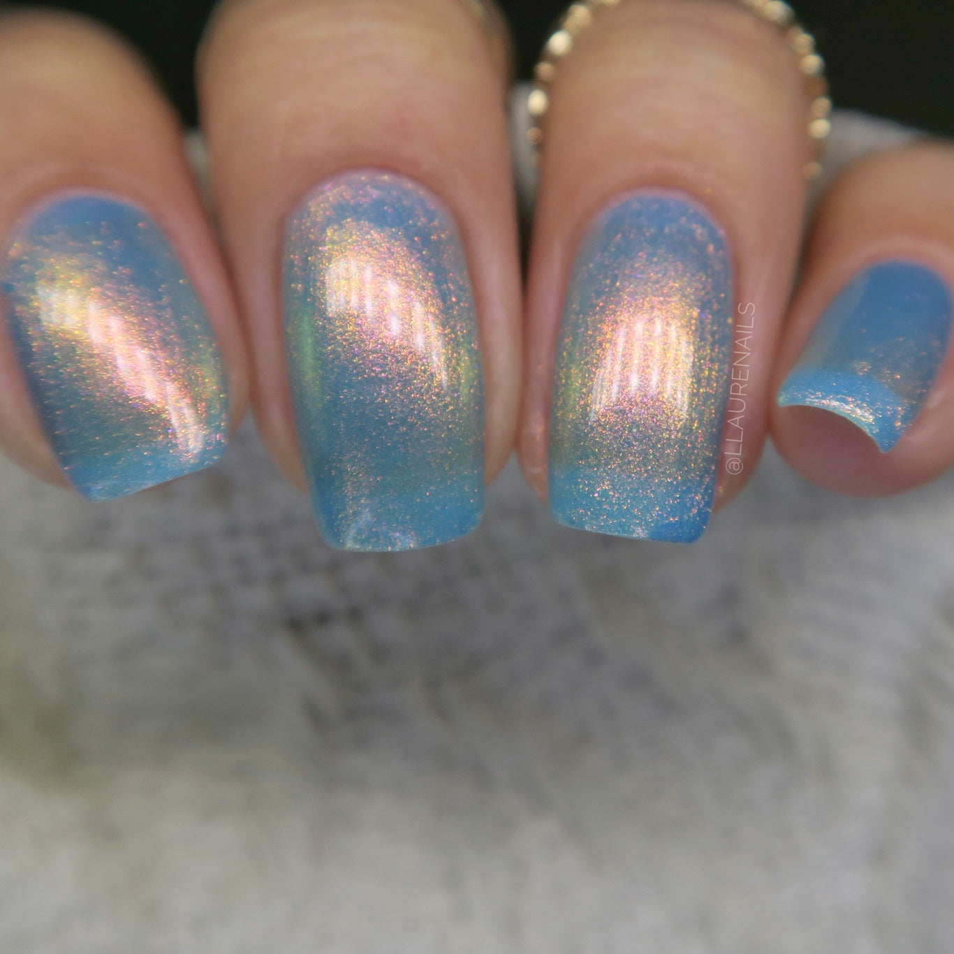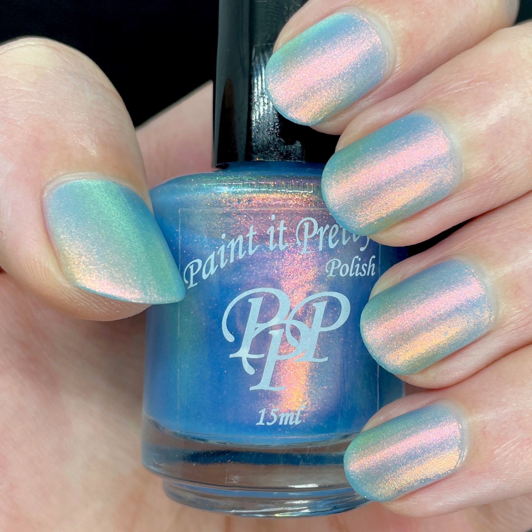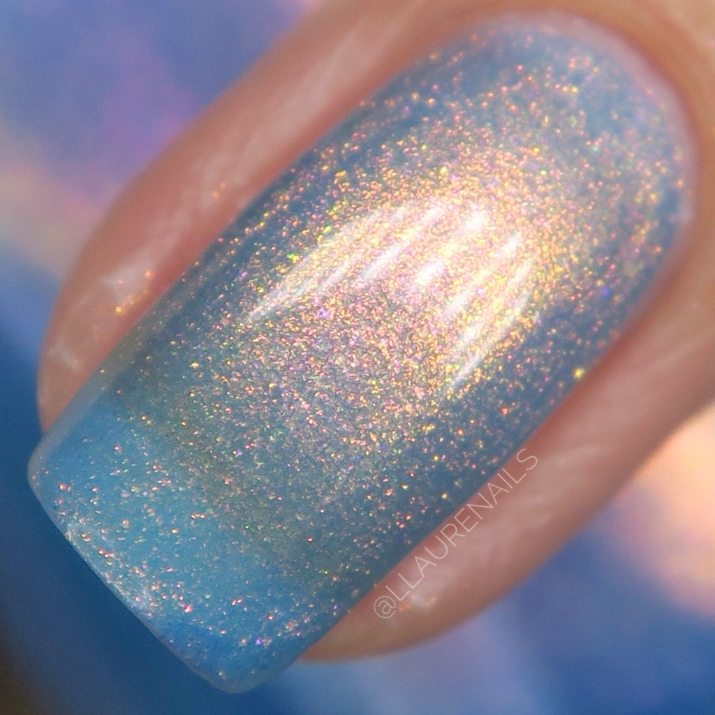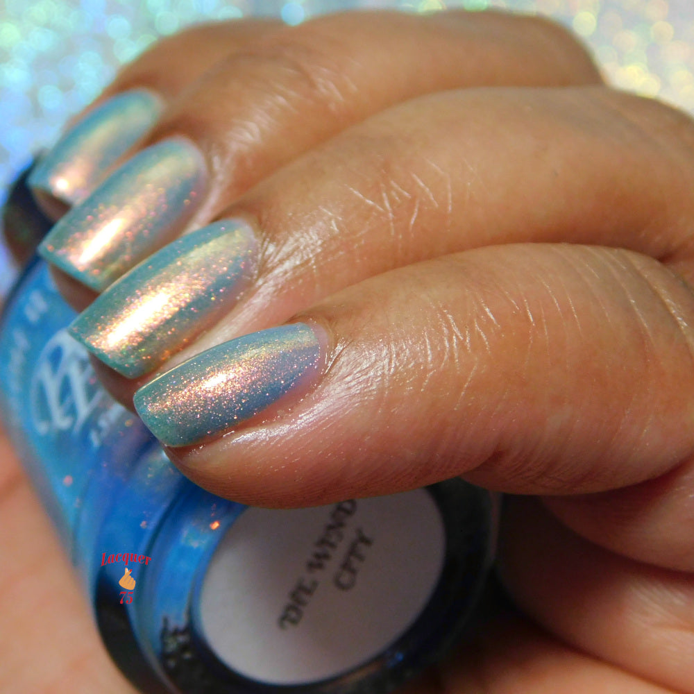 The Windy City is a light blue with pink to orange to yellow to green shimmer