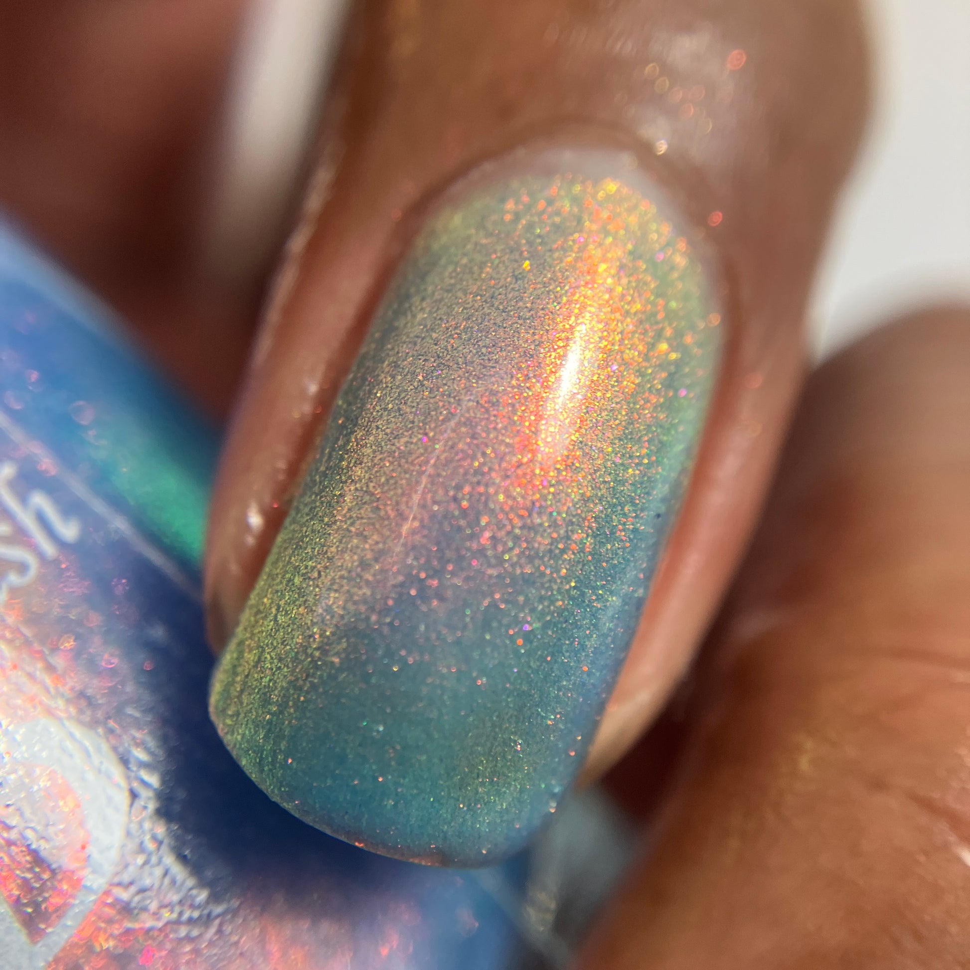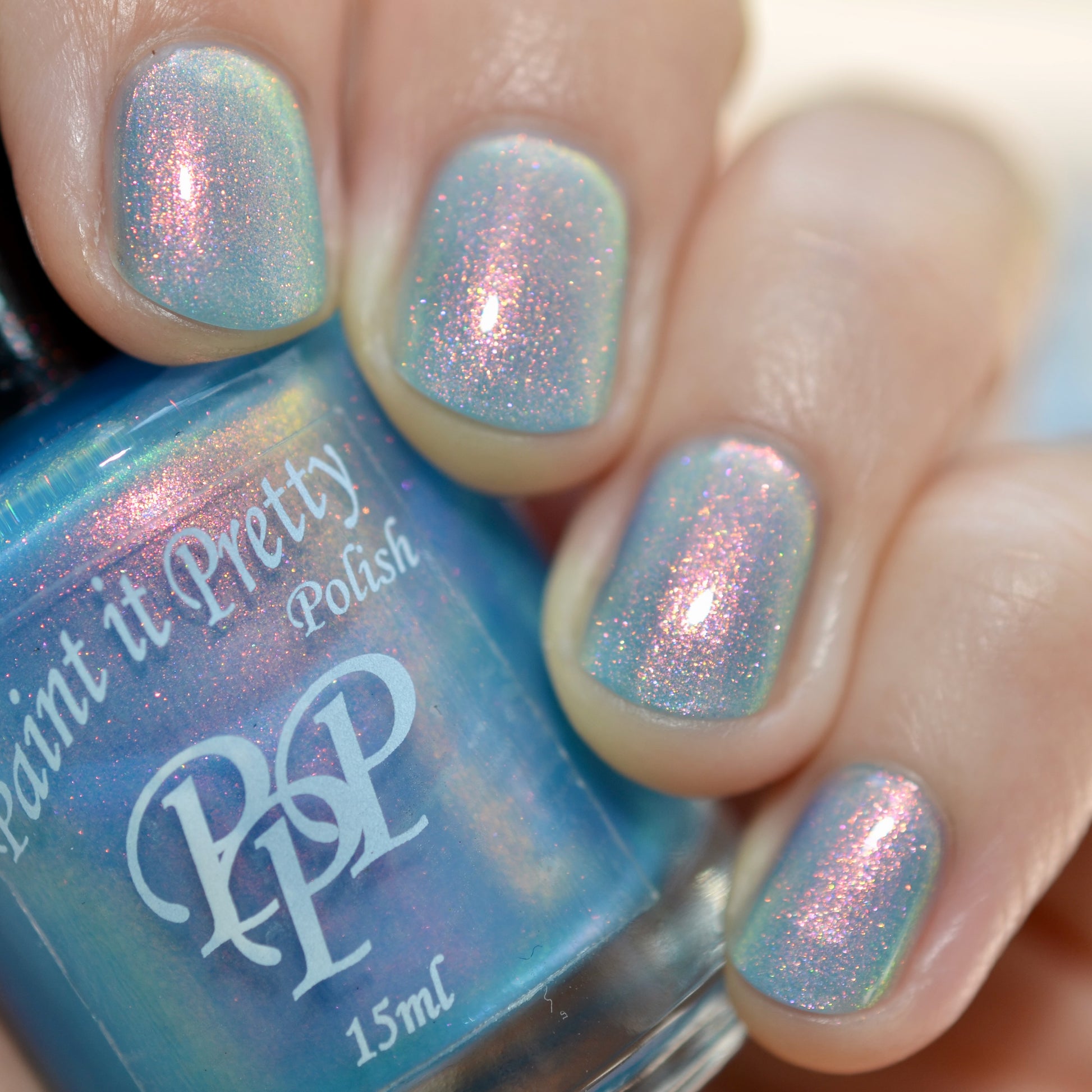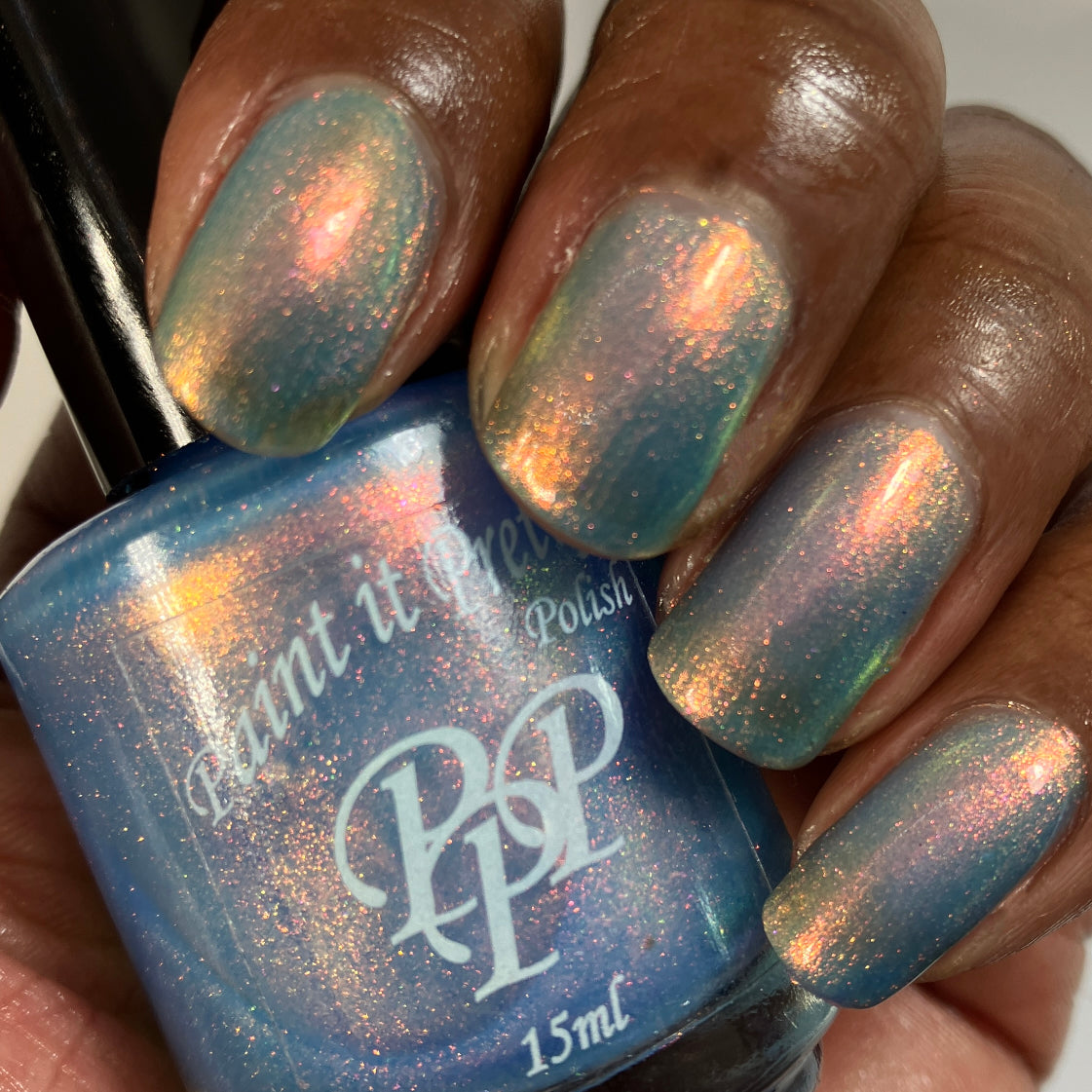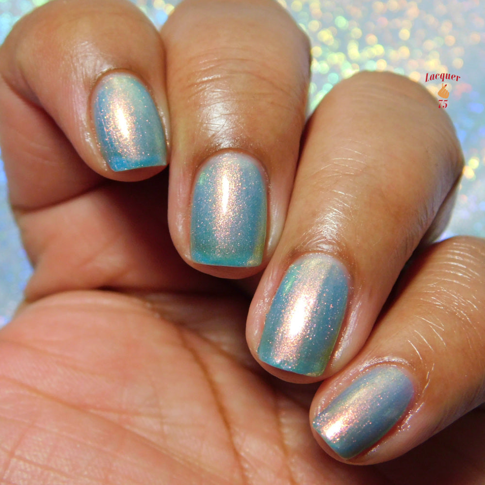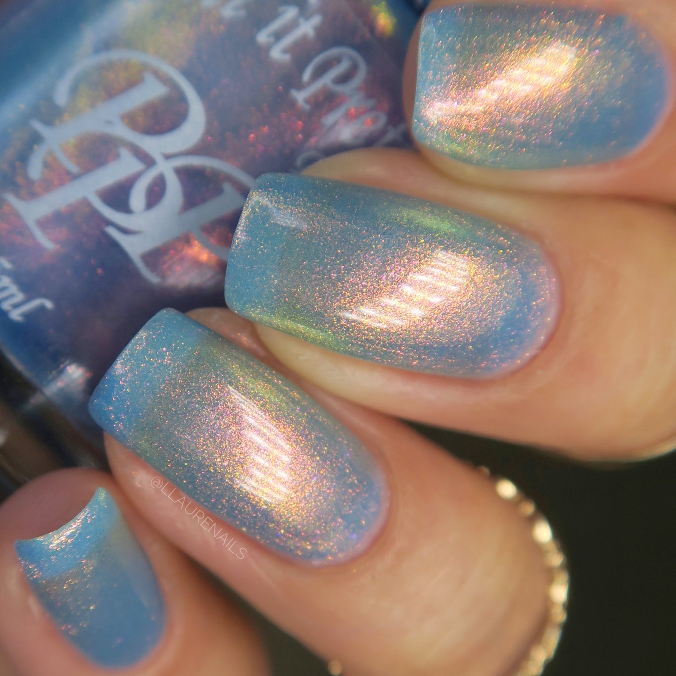 The Windy City is a light blue with pink to orange to yellow to green shimmer