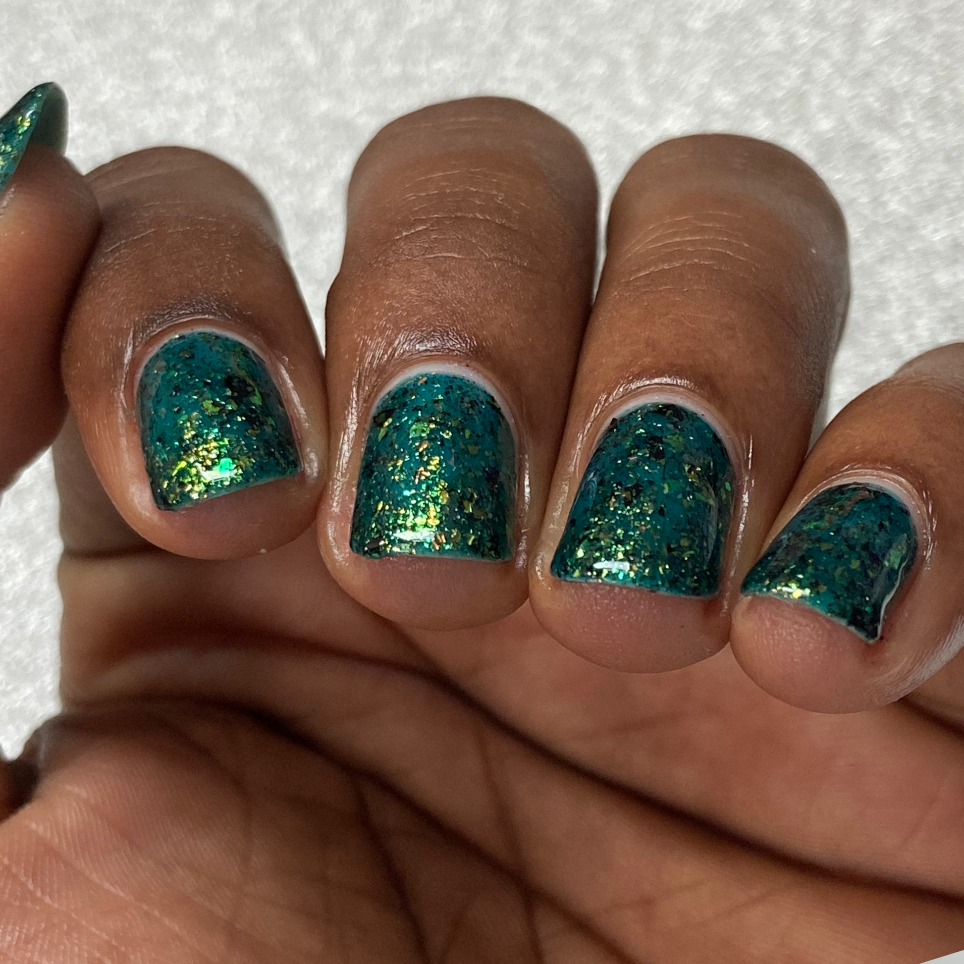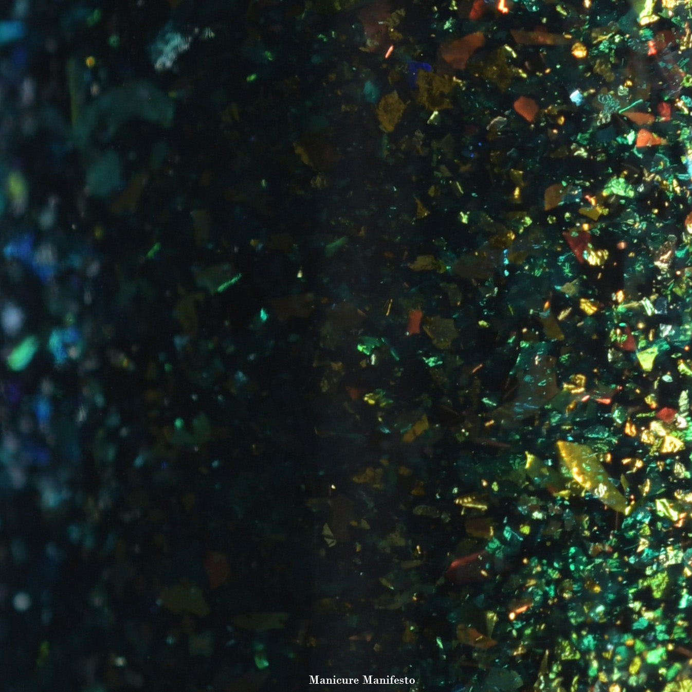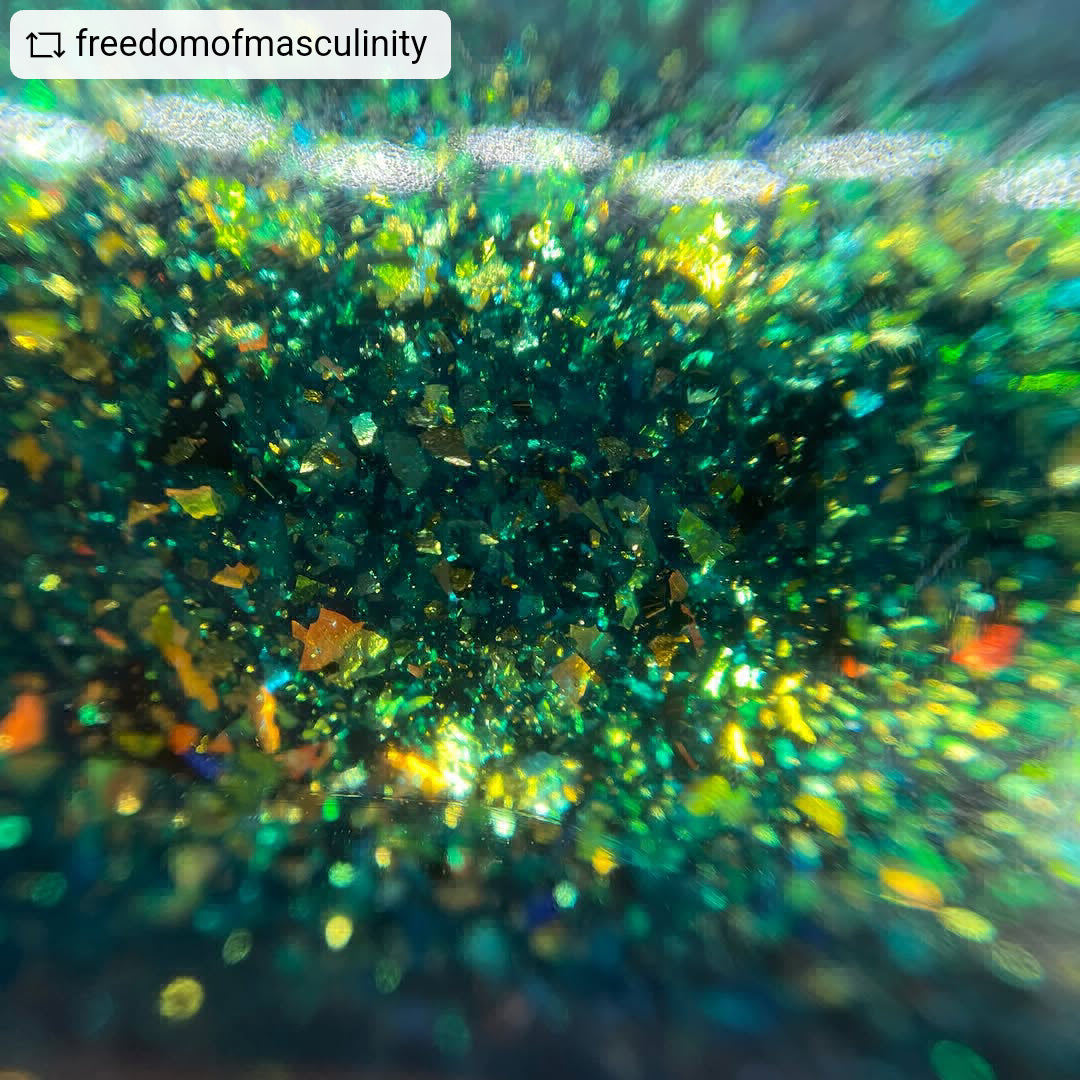 Twinkle and Glow is a green base with yellow, orange, green irridescent and gold, green chameleon flakes with a touch of black flakes.