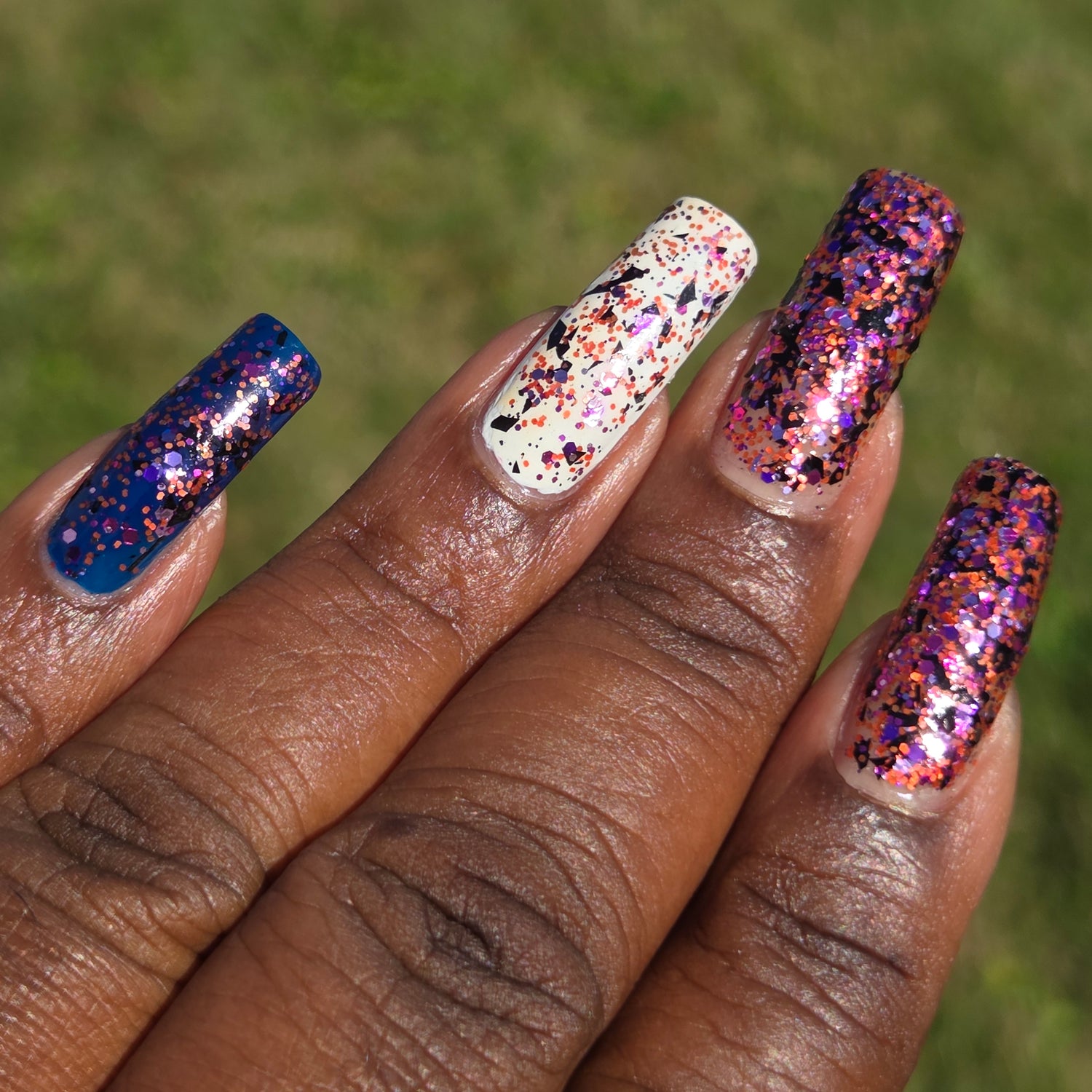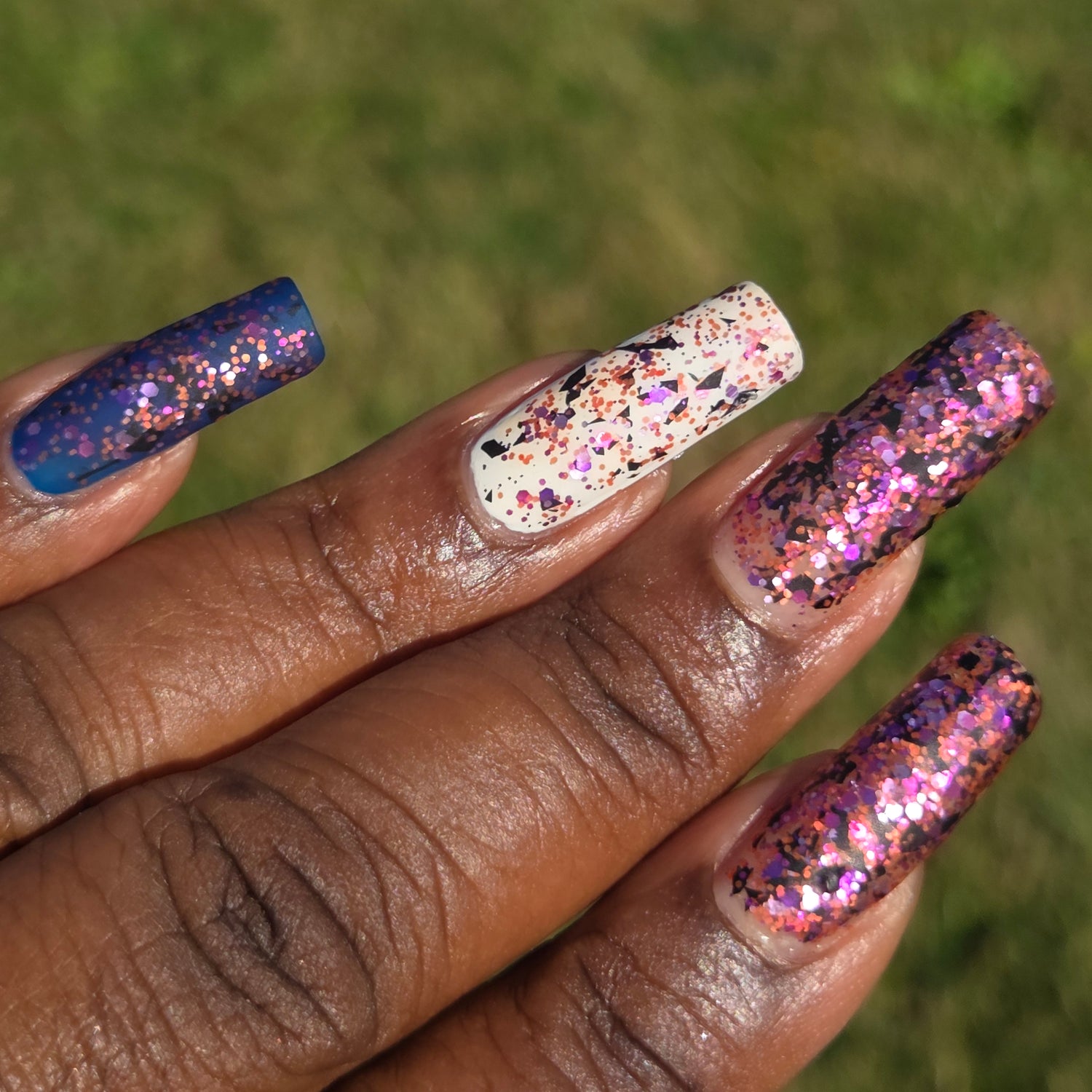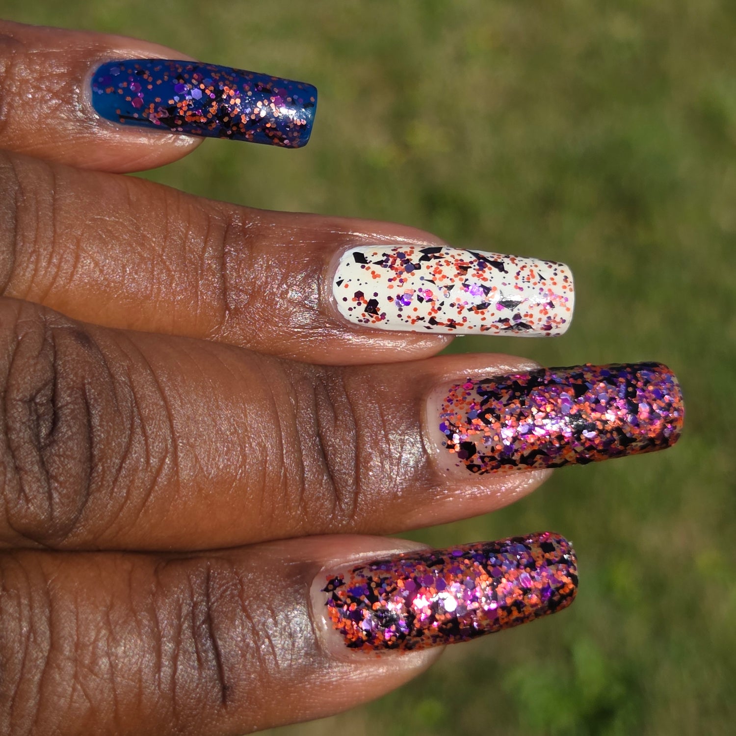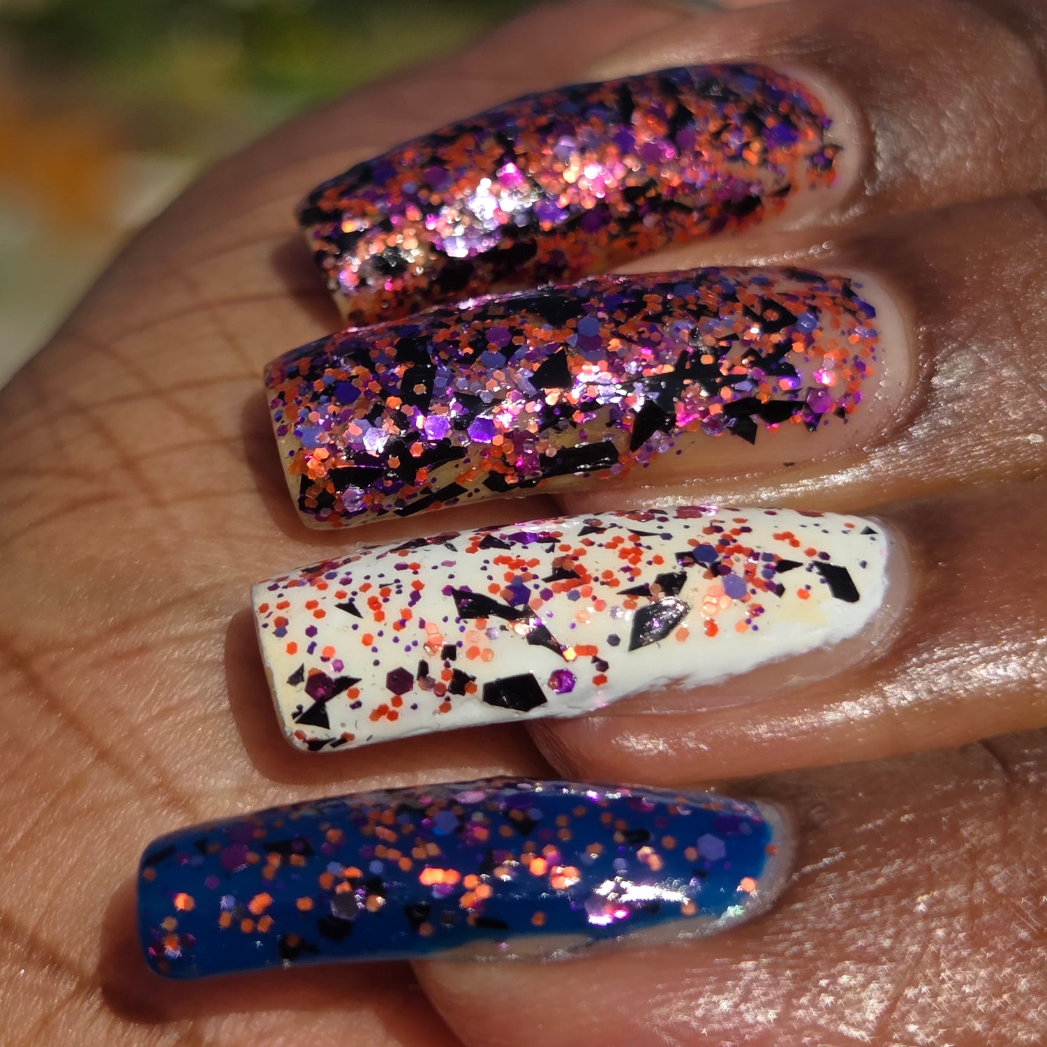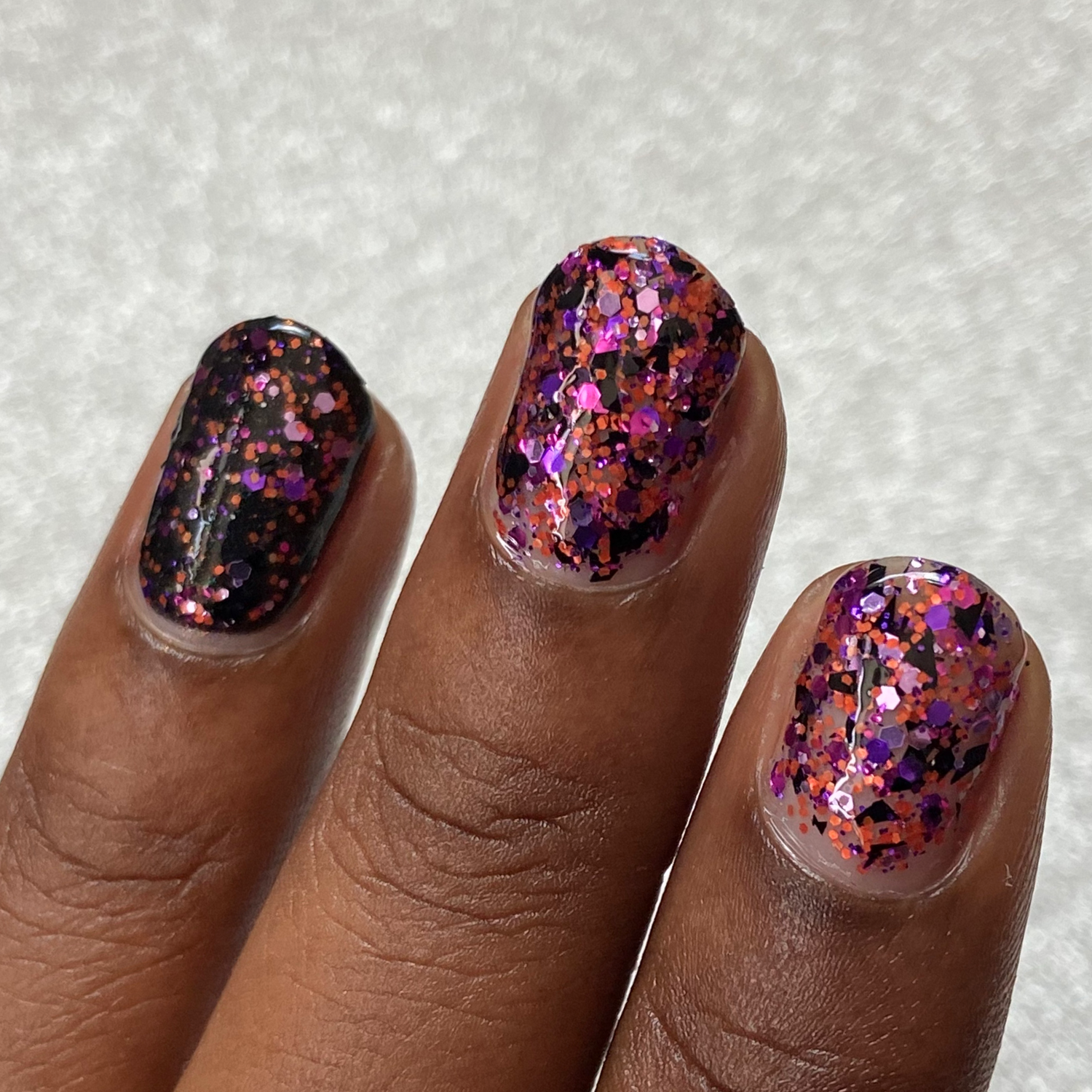 Witches Brew is a clear base with black flakes, orange, purple, and pink glitters. Use this one as a topper or on its own with an extra coat.