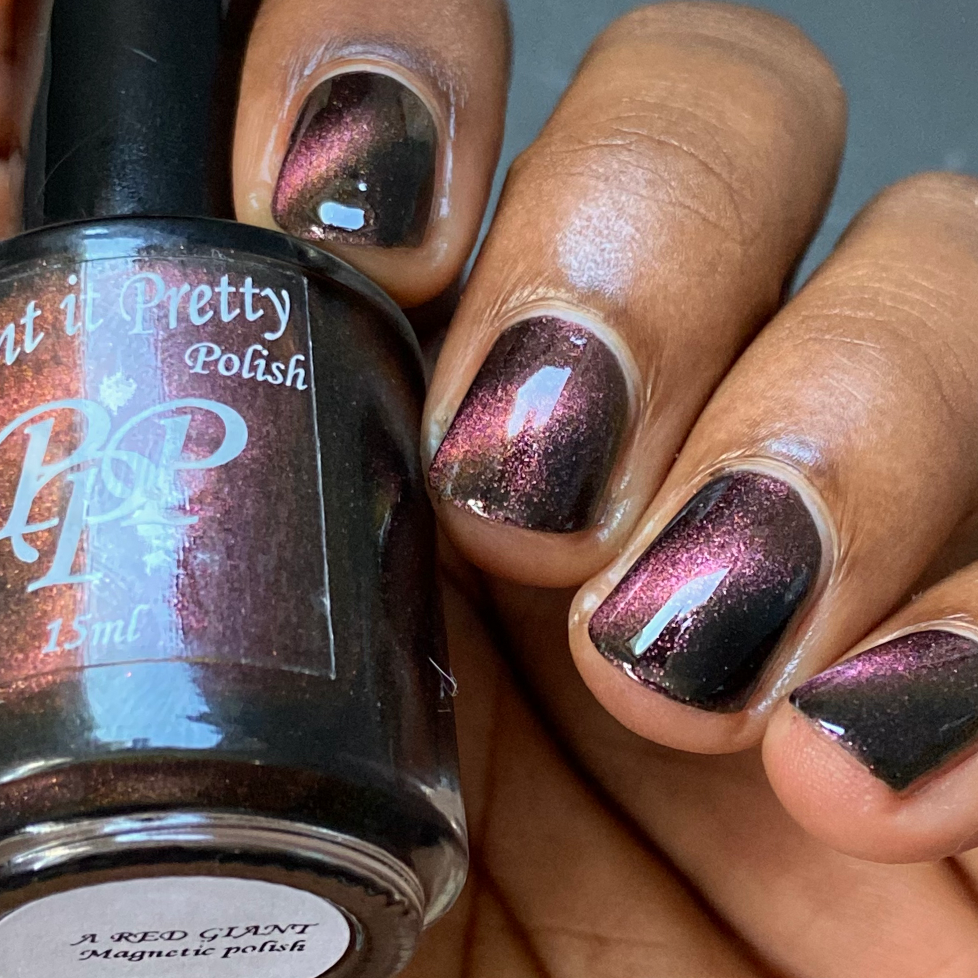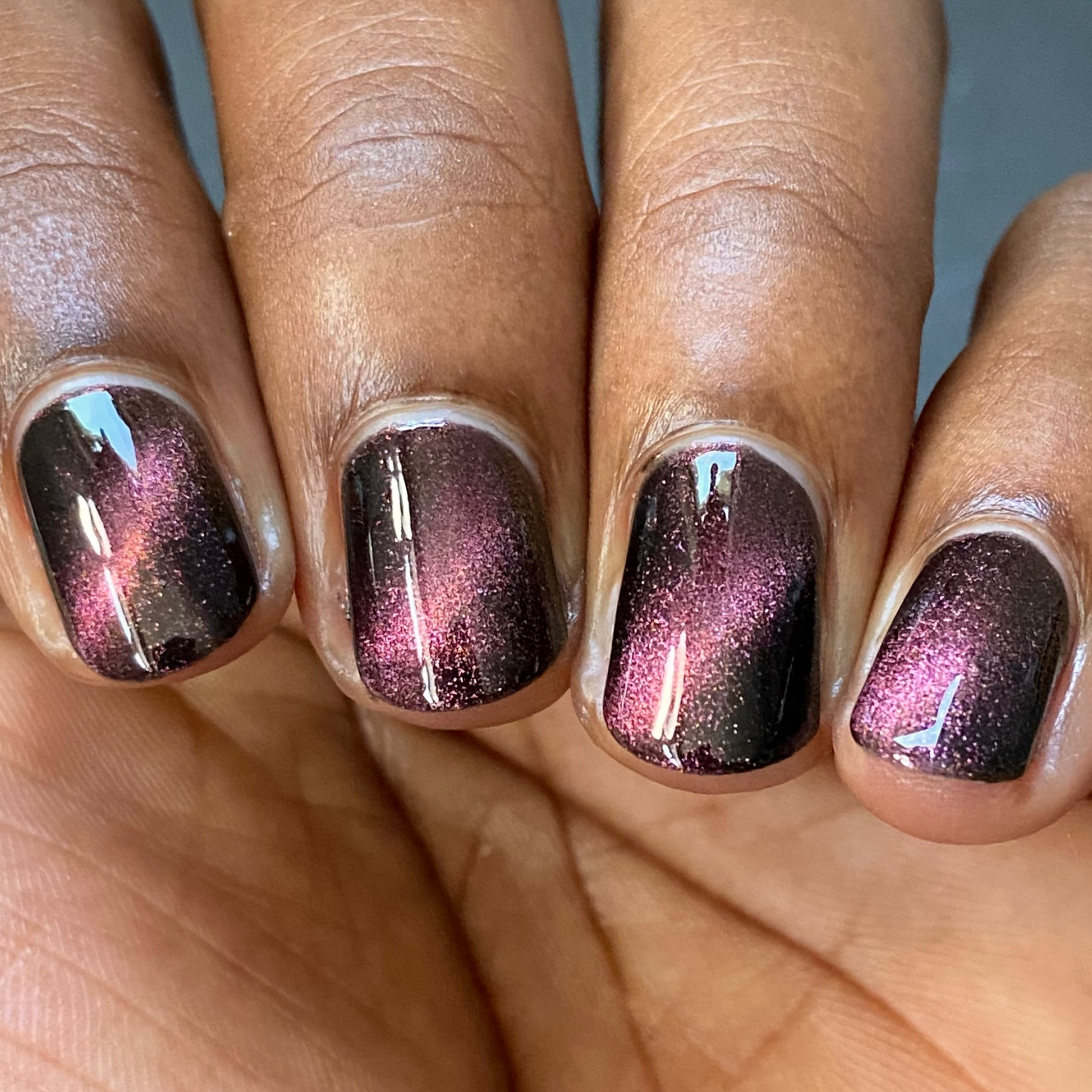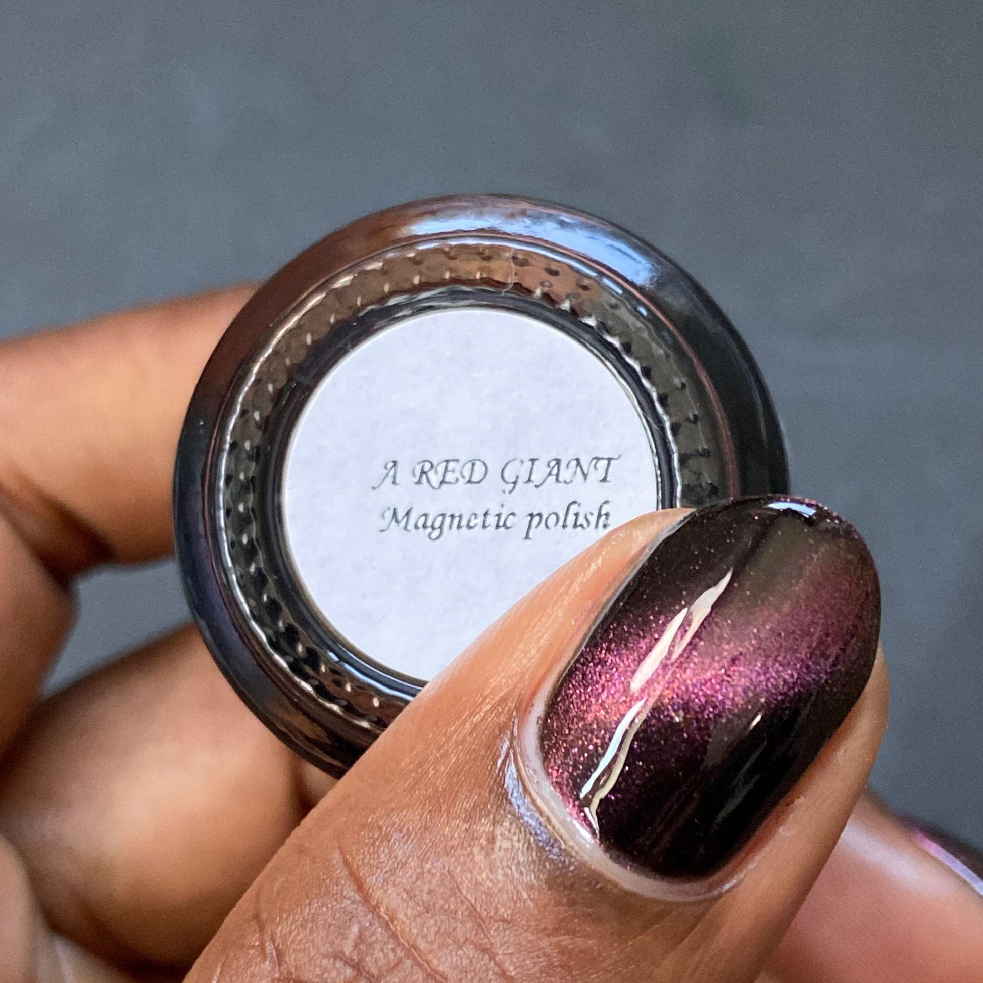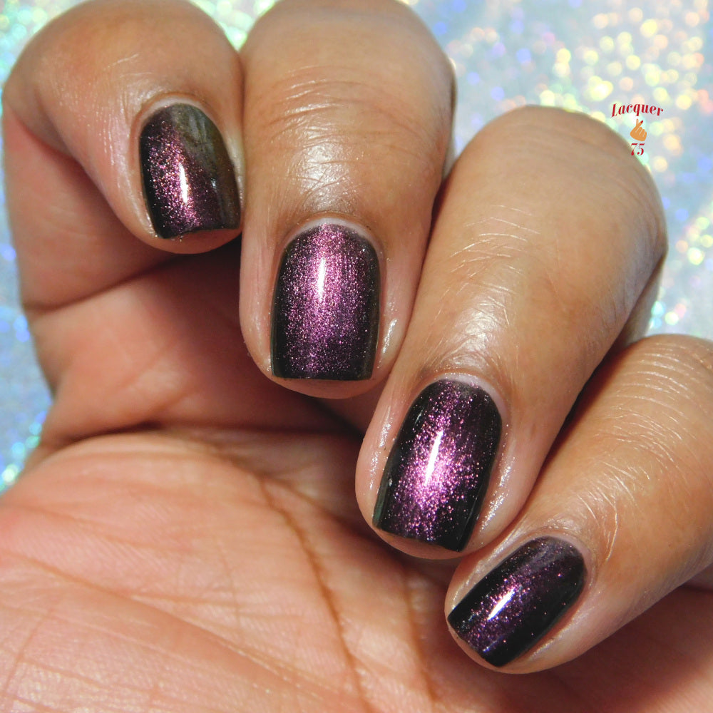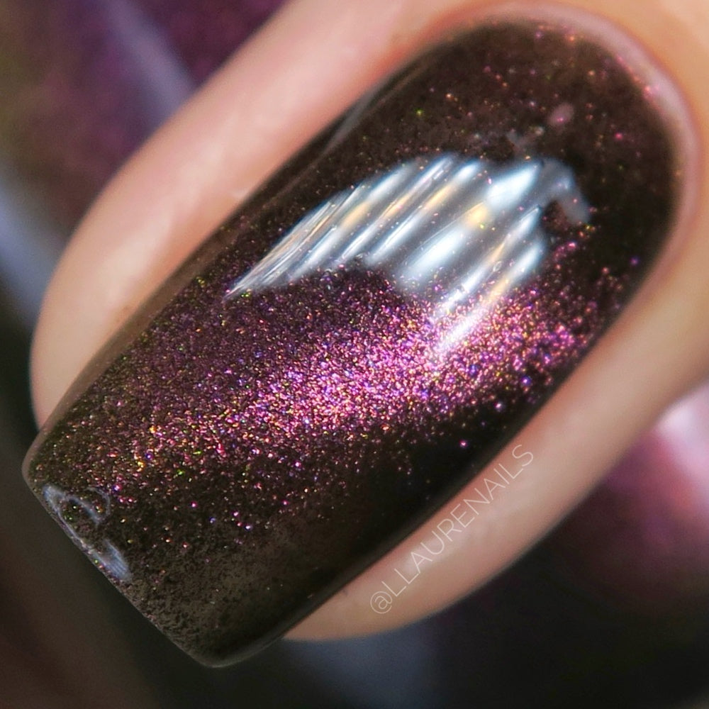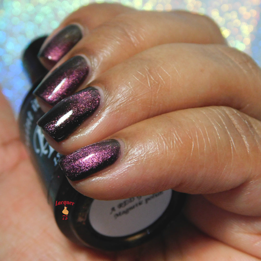 A Red Giant is a purple to gold to green magnetic polish in a black base.