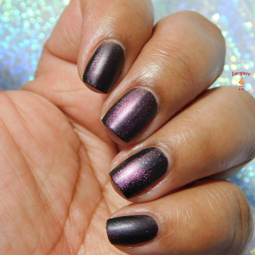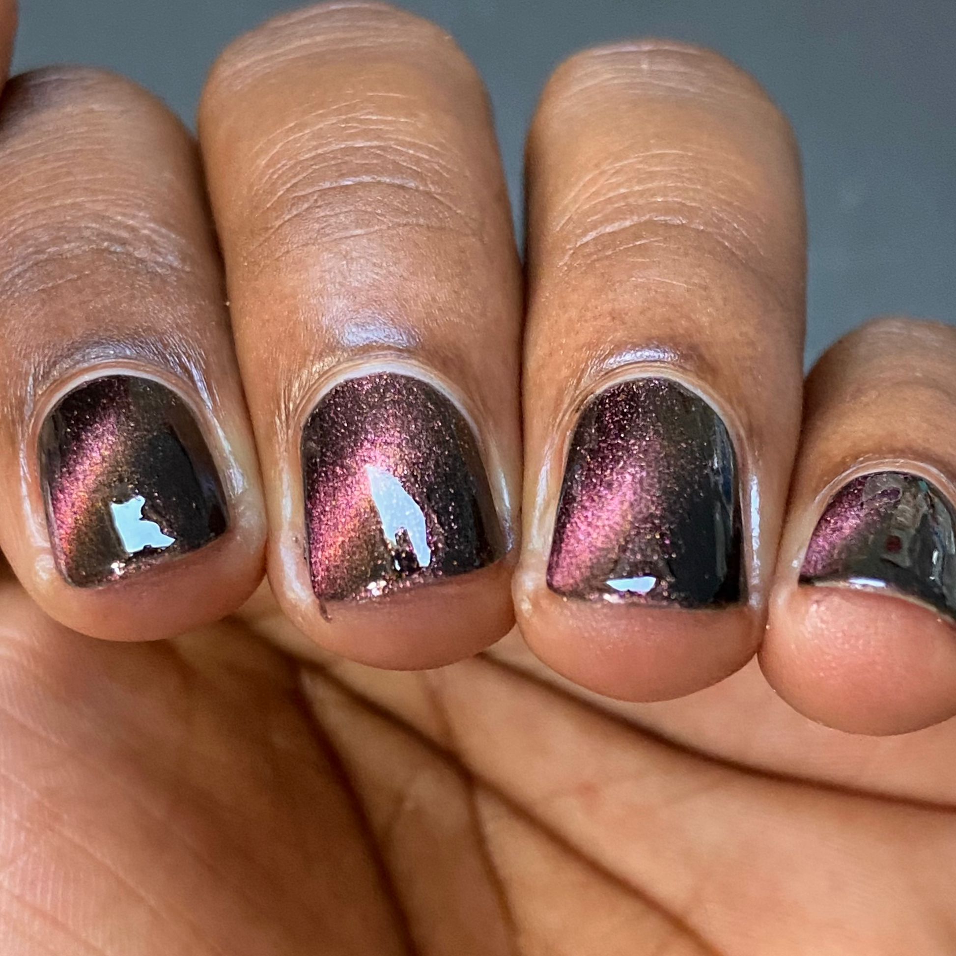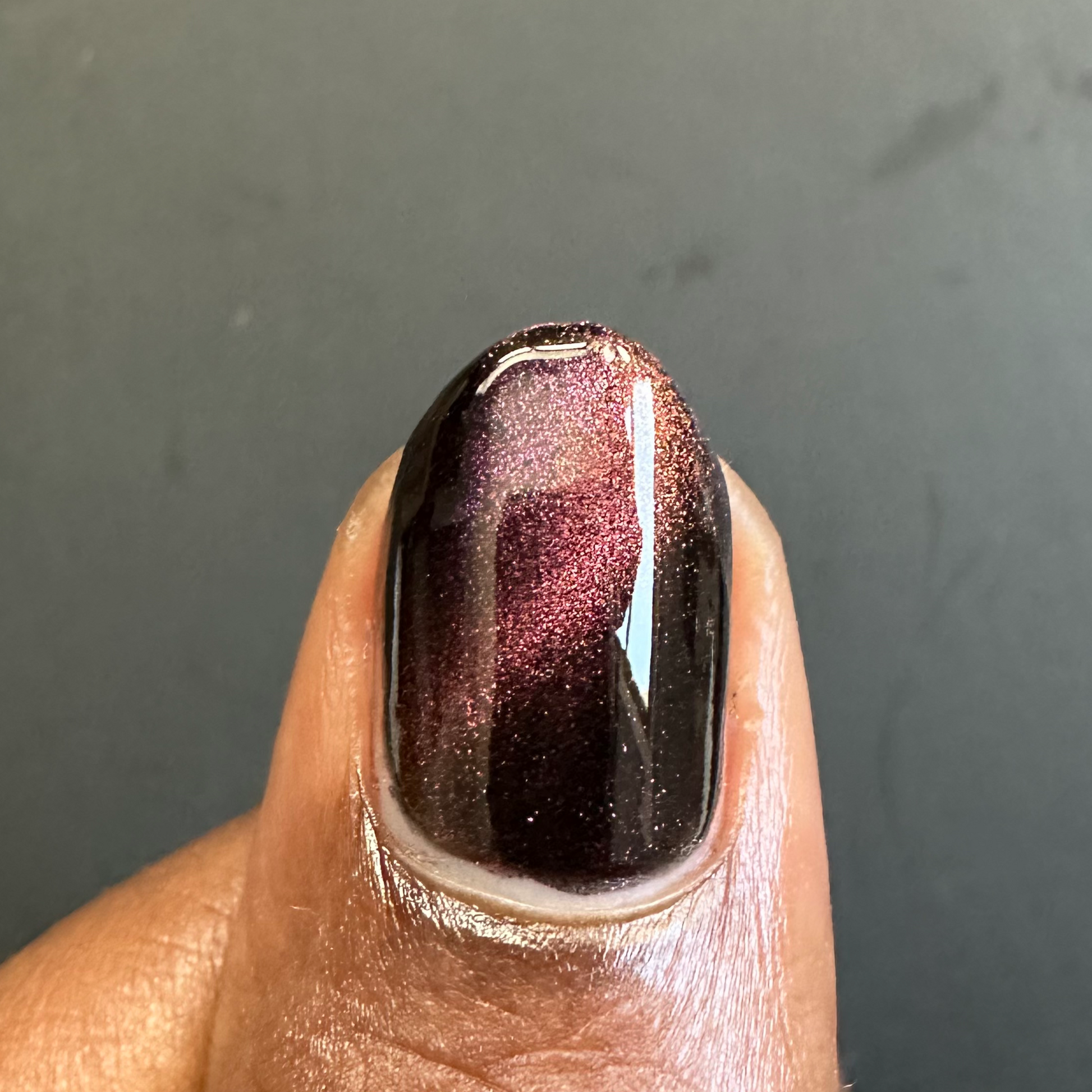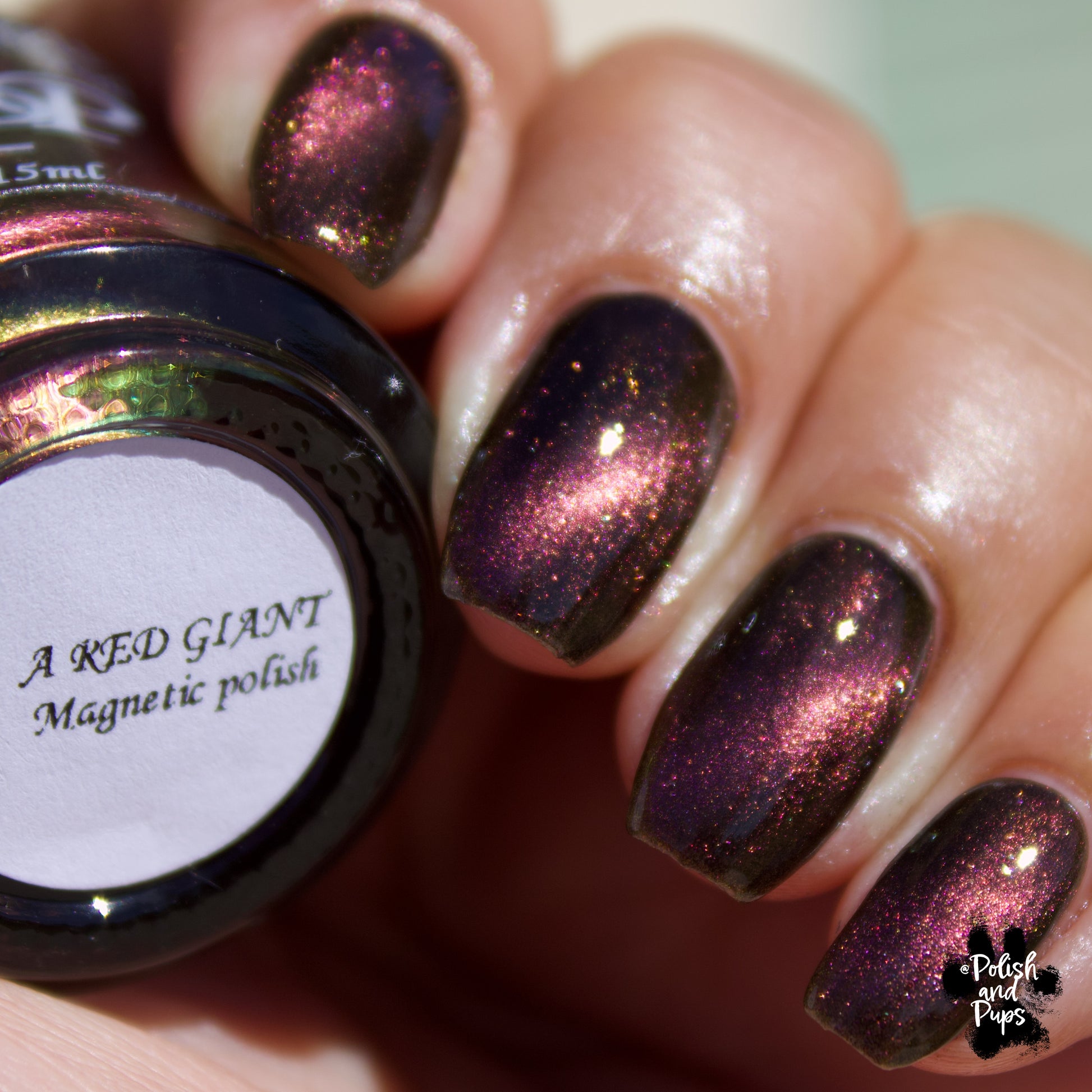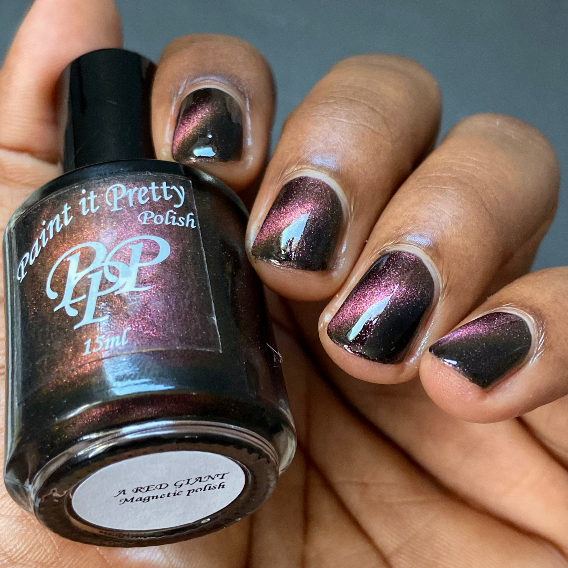 A Red Giant is a purple to gold to green magnetic polish in a black base.