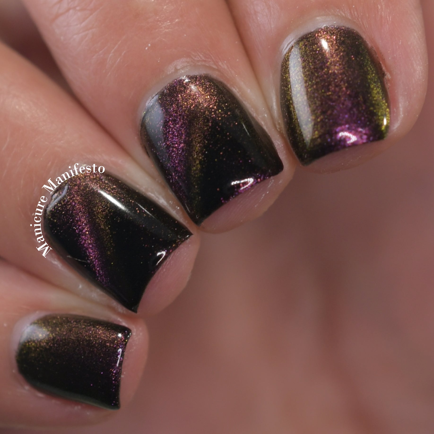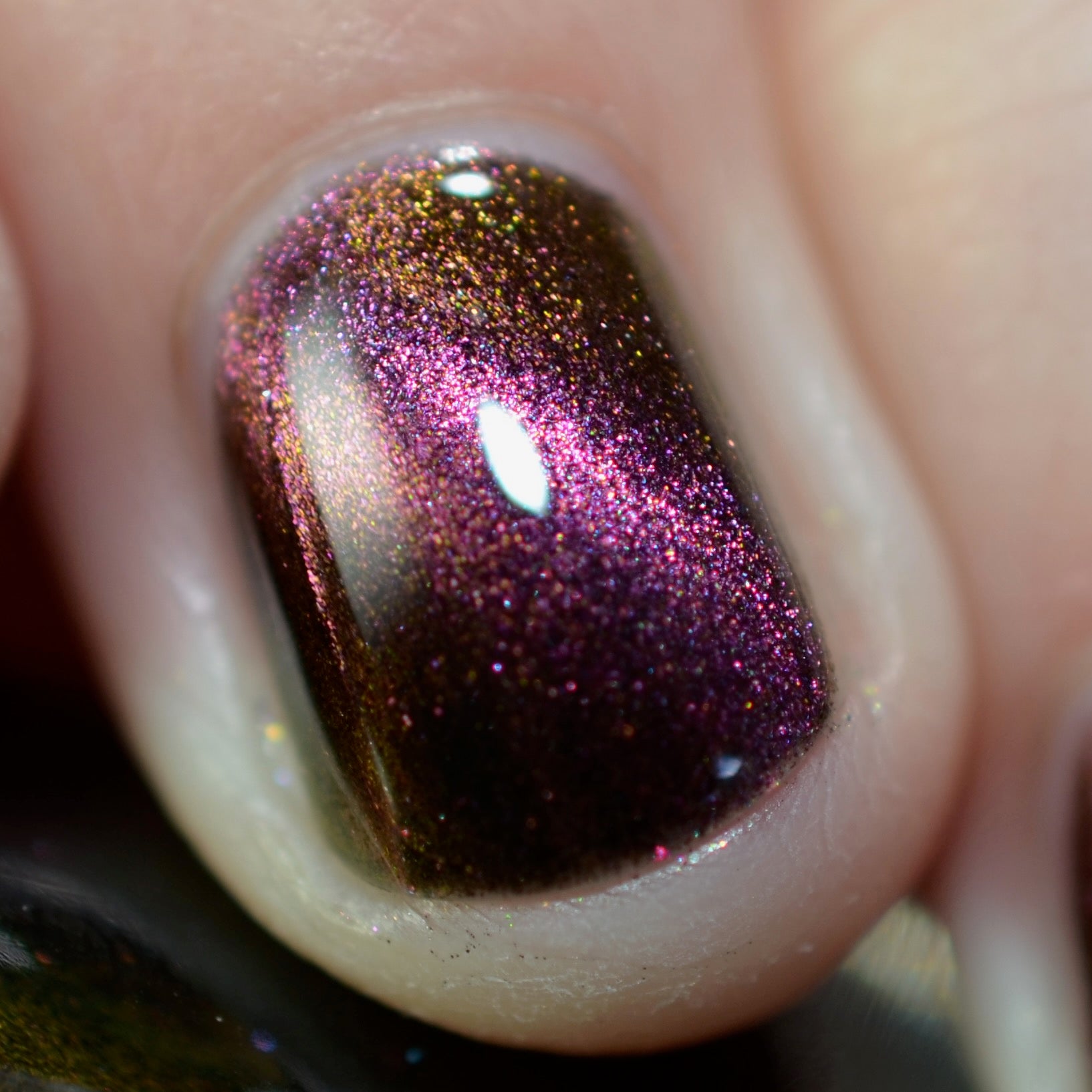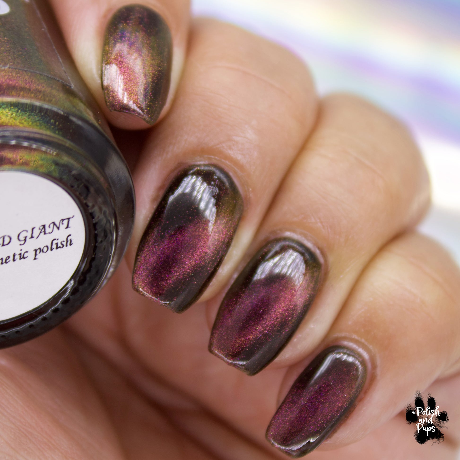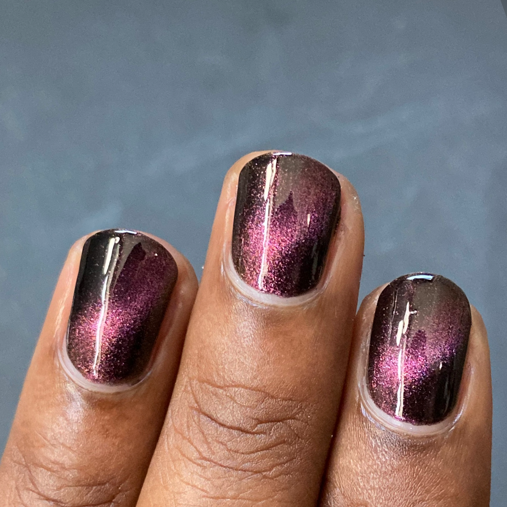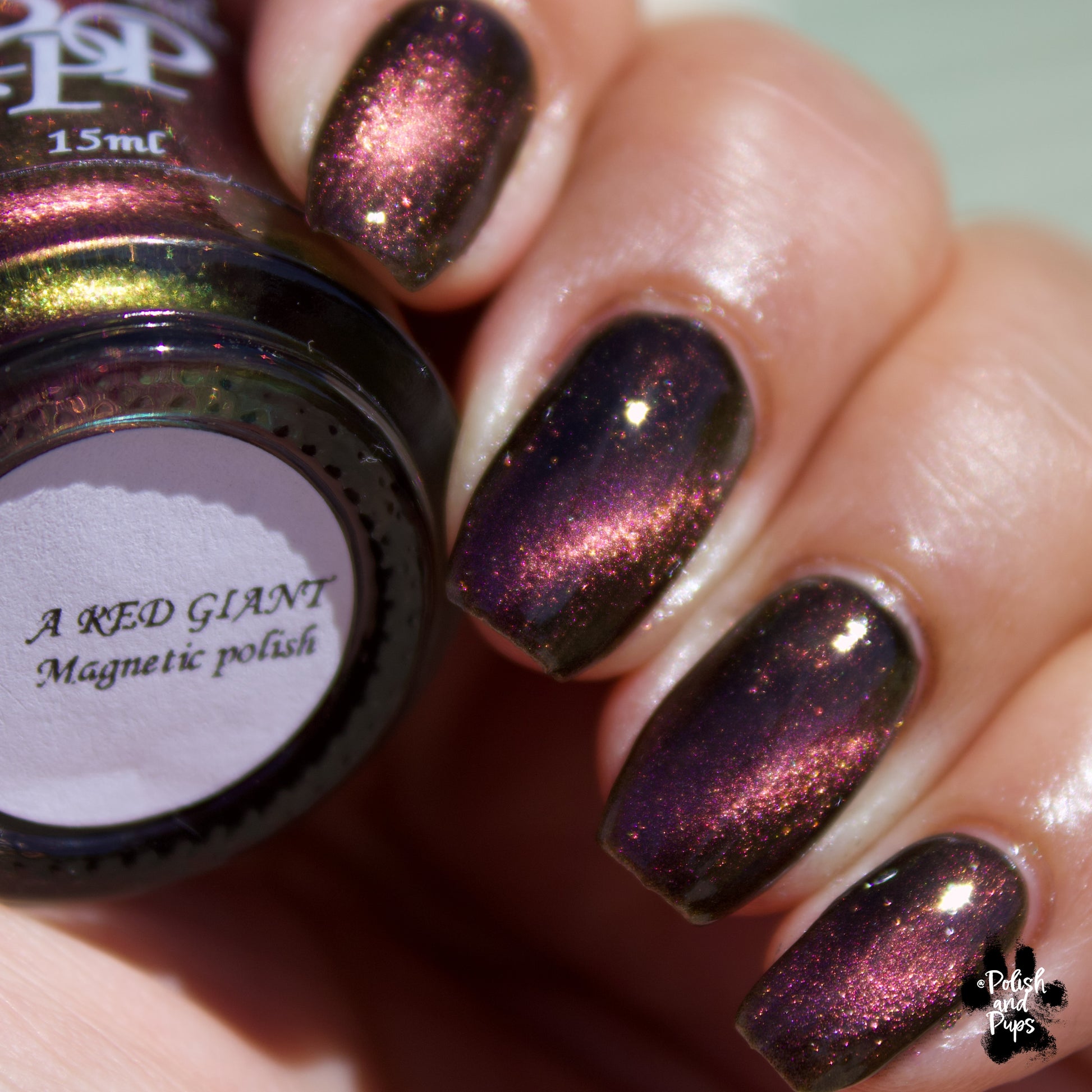 A Red Giant is a purple to gold to green magnetic polish in a black base.