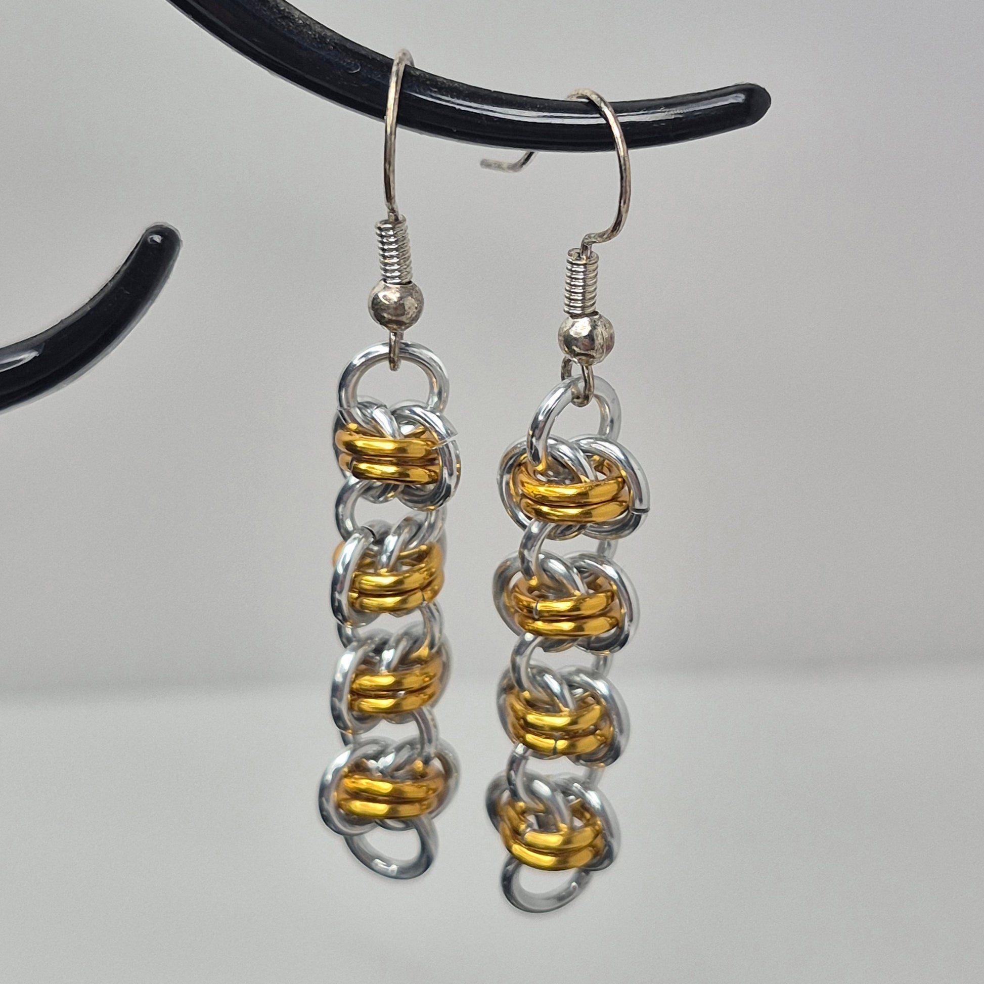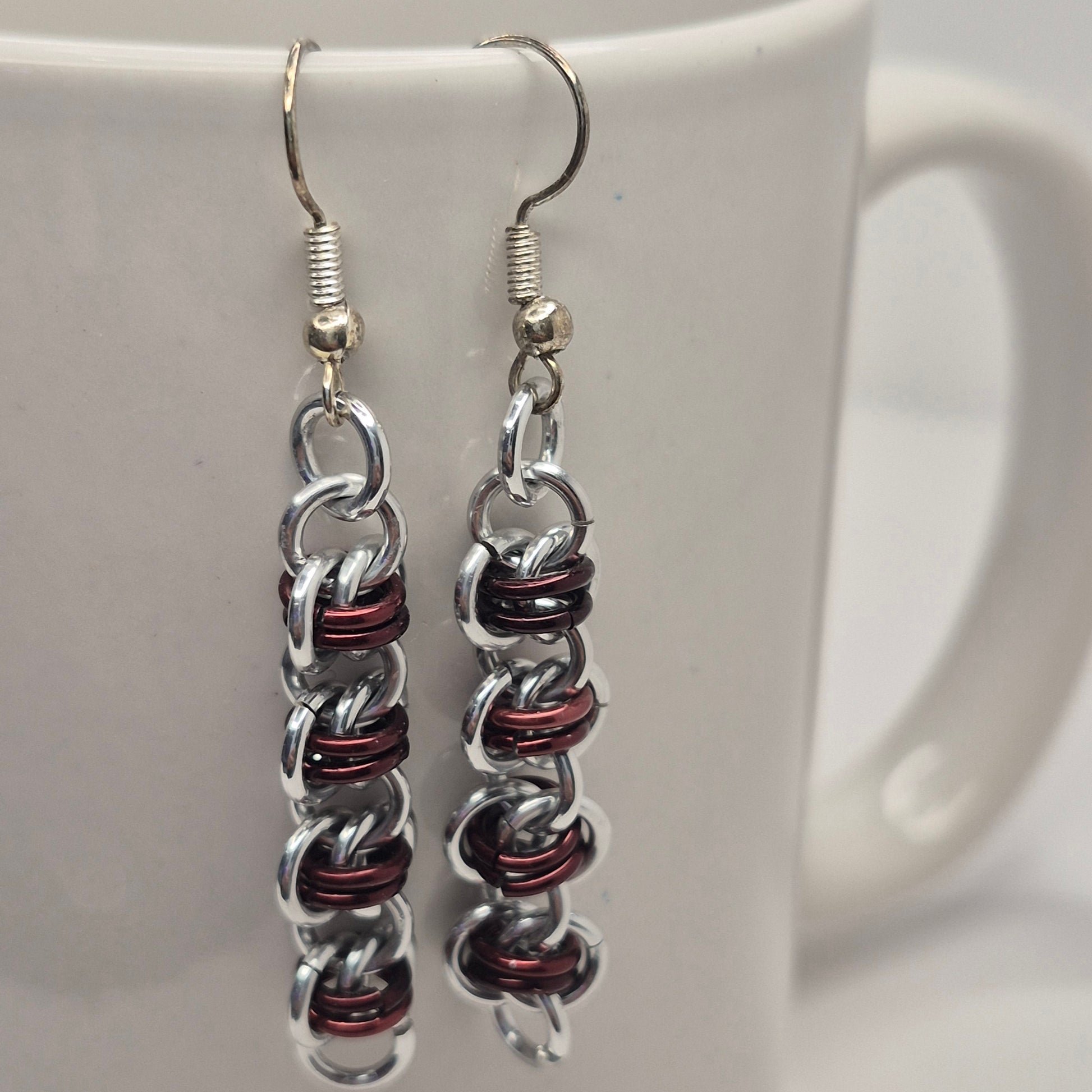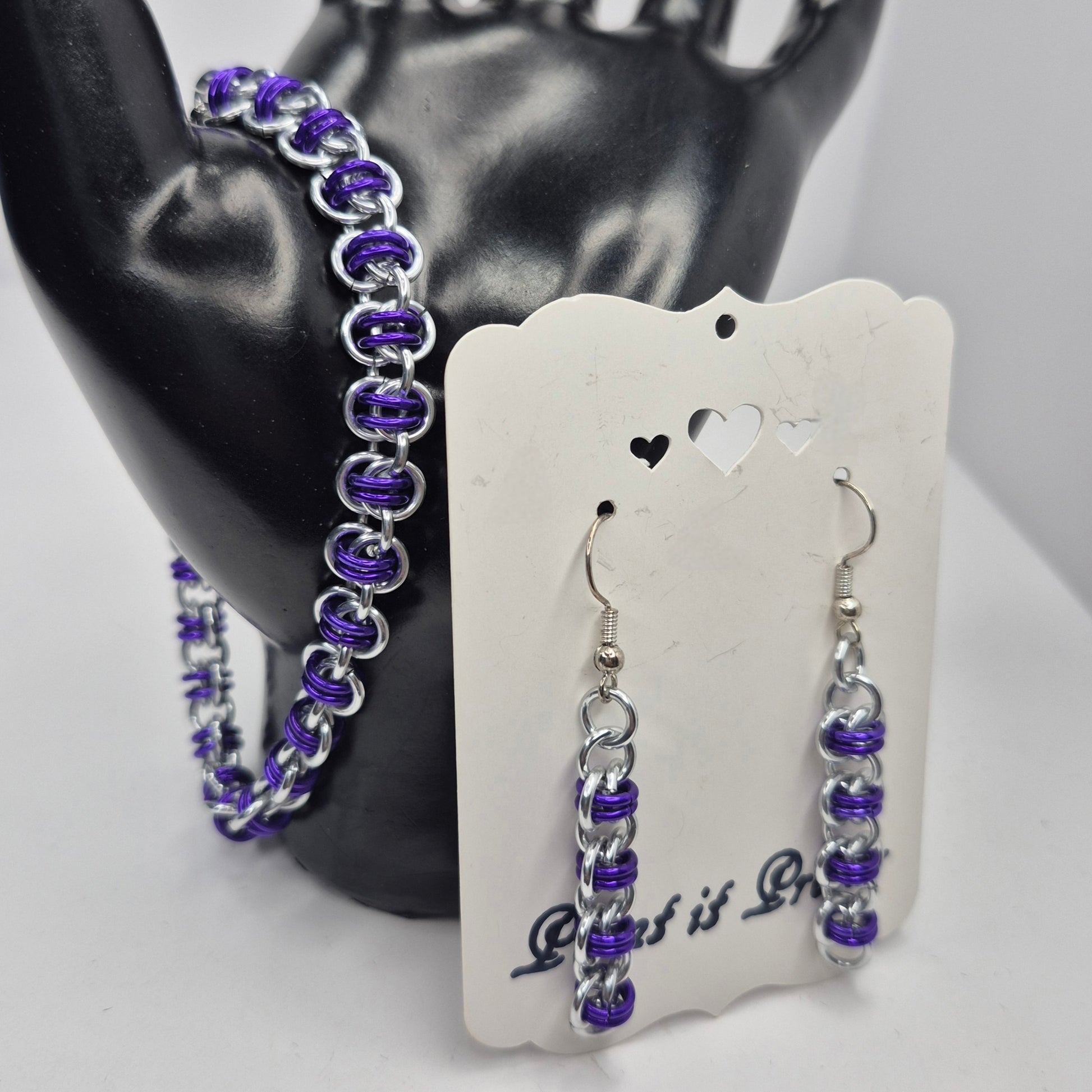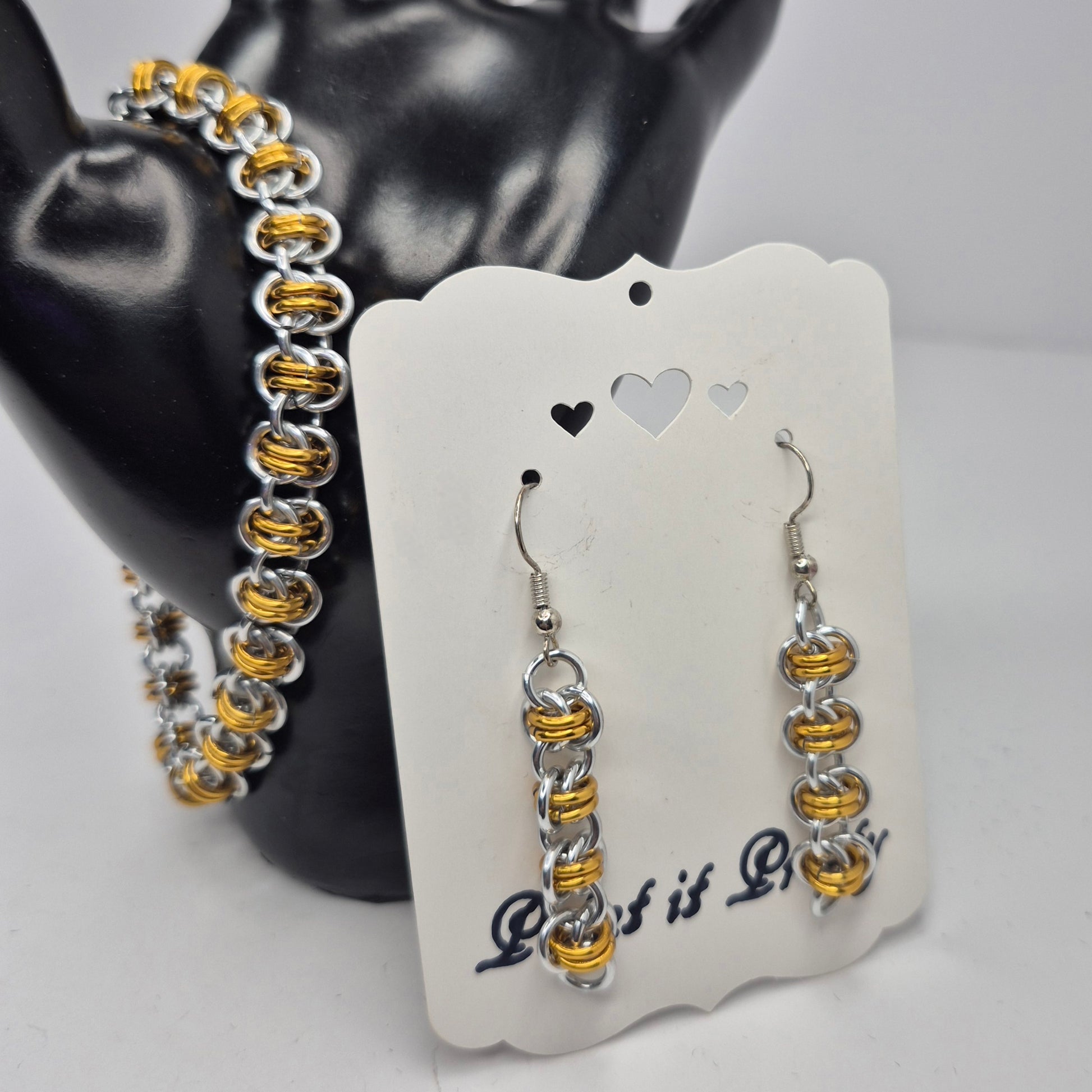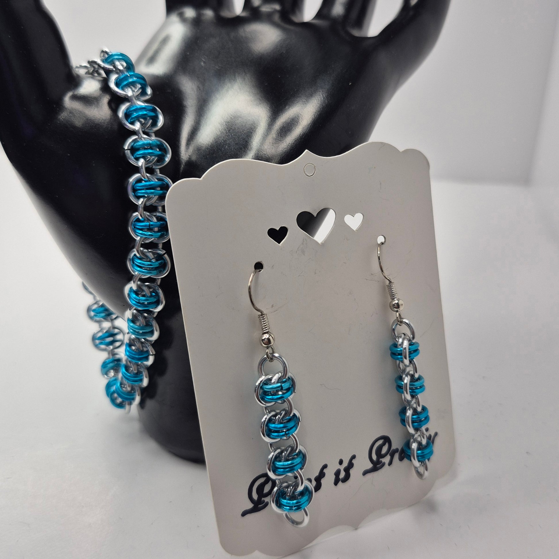 Handmade chainmail barrel weave bracelet and earring set. Hand woven one ring at a time, this jewelry is sure to turn heads!