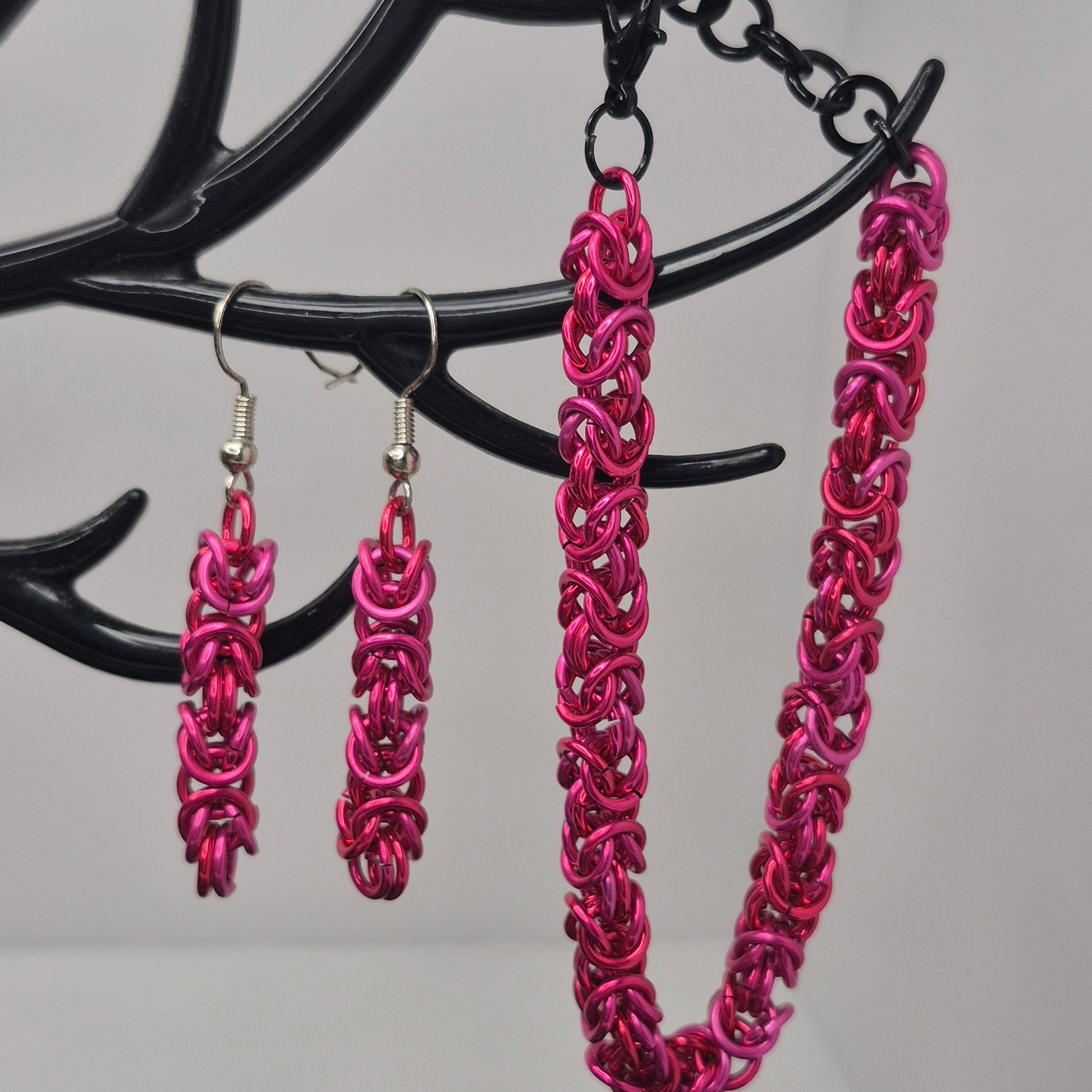 Handmade chainmail byzentine bracelet and earring set. Hand woven one ring at a time, this jewelry is sure to turn heads!
