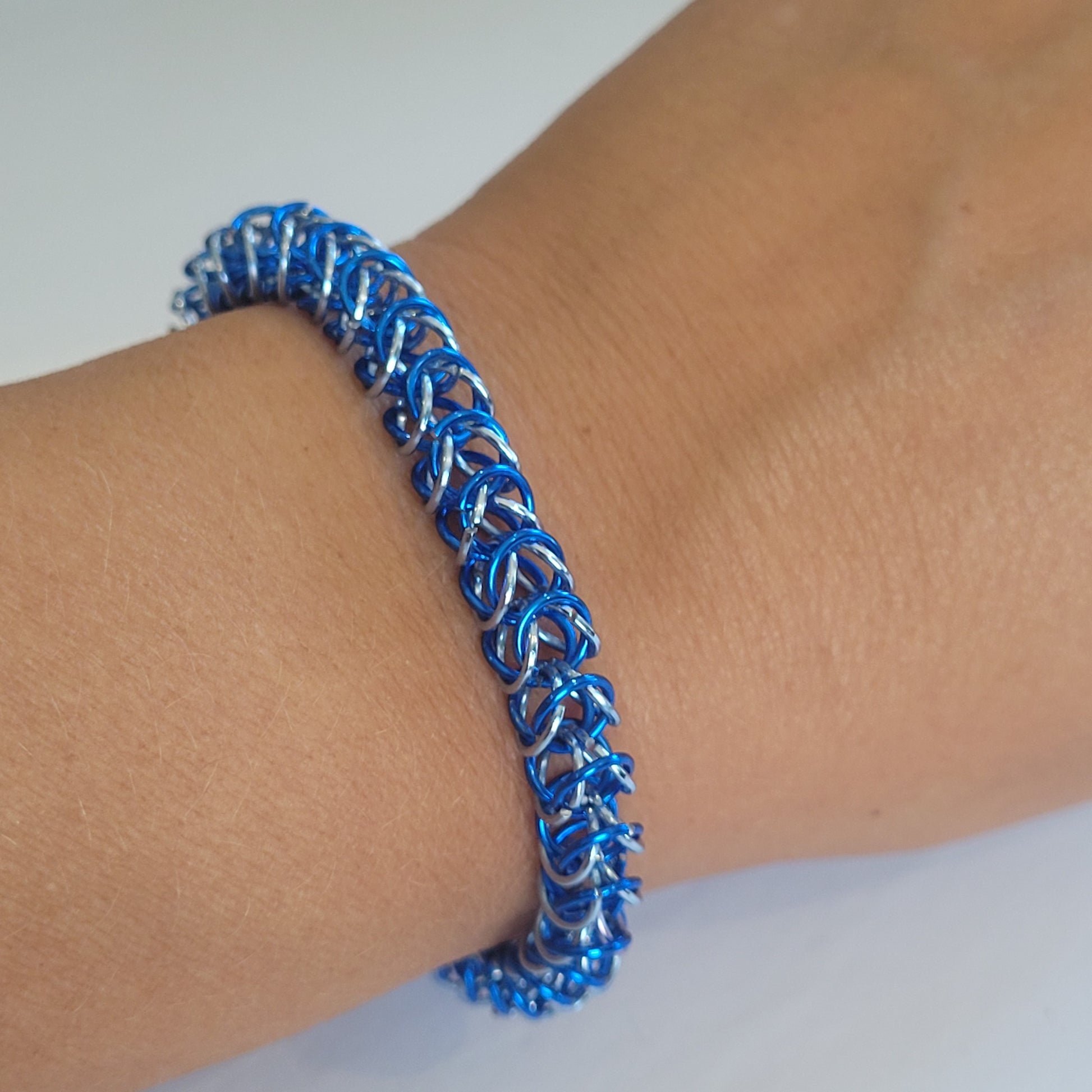 Handmade chainmail blue and ice blue bracelet. Hand woven one ring at a time, this jewelry is sure to turn heads!