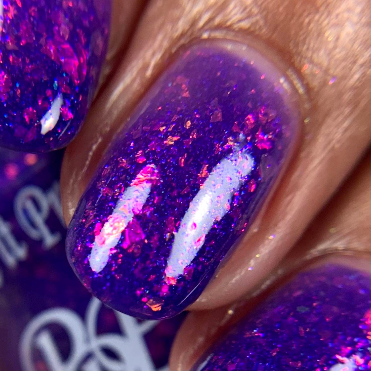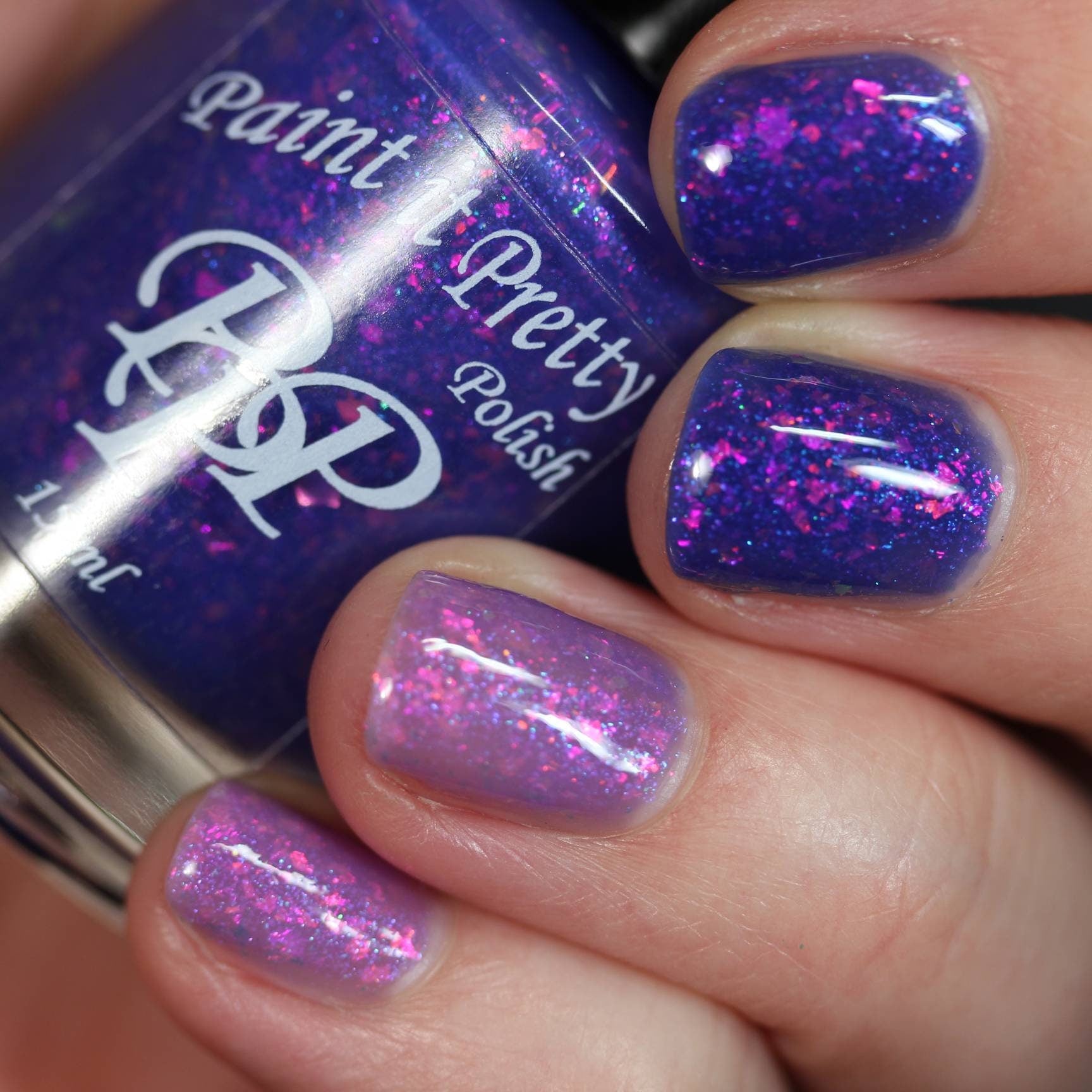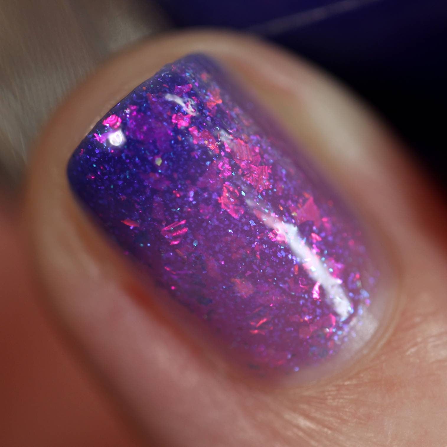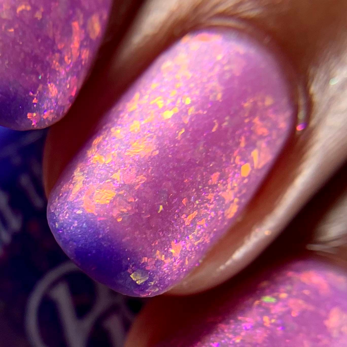 Bunny Tales is a gorgeous tri-thermal nail polish that has an electric blue shade (cold) and it changes to a vibrant orchid (medium temperature) to a very soft pink (warm). Bunny Tales also has a jelly like formula, loaded with iridescent flakes that shift the color from gold to orange, pink, purple and green in certain lightning and some tiny holographic flakes.