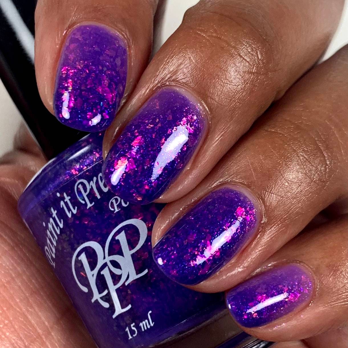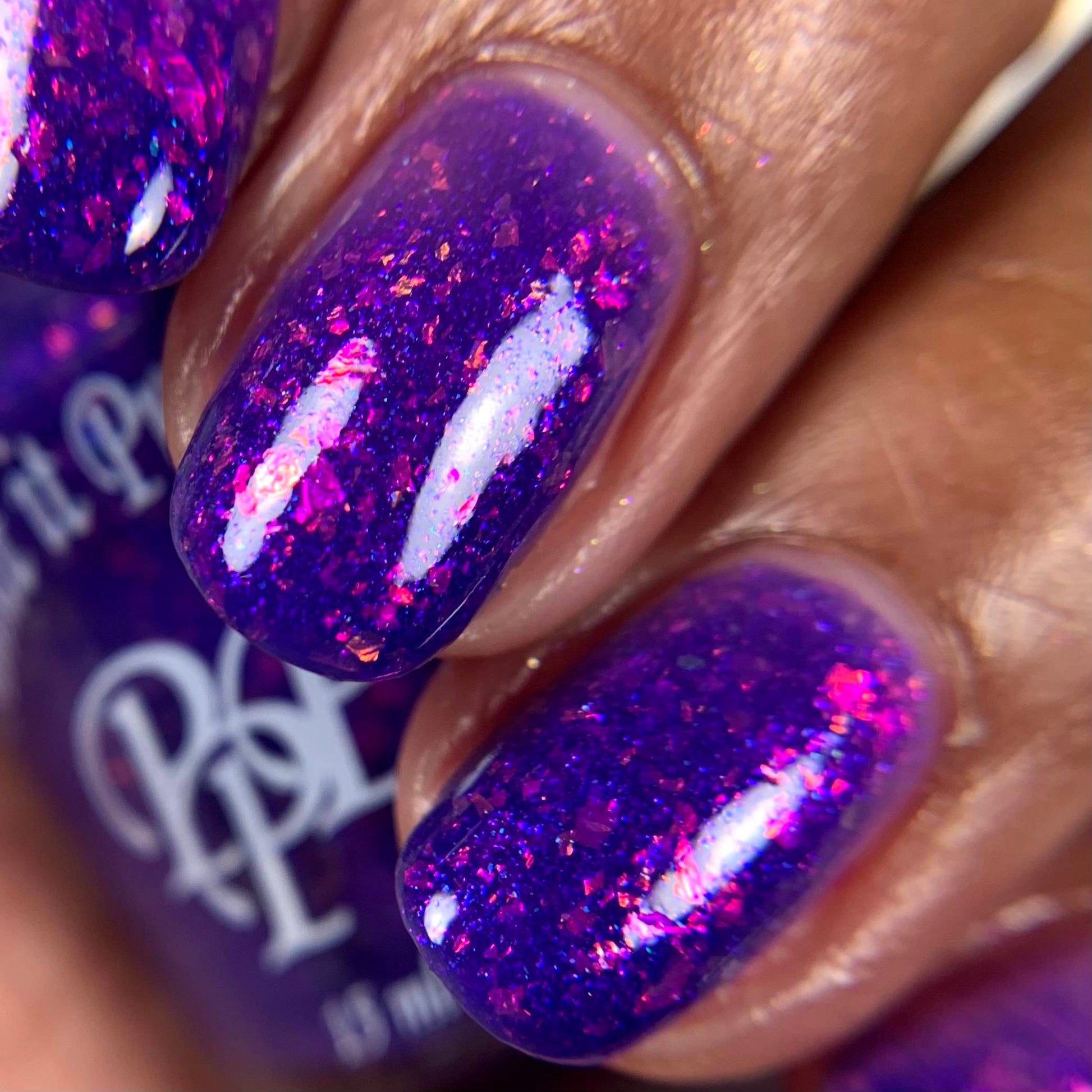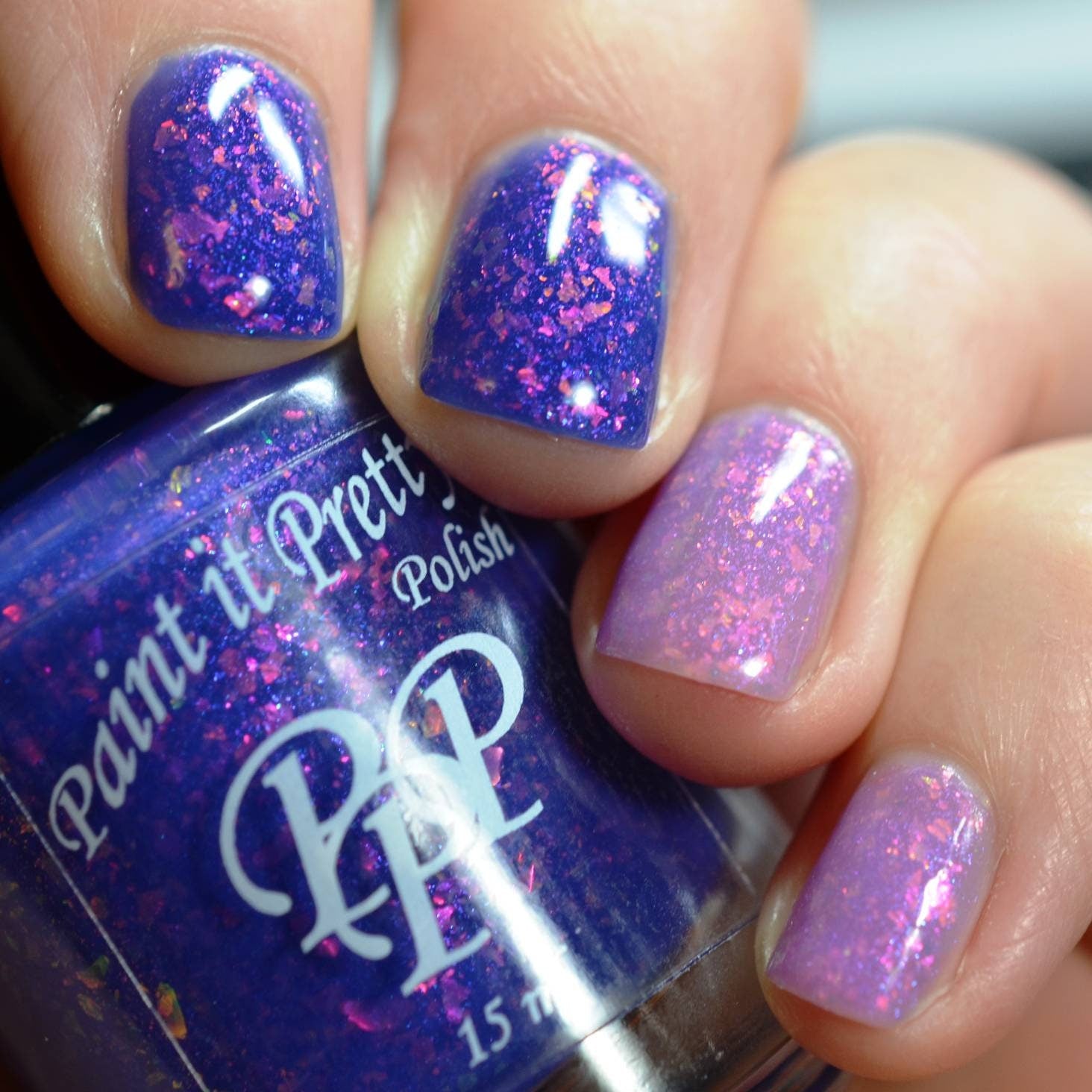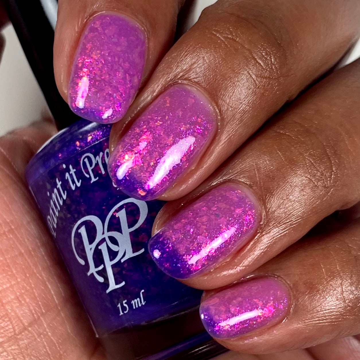 Bunny Tales is a gorgeous tri-thermal nail polish that has an electric blue shade (cold) and it changes to a vibrant orchid (medium temperature) to a very soft pink (warm). Bunny Tales also has a jelly like formula, loaded with iridescent flakes that shift the color from gold to orange, pink, purple and green in certain lightning and some tiny holographic flakes.