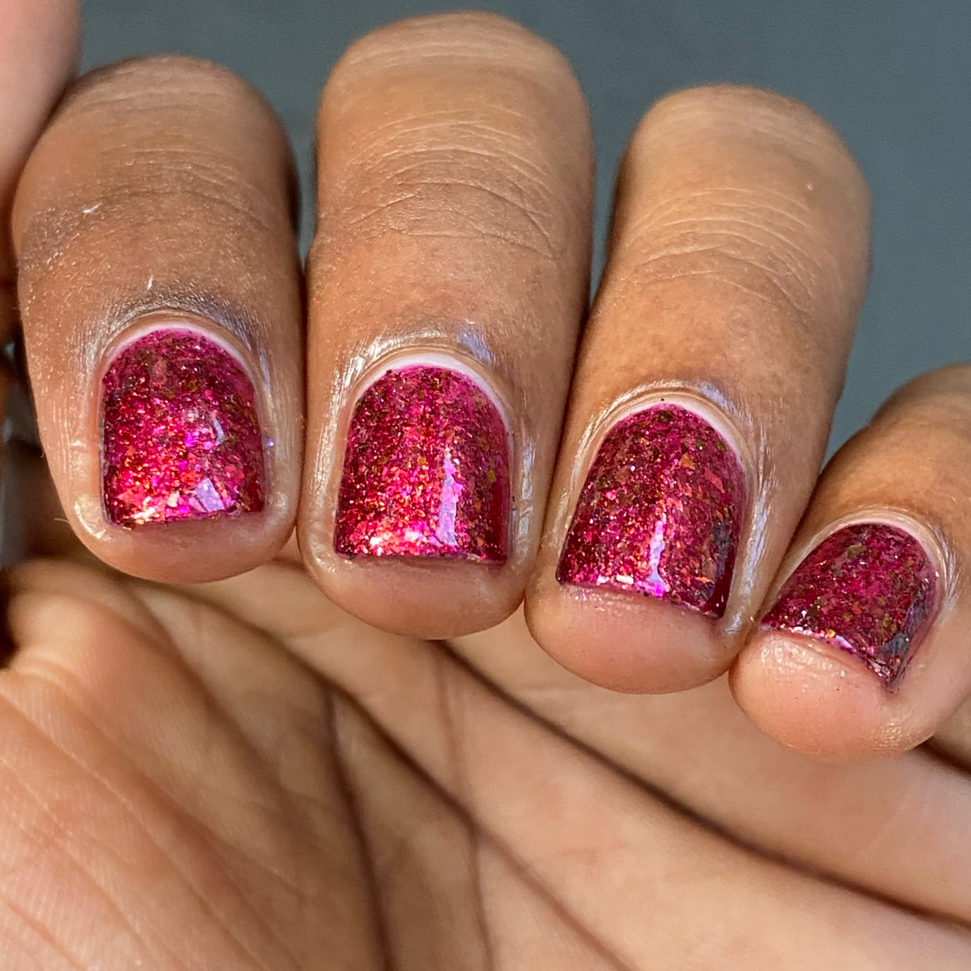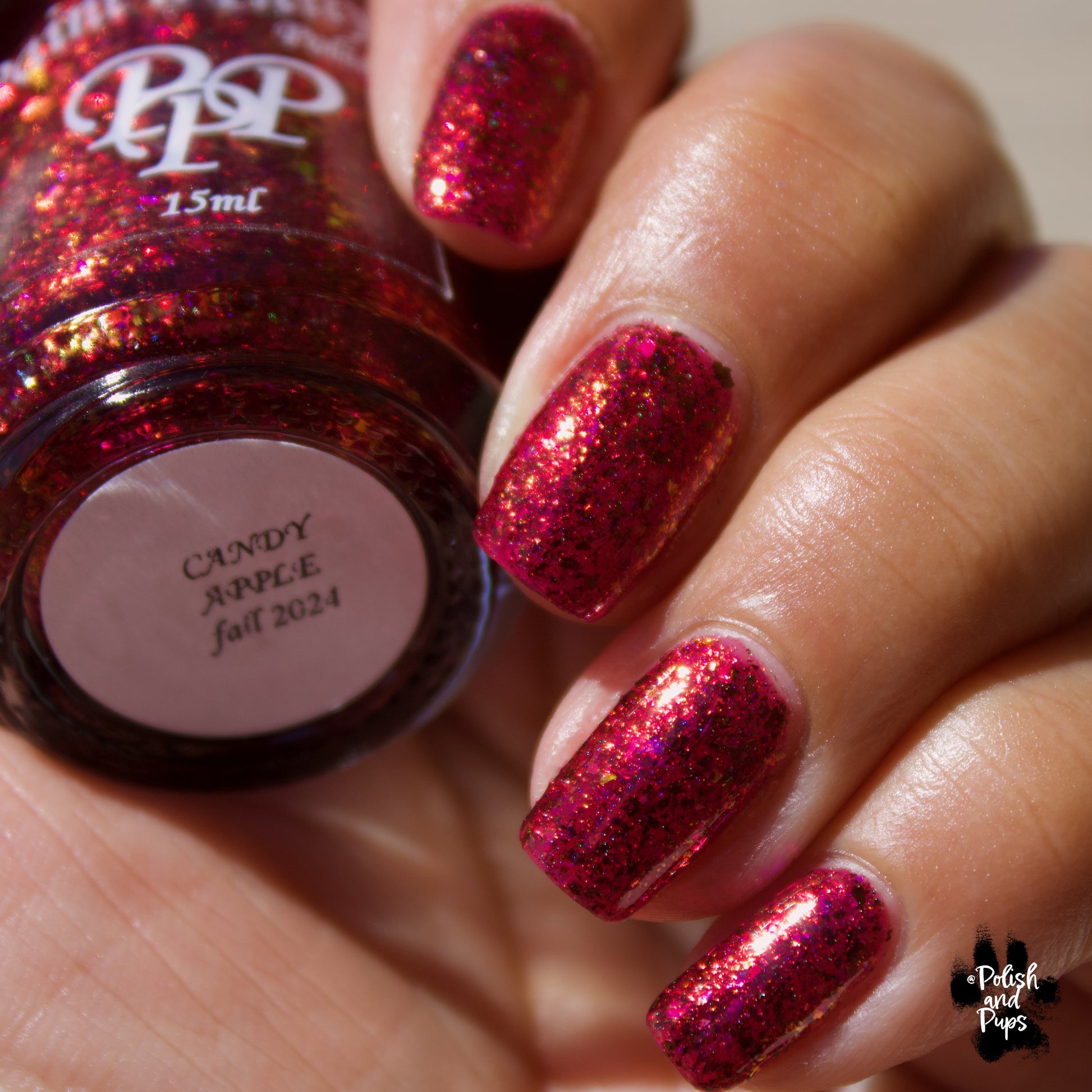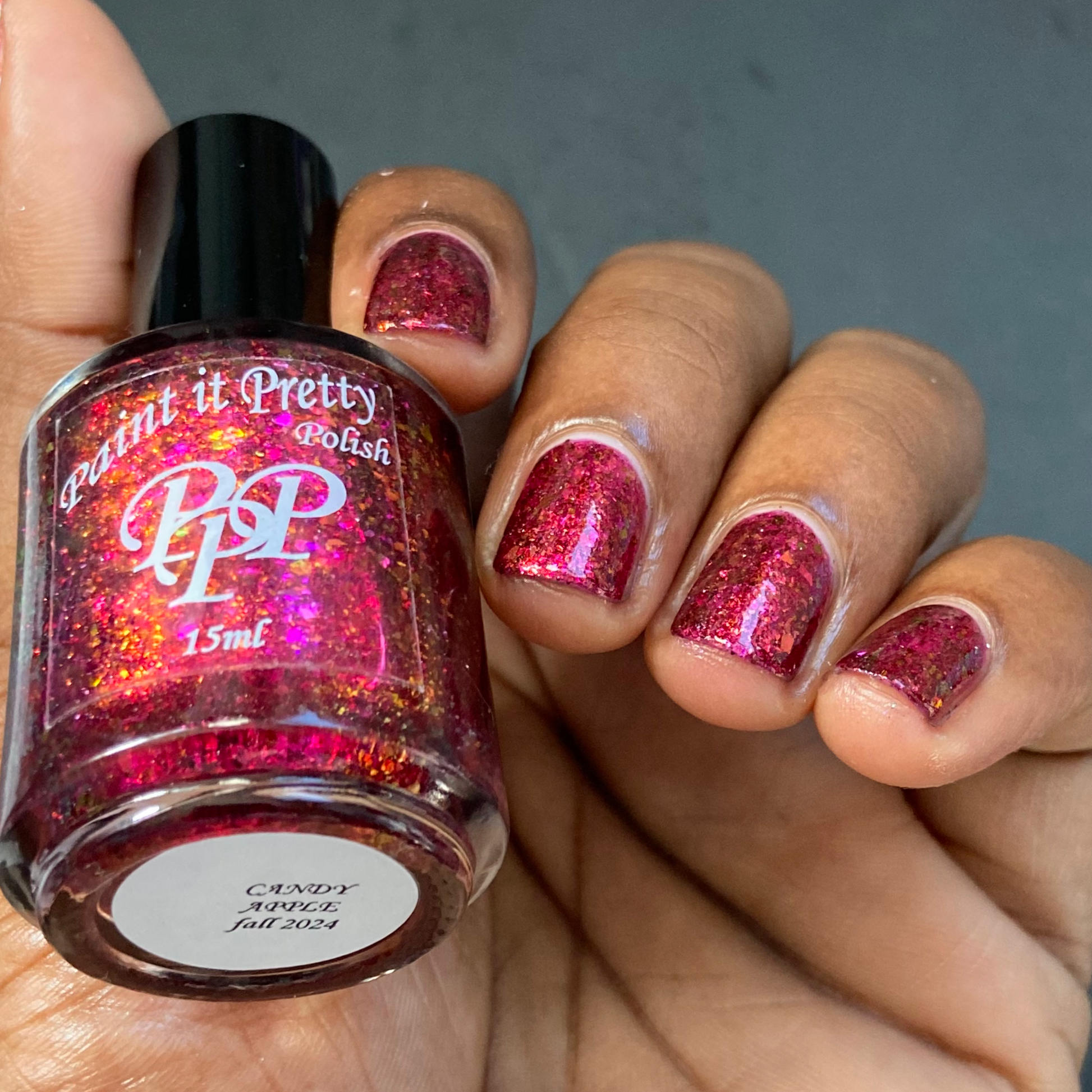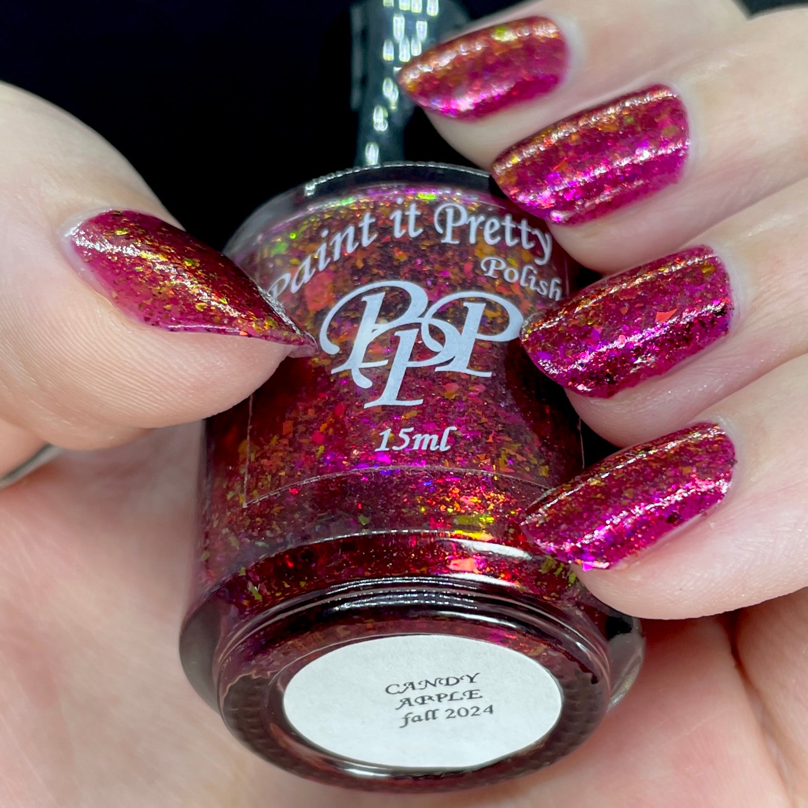 Candy Apple is a red jelly base with pink/orange irridescent flakes, orange/yellow chameleon flakes, and a touch of tiny holographic flakes.