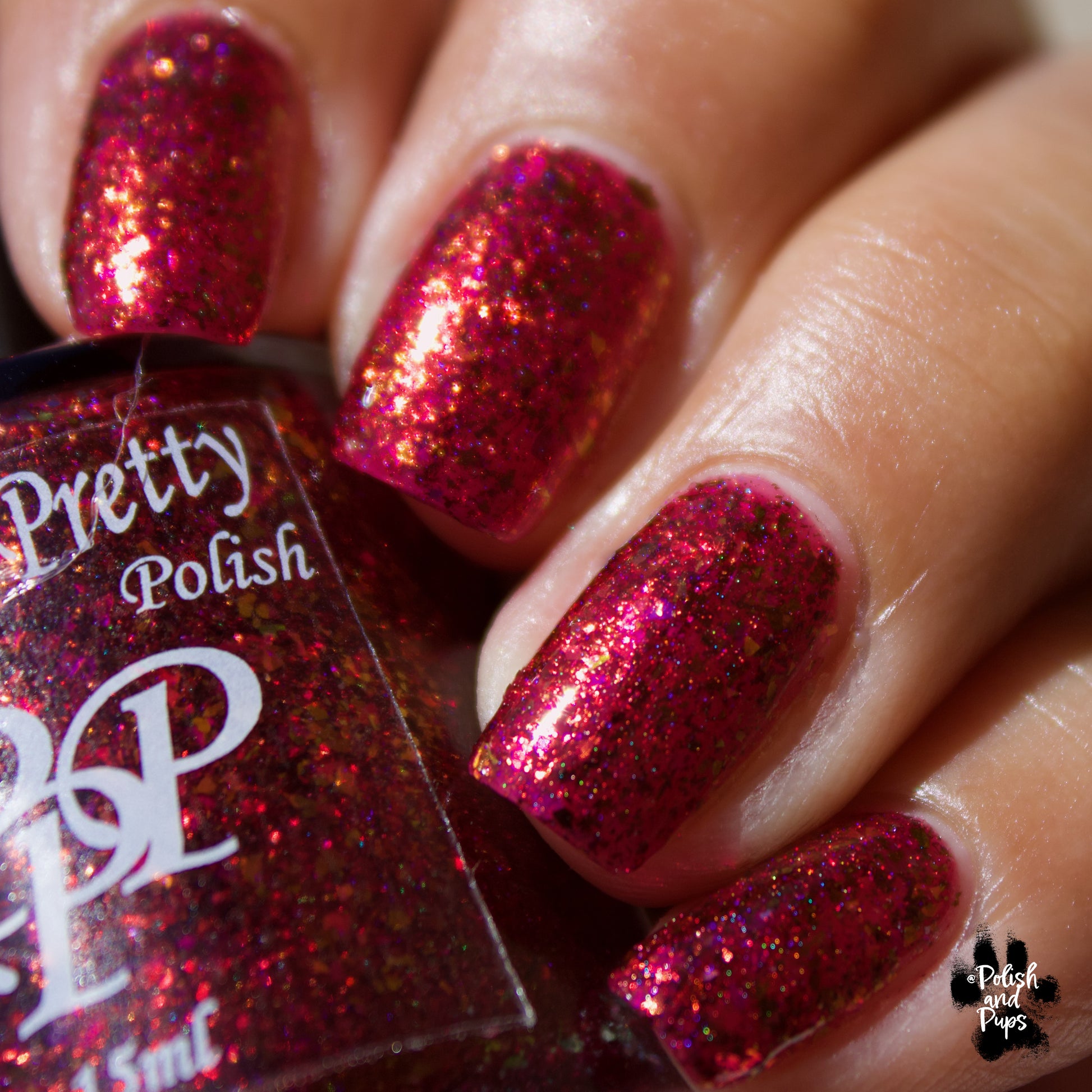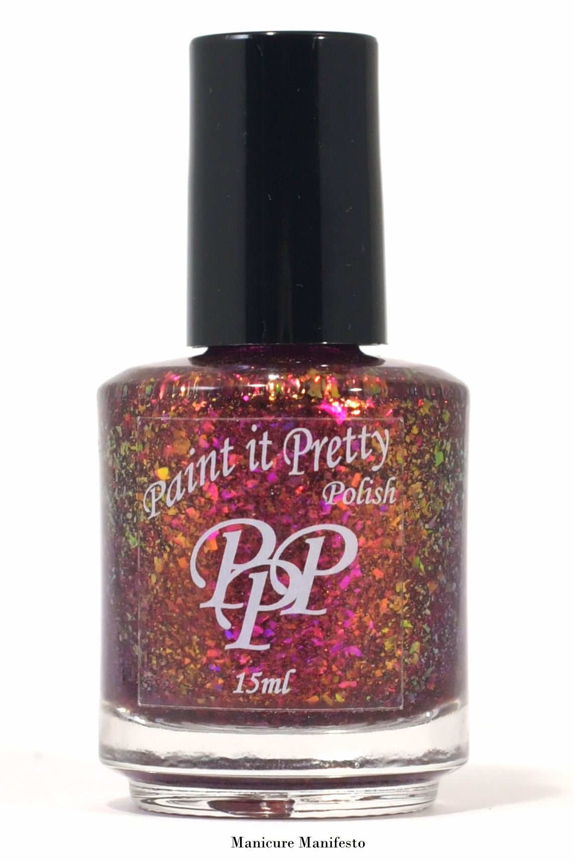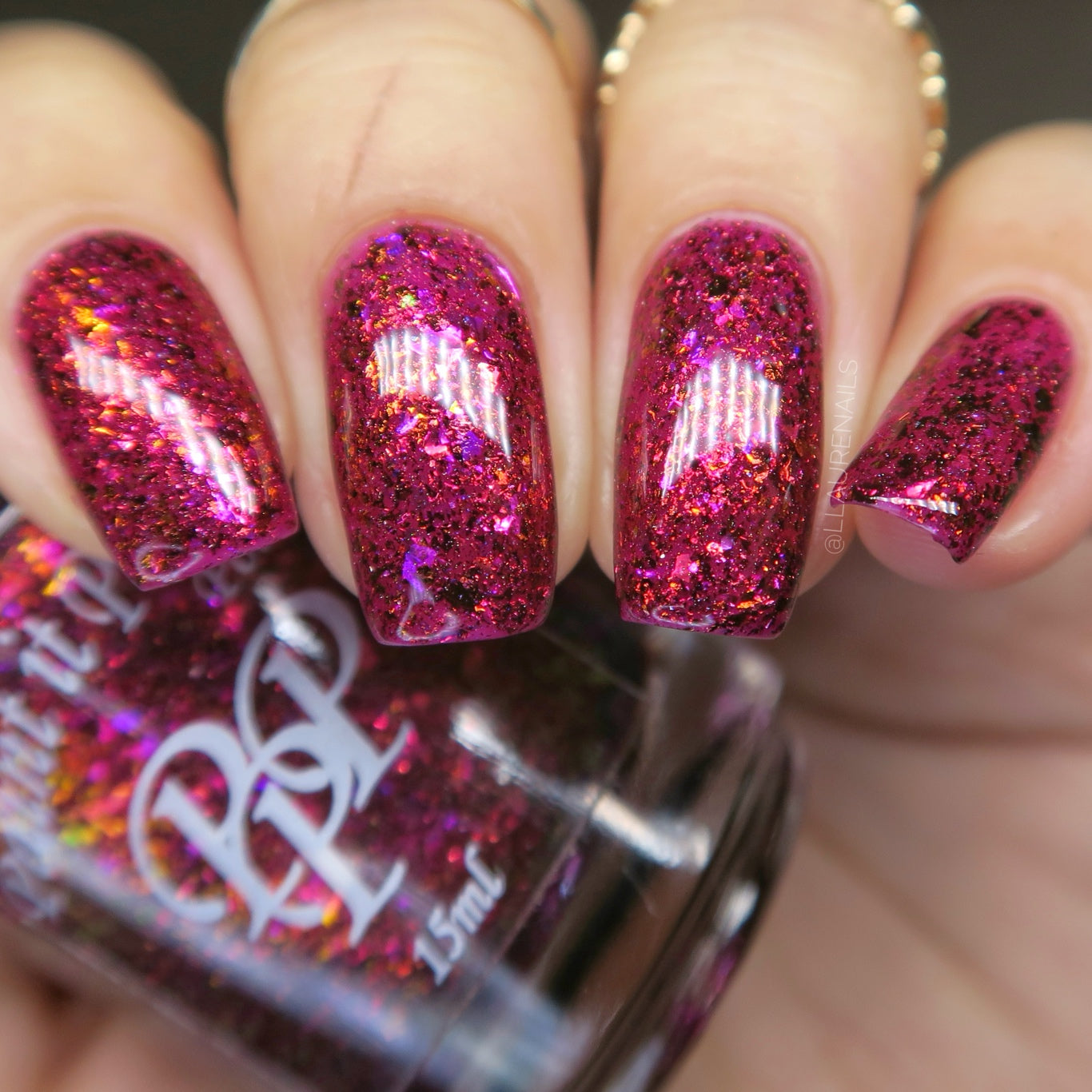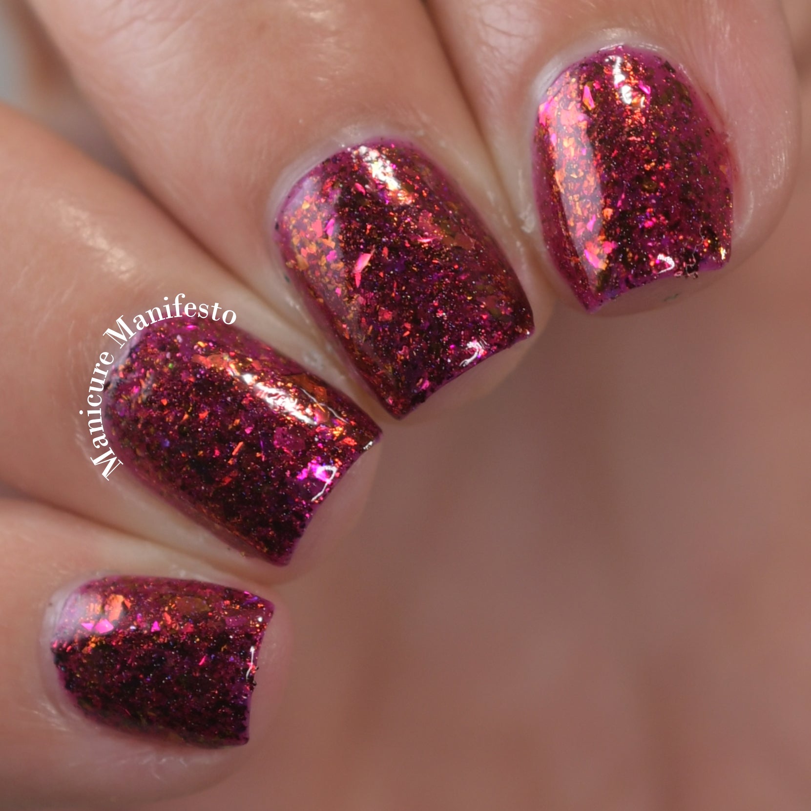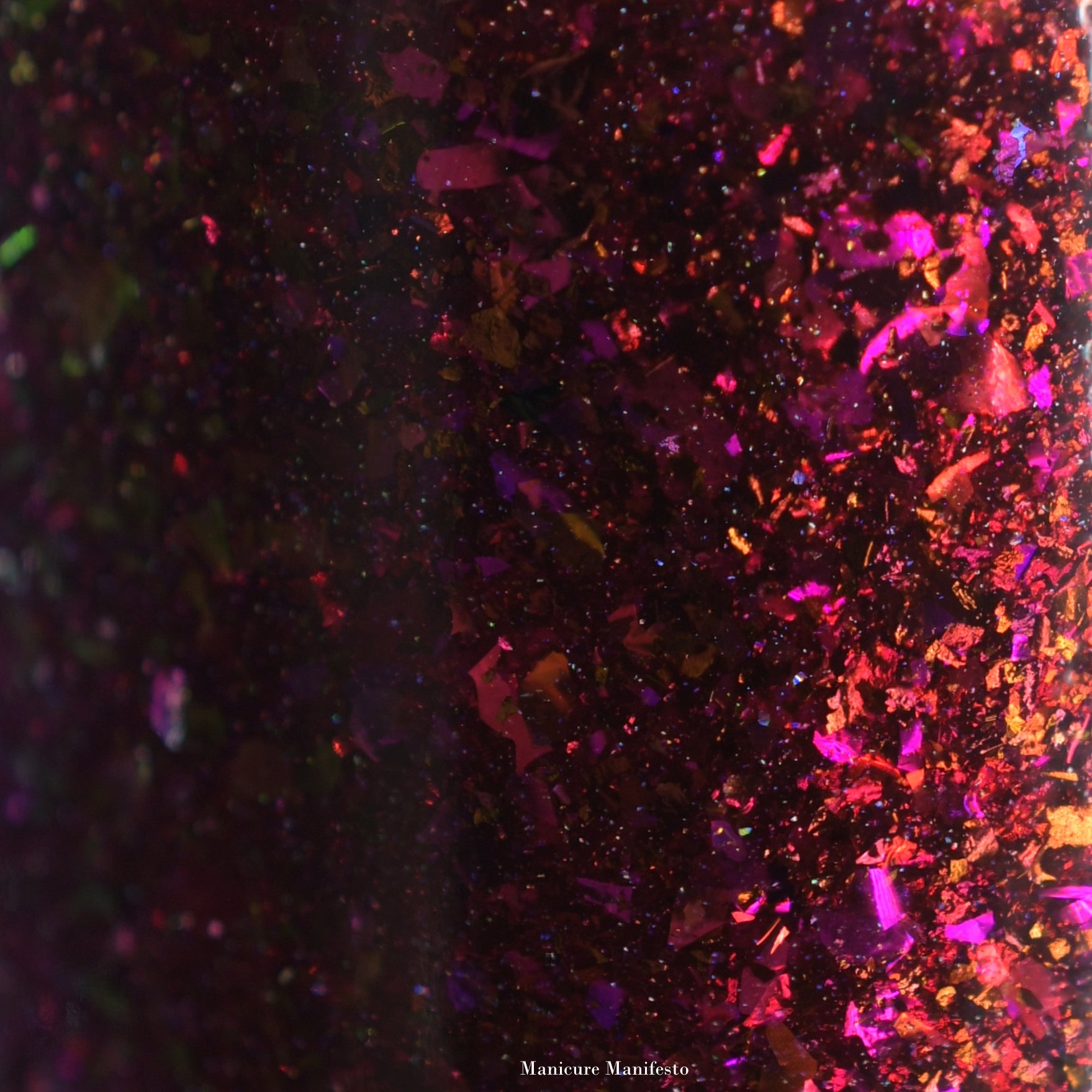 Candy Apple is a red jelly base with pink/orange irridescent flakes, orange/yellow chameleon flakes, and a touch of tiny holographic flakes.