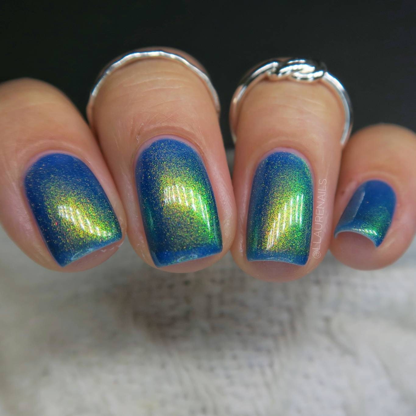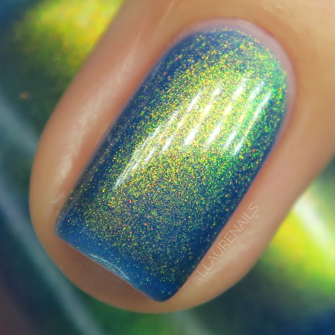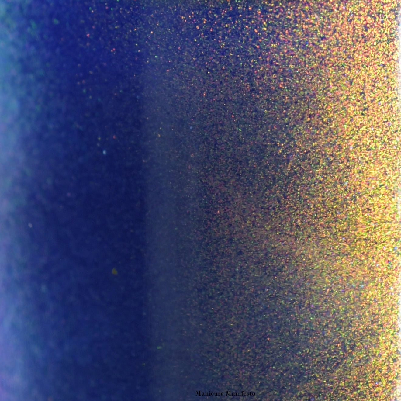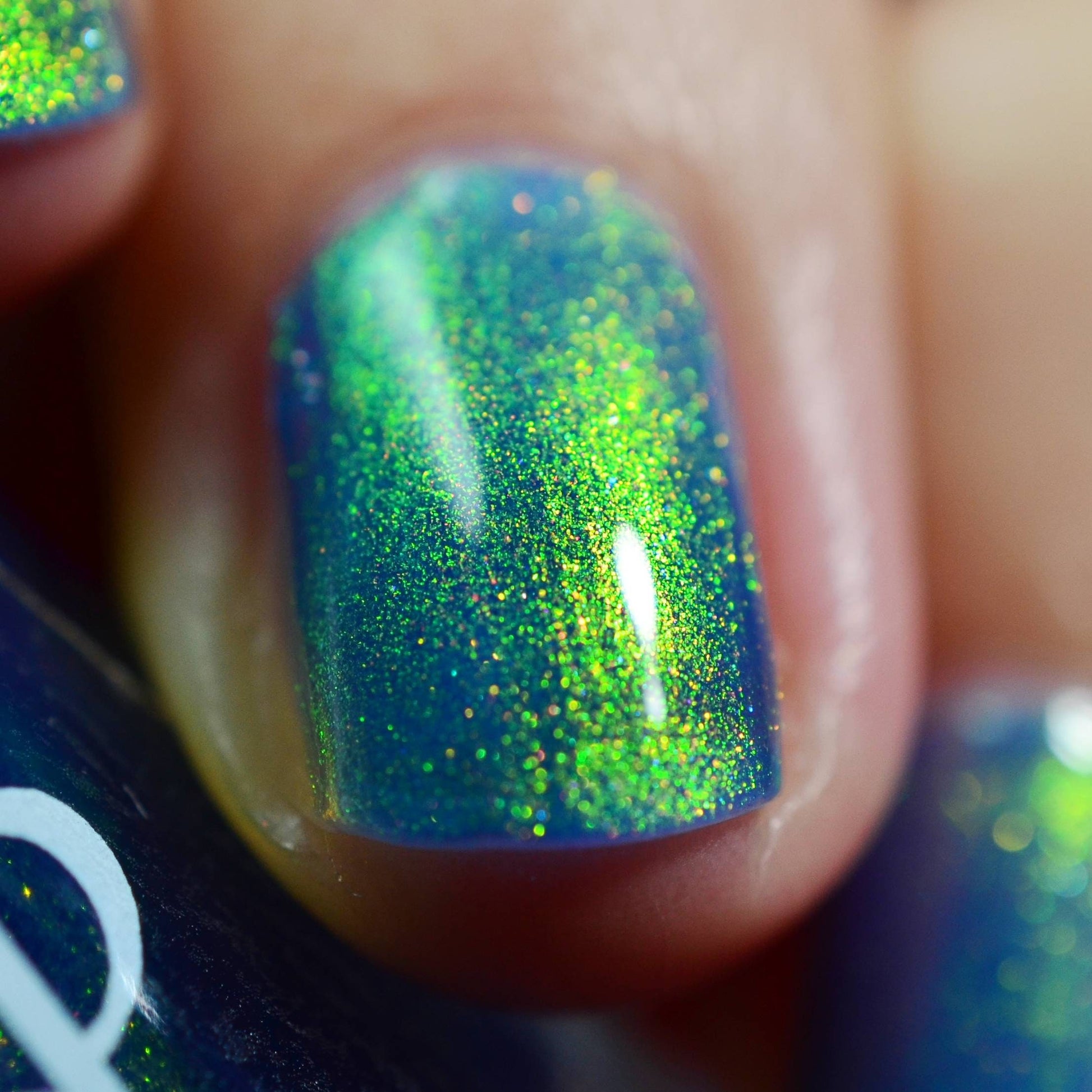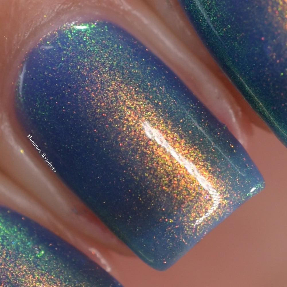 Dive into "Dreamy Sea". Multichrome shimmer swims in a sheer sapphire blue base. Flashes of greens, copper and gold can be seen flowing throughout. Wear alone for one look or wear over black or white base for a different effect.