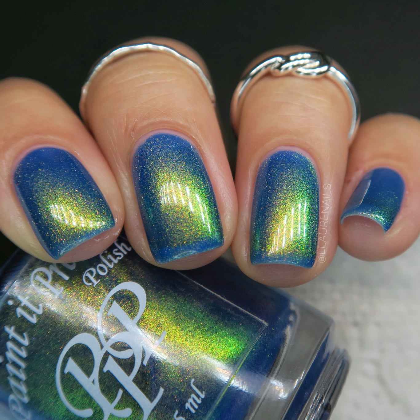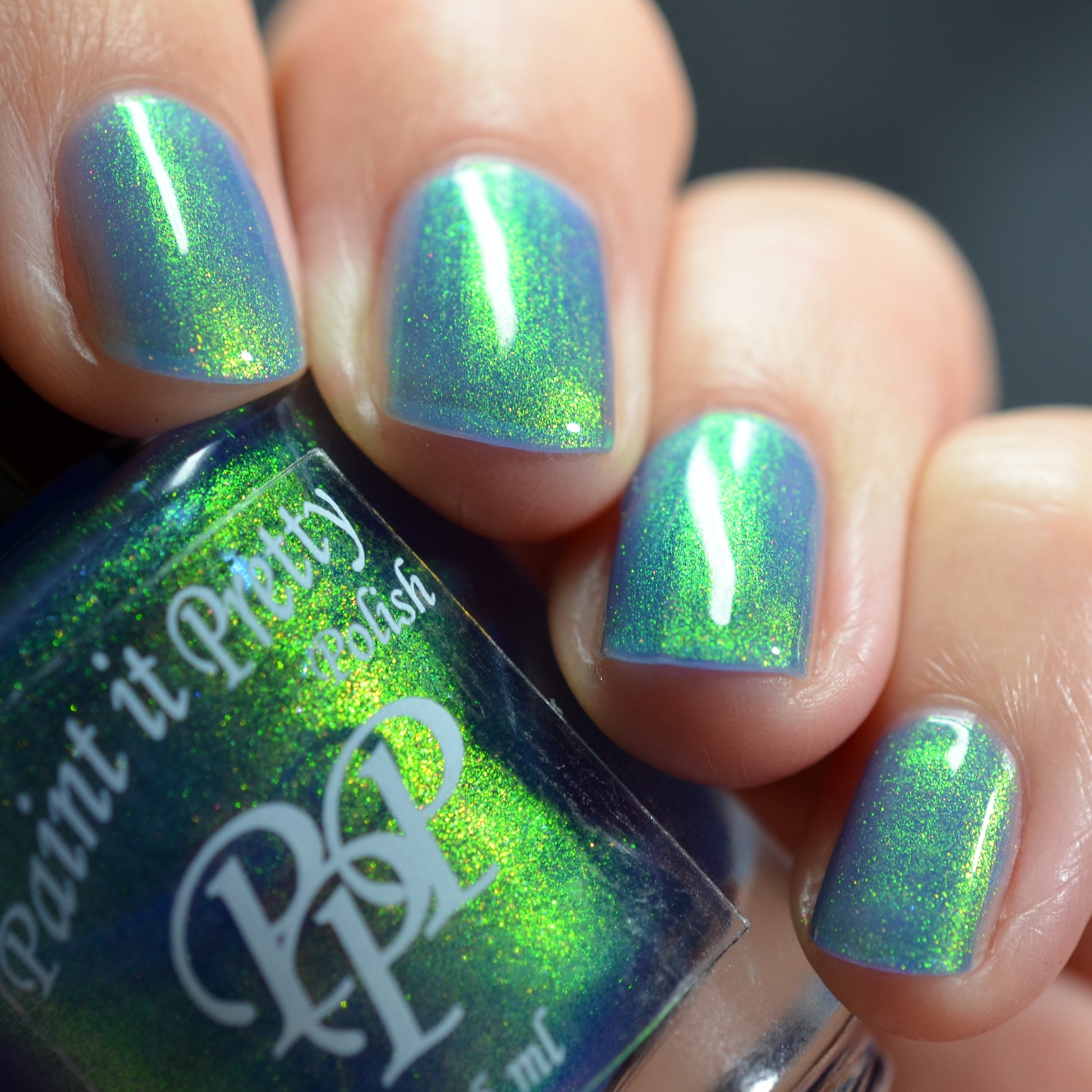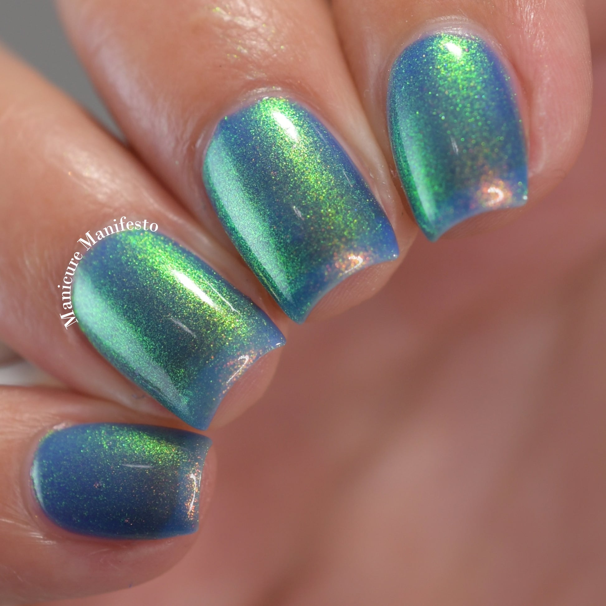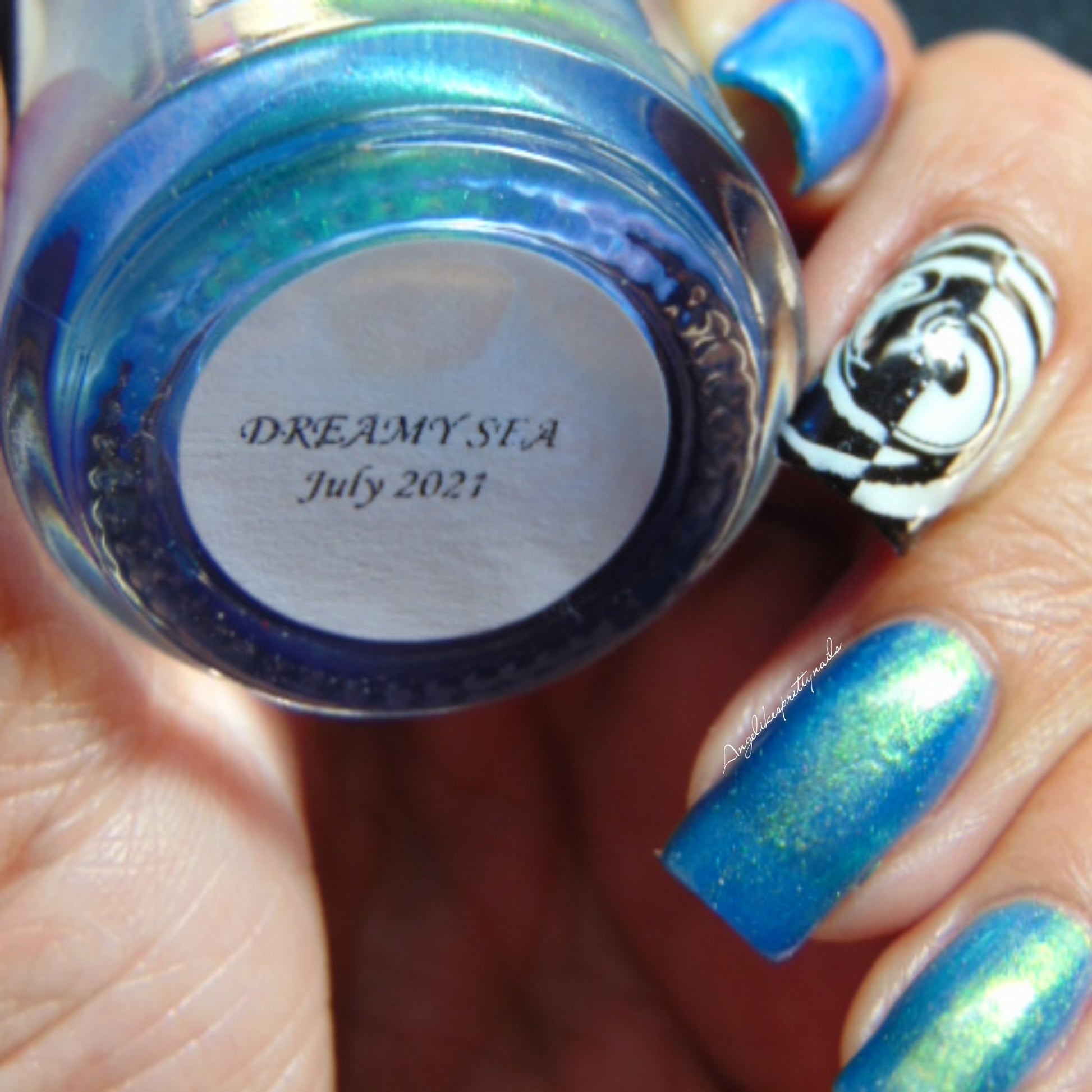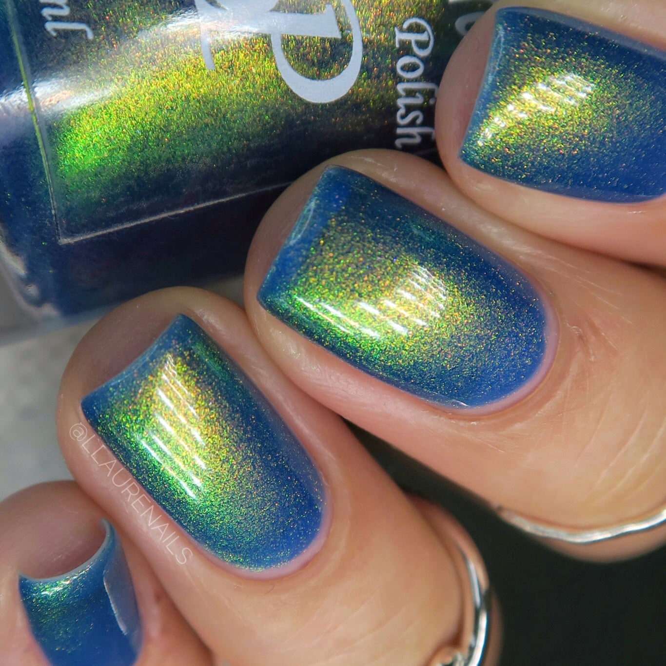 Dive into "Dreamy Sea". Multichrome shimmer swims in a sheer sapphire blue base. Flashes of greens, copper and gold can be seen flowing throughout. Wear alone for one look or wear over black or white base for a different effect.