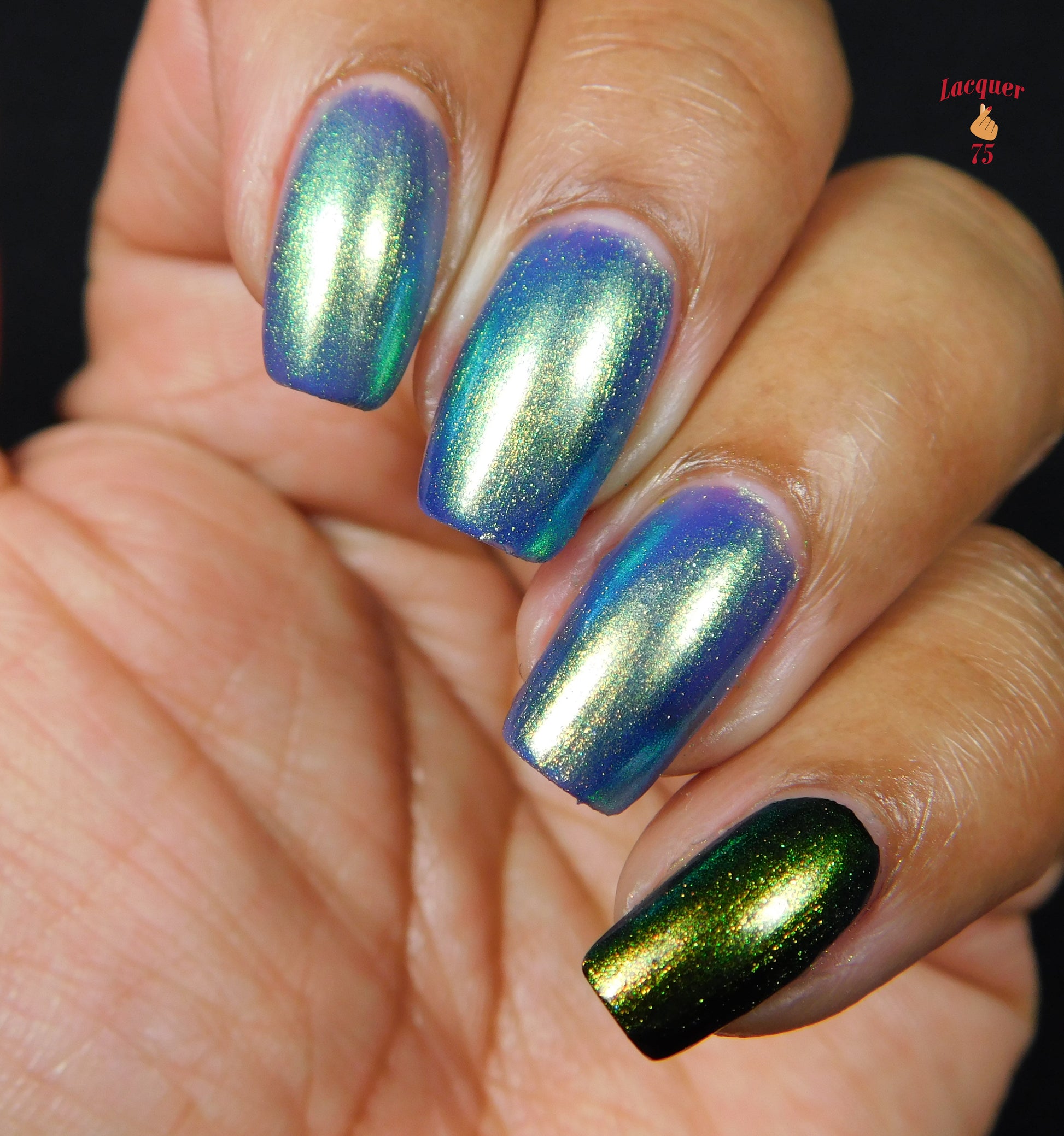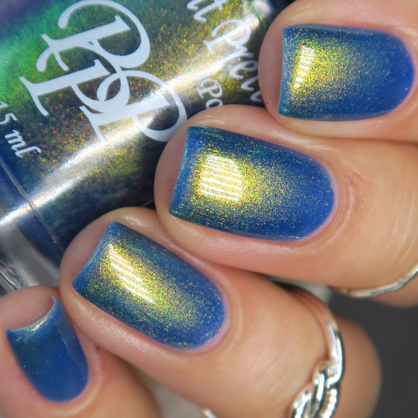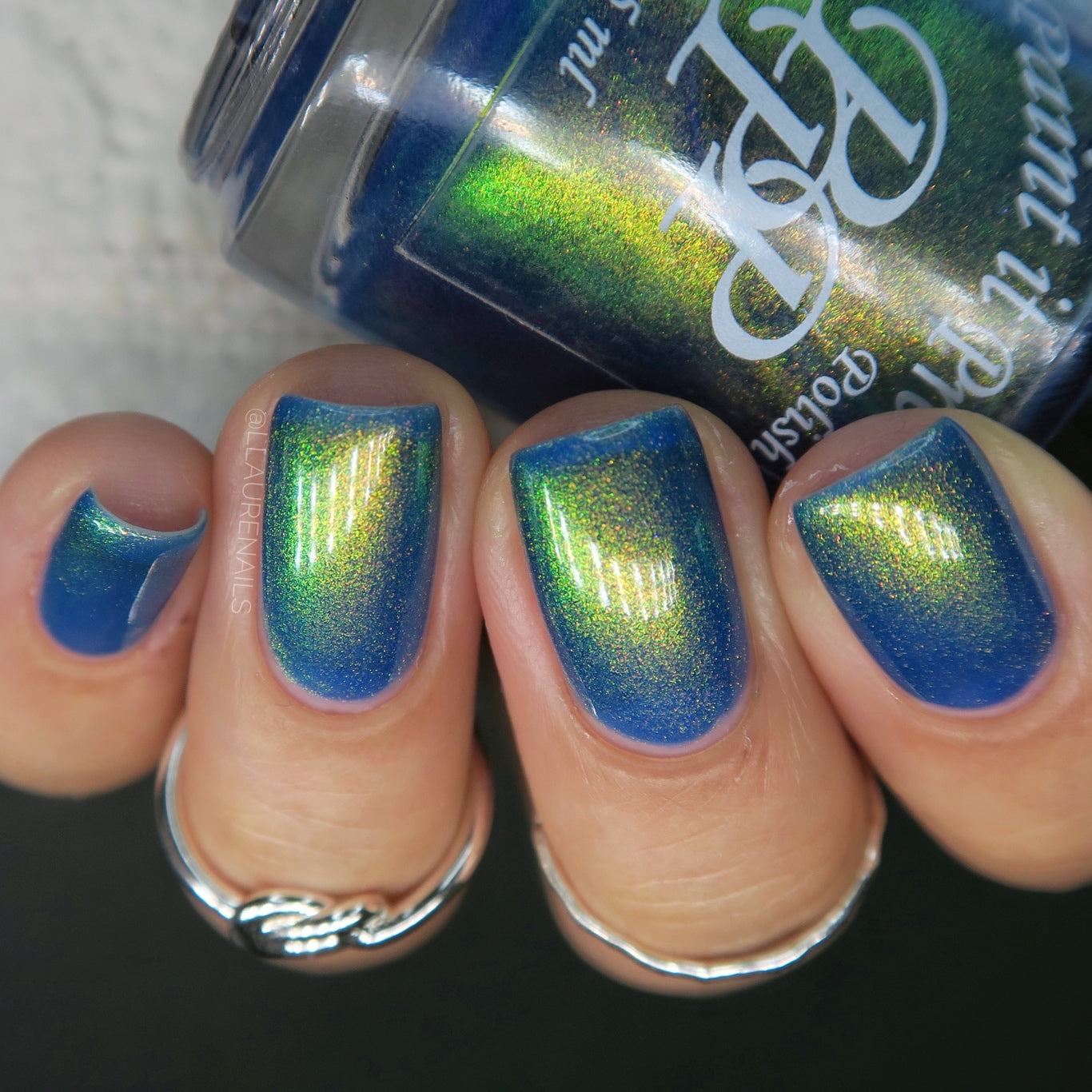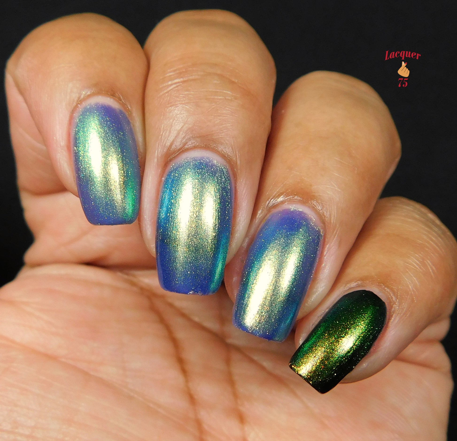 Dive into "Dreamy Sea". Multichrome shimmer swims in a sheer sapphire blue base. Flashes of greens, copper and gold can be seen flowing throughout. Wear alone for one look or wear over black or white base for a different effect.