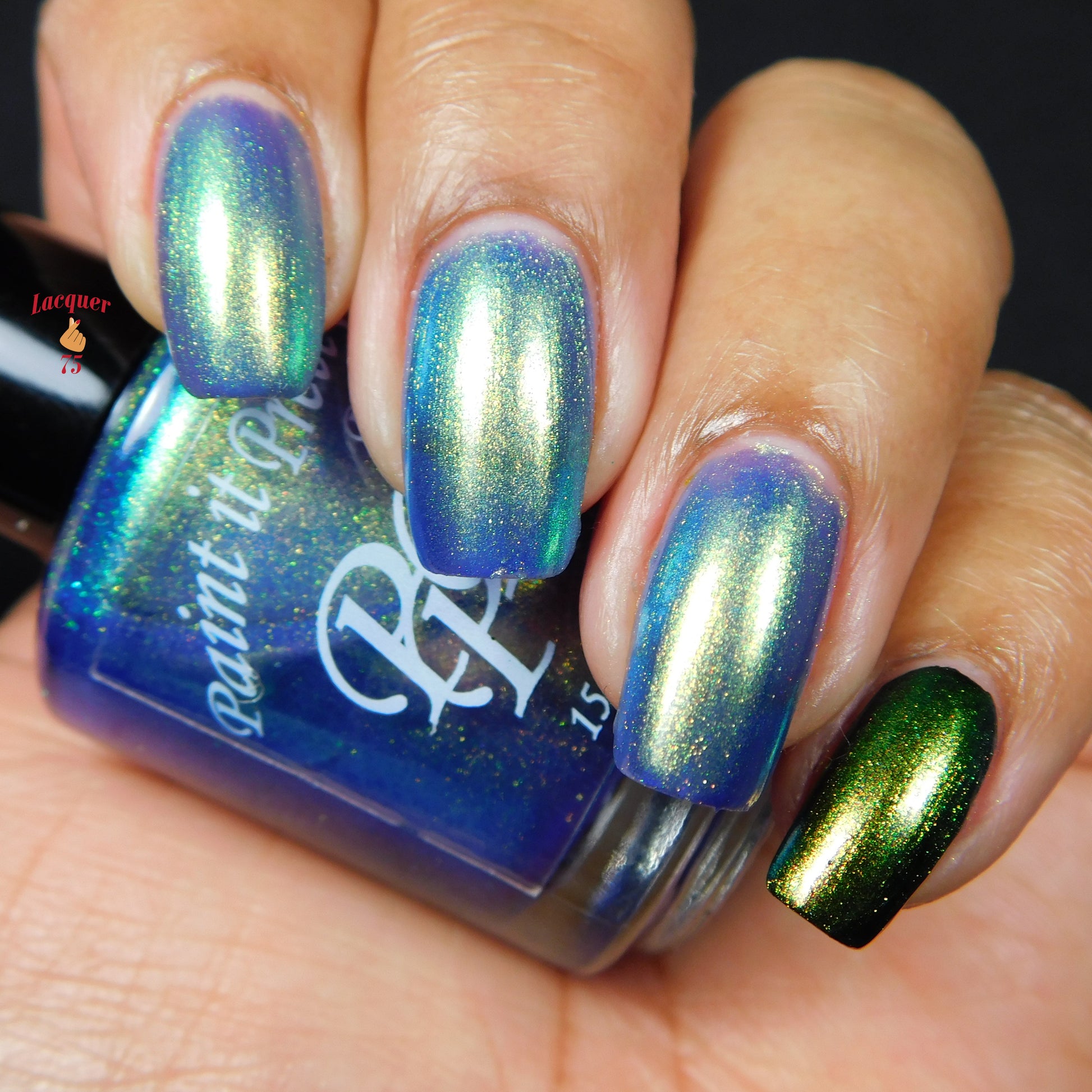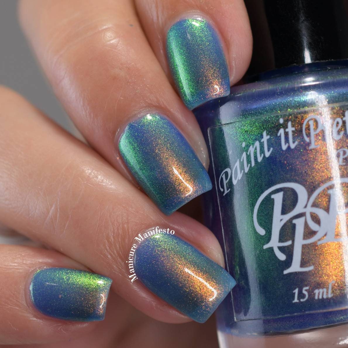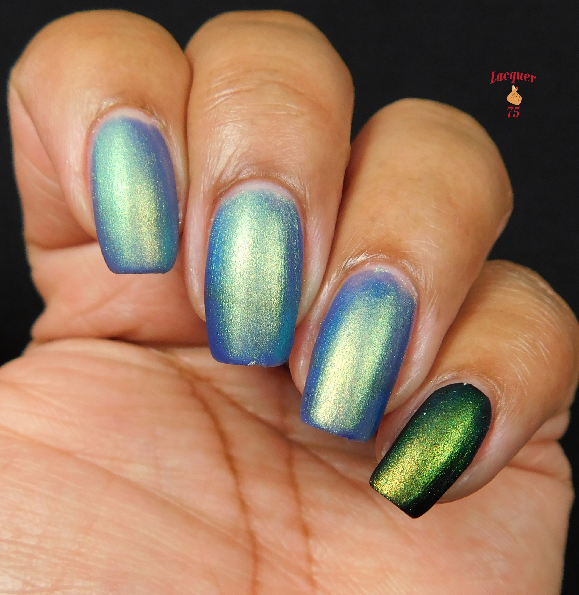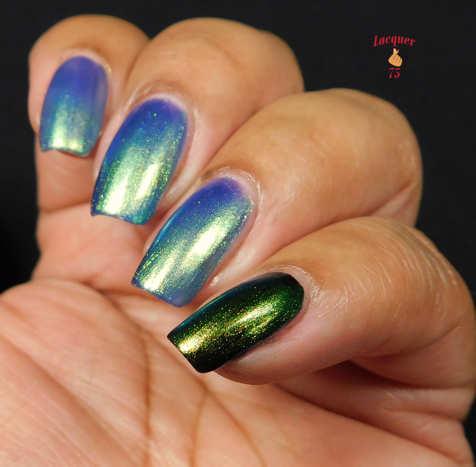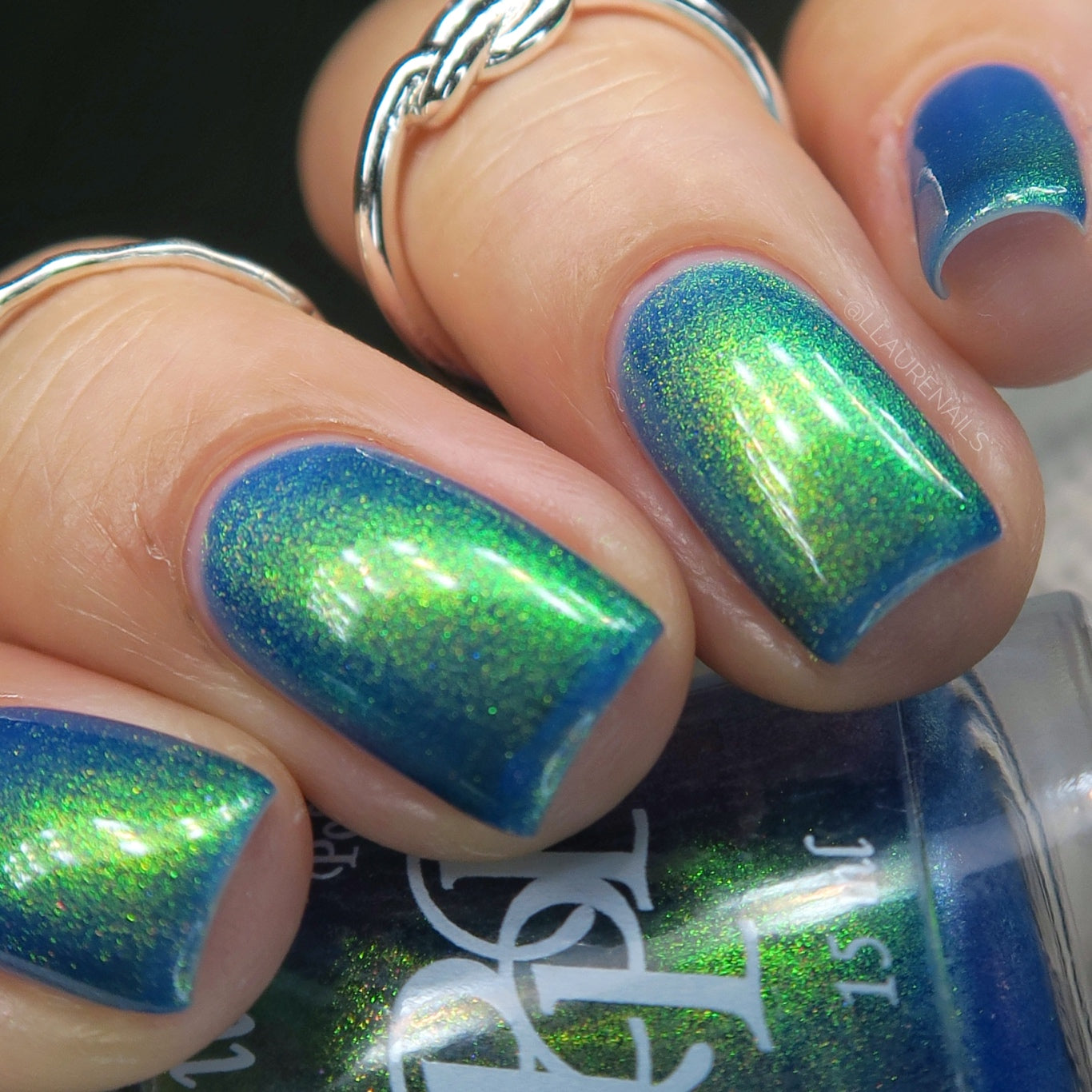 Dive into "Dreamy Sea". Multichrome shimmer swims in a sheer sapphire blue base. Flashes of greens, copper and gold can be seen flowing throughout. Wear alone for one look or wear over black or white base for a different effect.