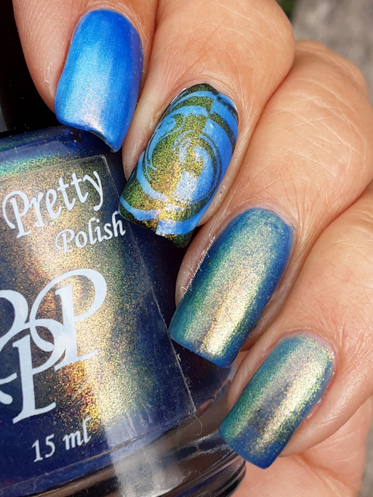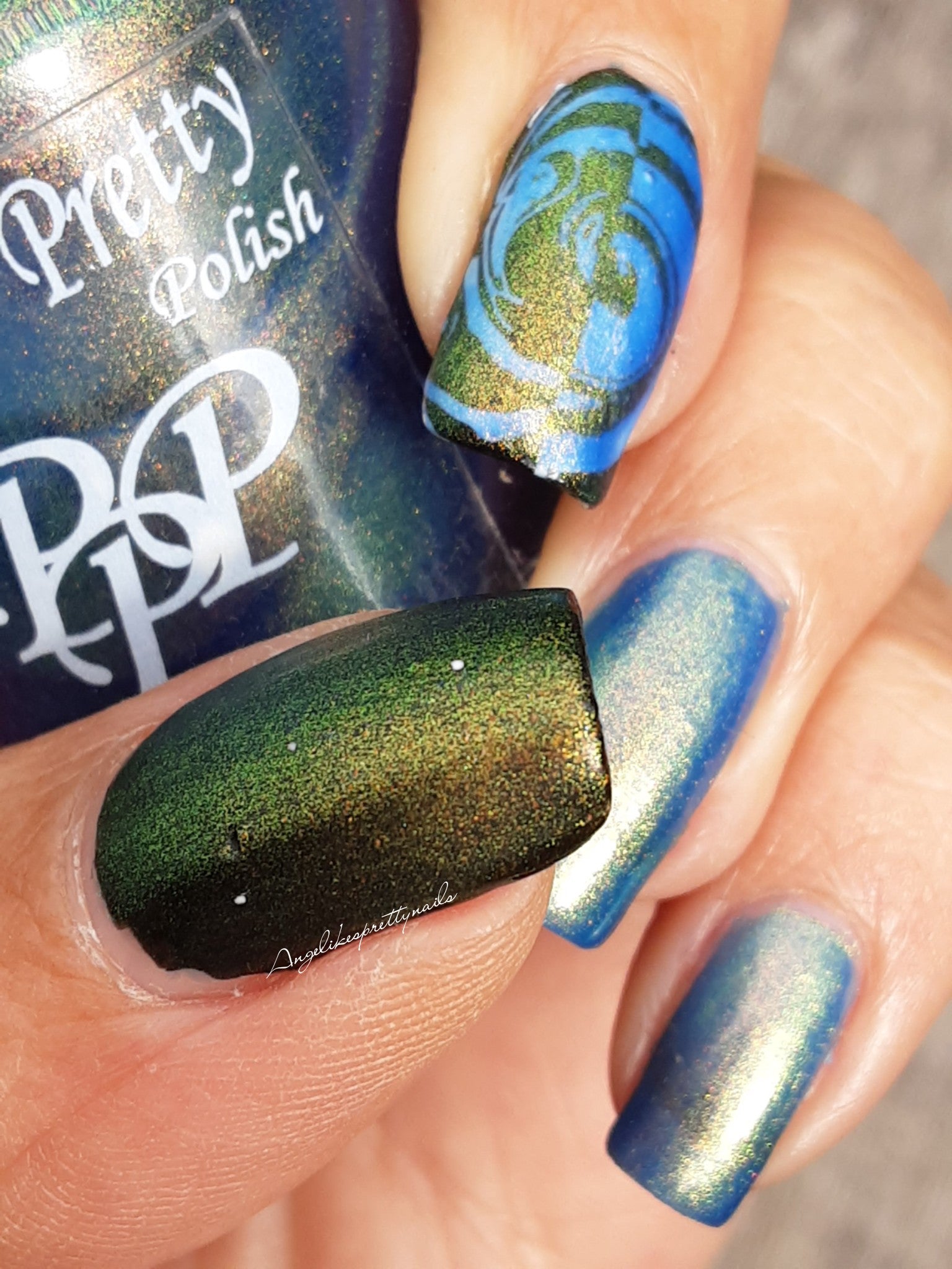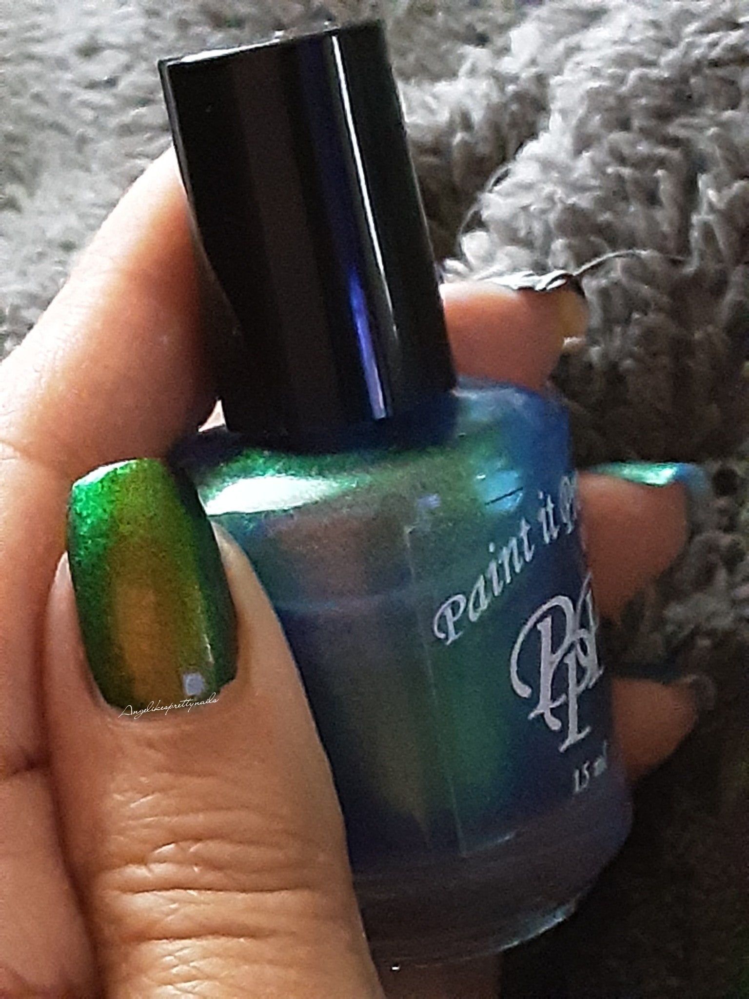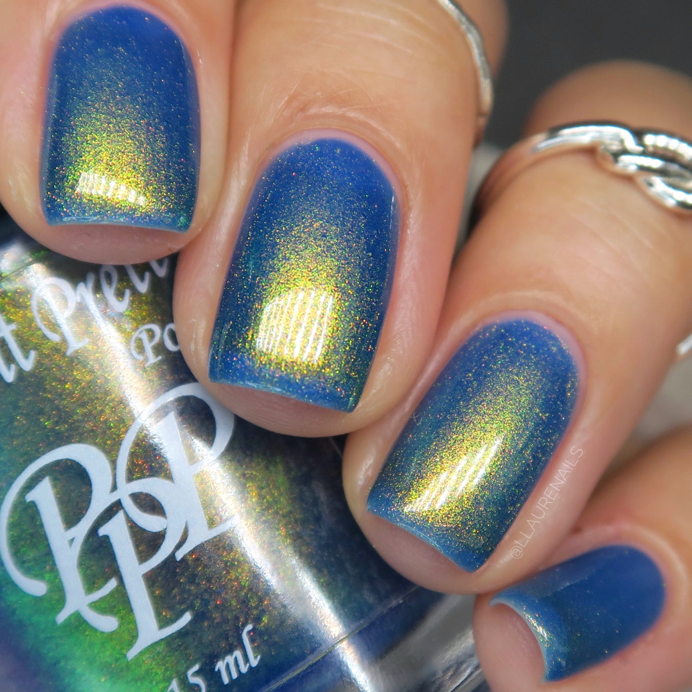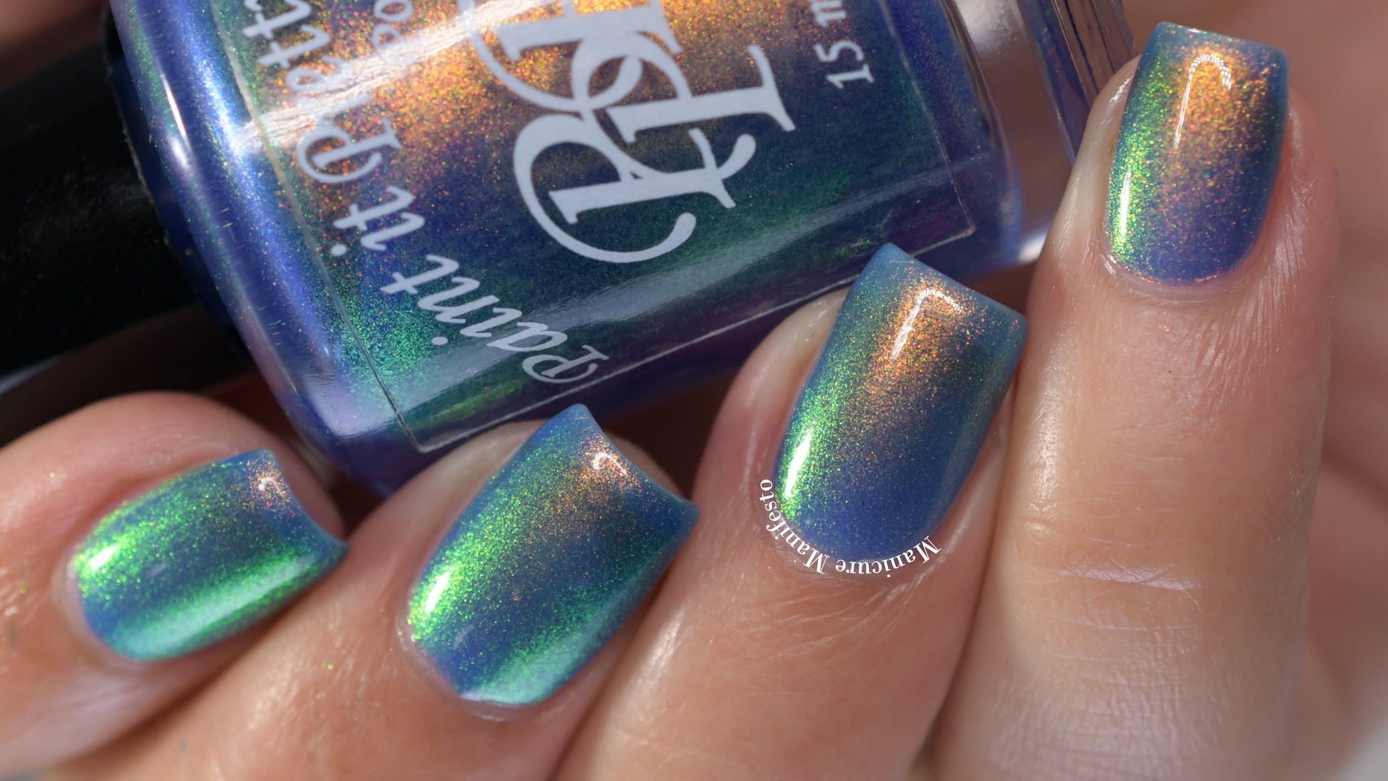 Dive into "Dreamy Sea". Multichrome shimmer swims in a sheer sapphire blue base. Flashes of greens, copper and gold can be seen flowing throughout. Wear alone for one look or wear over black or white base for a different effect.