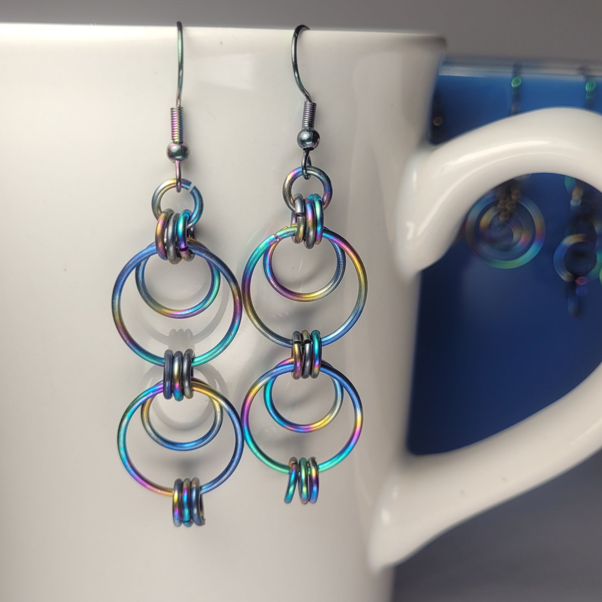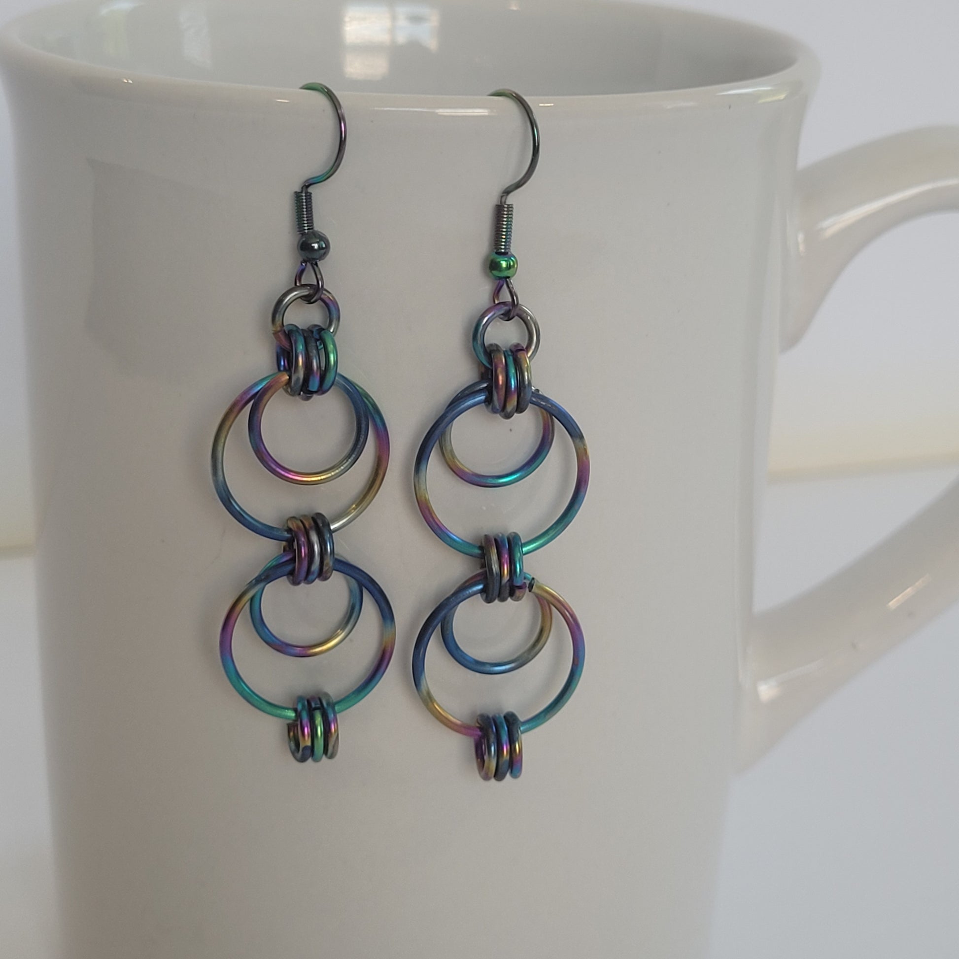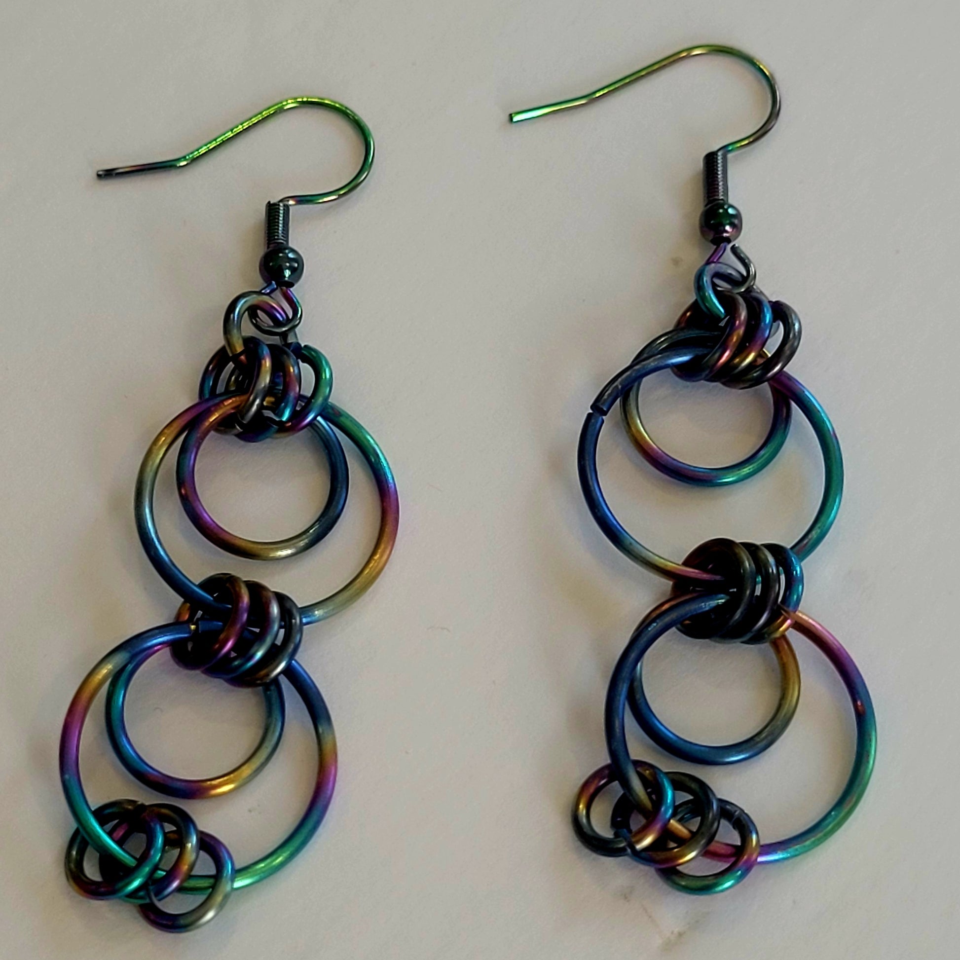 This set is made of rainbow anodized titanium rings and 201 stainless steal hooks. This pair of earring will show off a variety of colours