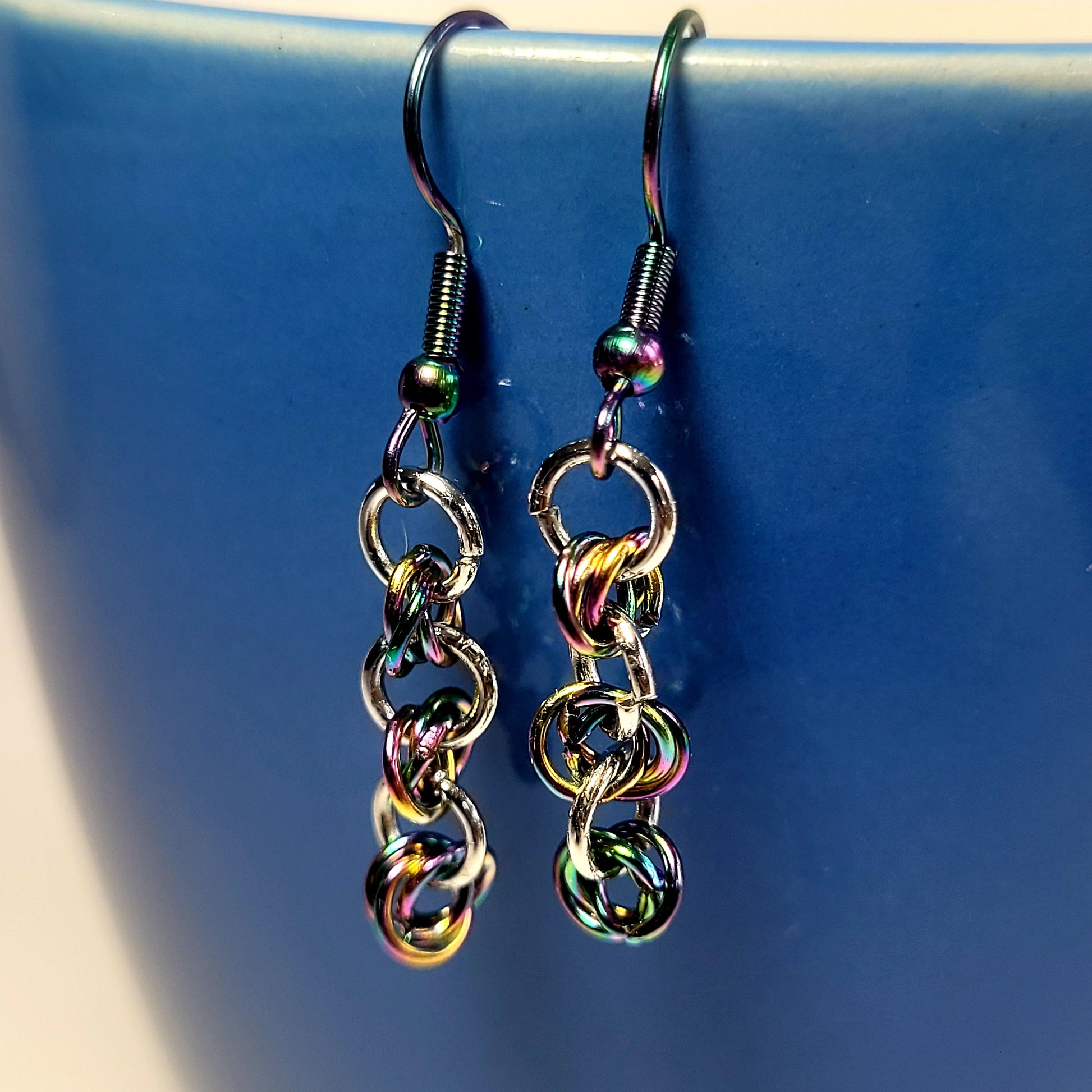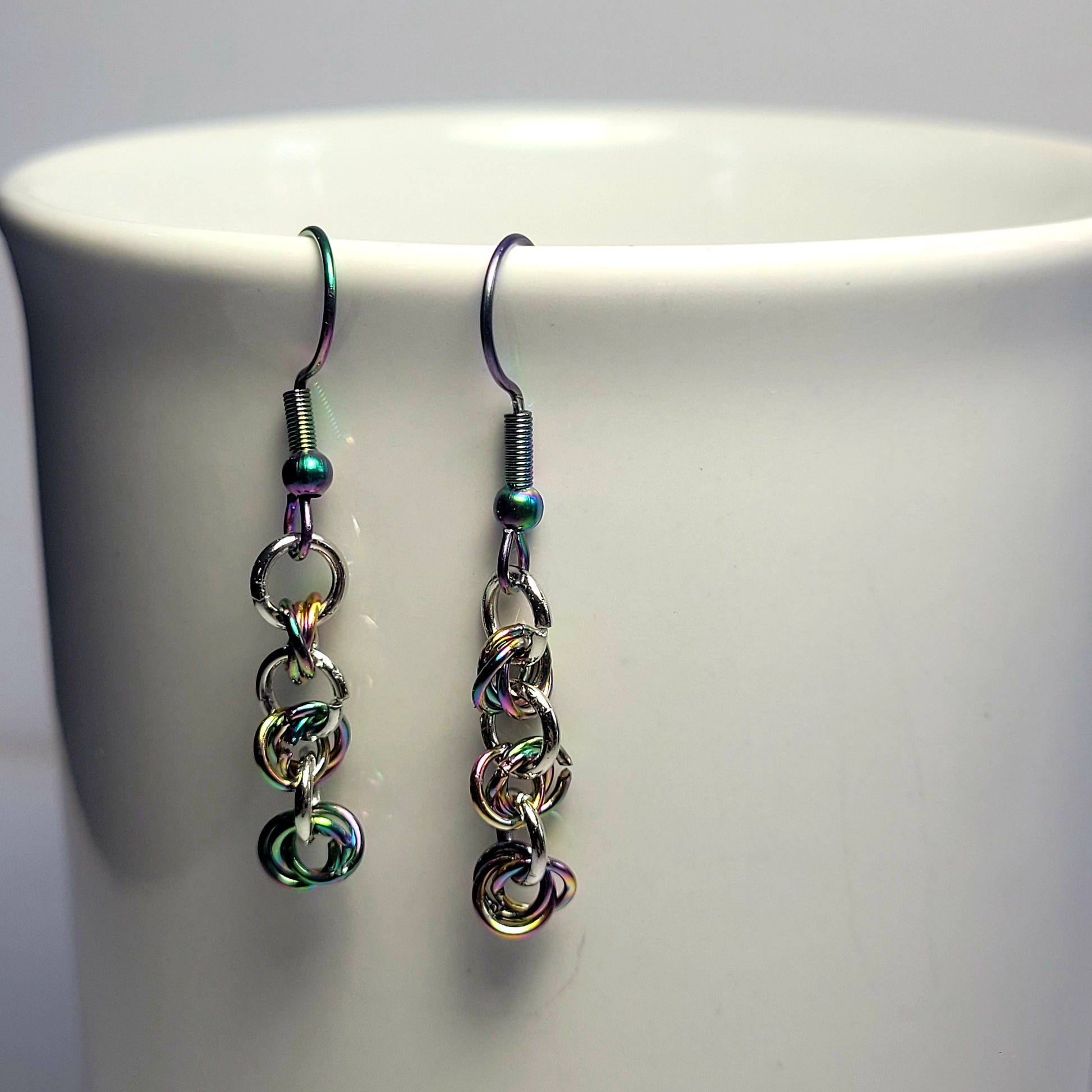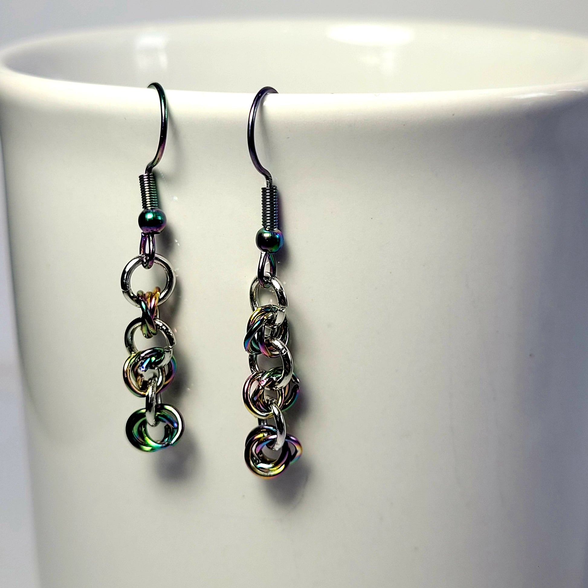 Handmade chainmail multichrome, rainbow (oil slick) earrings. Hand woven one ring at a time, this jewelry is sure to turn heads!