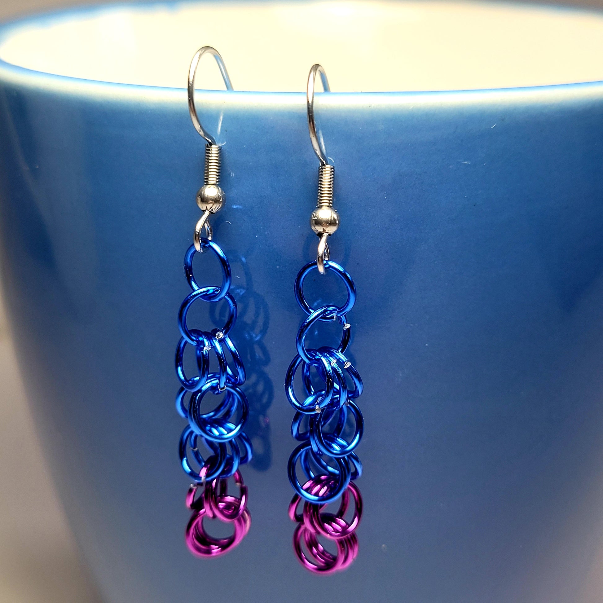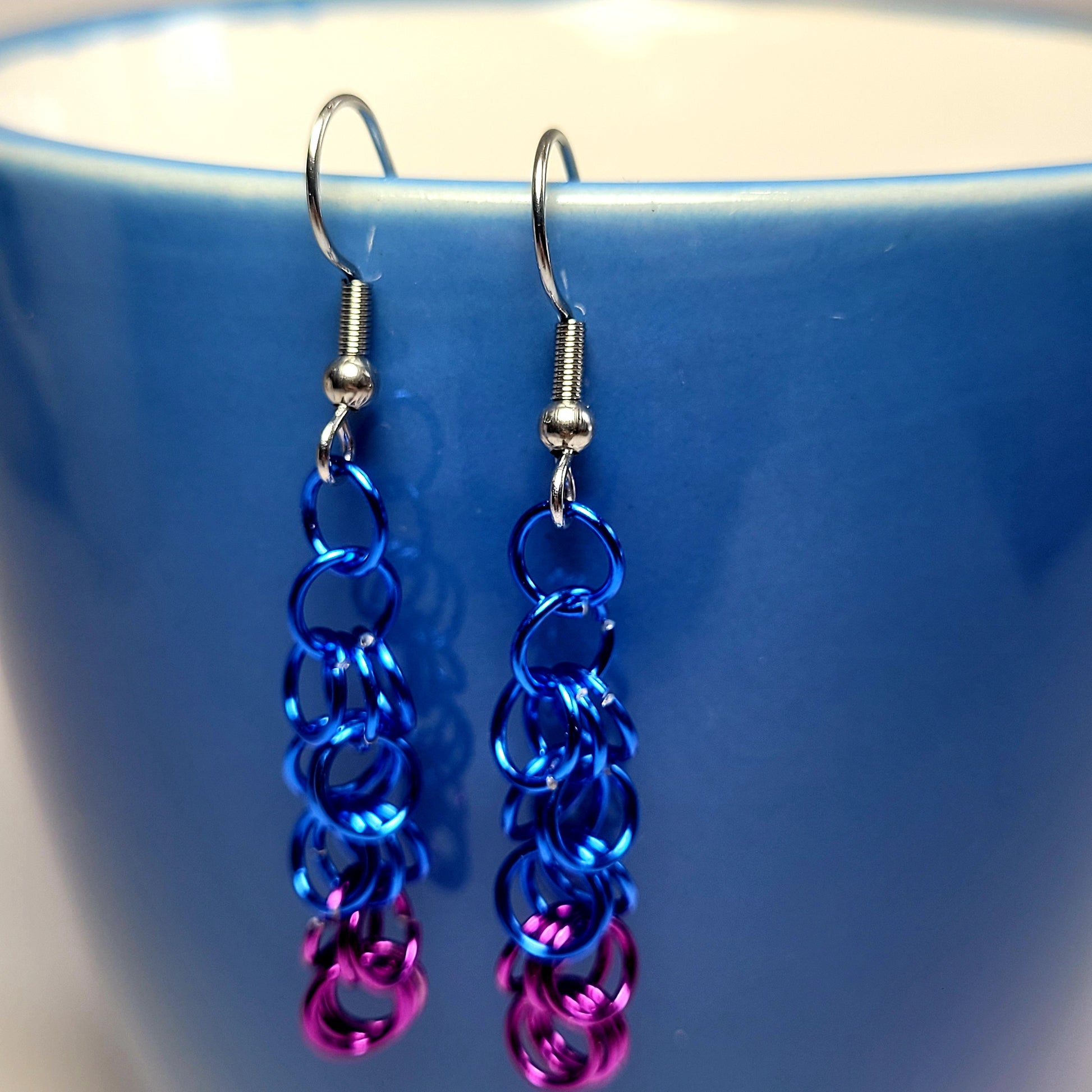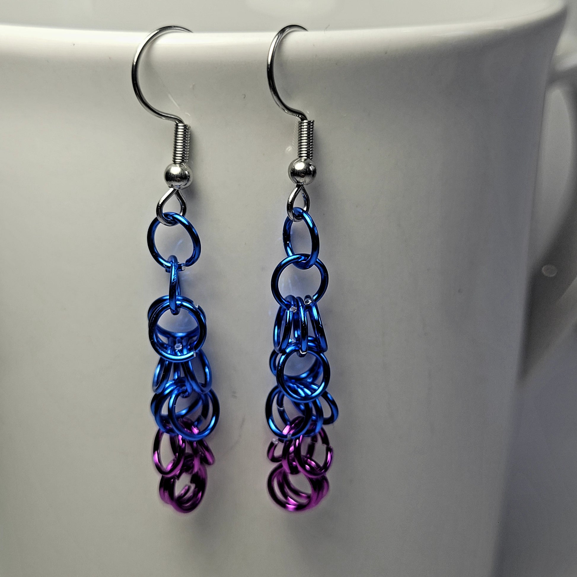 Handmade chainmail purple and blue earrings. Hand woven one ring at a time, this jewelry is sure to turn heads!
