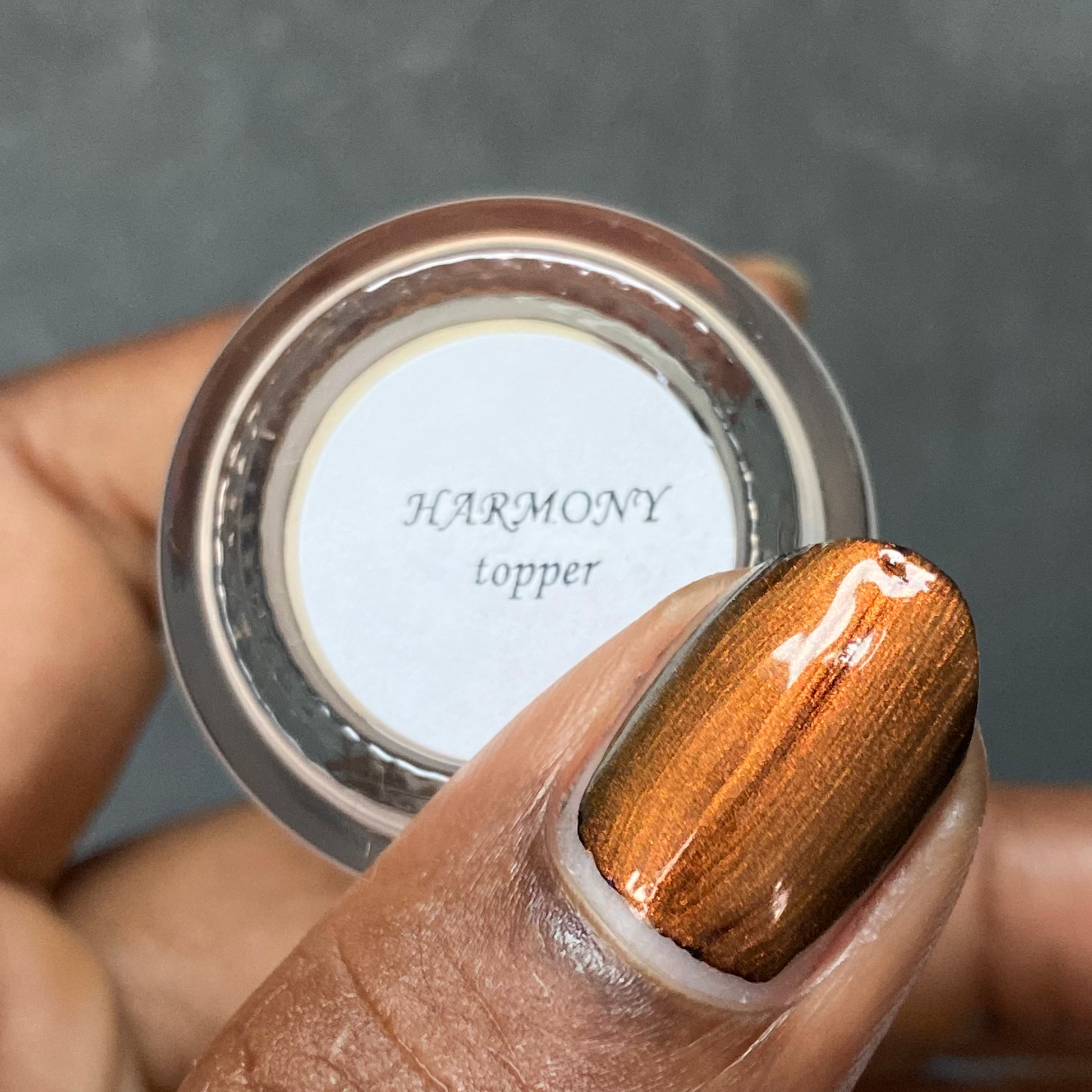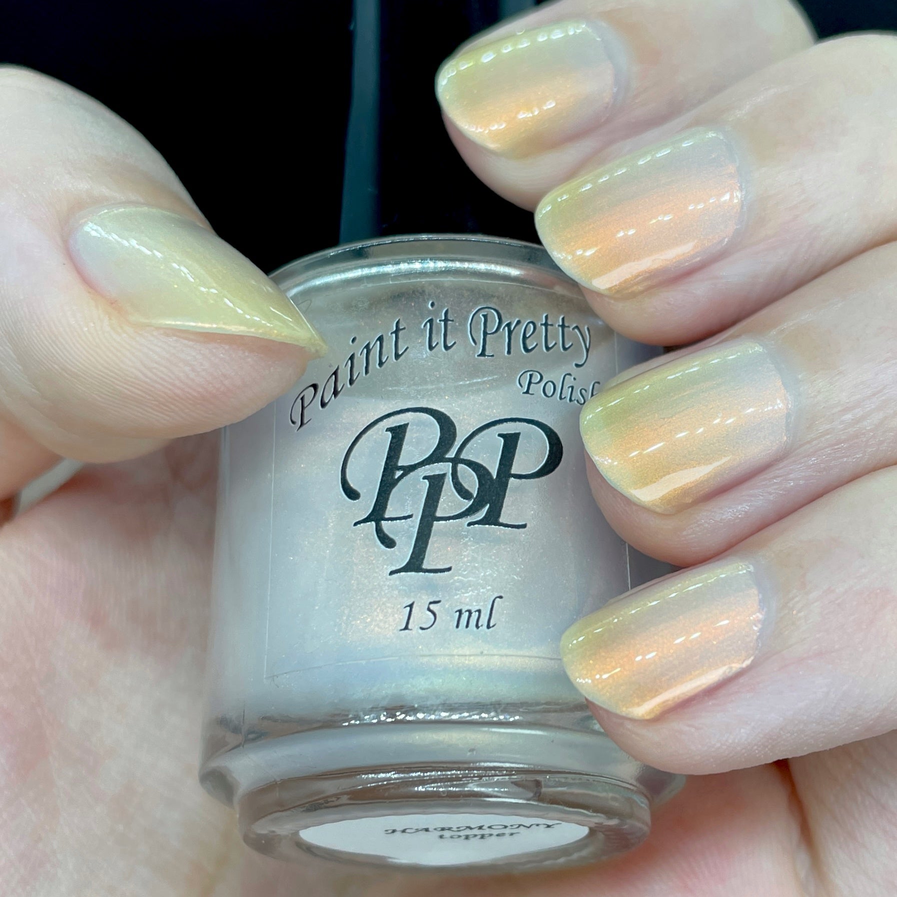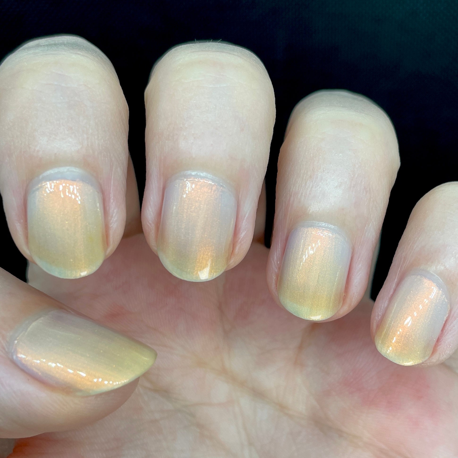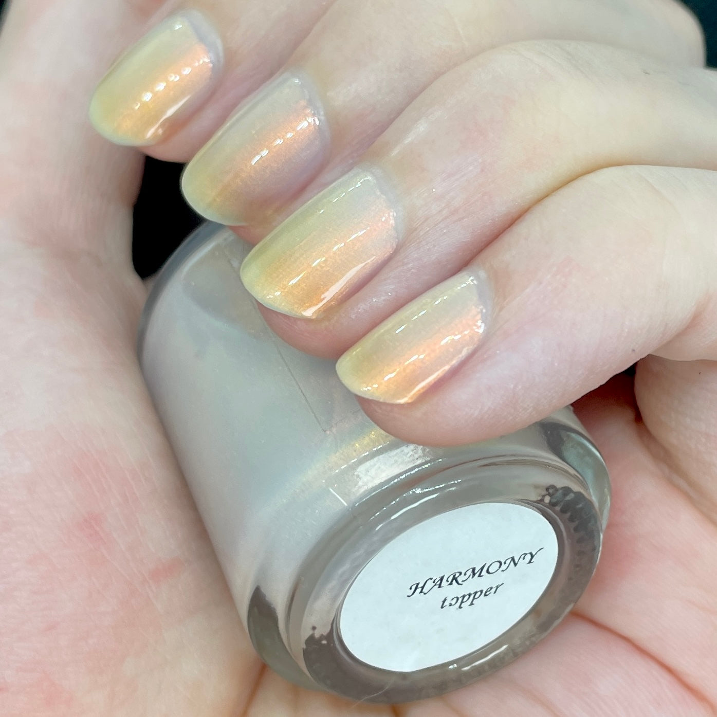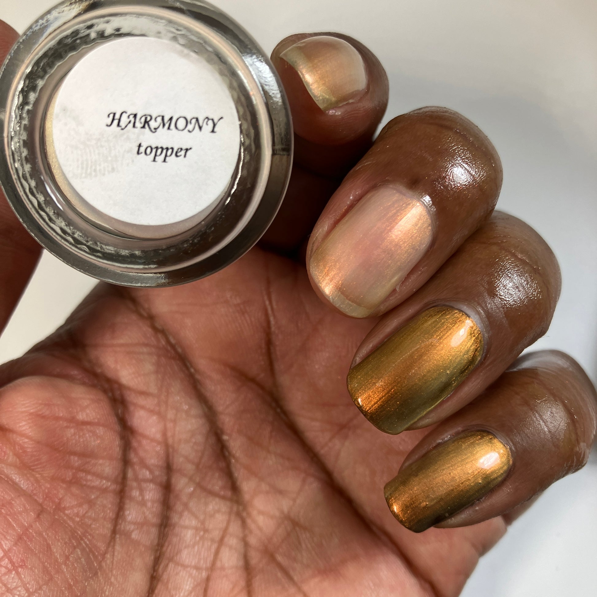 Harmony is beautiful orange/yellow shifting topper. Wear it on it's own for a soft milky shimmer effect or over darker shades to make the shifts pop.