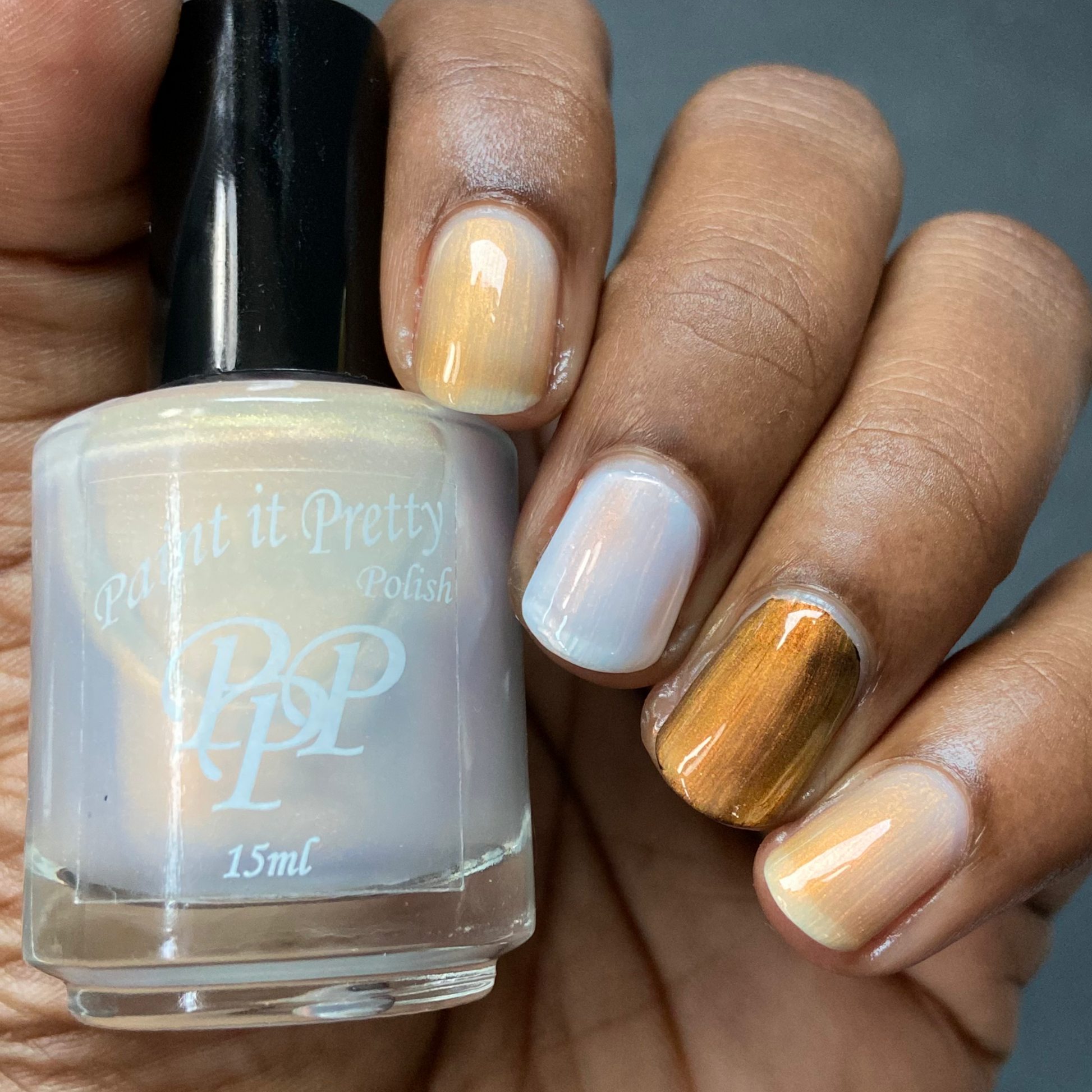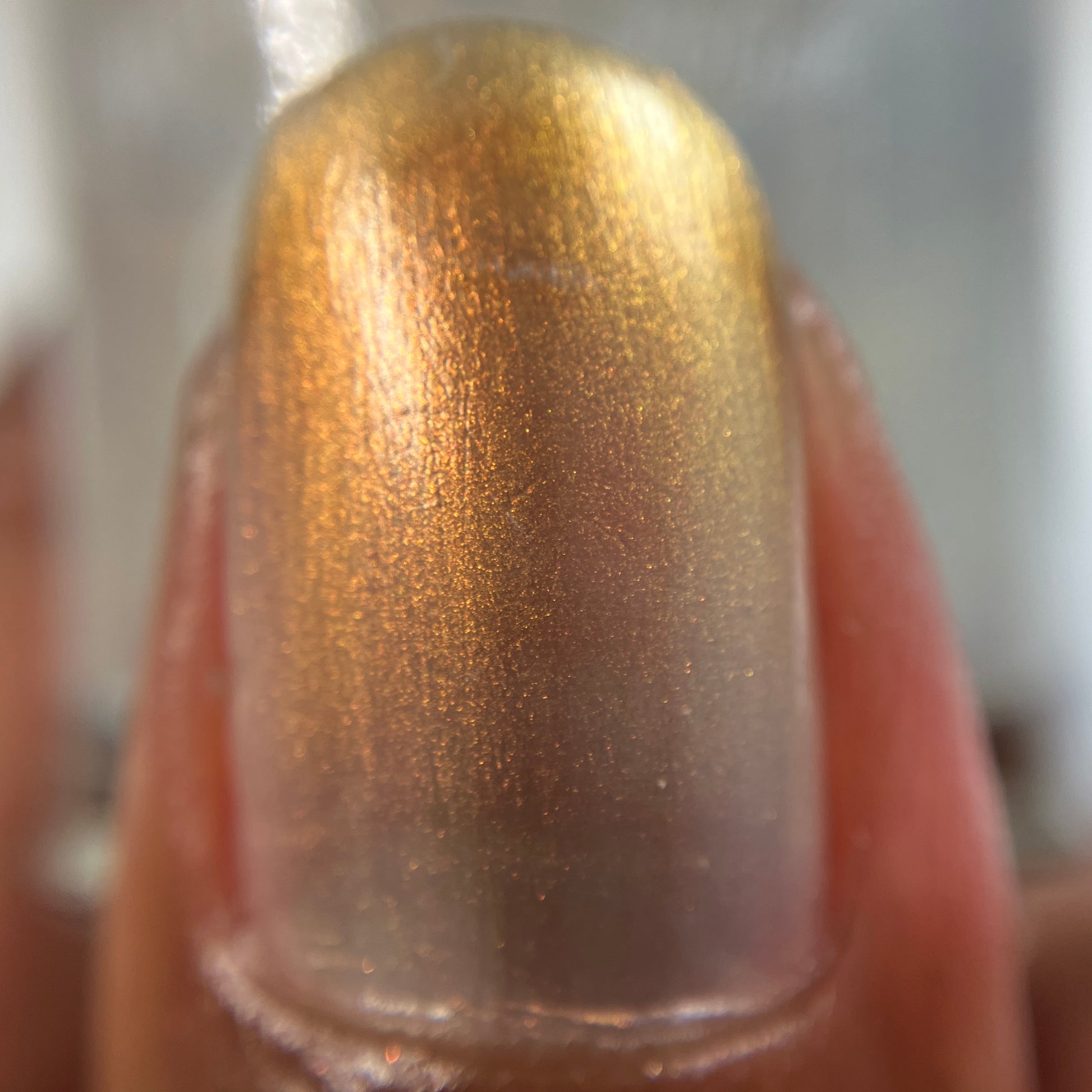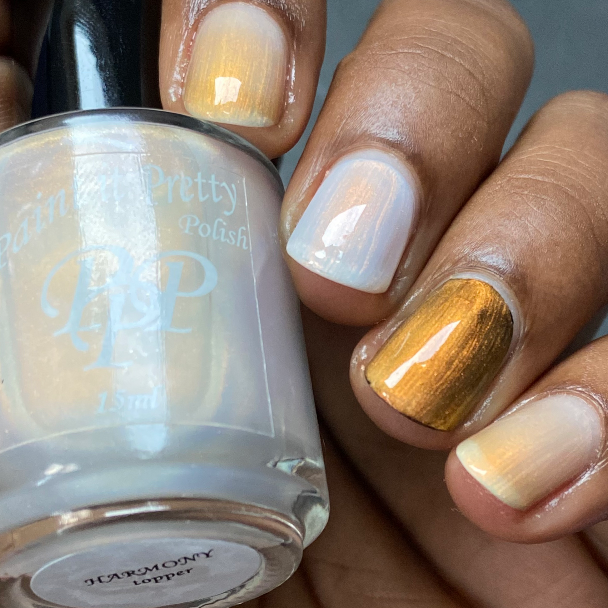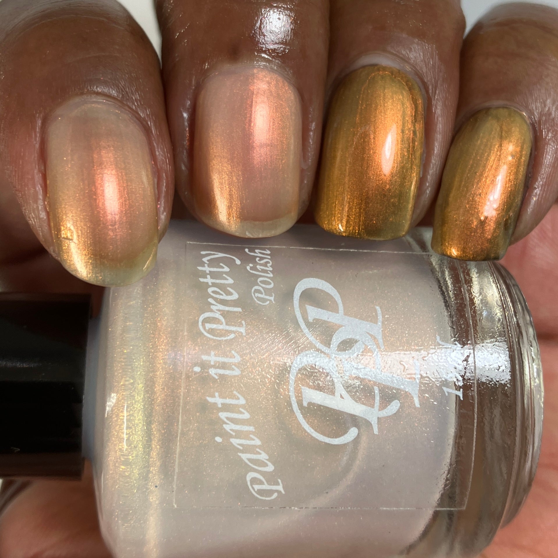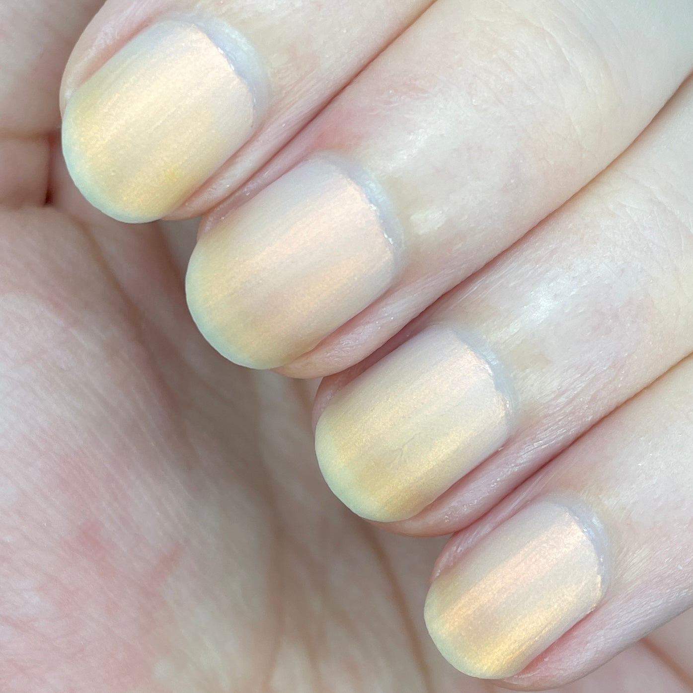 Harmony is beautiful orange/yellow shifting topper. Wear it on it's own for a soft milky shimmer effect or over darker shades to make the shifts pop.