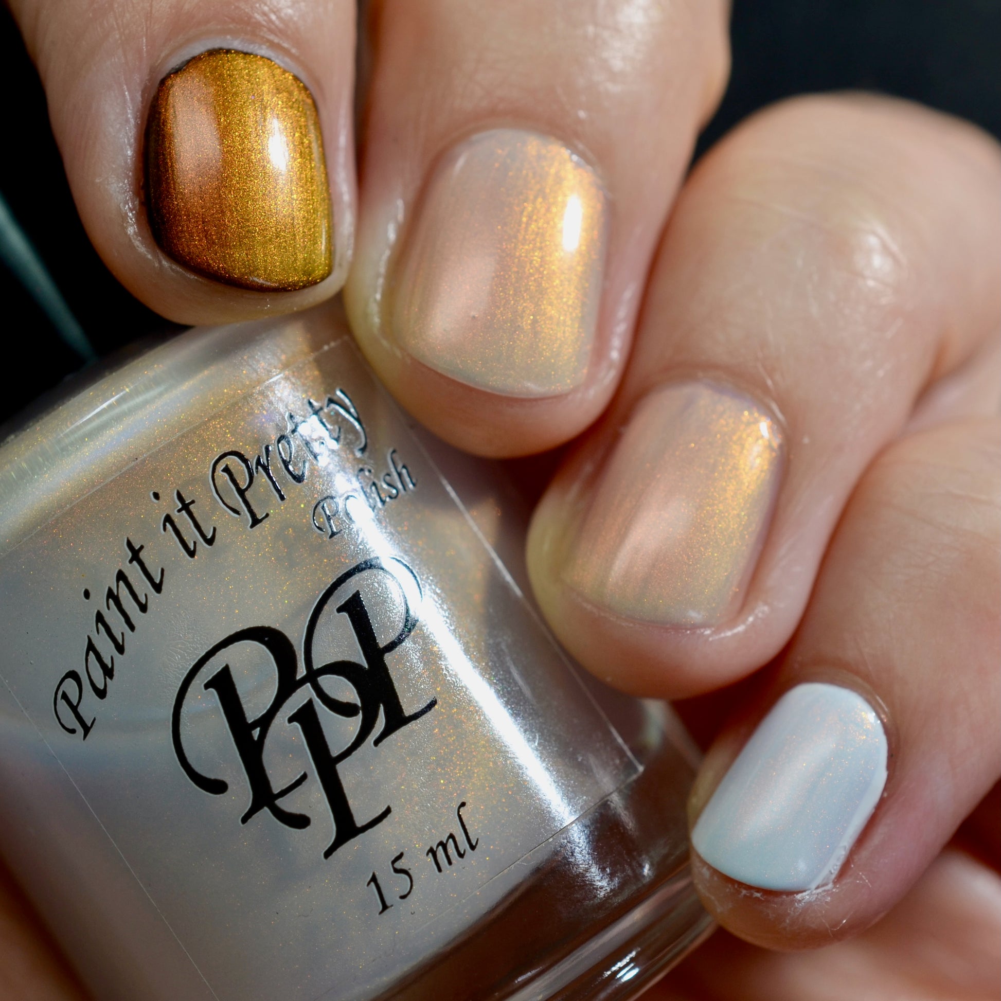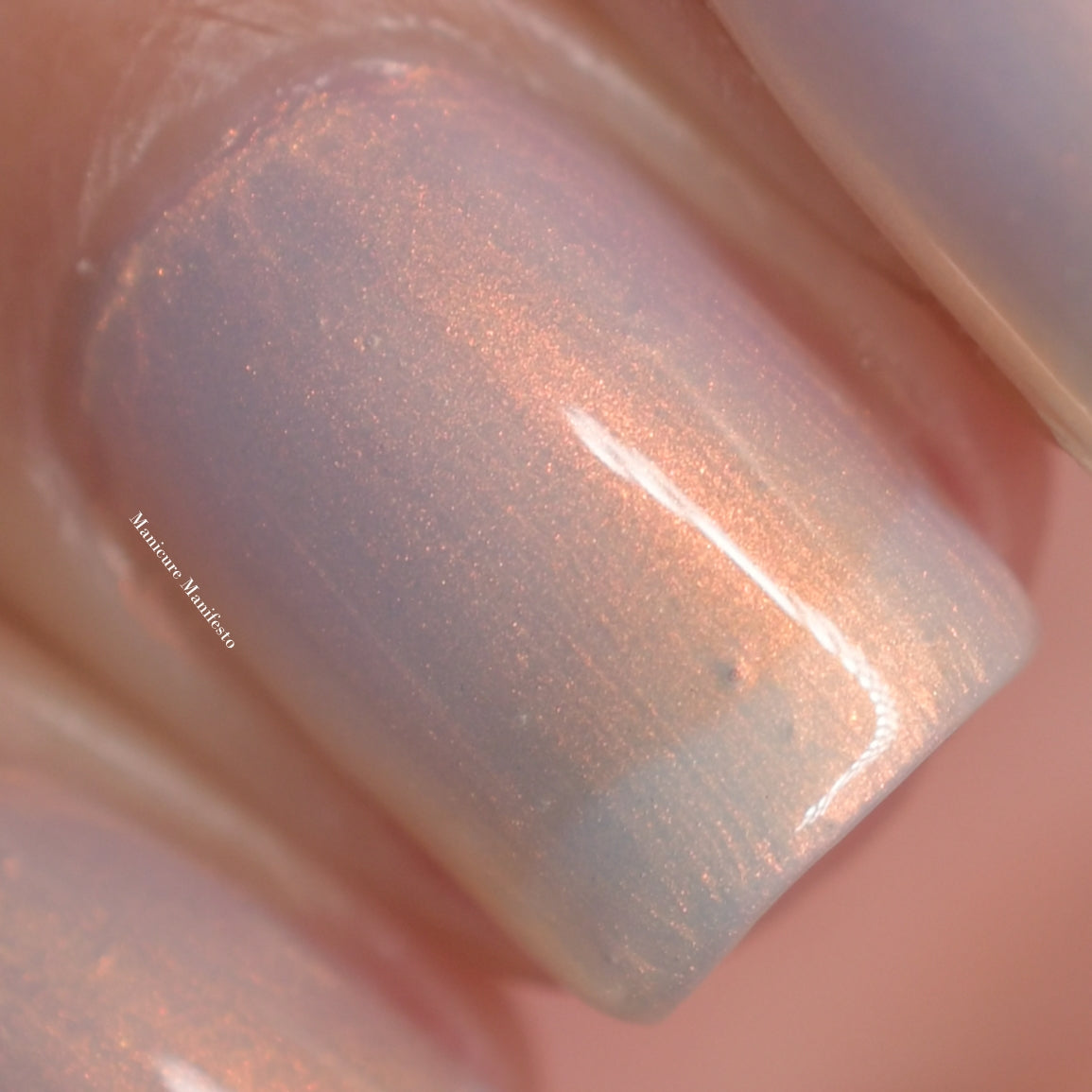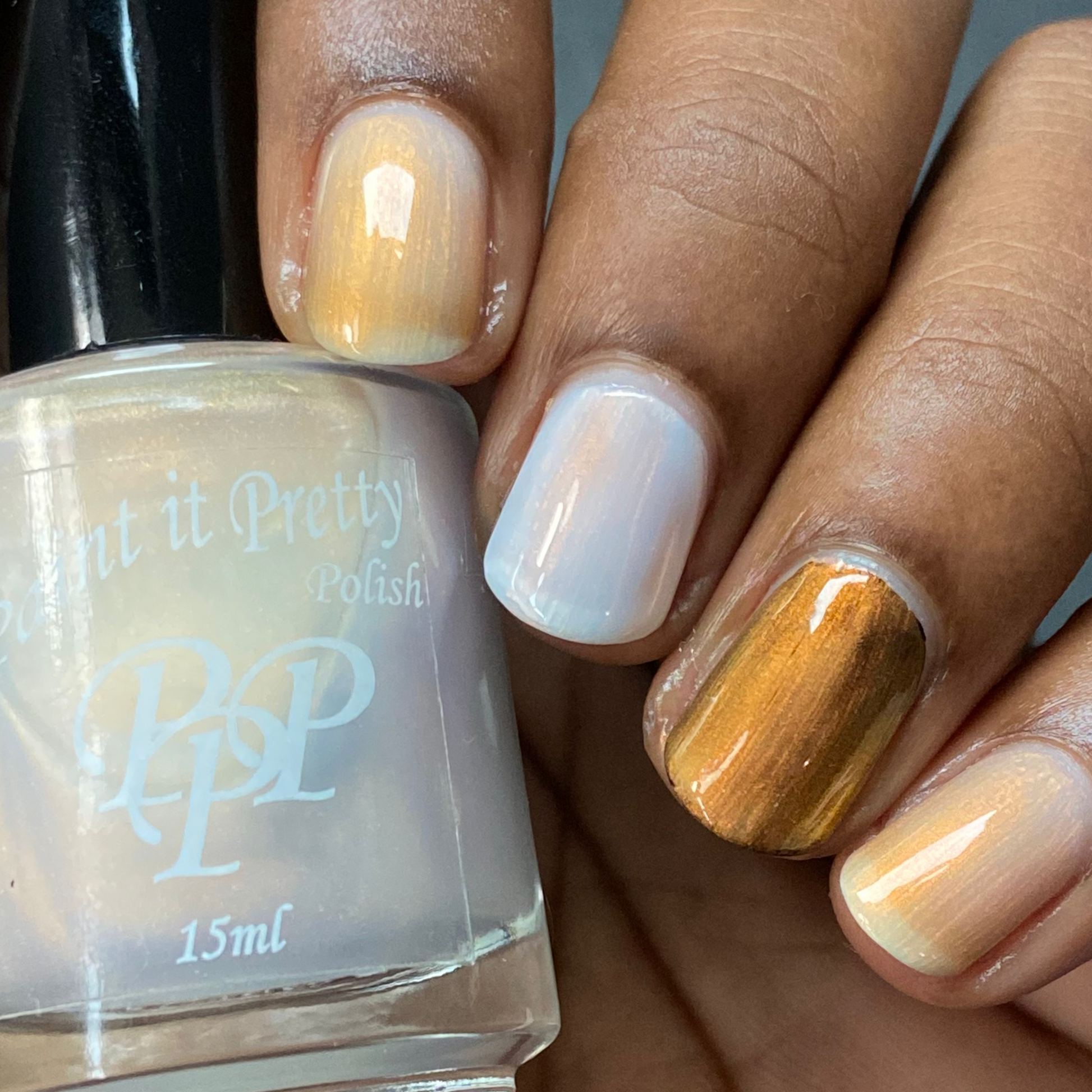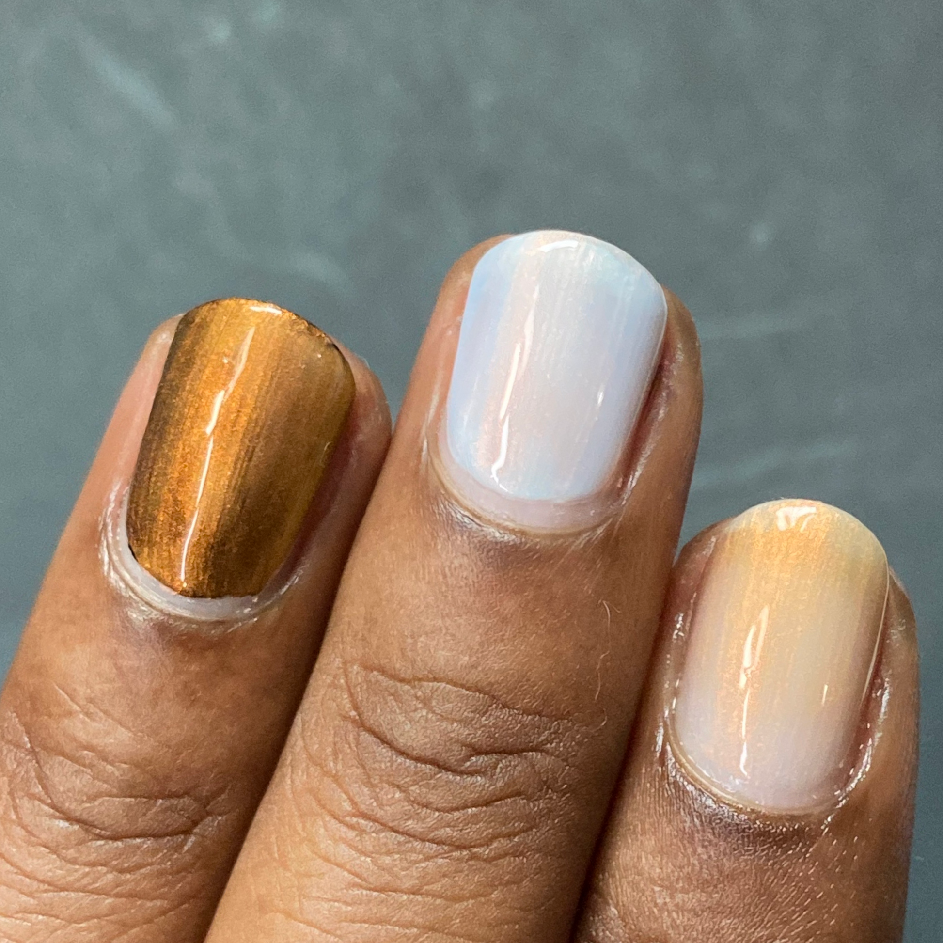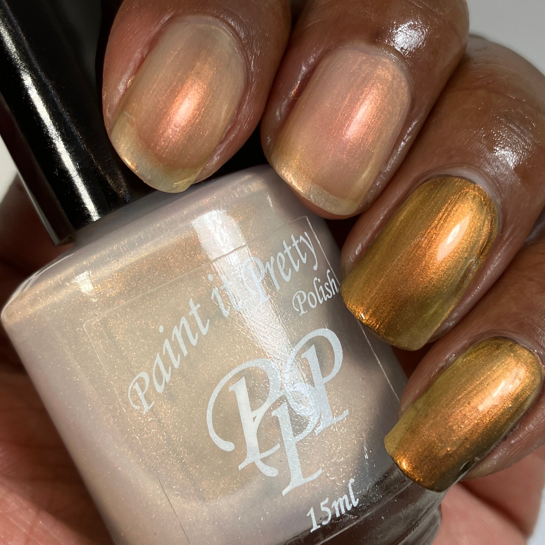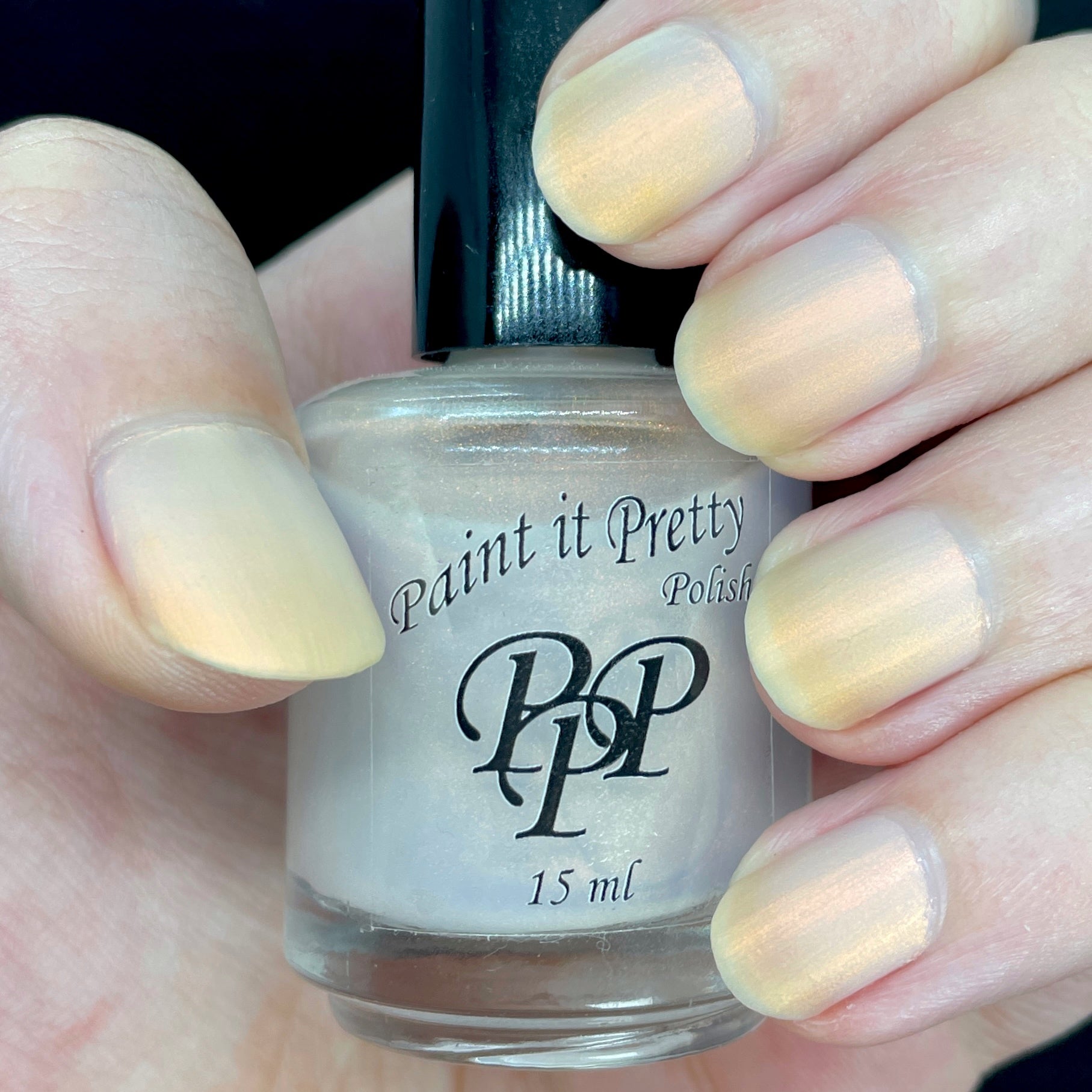 Harmony is beautiful orange/yellow shifting topper. Wear it on it's own for a soft milky shimmer effect or over darker shades to make the shifts pop.