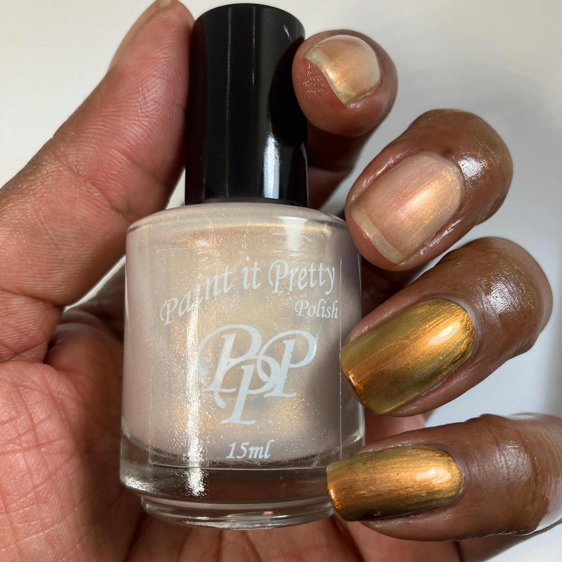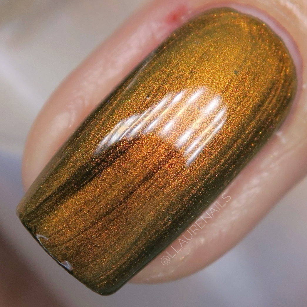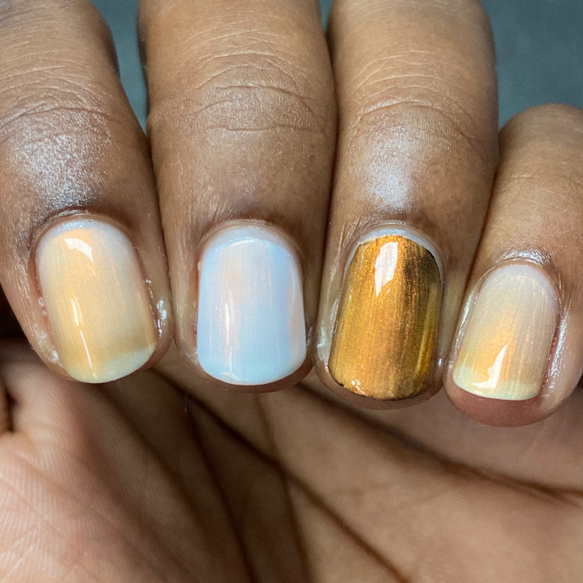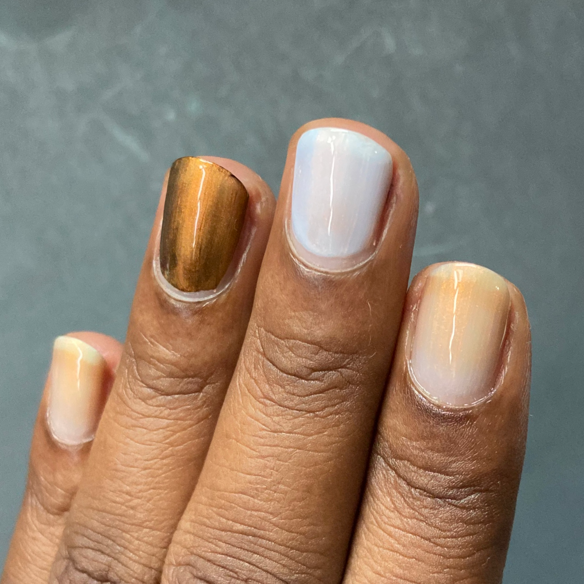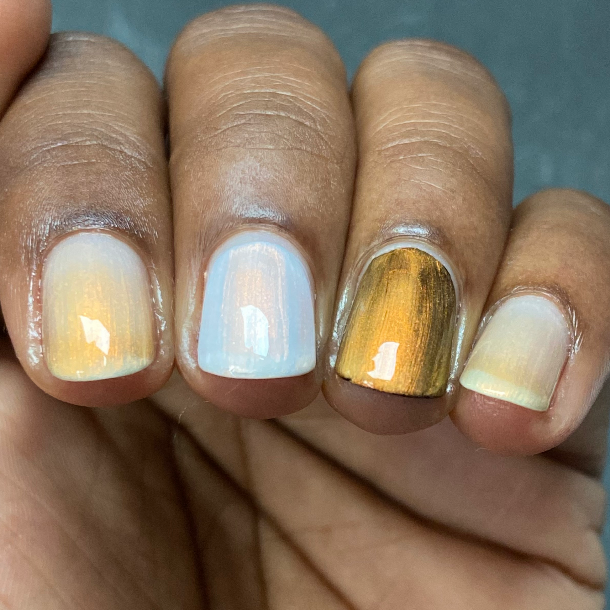 Harmony is beautiful orange/yellow shifting topper. Wear it on it's own for a soft milky shimmer effect or over darker shades to make the shifts pop.
