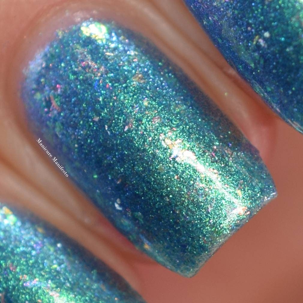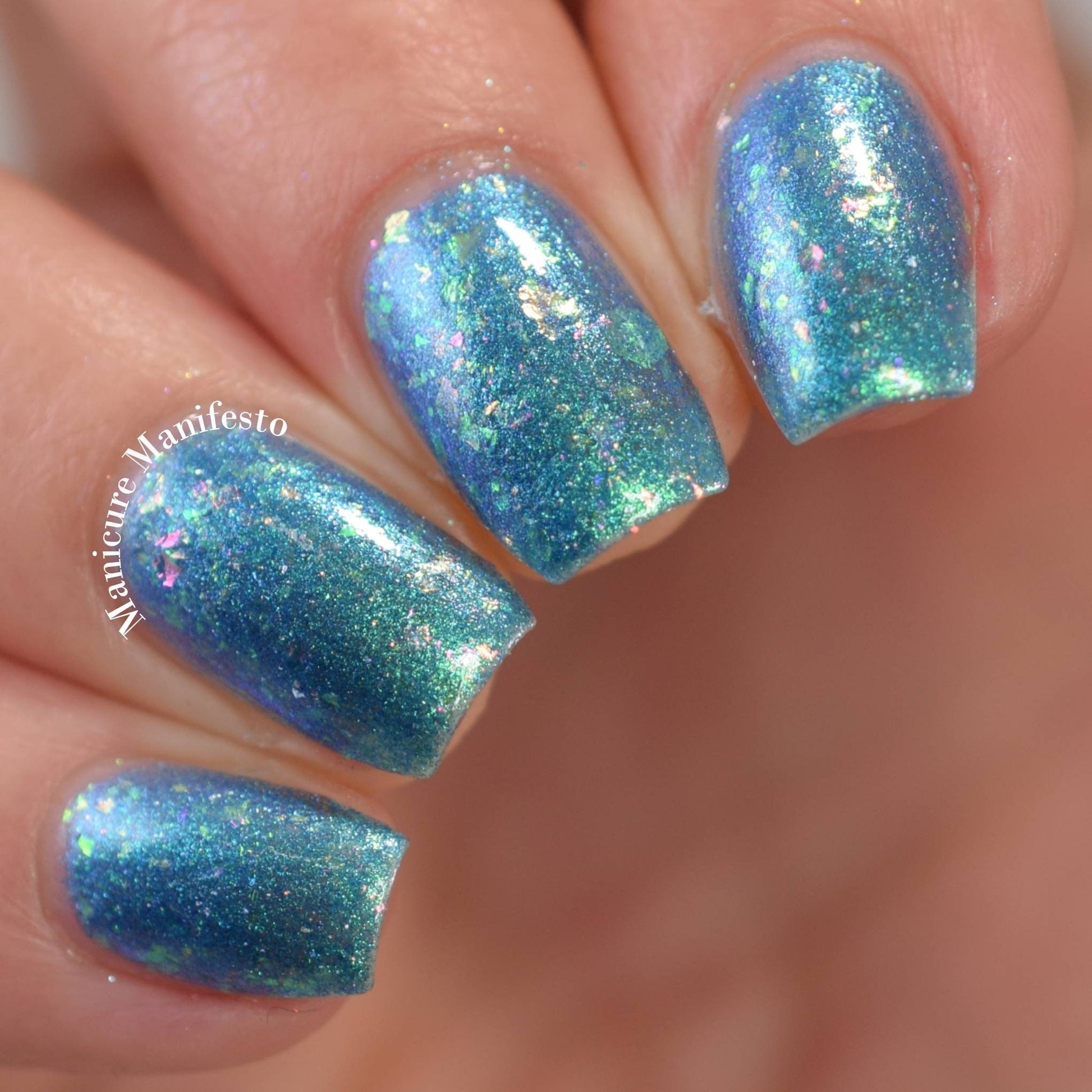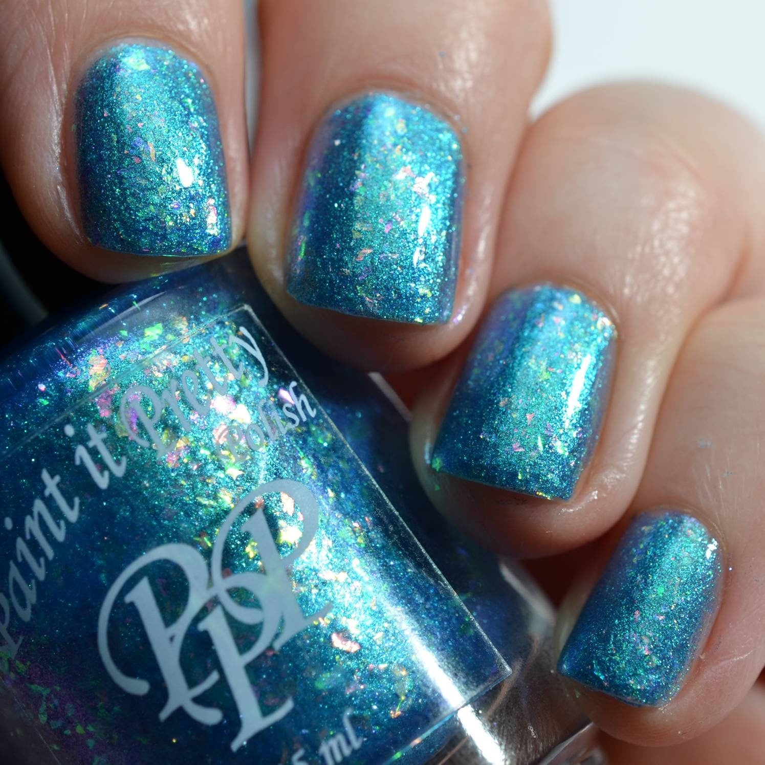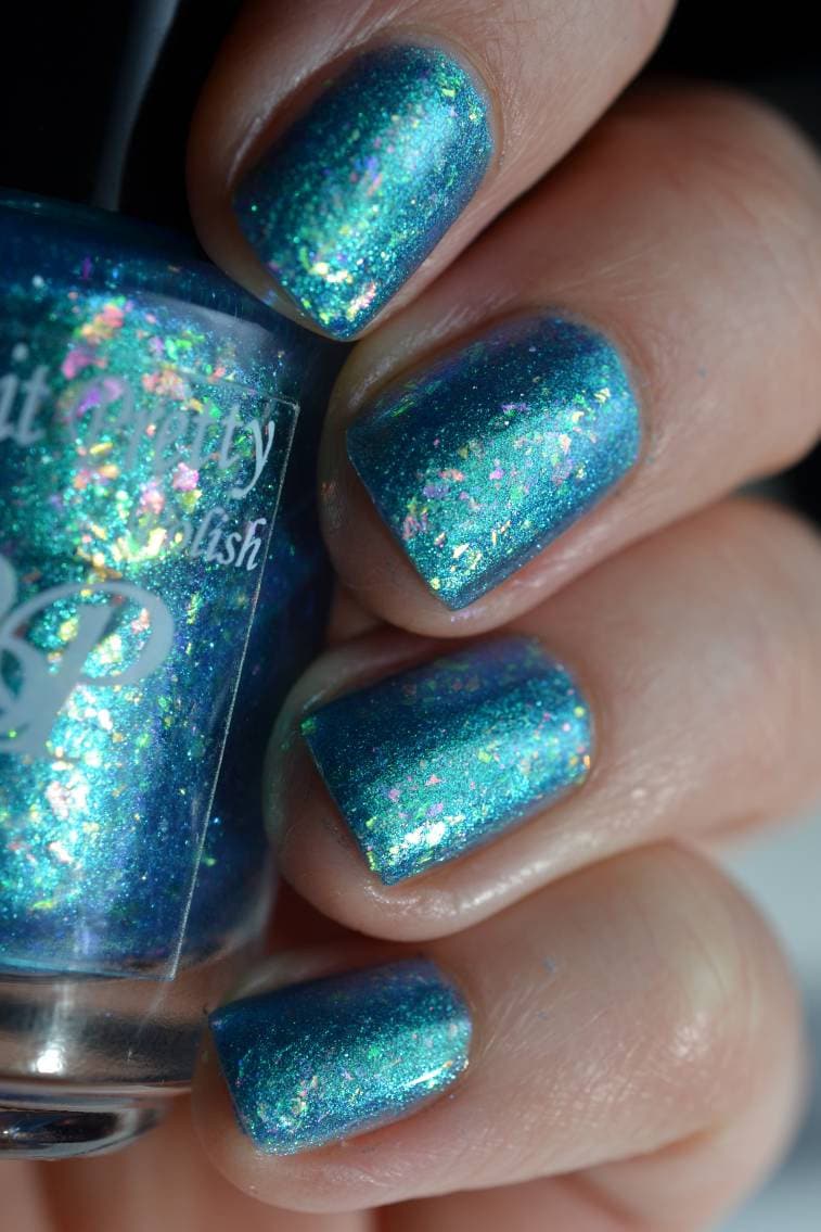 I Wasn't Made For Winter is a turquoise blue with pink, orange, yellow, green flakies and holo flakes