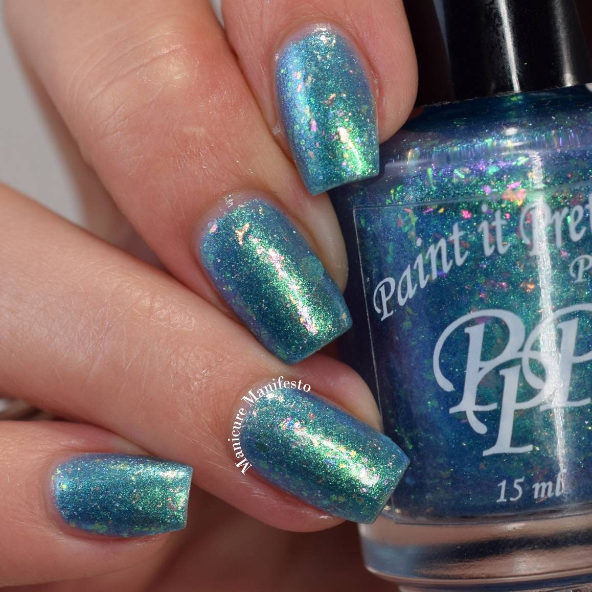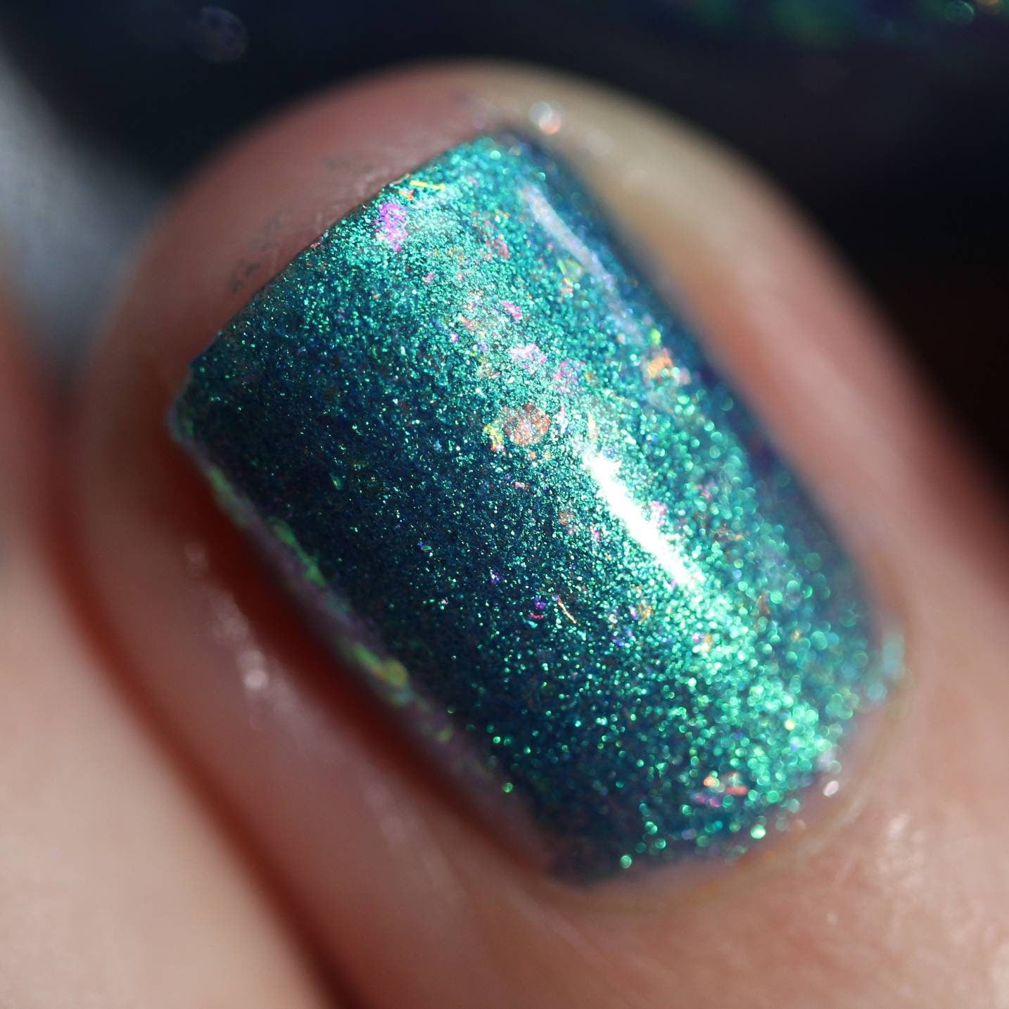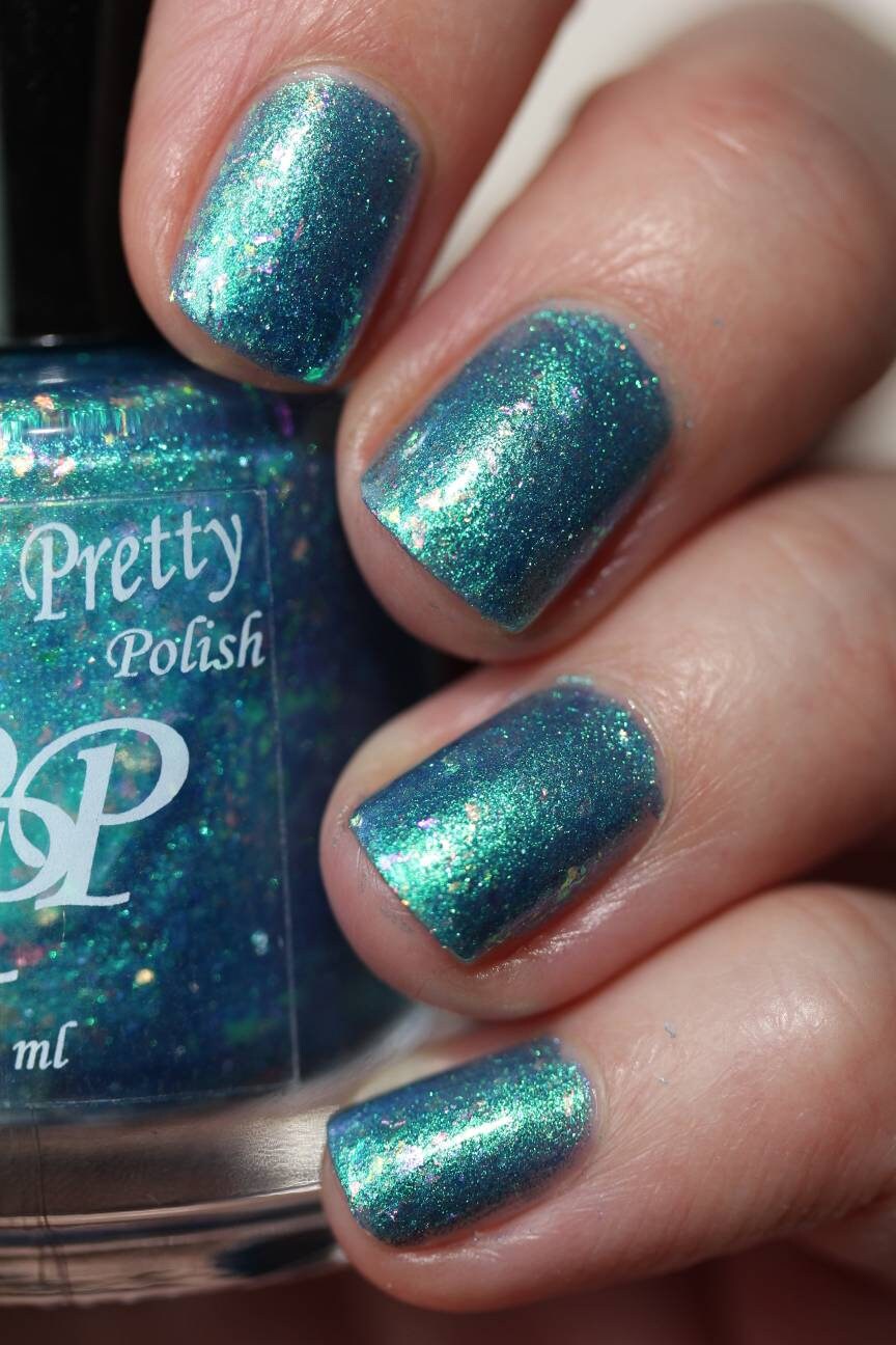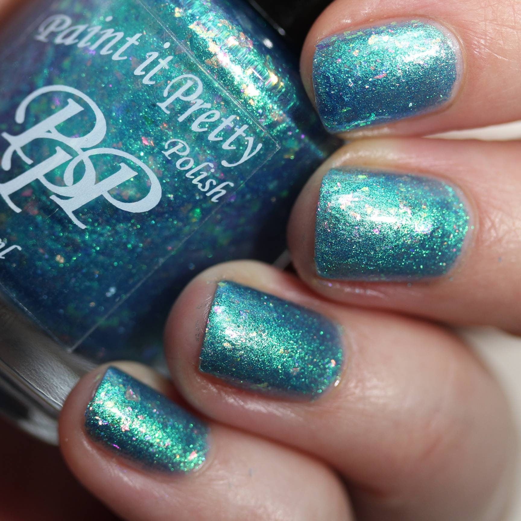 I Wasn't Made For Winter is a turquoise blue with pink, orange, yellow, green flakies and holo flakes