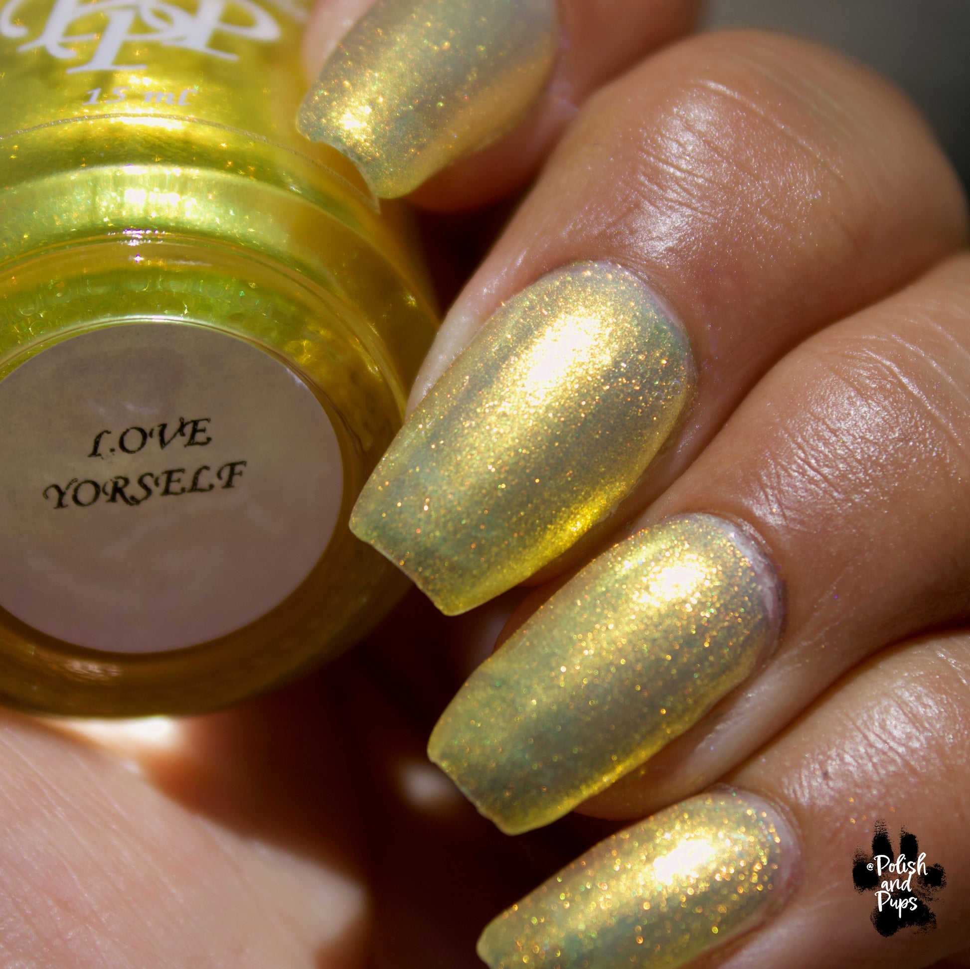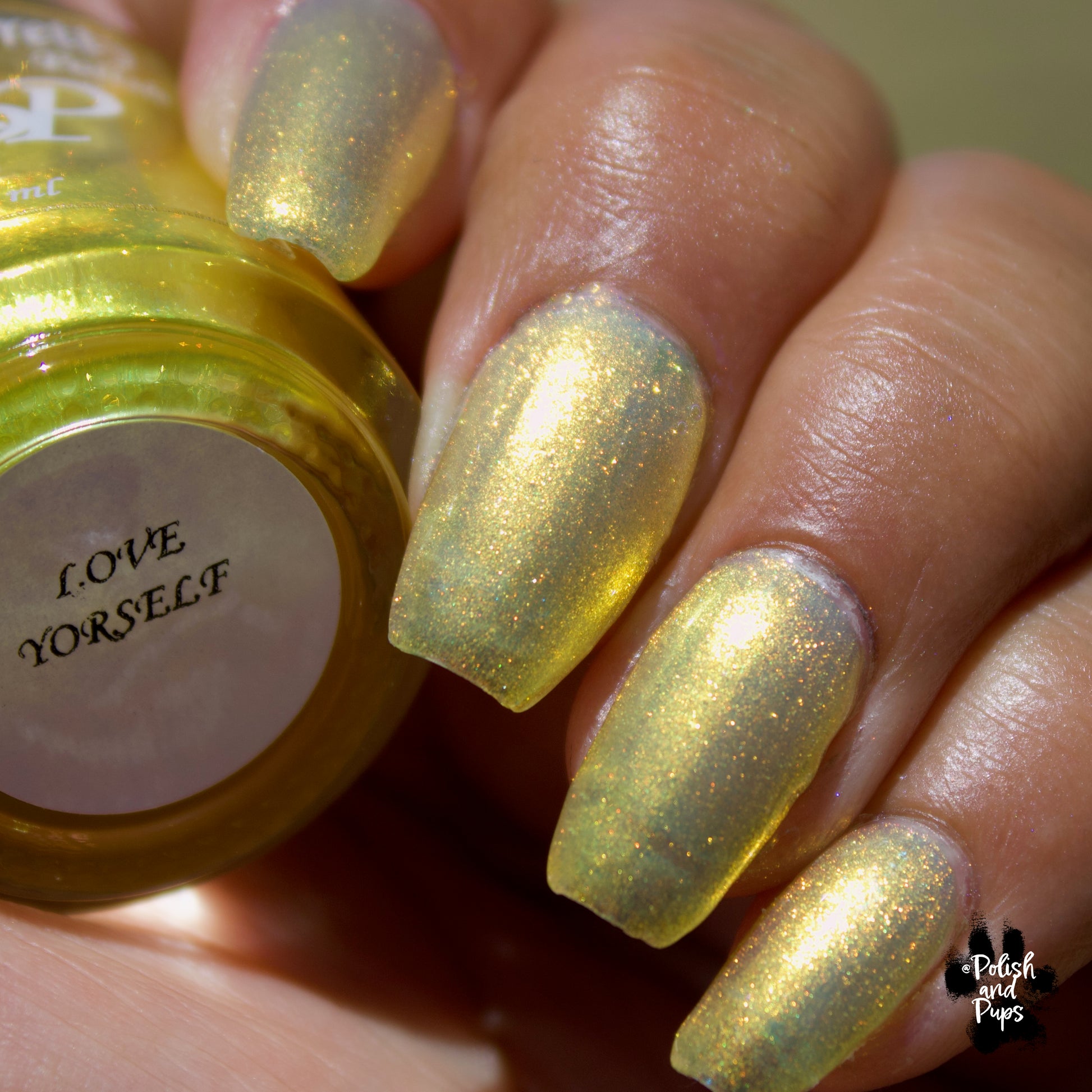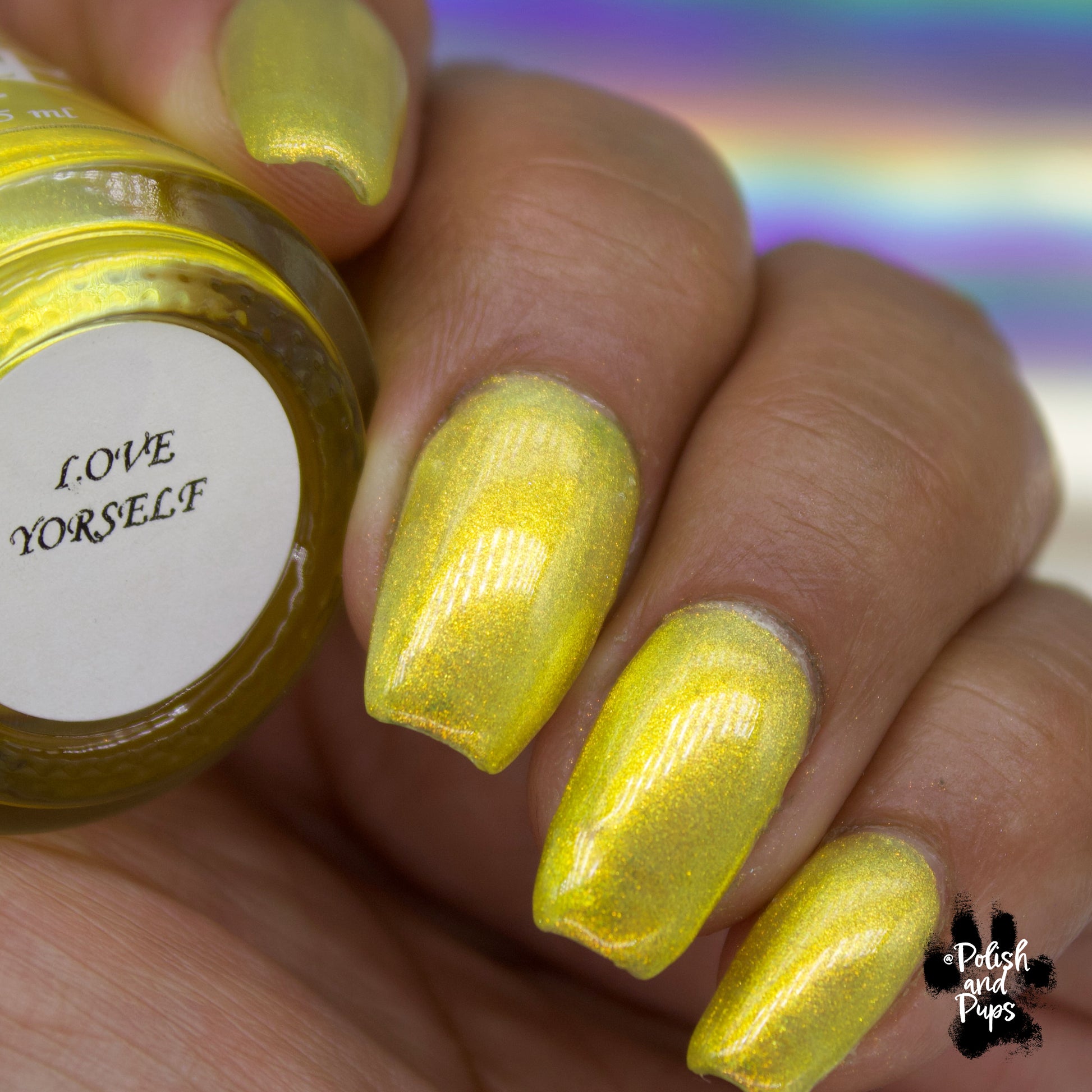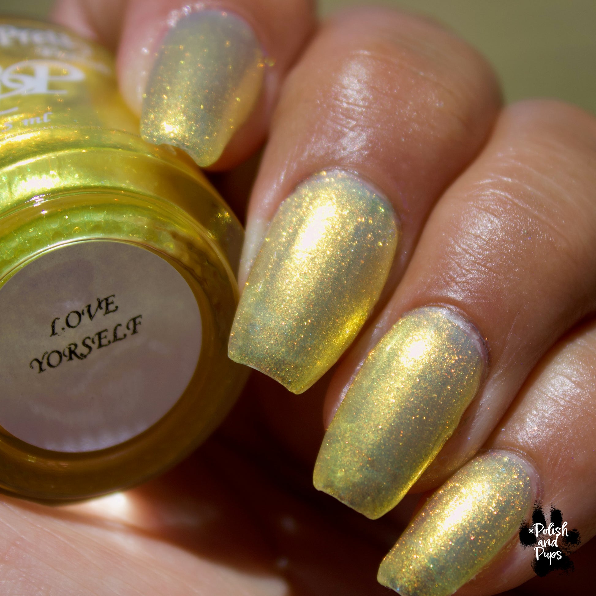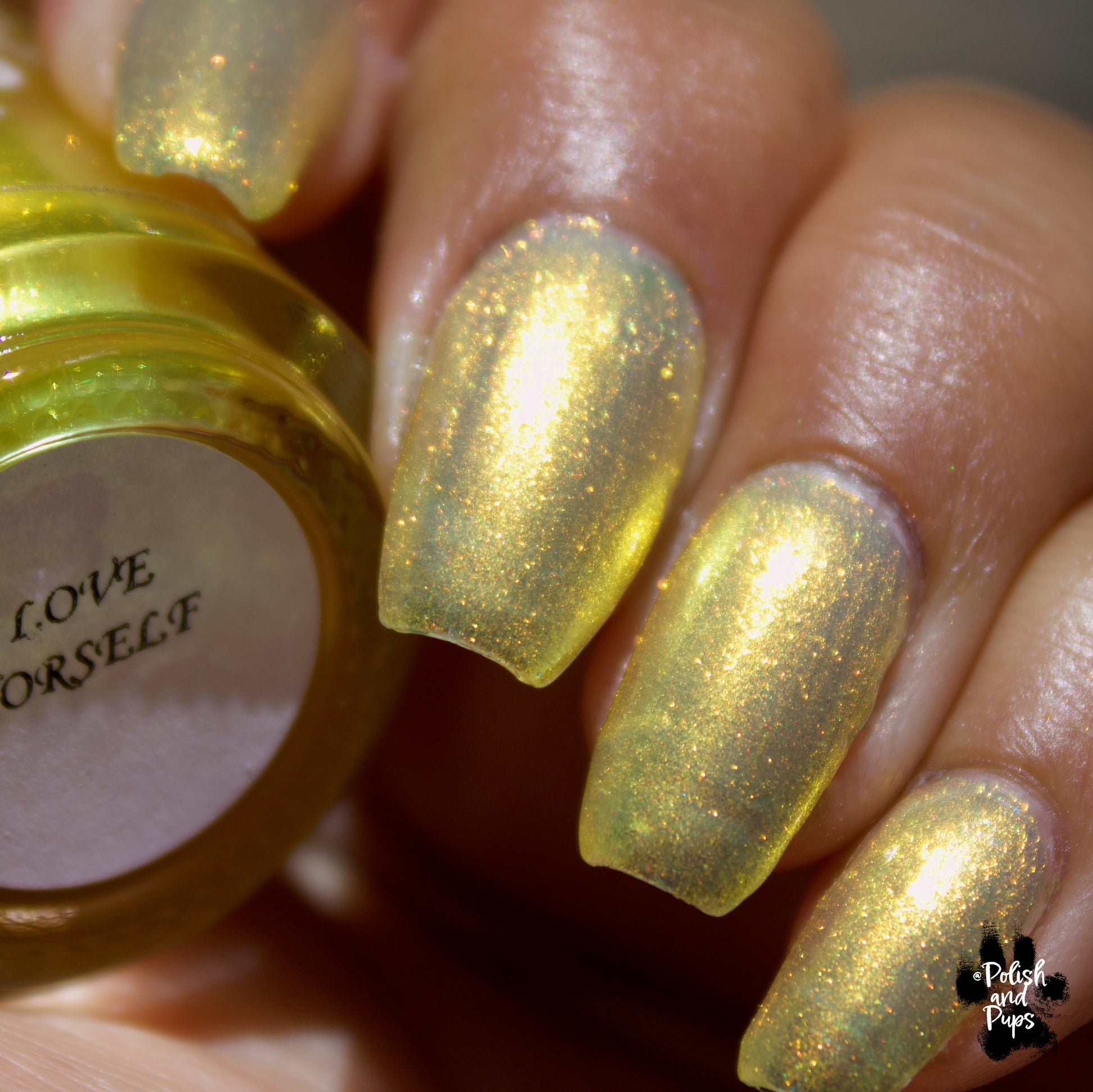 Love Yourself is a yellow base nail polish with a golden aurora shimmer