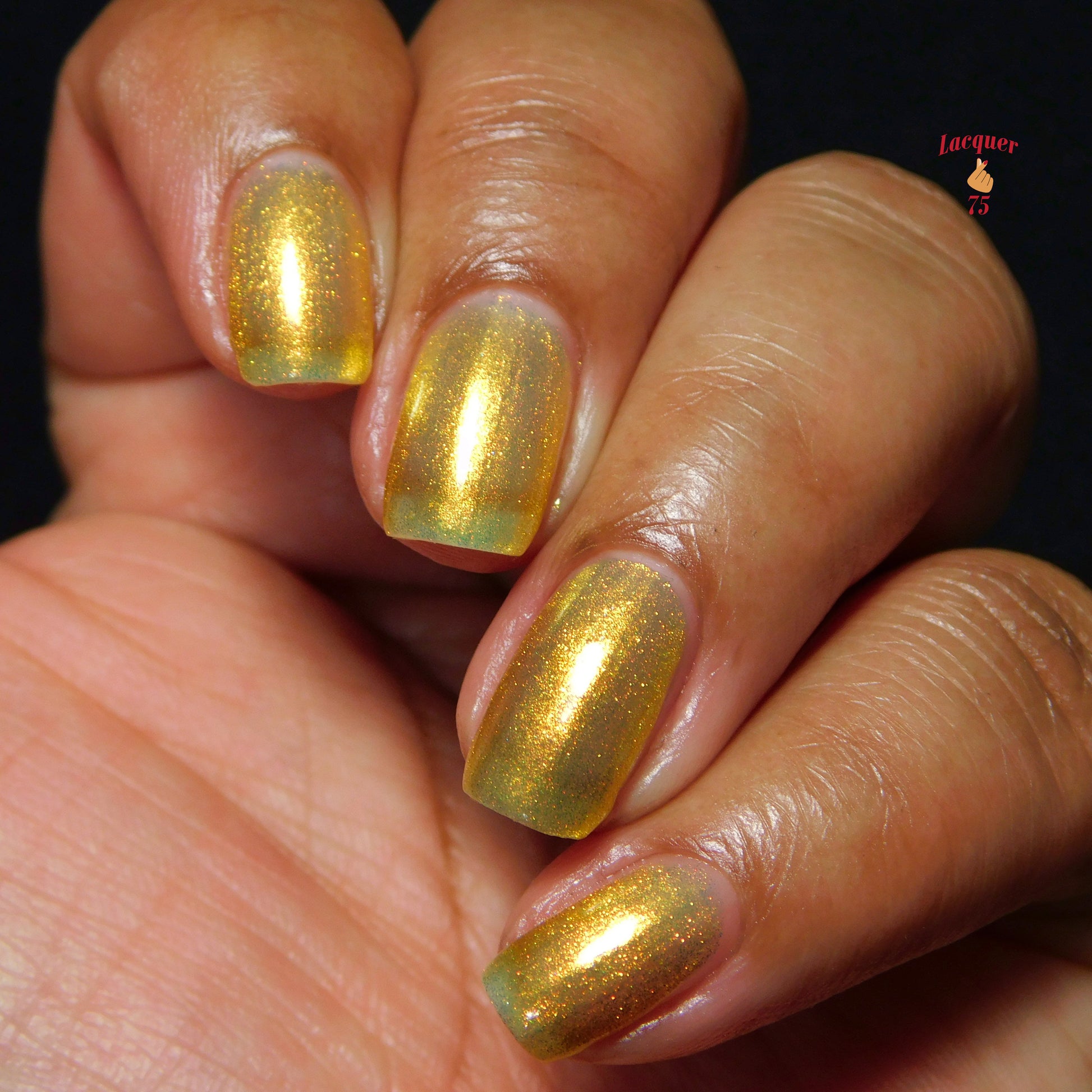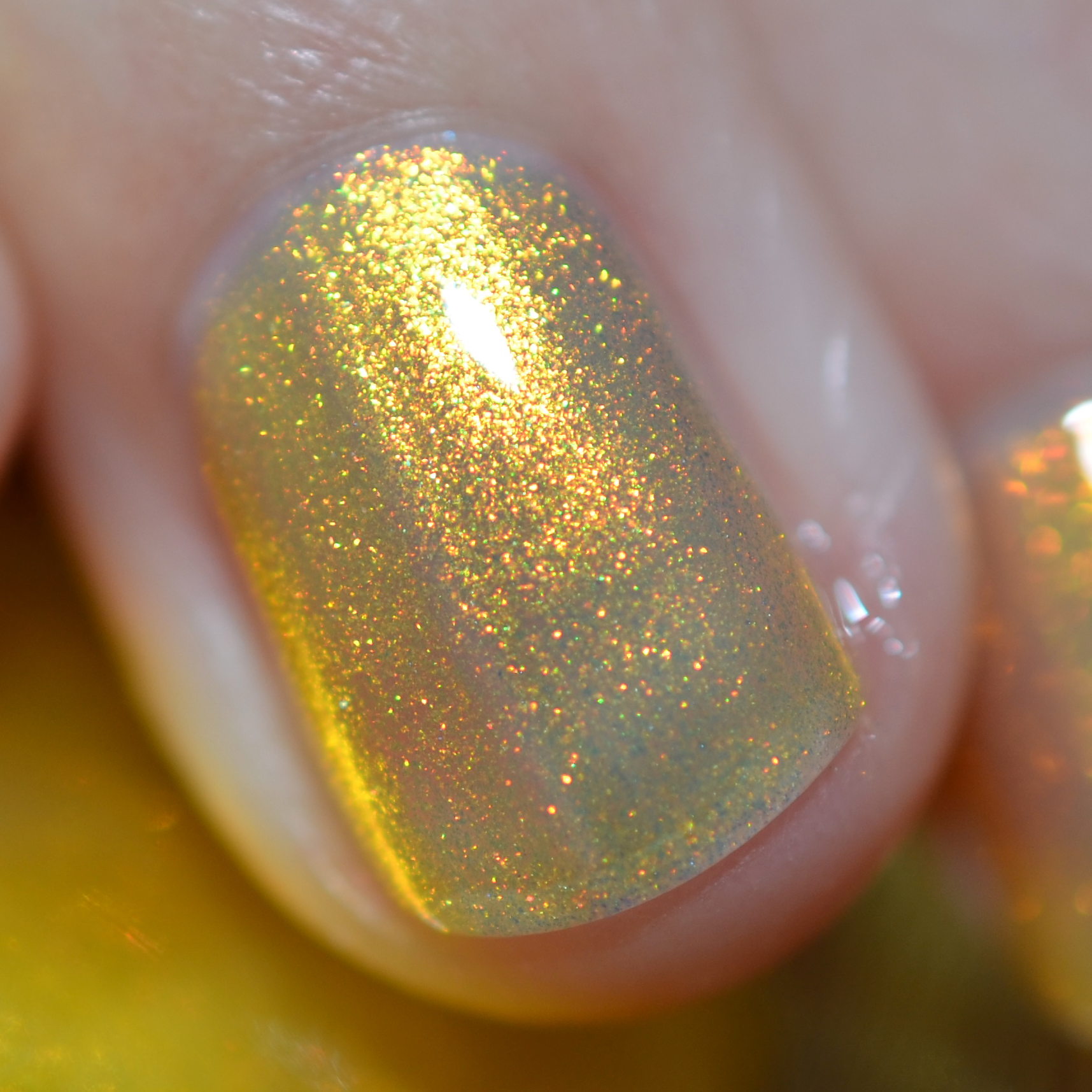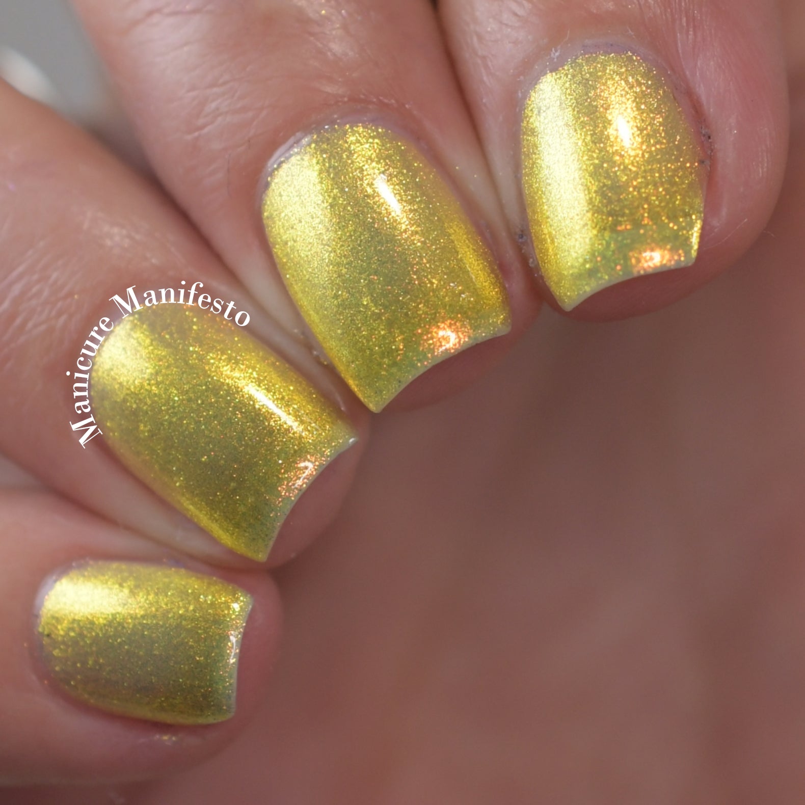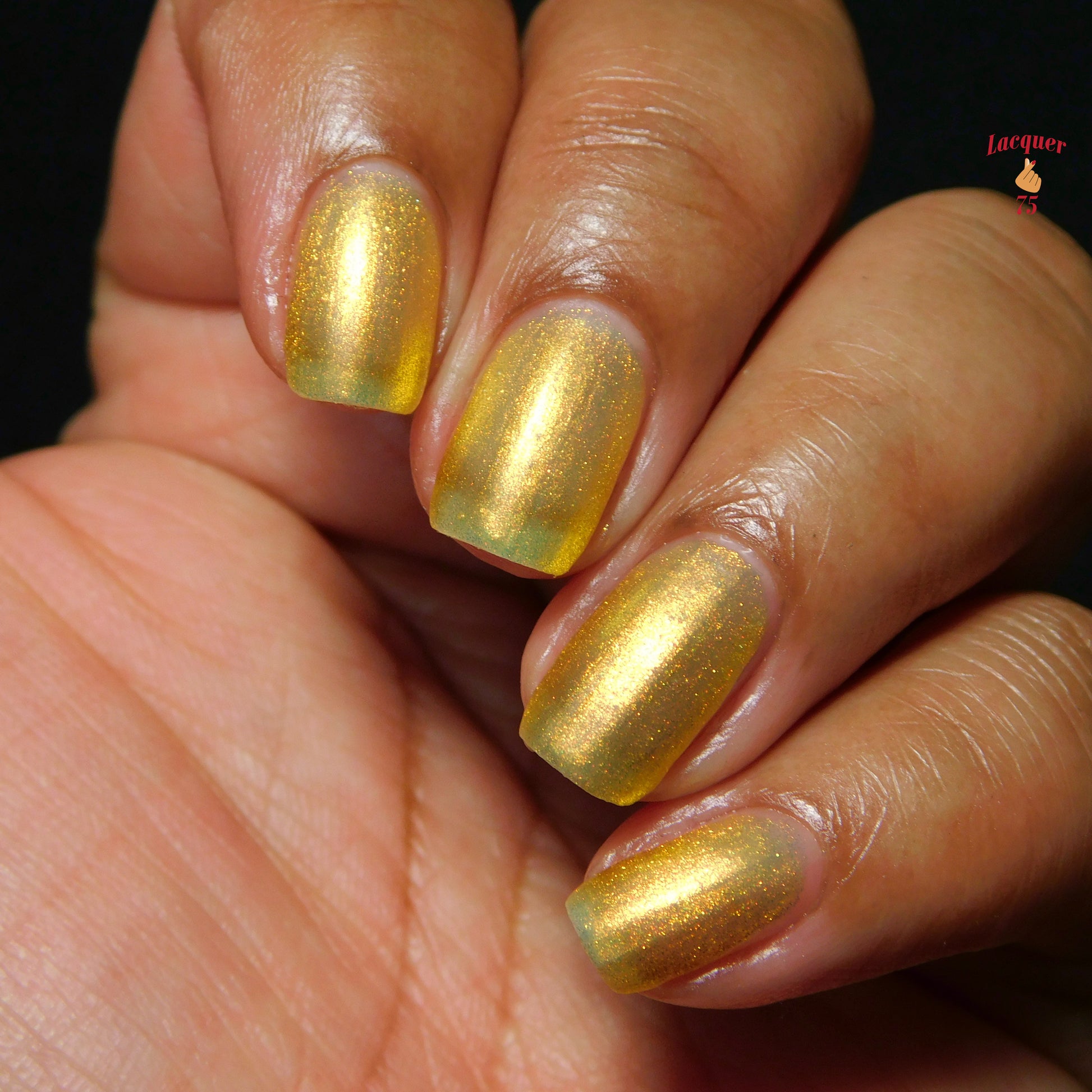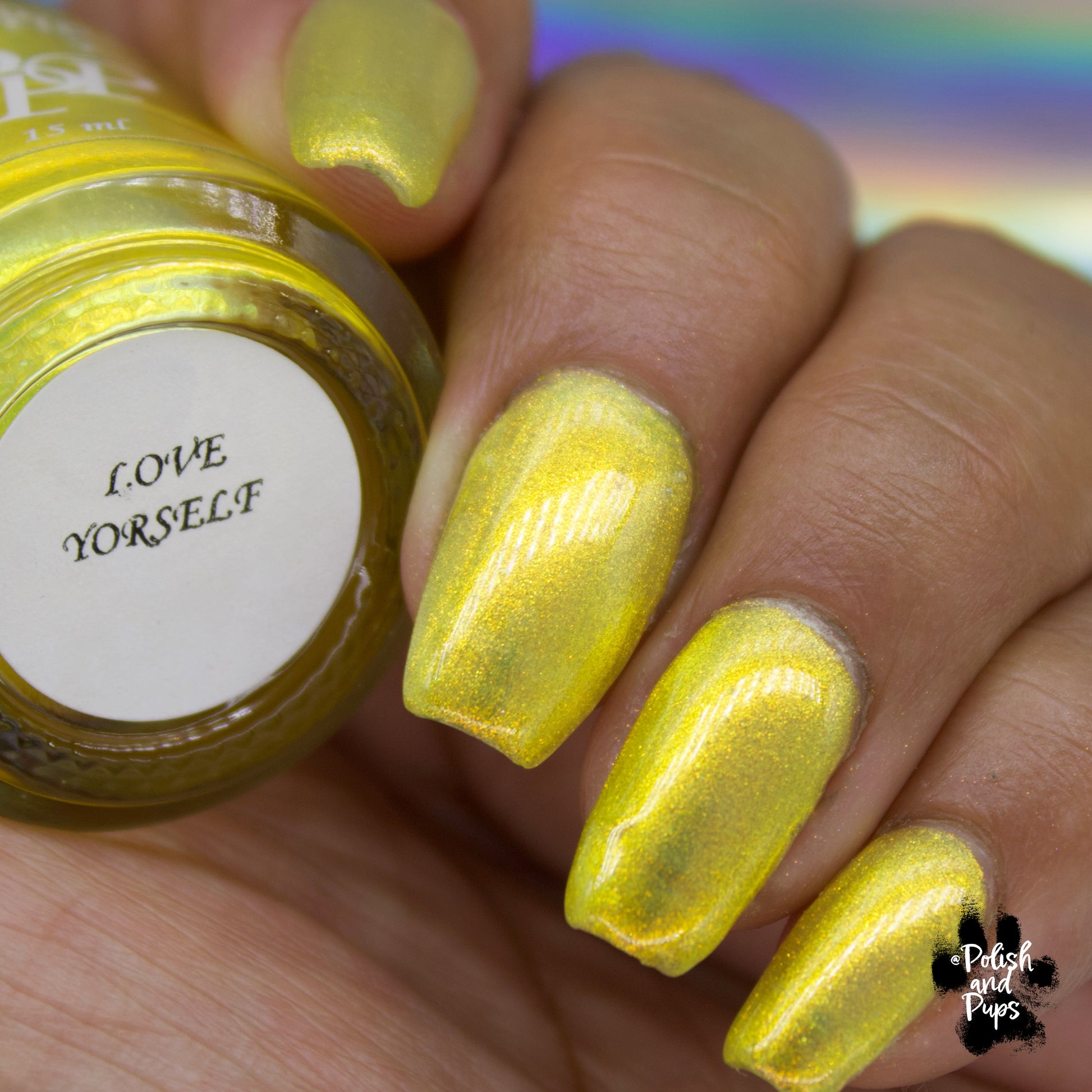 Love Yourself is a yellow base nail polish with a golden aurora shimmer
