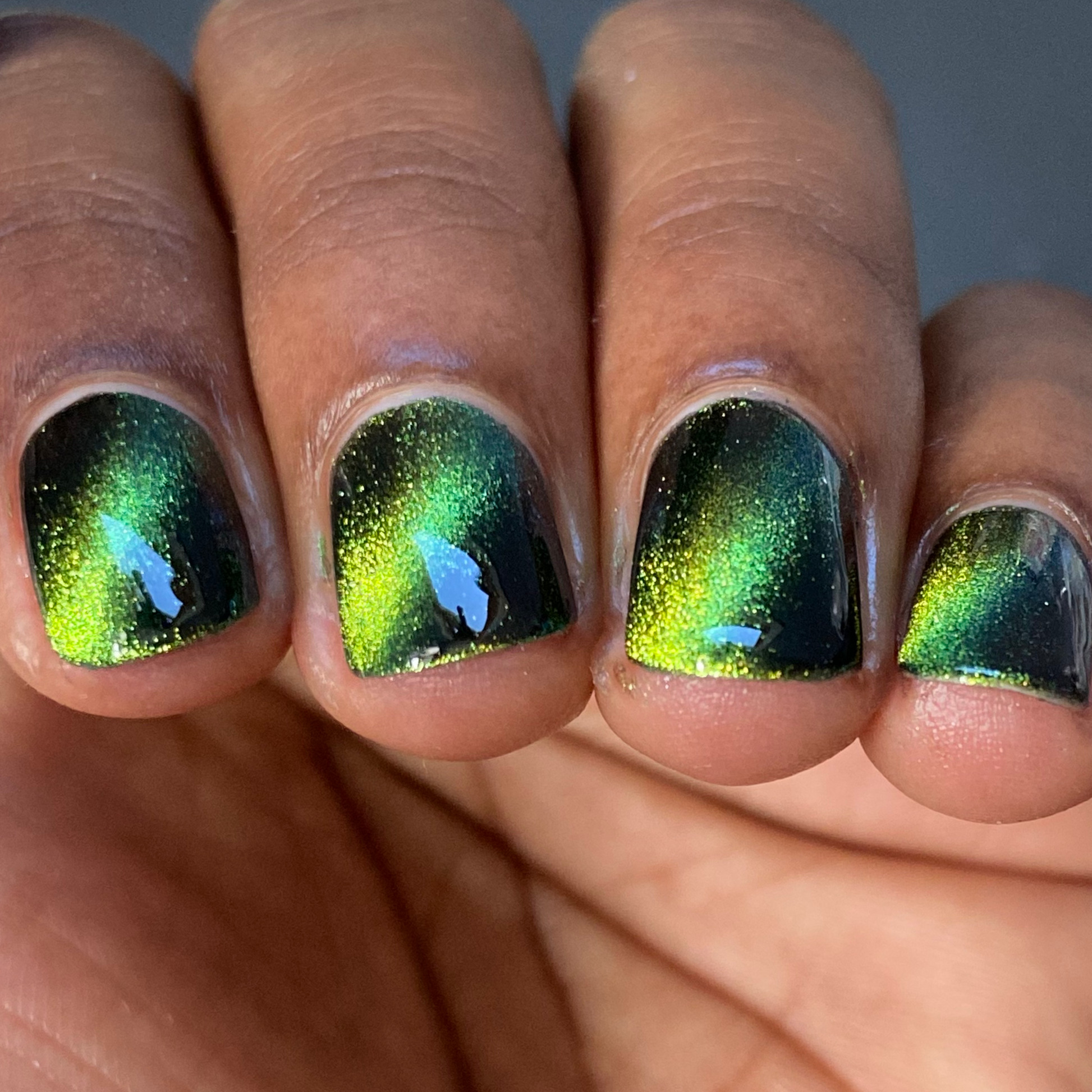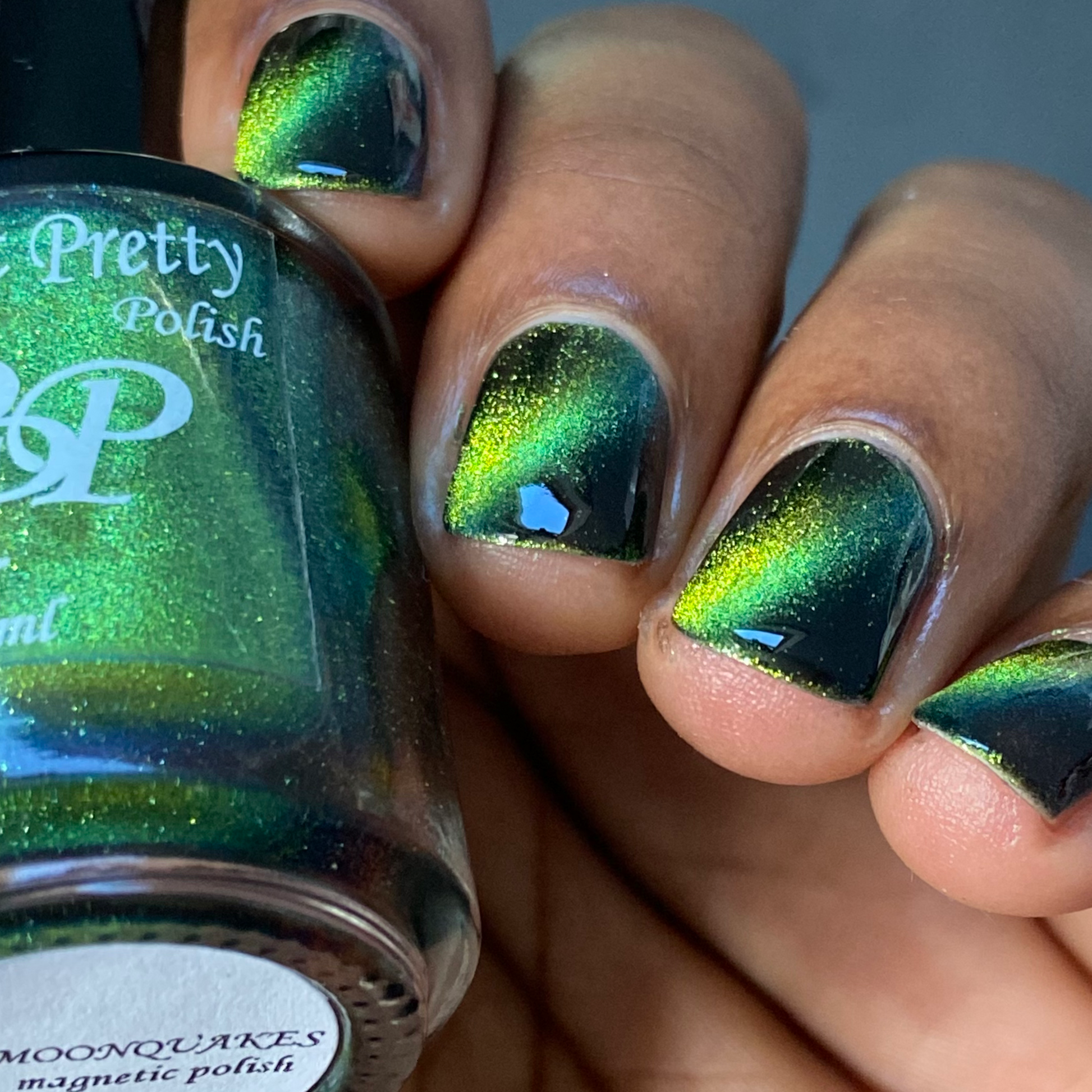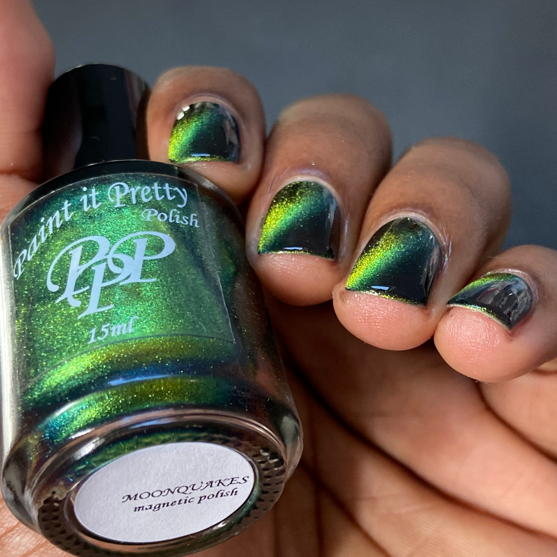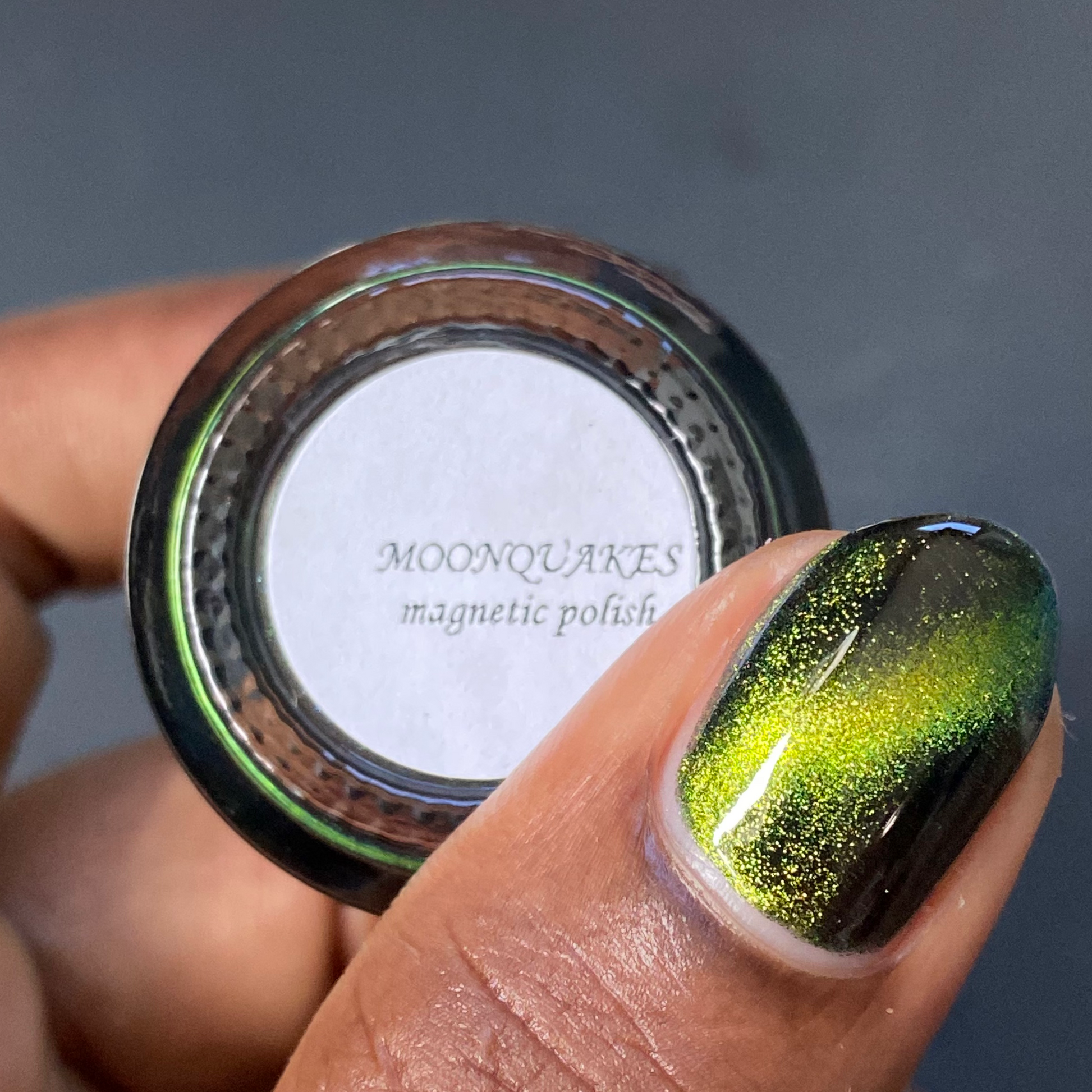 Moonquakes is a green to yellow to blue magnetic polish in a black base.