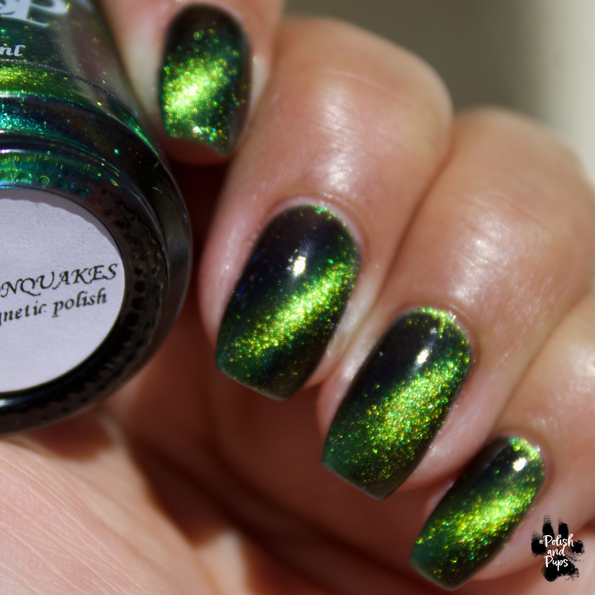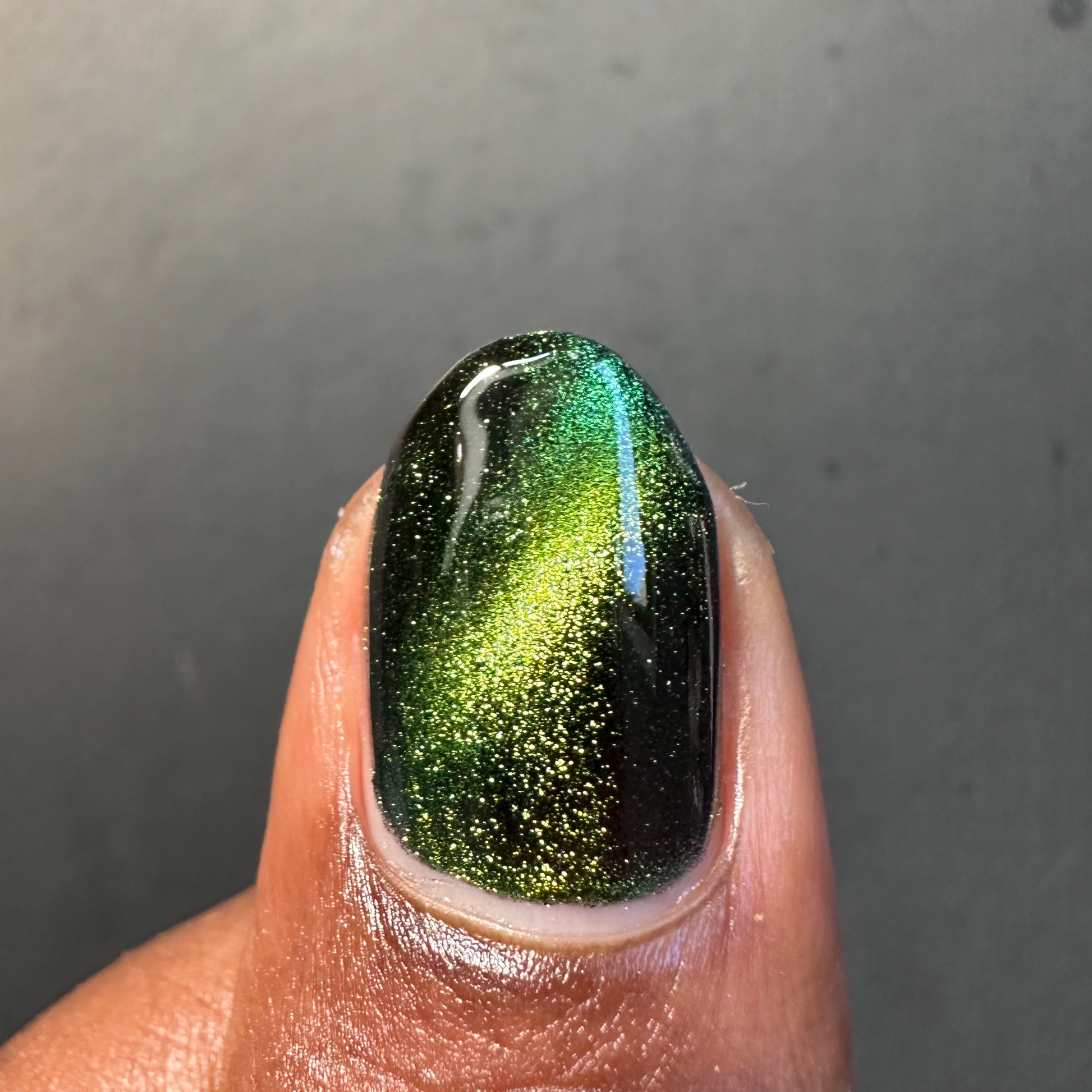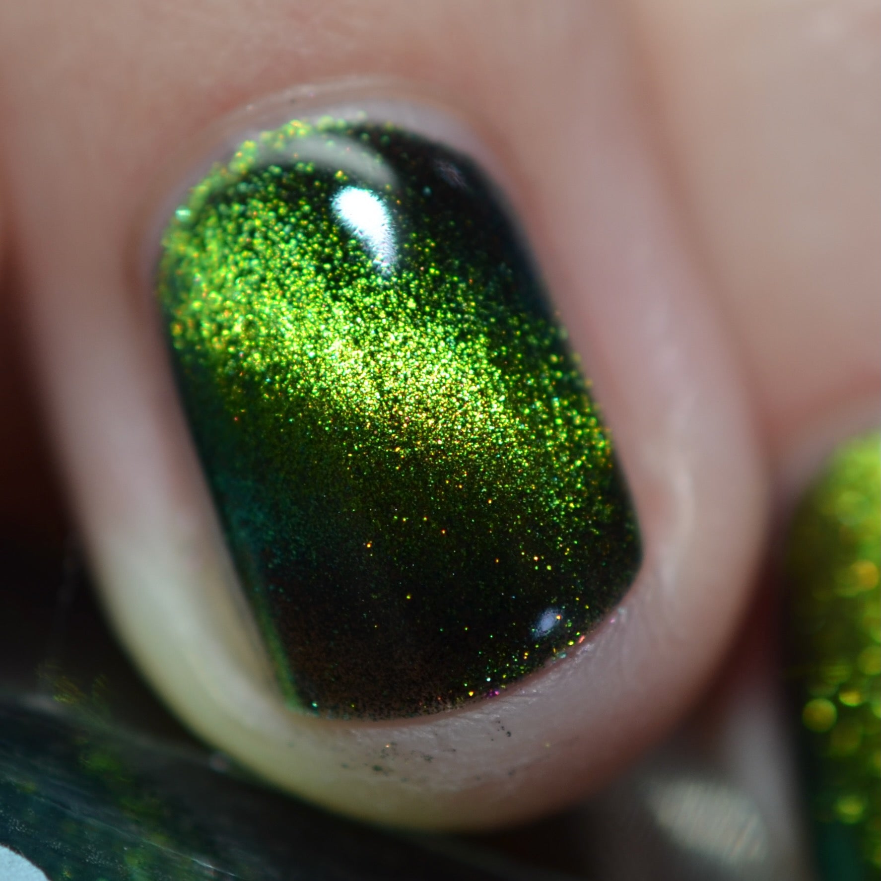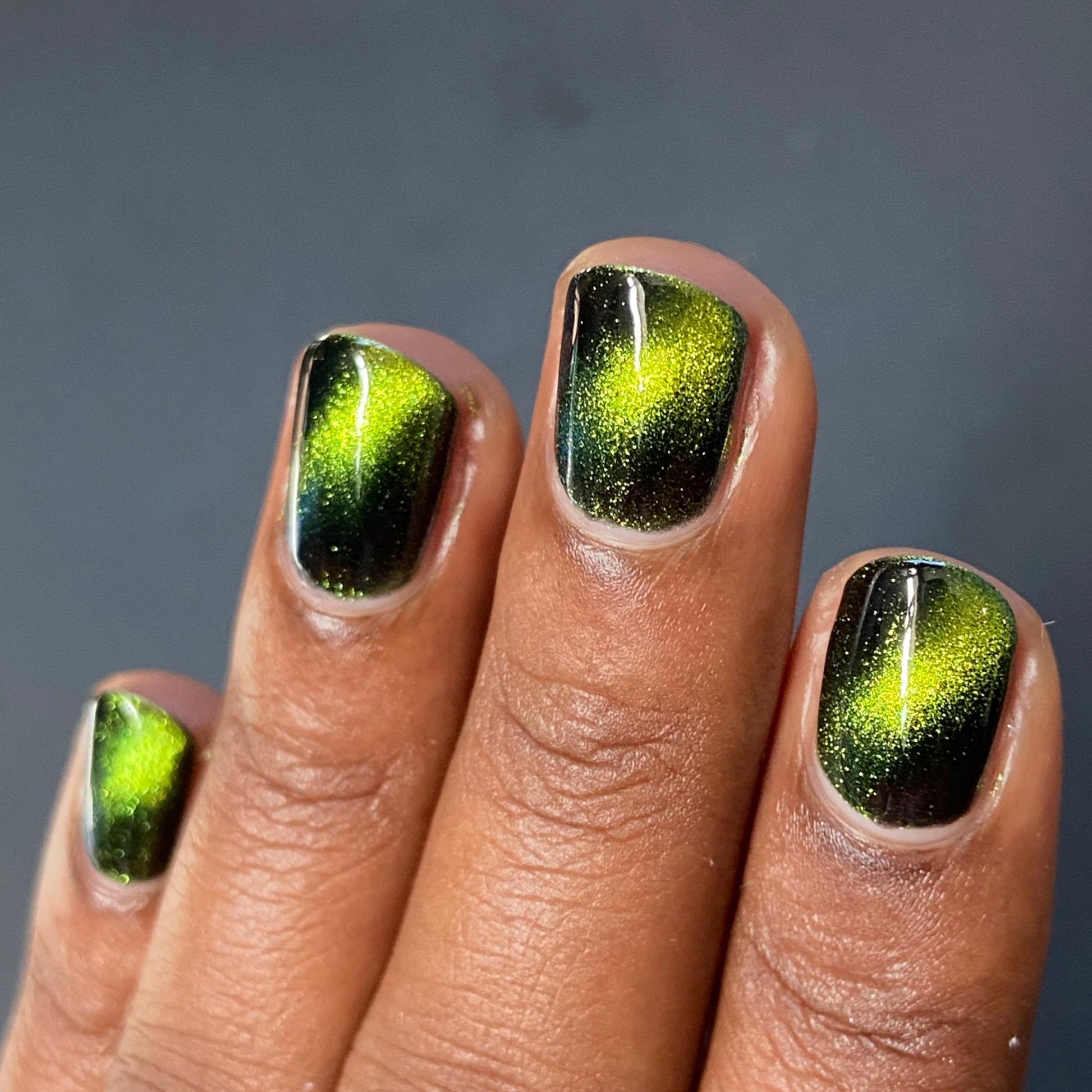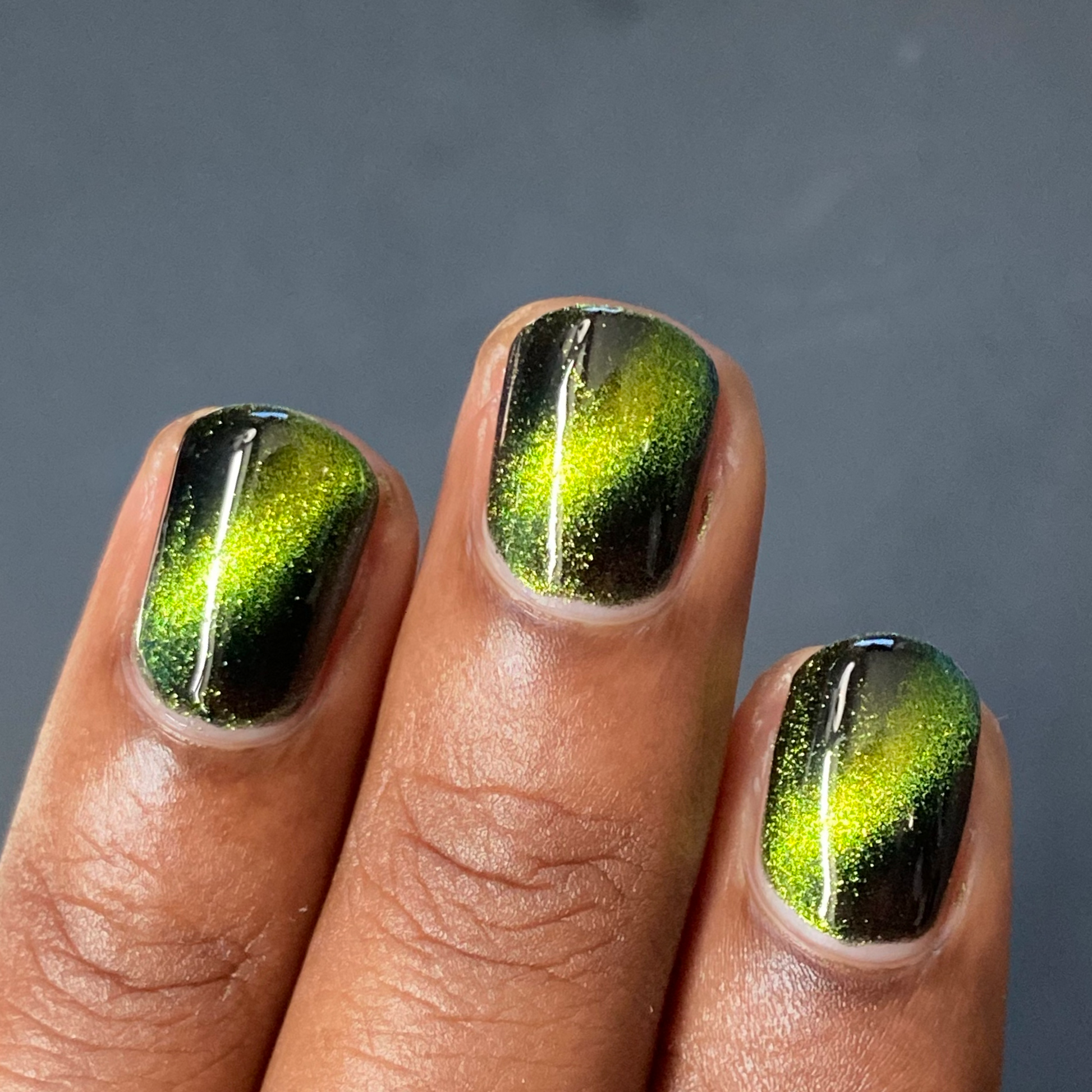 Moonquakes is a green to yellow to blue magnetic polish in a black base.