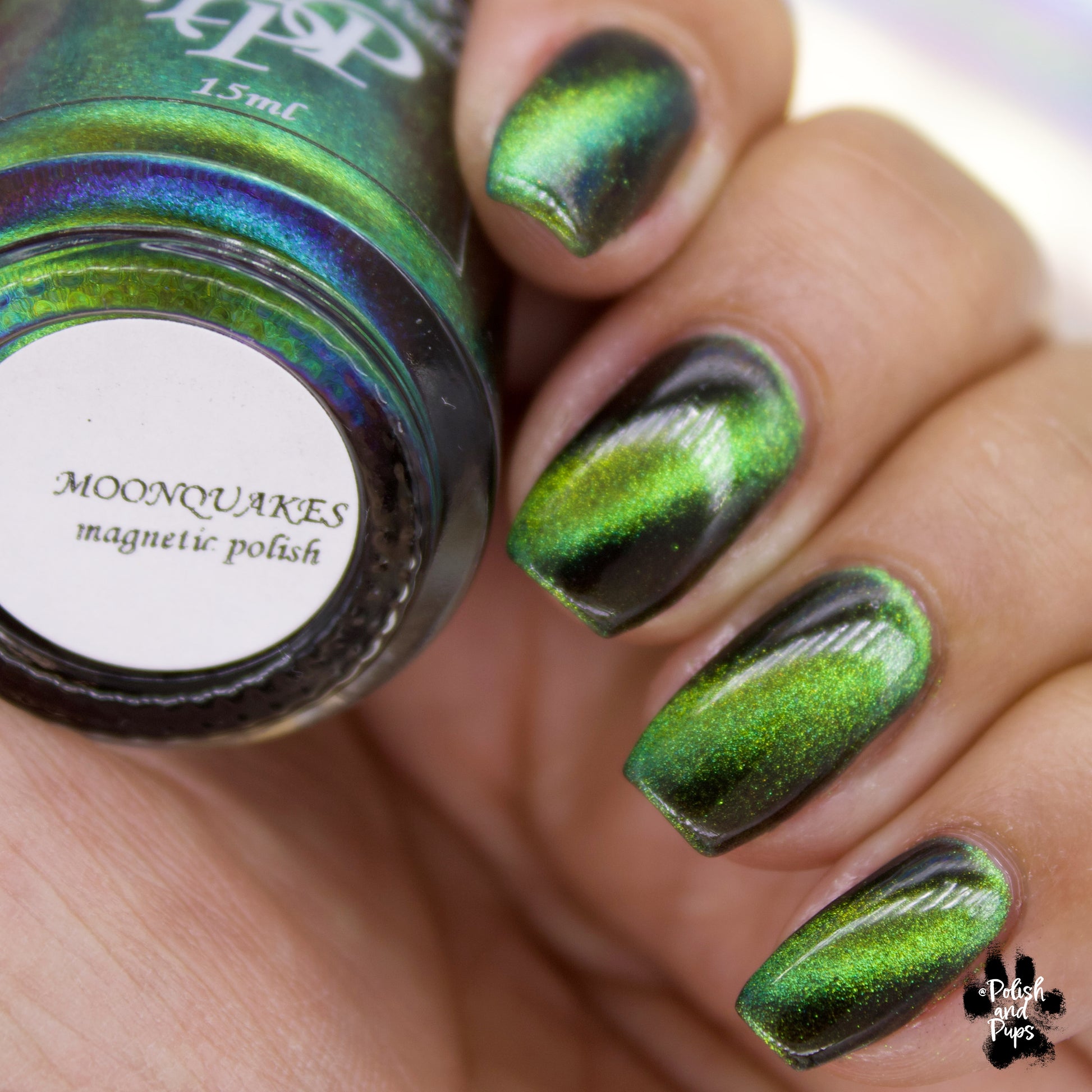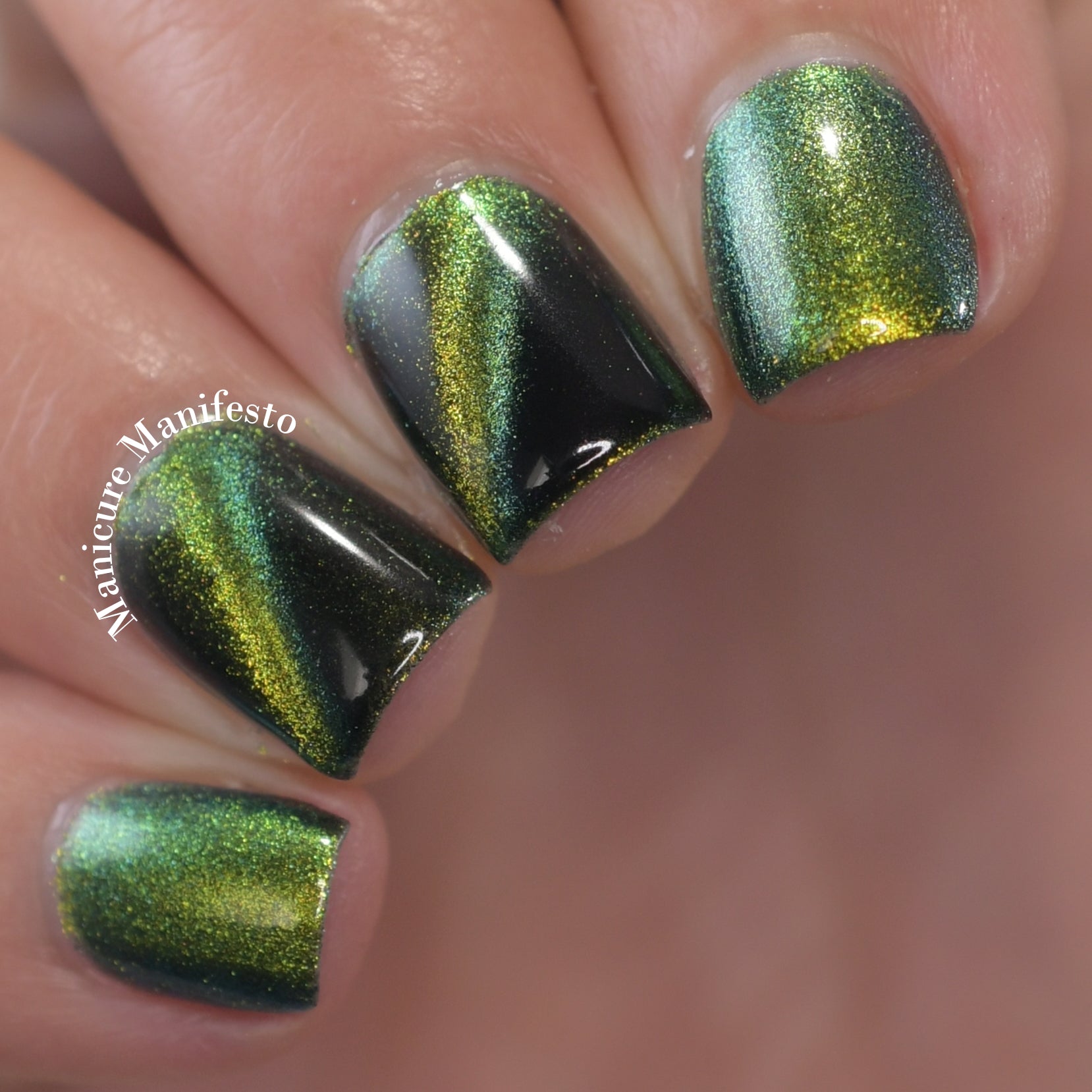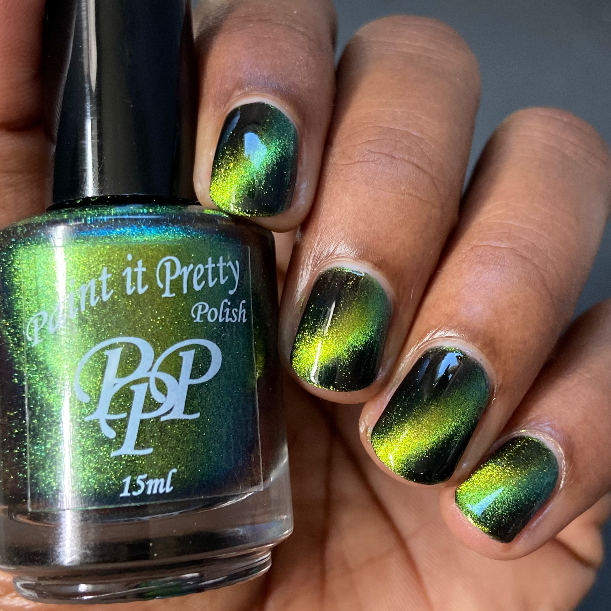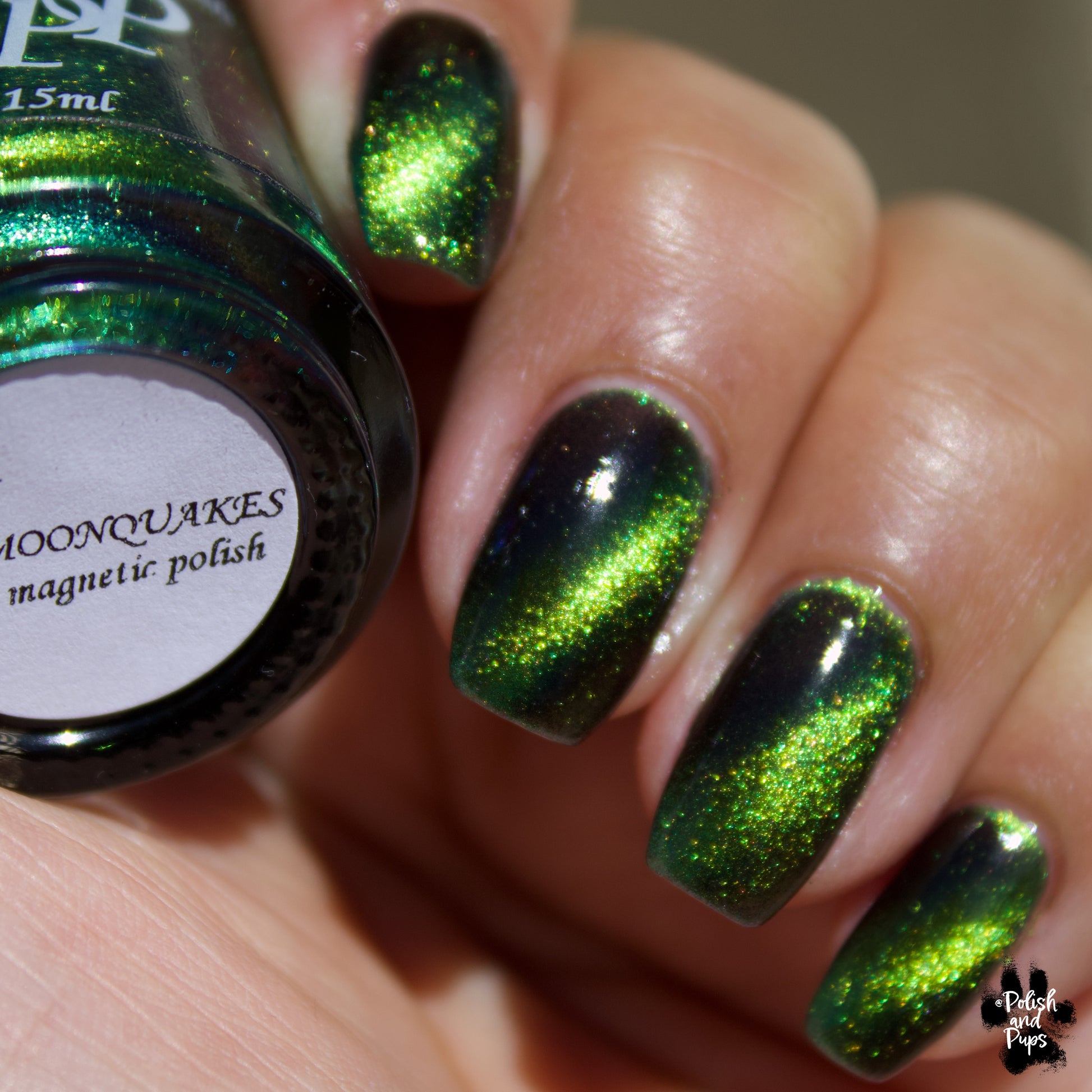 Moonquakes is a green to yellow to blue magnetic polish in a black base.