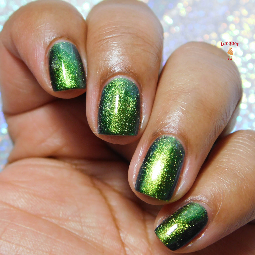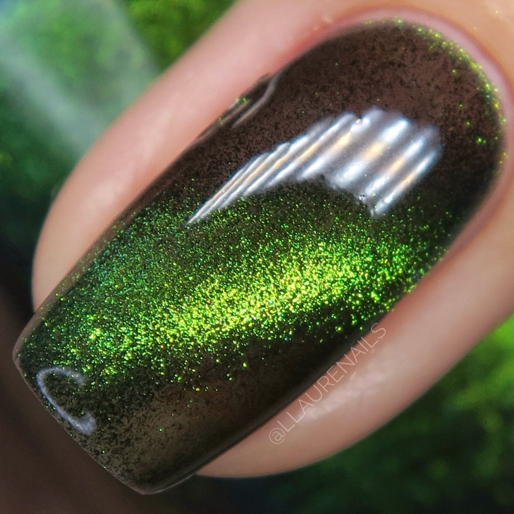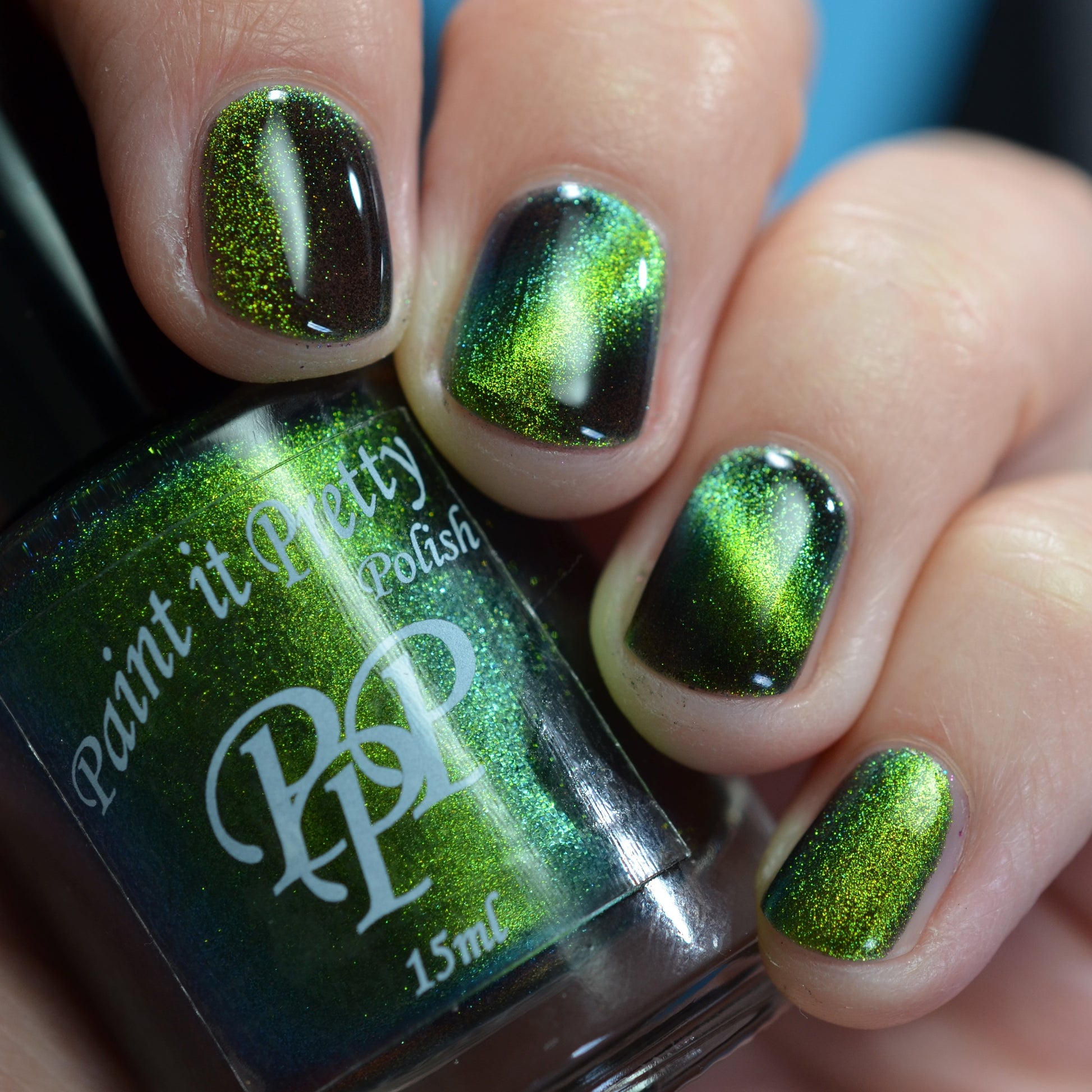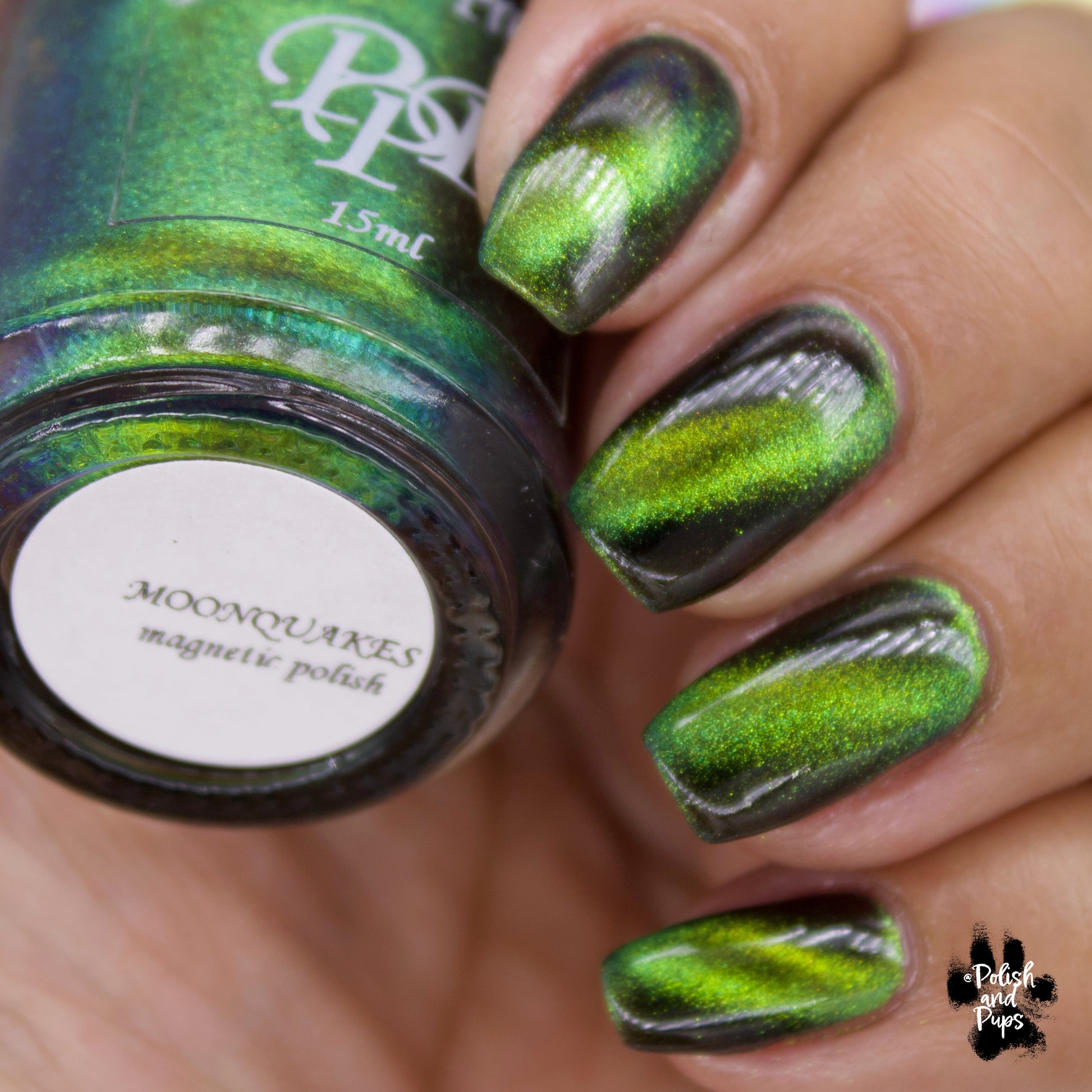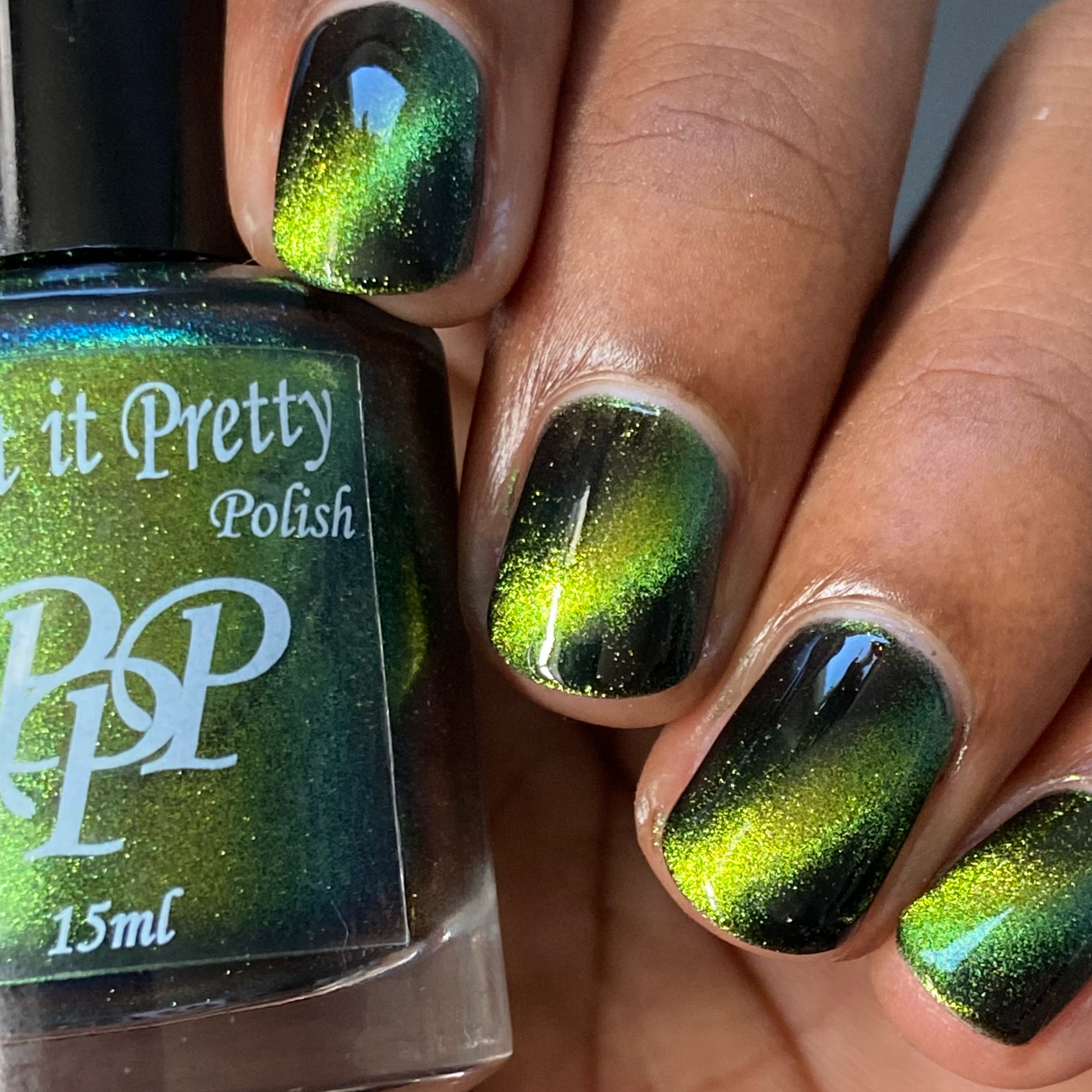Moonquakes is a green to yellow to blue magnetic polish in a black base.