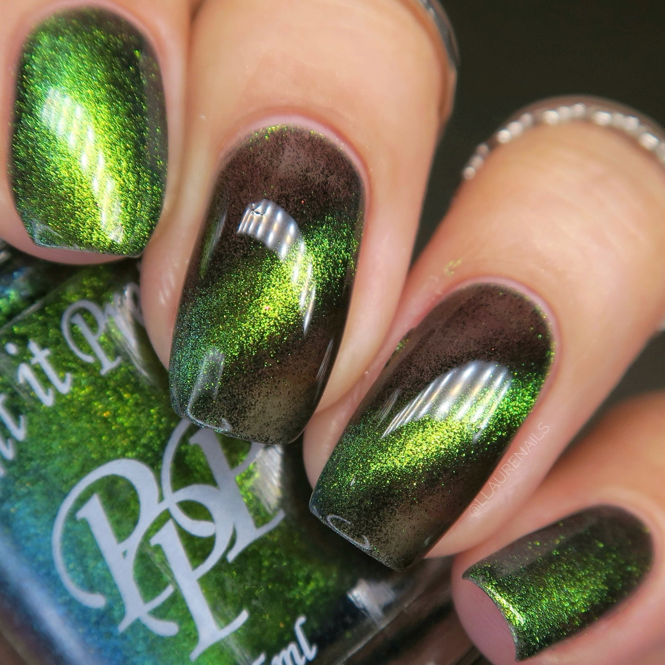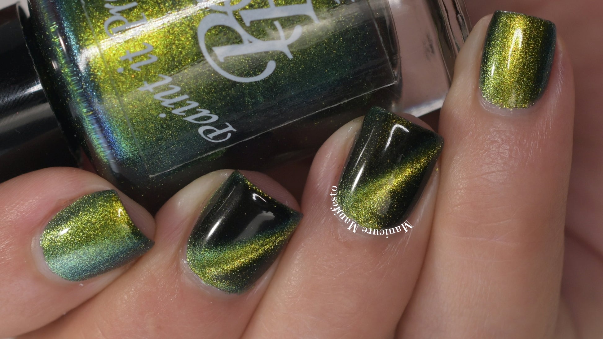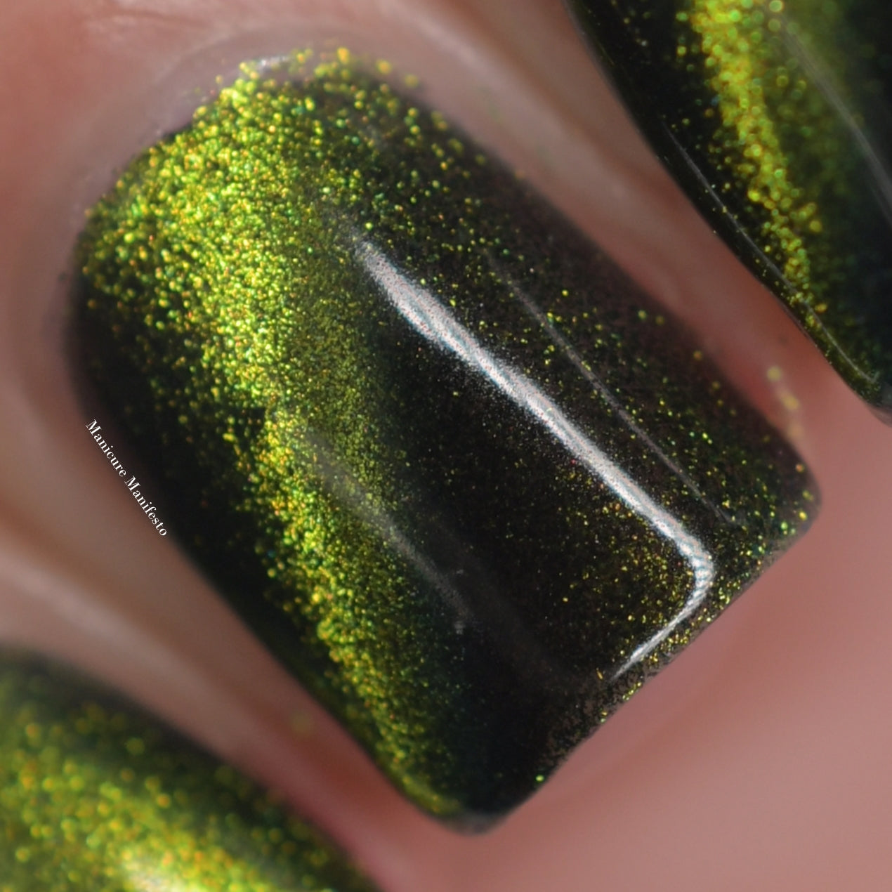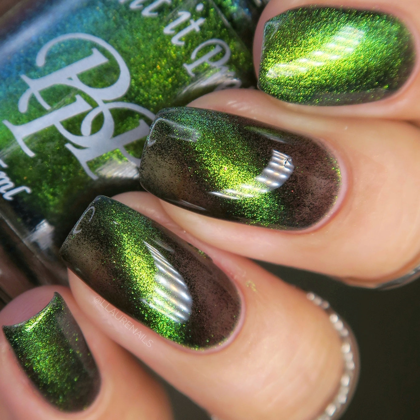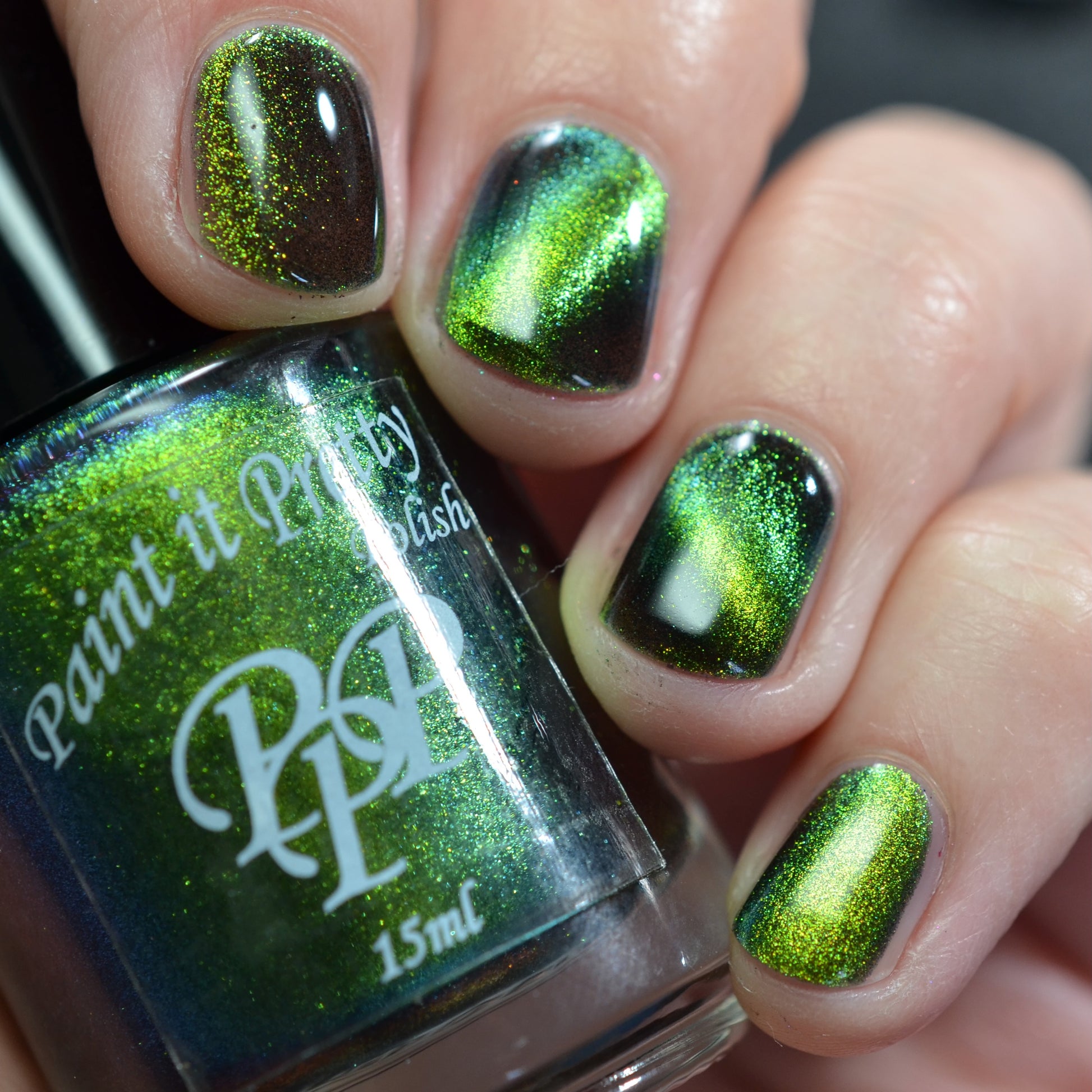 Moonquakes is a green to yellow to blue magnetic polish in a black base.