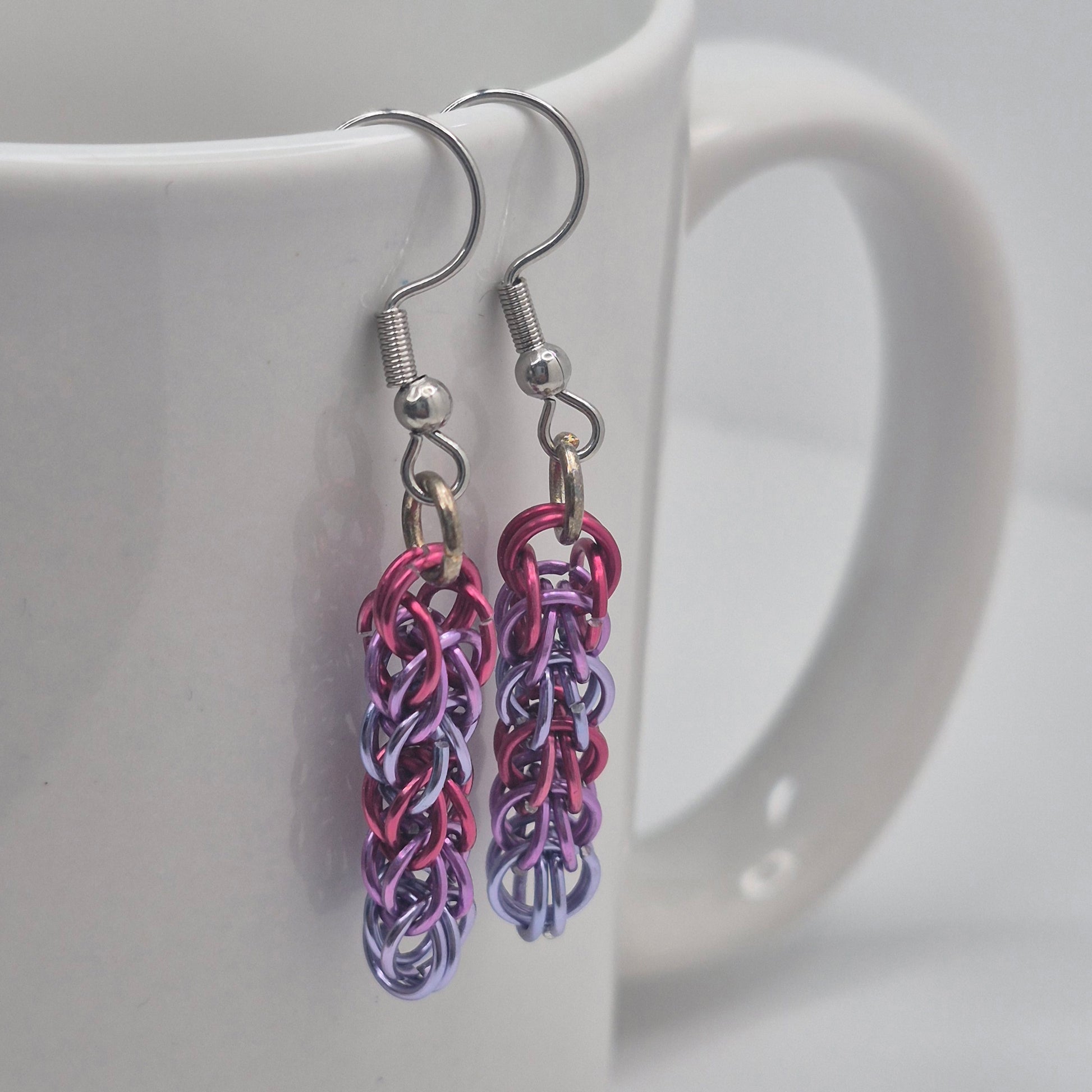 Handmade chainmail pink purple, blue earrings. Hand woven one ring at a time, this jewelry is sure to turn heads!